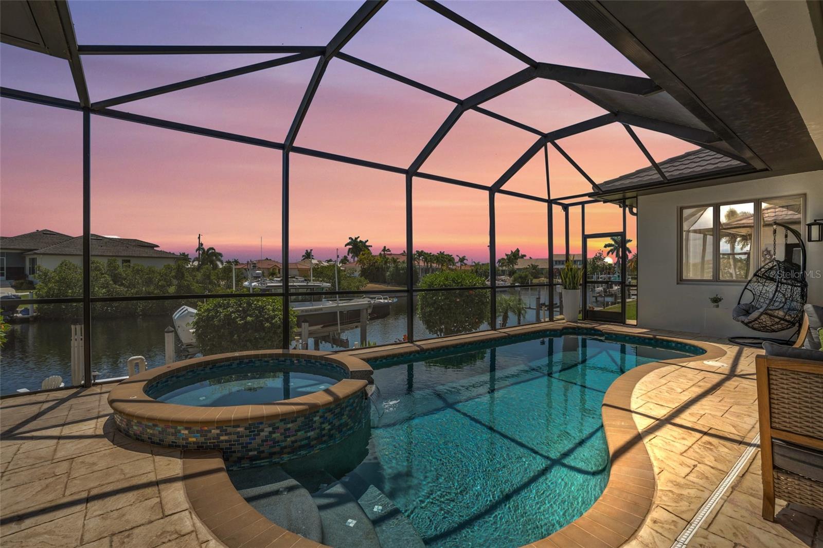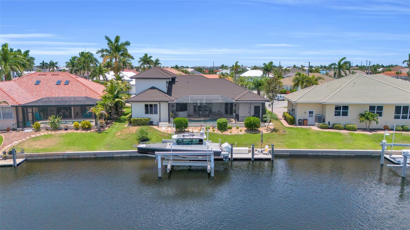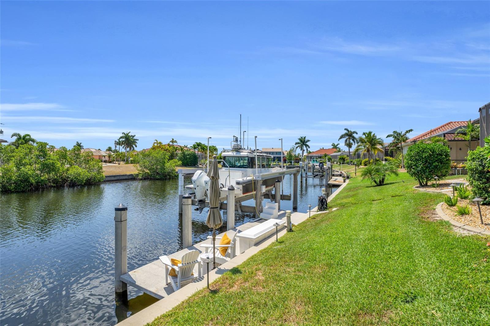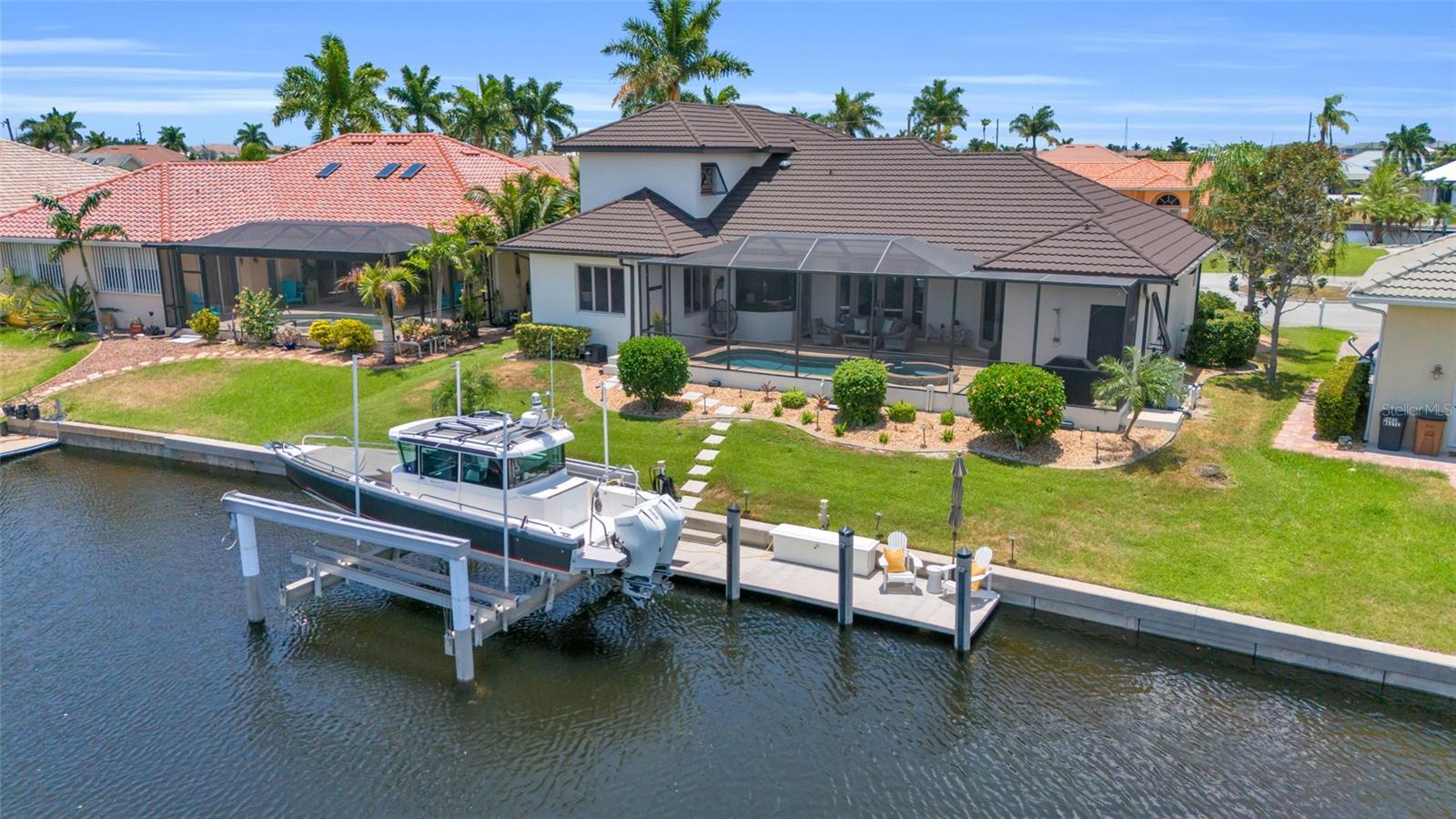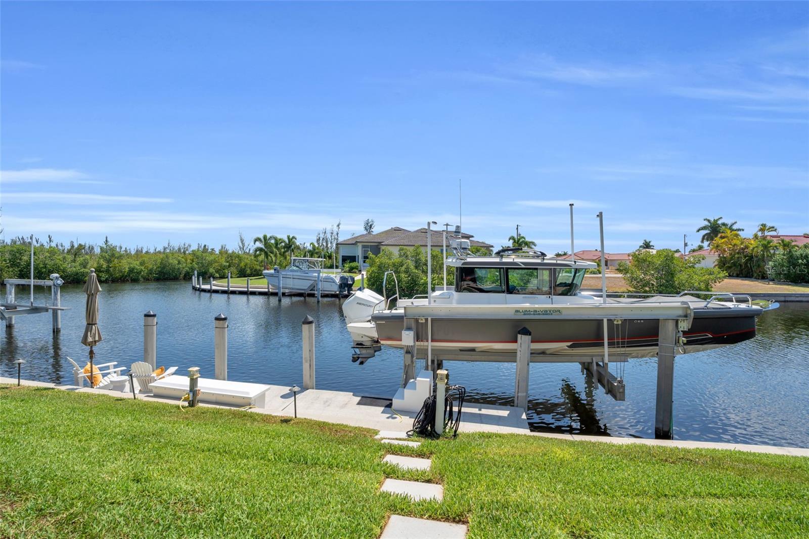 Discover this CUSTOM-built, one-of-a-kind WATERFRONT pool home in PUNTA GORDA ISLES, offering easy sailboat access to Charlotte Harbor & the Gulf via Buckley's Pass. This meticulously maintained residence features 73 feet of water frontage with a concrete seawall maintained by city, dock with elec/water, & a RARE 28,000 POUND BOAT LIFT. ALL DOCK POSTS ARE CONCRETE- not wood. Bunks for 2 jet skis &boat at this time. Step inside to an inviting semi-open floor plan with SOARING CEILINGS, highlighted by an elegant custom iron double entry door that is hurricane plus rated. The home boasts 3 bdrms, including a main-level master suite & an additional bedroom(4TH) or den , & 4 total baths. The interior is adorned with designer details such as soaring ceilings, arched built-ins, EIGHT FOOT INTERIOR AND EXTERIOR DOORS, stunning flooring, plantation shutters, French doors, designer light fixtures & a beautiful LIMESTONE surround fireplace in the living room. The oversized gourmet kitchen is a chef's dream, featuring cherry wood cabinetry, paneled BUILT-IN SUB ZERO refrigeration, granite counters & backsplash, a built-in oven, down draft cooktop, island, breakfast bar, pull outs, pantry, & a casual dining/bar area with an aquarium window to enjoy the stunning water views, plus a family room for additional relaxation space. The main level master suite provides private access to the lanai with double doors & includes a luxurious bath with marble, dual sinks, a garden tub, and a Roman shower. There are also 2 walk-in closets. An additional main level bedroom/den features soaring ceilings, California Closet modern built in with queen Murphy bed (seller willing to have prof. removed if buyer prefers), duel closets, drawers, built in light, charging station & overhead storage. The second floor houses two large bedrooms with walk-in closets & a separate marble guest bath. The outdoor entertaining area is perfect for gatherings, with a covered lanai, a half bath, an OUTDOOR SHOWER, & a screened, HEATED, SALTWATER pool and SPA with lovely WATERFALL FEATURE, all overlooking amazing water views that includes intersecting canal view. The lush tropical landscaping adds to the home’s great curb appeal. Winters are wonderful with opening up all the double doors to the lanai from the master suite & living room bringing the outdoors in. Located in a premier golf & boating community, this home is close to the Yacht Club, Country Club, Fishermen's Village, and Punta Gorda's historic downtown, which features restaurants, shopping, community events, and entertainment. Don’t miss this opportunity to own a piece of paradise. NOTABLE UPGRADES: Decra Stone Coated Metal Roofing w/ Lifetime Lim Warr. Upgraded Solid soffit system on both levels (Metal soffits are the first to go in a trop.storm) Extended Gutters on all sides of home. Outdoor accent lighting. All upper windows & some lower with new custom Bahama Lockable Shutters for extra prot. Emtek Solid Brass Knurled int.door knobs. 3 Baths have Linen closets. Laundry has pocket door with sink, cabinetry & shelving storage. Separate pool bath. Outdoor storage room great for pool/boat equip. HVAC UV light. LOW TRANSFERABLE FLOOD Insurance $1025 r/t elevation and 2nd level . NO HOA FEES. Lawn/Shrub/Tree trimming $165/month. Pool $140. 1 upper bdrm has triple bunks in walk-in closet that can be removed prior to closing.