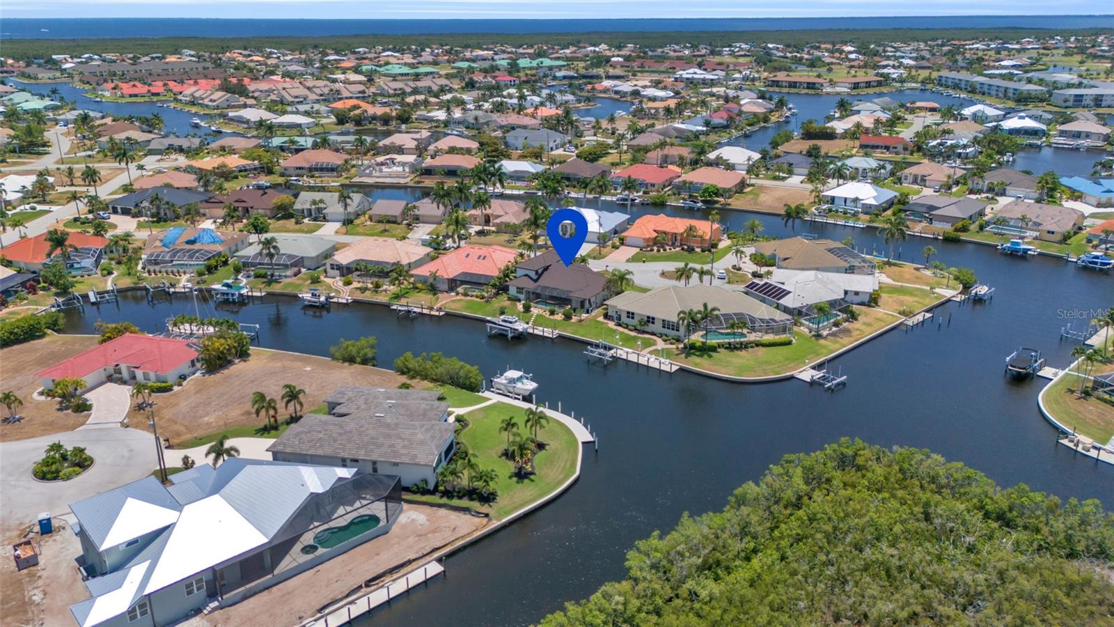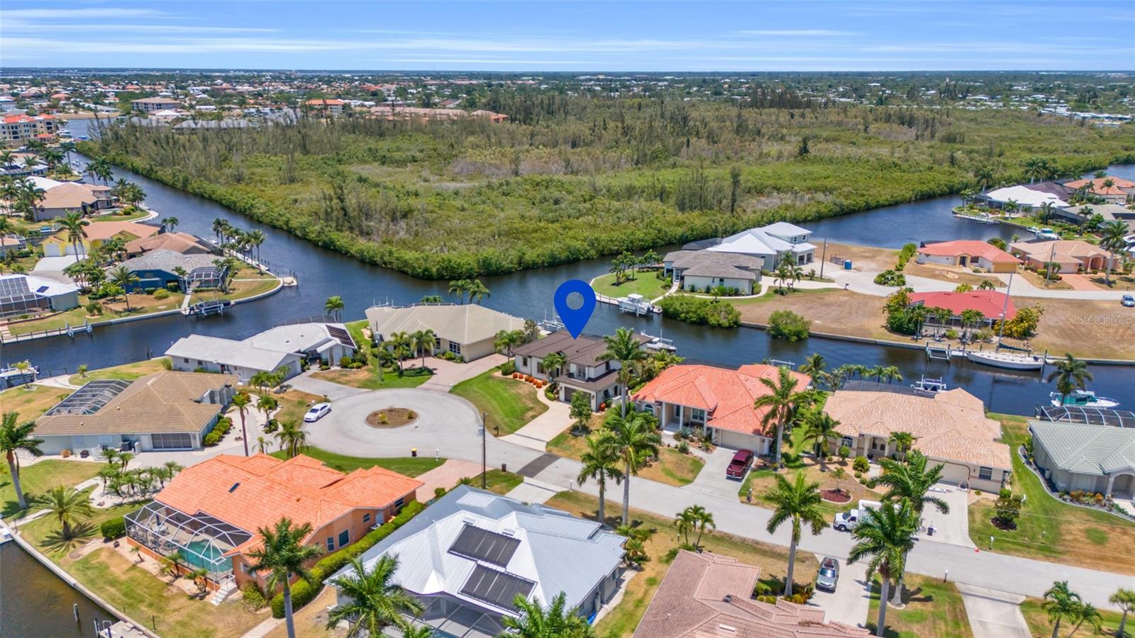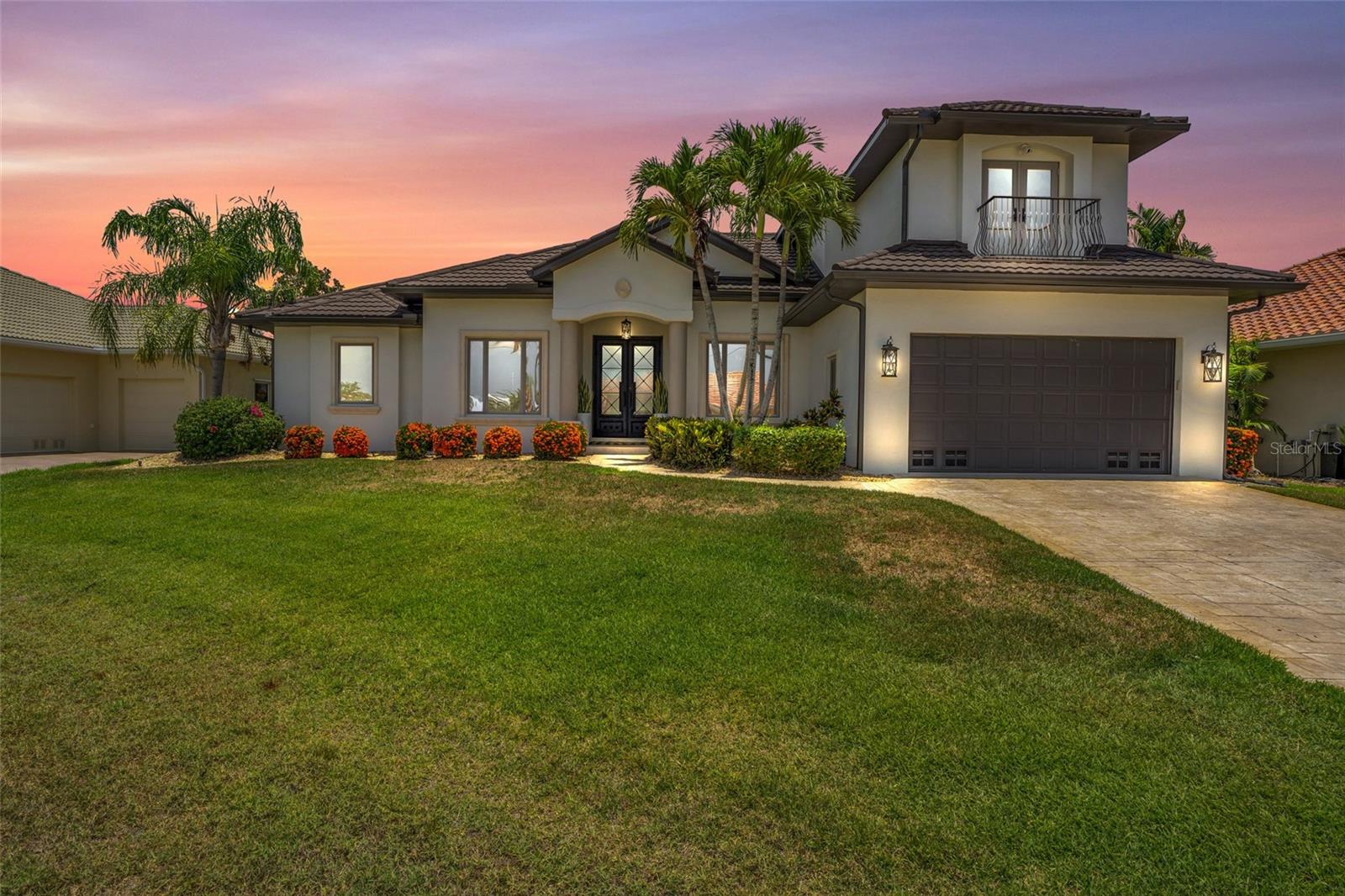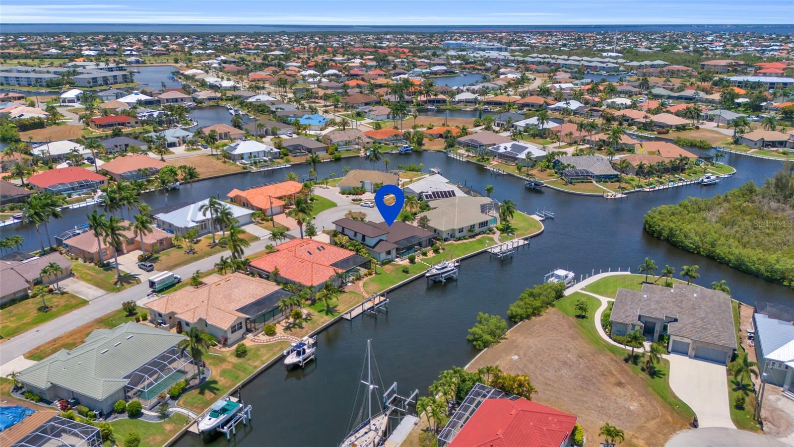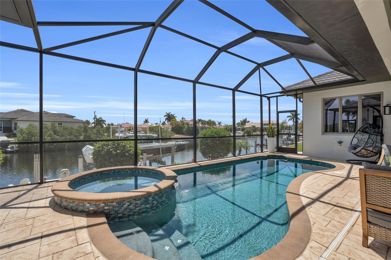 Discover this CUSTOM-built, one-of-a-kind WATERFRONT pool home in PUNTA GORDA ISLES, offering easy sailboat access to Charlotte Harbor & the Gulf via Buckley's Pass. This meticulously maintained residence features 73 feet of water frontage with a concrete seawall maintained by city, dock with elec/water, & a RARE 28,000 POUND BOAT LIFT. ALL DOCK POSTS ARE CONCRETE- not wood. Bunks for 2 jet skis &boat at this time. Step inside to an inviting semi-open floor plan with SOARING CEILINGS, highlighted by an elegant custom iron double entry door that is hurricane plus rated. The home boasts 3 bdrms, including a main-level master suite & an additional bedroom(4TH) or den , & 4 total baths. The interior is adorned with designer details such as soaring ceilings, arched built-ins, EIGHT FOOT INTERIOR AND EXTERIOR DOORS, stunning flooring, plantation shutters, French doors, designer light fixtures & a beautiful LIMESTONE surround fireplace in the living room. The oversized gourmet kitchen is a chef's dream, featuring cherry wood cabinetry, paneled BUILT-IN SUB ZERO refrigeration, granite counters & backsplash, a built-in oven, down draft cooktop, island, breakfast bar, pull outs, pantry, & a casual dining/bar area with an aquarium window to enjoy the stunning water views, plus a family room for additional relaxation space. The main level master suite provides private access to the lanai with double doors & includes a luxurious bath with marble, dual sinks, a garden tub, and a Roman shower. There are also 2 walk-in closets. An additional main level bedroom/den features soaring ceilings, California Closet modern built in with queen Murphy bed (seller willing to have prof. removed if buyer prefers), duel closets, drawers, built in light, charging station & overhead storage. The second floor houses two large bedrooms with walk-in closets & a separate marble guest bath. The outdoor entertaining area is perfect for gatherings, with a covered lanai, a half bath, an OUTDOOR SHOWER, & a screened, HEATED, SALTWATER pool and SPA with lovely WATERFALL FEATURE, all overlooking amazing water views that includes intersecting canal view. The lush tropical landscaping adds to the home’s great curb appeal. Winters are wonderful with opening up all the double doors to the lanai from the master suite & living room bringing the outdoors in. Located in a premier golf & boating community, this home is close to the Yacht Club, Country Club, Fishermen's Village, and Punta Gorda's historic downtown, which features restaurants, shopping, community events, and entertainment. Don’t miss this opportunity to own a piece of paradise. NOTABLE UPGRADES: Decra Stone Coated Metal Roofing w/ Lifetime Lim Warr. Upgraded Solid soffit system on both levels (Metal soffits are the first to go in a trop.storm) Extended Gutters on all sides of home. Outdoor accent lighting. All upper windows & some lower with new custom Bahama Lockable Shutters for extra prot. Emtek Solid Brass Knurled int.door knobs. 3 Baths have Linen closets. Laundry has pocket door with sink, cabinetry & shelving storage. Separate pool bath. Outdoor storage room great for pool/boat equip. HVAC UV light. LOW TRANSFERABLE FLOOD Insurance $1025 r/t elevation and 2nd level . NO HOA FEES. Lawn/Shrub/Tree trimming $165/month. Pool $140. 1 upper bdrm has triple bunks in walk-in closet that can be removed prior to closing.
