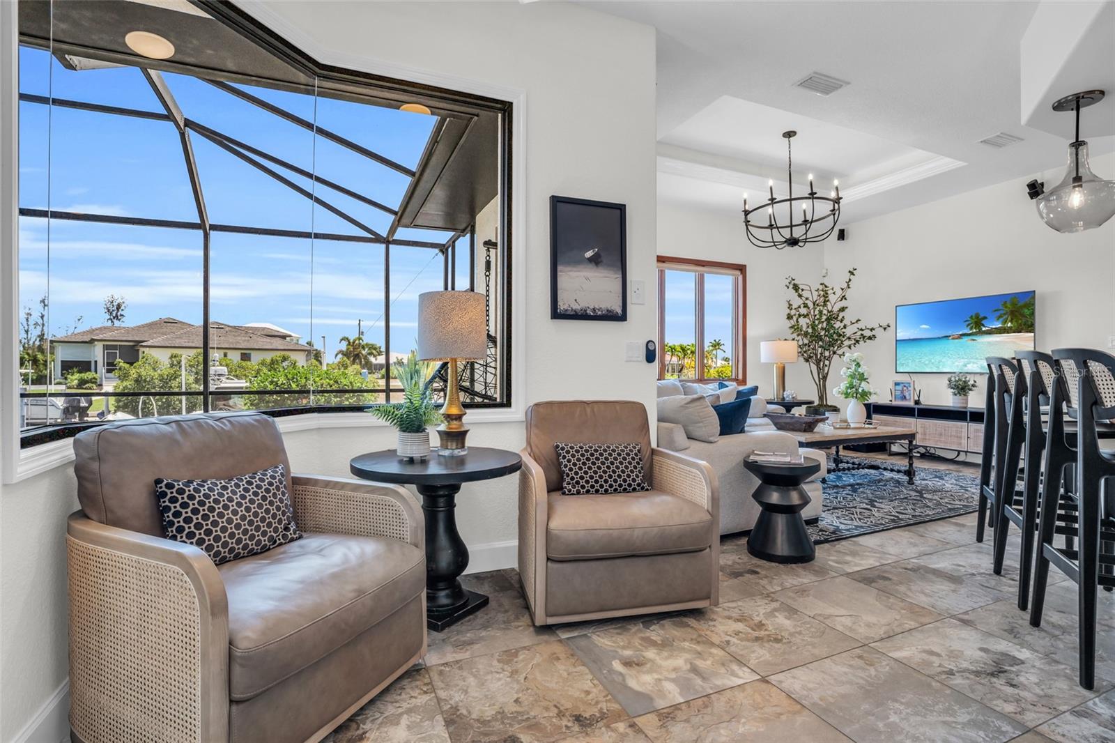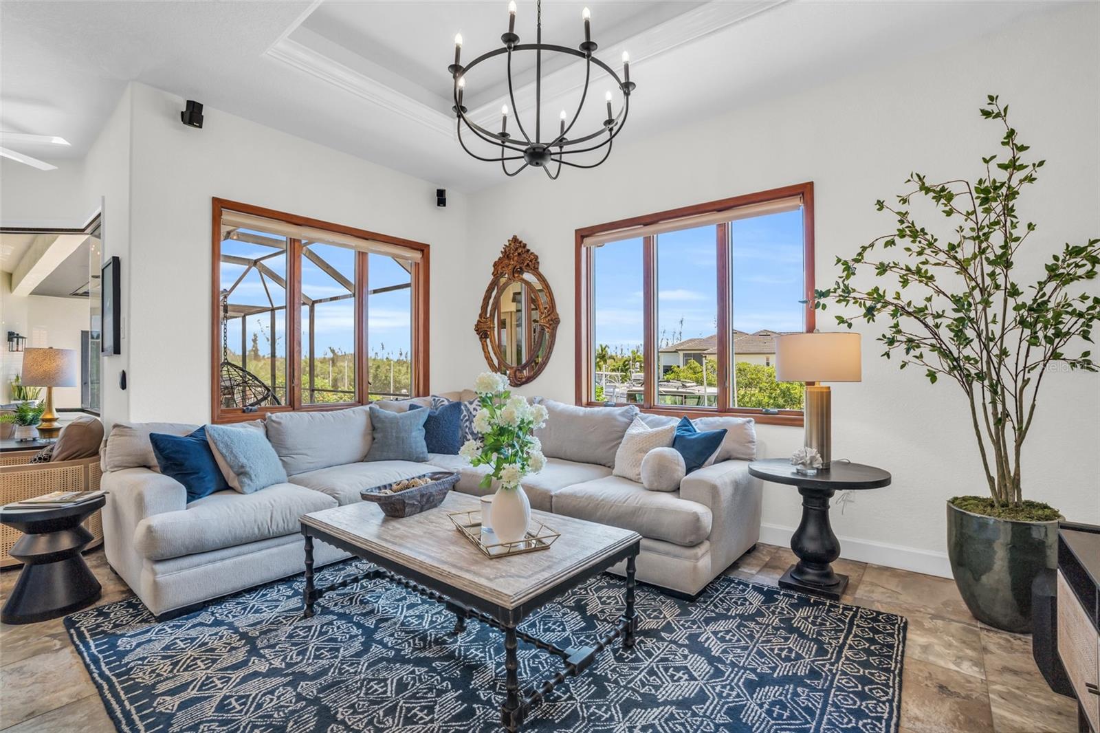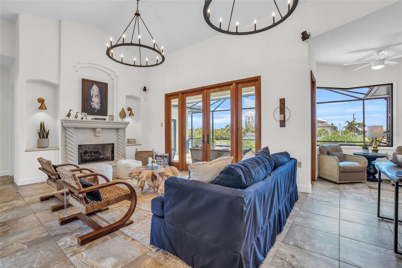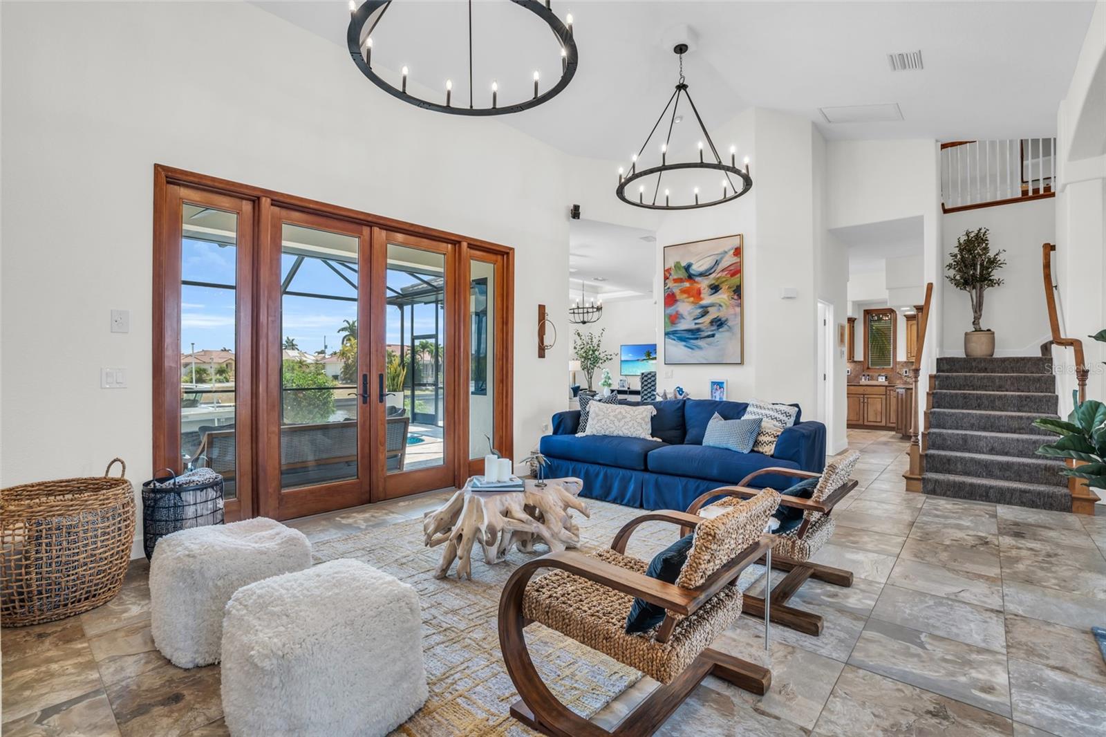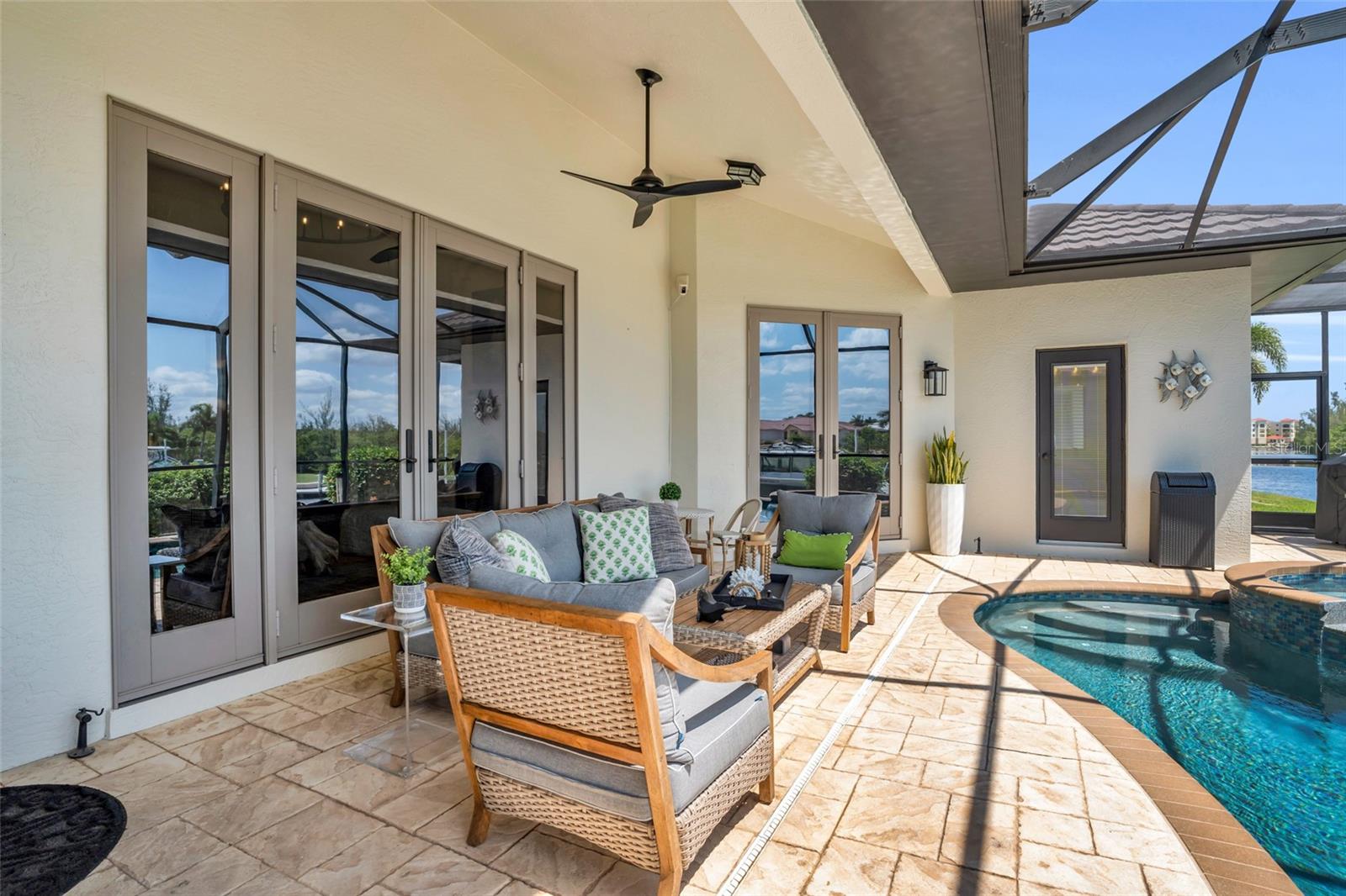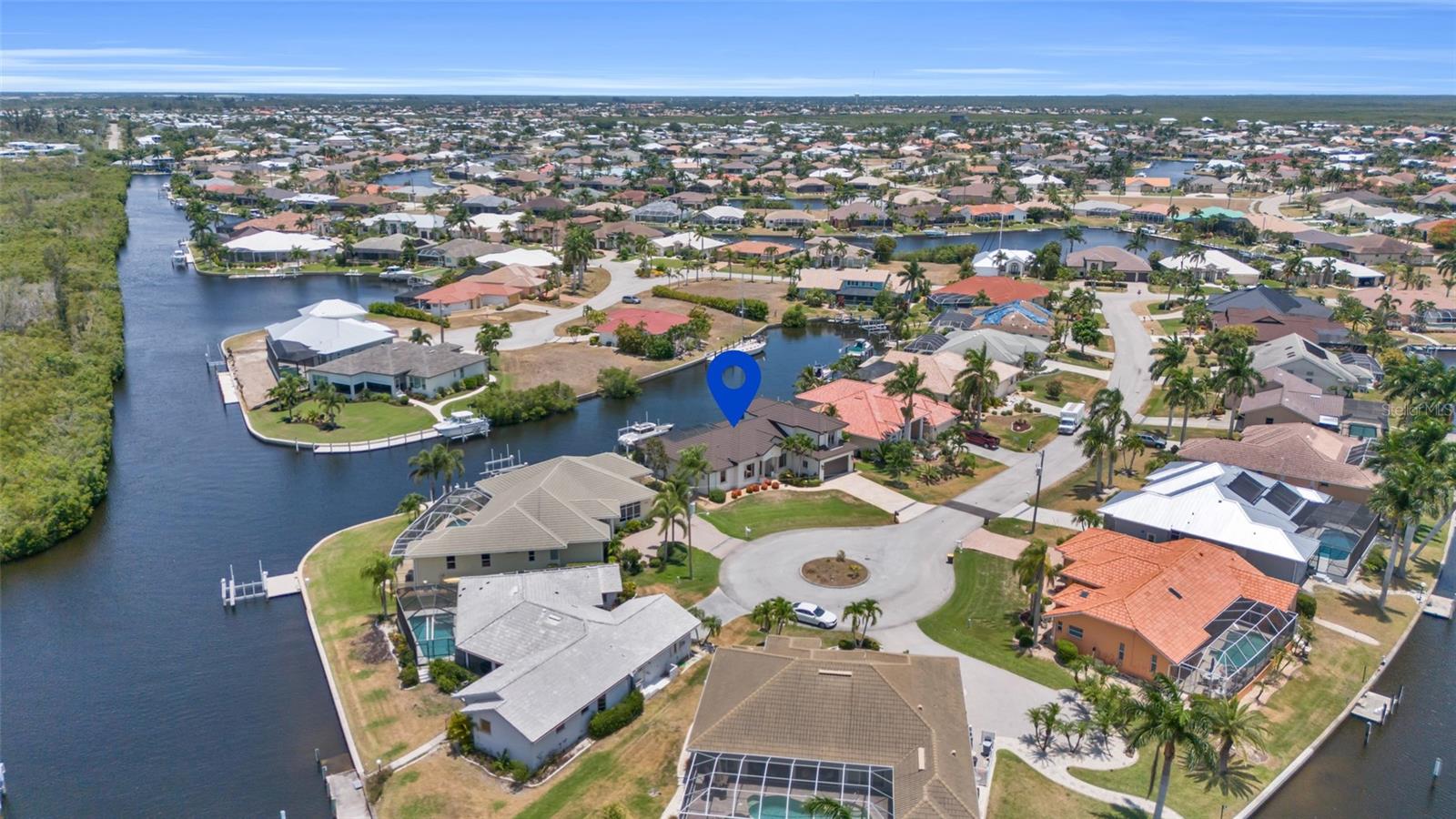Discover this CUSTOM-built, one-of-a-kind WATERFRONT pool home in PUNTA GORDA ISLES, offering easy sailboat access to Charlotte Harbor & the Gulf via Buckley's Pass. This meticulously maintained residence features 73 feet of water frontage with a concrete seawall maintained by city, dock with elec/water, & a RARE 28,000 POUND BOAT LIFT. ALL DOCK POSTS ARE CONCRETE- not wood. Bunks for 2 jet skis &boat at this time. Step inside to an inviting semi-open floor plan with SOARING CEILINGS, highlighted by an elegant custom iron double entry door that is hurricane plus rated. The home boasts 3 bdrms, including a main-level master suite & an additional bedroom(4TH) or den , & 4 total baths. The interior is adorned with designer details such as soaring ceilings, arched built-ins, EIGHT FOOT INTERIOR AND EXTERIOR DOORS, stunning flooring, plantation shutters, French doors, designer light fixtures & a beautiful LIMESTONE surround fireplace in the living room. The oversized gourmet kitchen is a chef's dream, featuring cherry wood cabinetry, paneled BUILT-IN SUB ZERO refrigeration, granite counters & backsplash, a built-in oven, down draft cooktop, island, breakfast bar, pull outs, pantry, & a casual dining/bar area with an aquarium window to enjoy the stunning water views, plus a family room for additional relaxation space. The main level master suite provides private access to the lanai with double doors & includes a luxurious bath with marble, dual sinks, a garden tub, and a Roman shower. There are also 2 walk-in closets. An additional main level bedroom/den features soaring ceilings, California Closet modern built in with queen Murphy bed (seller willing to have prof. removed if buyer prefers), duel closets, drawers, built in light, charging station & overhead storage. The second floor houses two large bedrooms with walk-in closets & a separate marble guest bath. The outdoor entertaining area is perfect for gatherings, with a covered lanai, a half bath, an OUTDOOR SHOWER, & a screened, HEATED, SALTWATER pool and SPA with lovely WATERFALL FEATURE, all overlooking amazing water views that includes intersecting canal view. The lush tropical landscaping adds to the home’s great curb appeal. Winters are wonderful with opening up all the double doors to the lanai from the master suite & living room bringing the outdoors in. Located in a premier golf & boating community, this home is close to the Yacht Club, Country Club, Fishermen's Village, and Punta Gorda's historic downtown, which features restaurants, shopping, community events, and entertainment. Don’t miss this opportunity to own a piece of paradise. NOTABLE UPGRADES: Decra Stone Coated Metal Roofing w/ Lifetime Lim Warr. Upgraded Solid soffit system on both levels (Metal soffits are the first to go in a trop.storm) Extended Gutters on all sides of home. Outdoor accent lighting. All upper windows & some lower with new custom Bahama Lockable Shutters for extra prot. Emtek Solid Brass Knurled int.door knobs. 3 Baths have Linen closets. Laundry has pocket door with sink, cabinetry & shelving storage. Separate pool bath. Outdoor storage room great for pool/boat equip. HVAC UV light. LOW TRANSFERABLE FLOOD Insurance $1025 r/t elevation and 2nd level . NO HOA FEES. Lawn/Shrub/Tree trimming $165/month. Pool $140. 1 upper bdrm has triple bunks in walk-in closet that can be removed prior to closing.