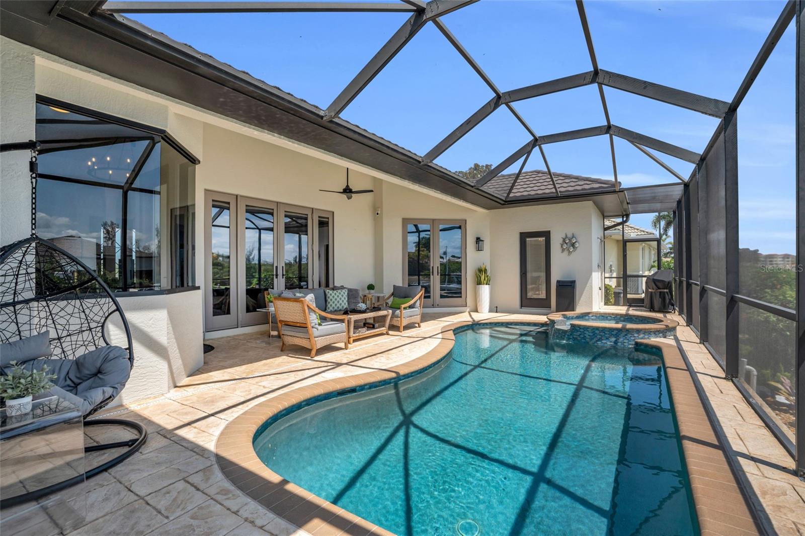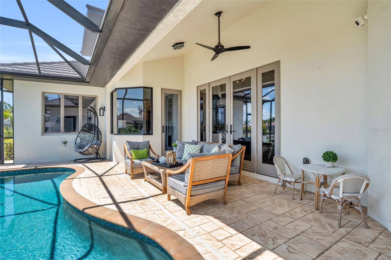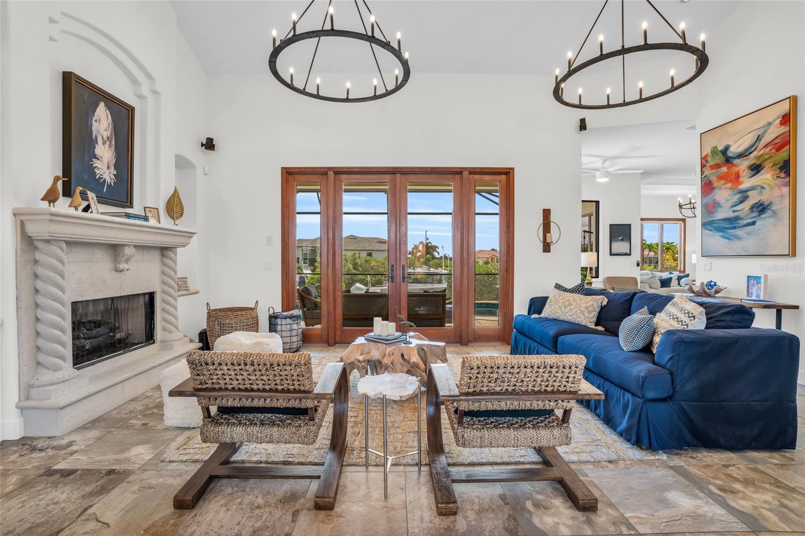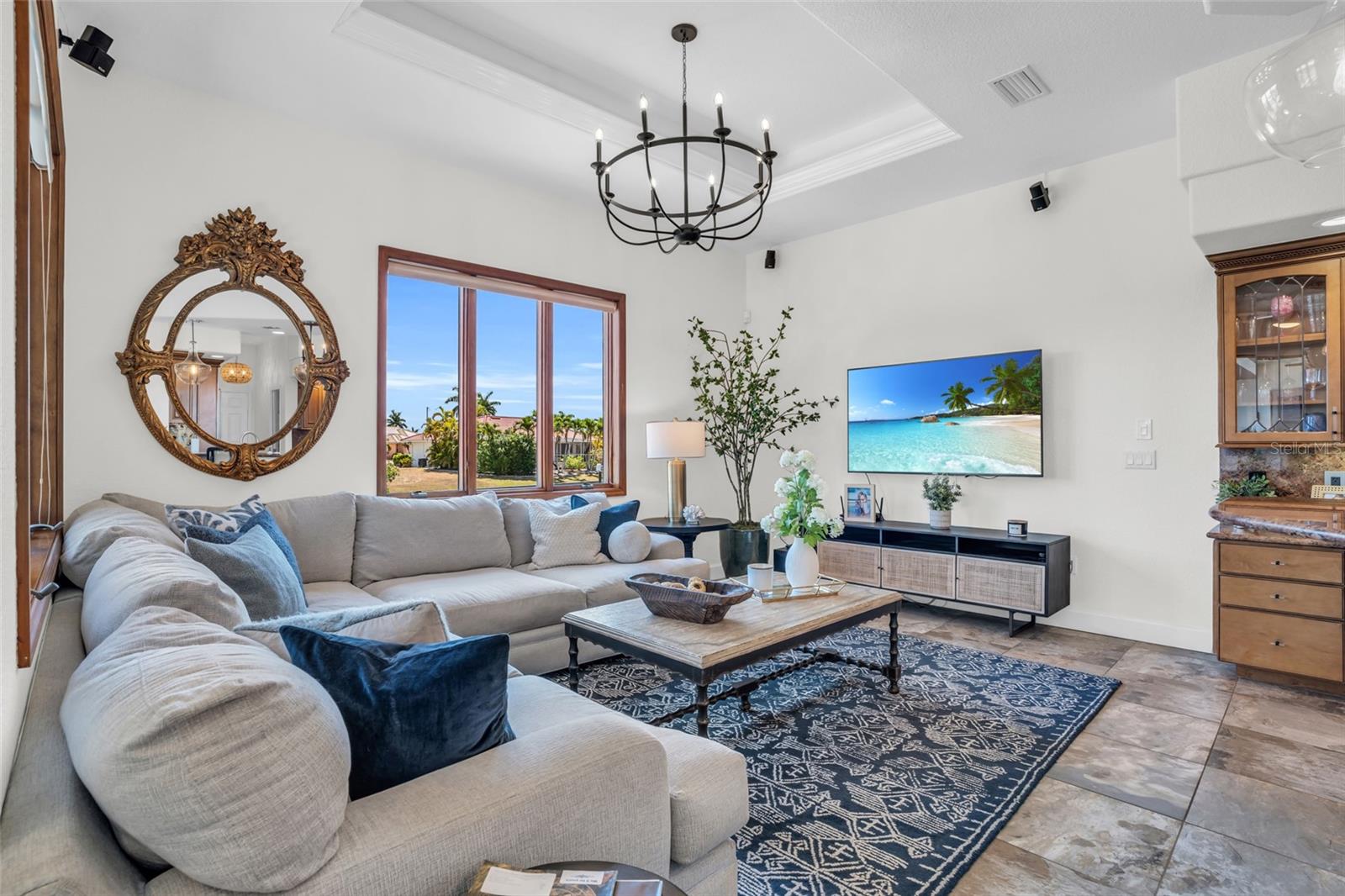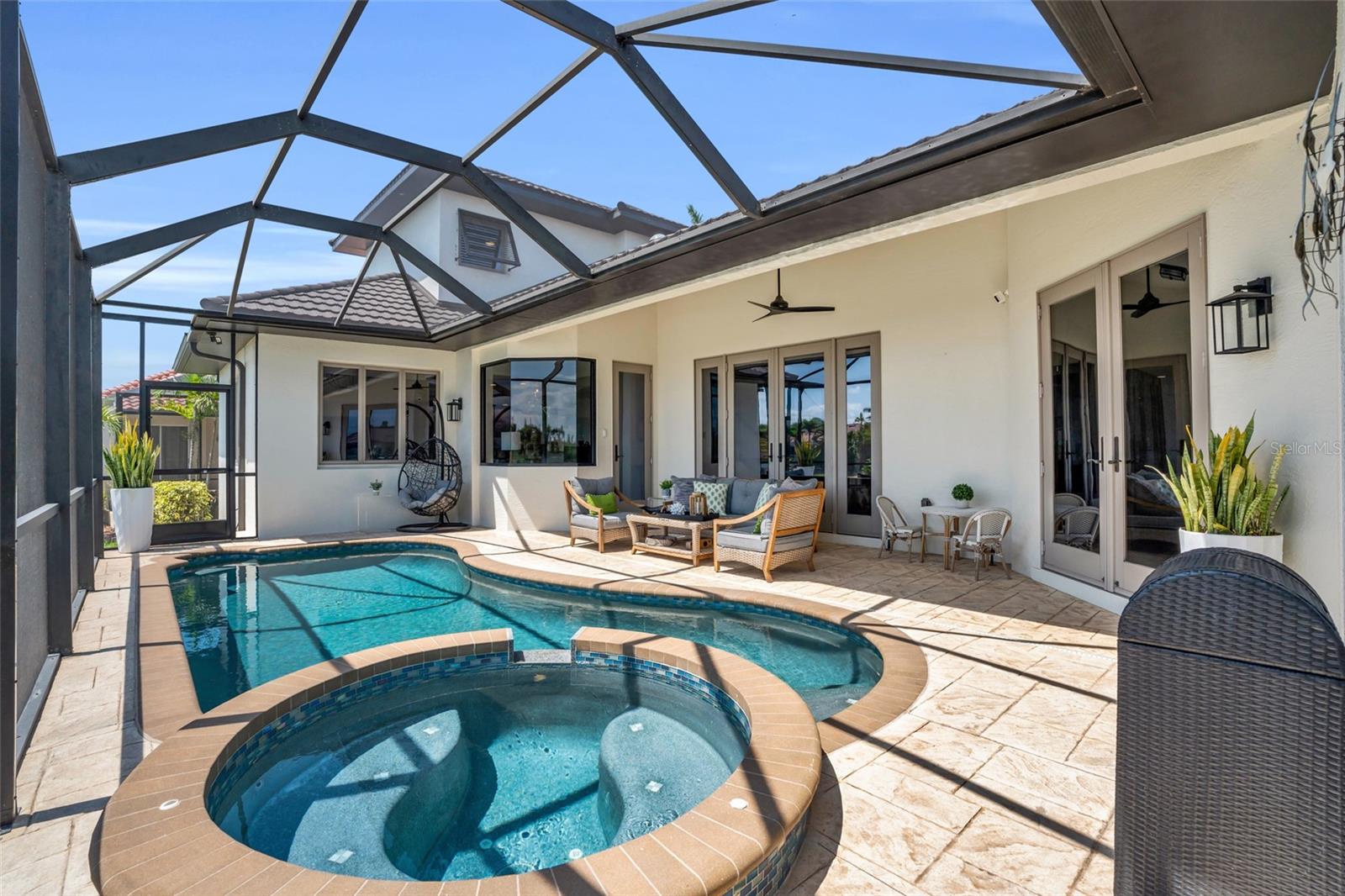 Discover this CUSTOM-built, one-of-a-kind WATERFRONT pool home in PUNTA GORDA ISLES, offering easy sailboat access to Charlotte Harbor & the Gulf via Buckley's Pass. This meticulously maintained residence features 73 feet of water frontage with a concrete seawall maintained by city, dock with elec/water, & a RARE 28,000 POUND BOAT LIFT. ALL DOCK POSTS ARE CONCRETE- not wood. Bunks for 2 jet skis &boat at this time. Step inside to an inviting semi-open floor plan with SOARING CEILINGS, highlighted by an elegant custom iron double entry door that is hurricane plus rated. The home boasts 3 bdrms, including a main-level master suite & an additional bedroom(4TH) or den , & 4 total baths. The interior is adorned with designer details such as soaring ceilings, arched built-ins, EIGHT FOOT INTERIOR AND EXTERIOR DOORS, stunning flooring, plantation shutters, French doors, designer light fixtures & a beautiful LIMESTONE surround fireplace in the living room. The oversized gourmet kitchen is a chef's dream, featuring cherry wood cabinetry, paneled BUILT-IN SUB ZERO refrigeration, granite counters & backsplash, a built-in oven, down draft cooktop, island, breakfast bar, pull outs, pantry, & a casual dining/bar area with an aquarium window to enjoy the stunning water views, plus a family room for additional relaxation space. The main level master suite provides private access to the lanai with double doors & includes a luxurious bath with marble, dual sinks, a garden tub, and a Roman shower. There are also 2 walk-in closets. An additional main level bedroom/den features soaring ceilings, California Closet modern built in with queen Murphy bed (seller willing to have prof. removed if buyer prefers), duel closets, drawers, built in light, charging station & overhead storage. The second floor houses two large bedrooms with walk-in closets & a separate marble guest bath. The outdoor entertaining area is perfect for gatherings, with a covered lanai, a half bath, an OUTDOOR SHOWER, & a screened, HEATED, SALTWATER pool and SPA with lovely WATERFALL FEATURE, all overlooking amazing water views that includes intersecting canal view. The lush tropical landscaping adds to the home’s great curb appeal. Winters are wonderful with opening up all the double doors to the lanai from the master suite & living room bringing the outdoors in. Located in a premier golf & boating community, this home is close to the Yacht Club, Country Club, Fishermen's Village, and Punta Gorda's historic downtown, which features restaurants, shopping, community events, and entertainment. Don’t miss this opportunity to own a piece of paradise. NOTABLE UPGRADES: Decra Stone Coated Metal Roofing w/ Lifetime Lim Warr. Upgraded Solid soffit system on both levels (Metal soffits are the first to go in a trop.storm) Extended Gutters on all sides of home. Outdoor accent lighting. All upper windows & some lower with new custom Bahama Lockable Shutters for extra prot. Emtek Solid Brass Knurled int.door knobs. 3 Baths have Linen closets. Laundry has pocket door with sink, cabinetry & shelving storage. Separate pool bath. Outdoor storage room great for pool/boat equip. HVAC UV light. LOW TRANSFERABLE FLOOD Insurance $1025 r/t elevation and 2nd level . NO HOA FEES. Lawn/Shrub/Tree trimming $165/month. Pool $140. 1 upper bdrm has triple bunks in walk-in closet that can be removed prior to closing.