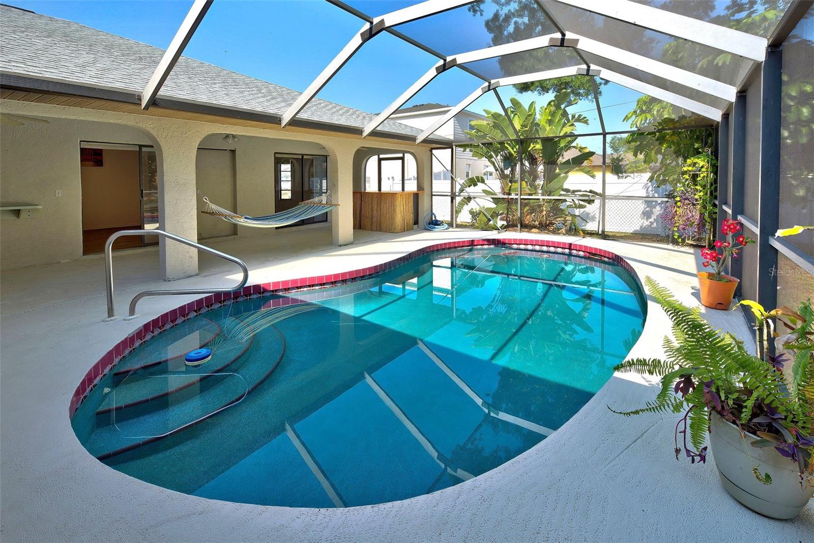 One or more photo(s) has been virtually staged. Wow...just reduced!!! Here's your opportunity to own a large Pool home a few blocks away from area schools. With this 3+ bedroom, 2 bath home, you'll have room for the whole gang! The split floor plan allows for everyone to have their own space and privacy. The Great Room right off the kitchen is a welcoming place for the family to hang out. It's bright and airy with vaulted ceilings and a skylight. The formal dining room is perfect for those family get togethers and holidays. The large primary suite features 2 walk in closets and en suite bathroom with double sinks, large walk in shower & huge linen closet. The other 2 bedrooms each have walk in closets and share a large bathroom which has access to the pool. The den/office at the front of the house could easily be a 4th bedroom, home gym, home schooling room or the "man cave"! The refreshing pool and private fenced back yard will bring you hours of fun with family and friends. The spacious kitchen has loads of cabinets and counter space with a breakfast bar and dinette space. The huge laundry room has a custom pantry for even more storage. The garage has plenty of storage with built in cabinets and shelves. This home has good bones and lots of potential. The roof and air conditioning are less than one year old too!!