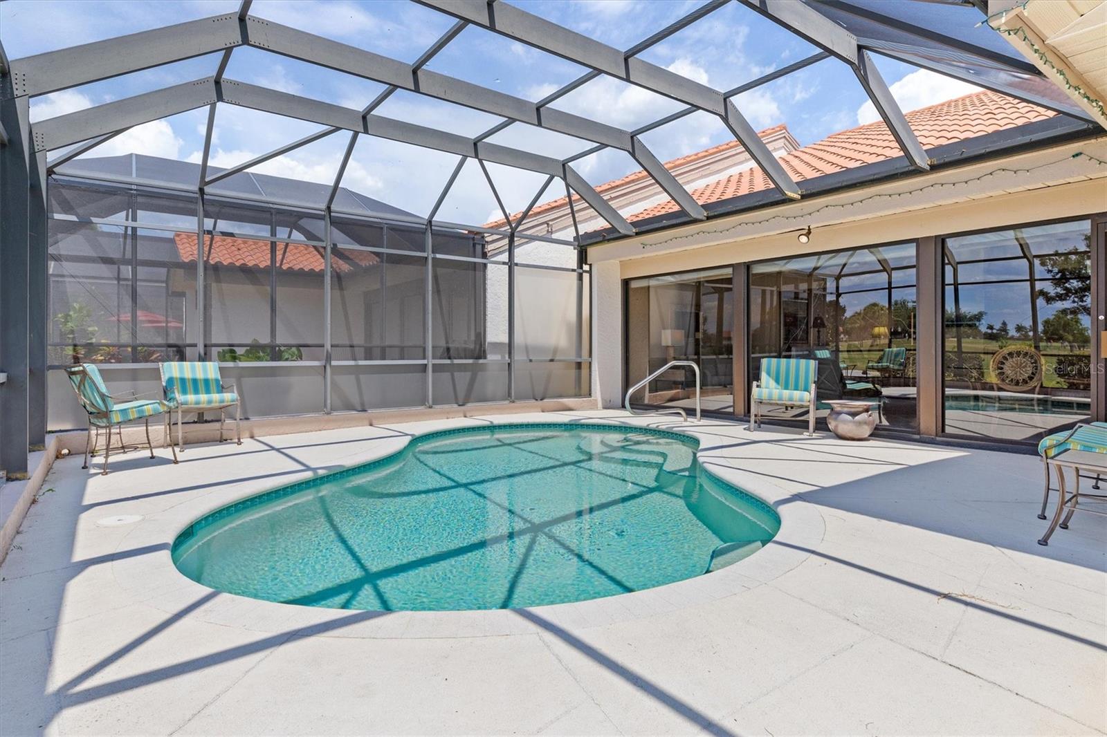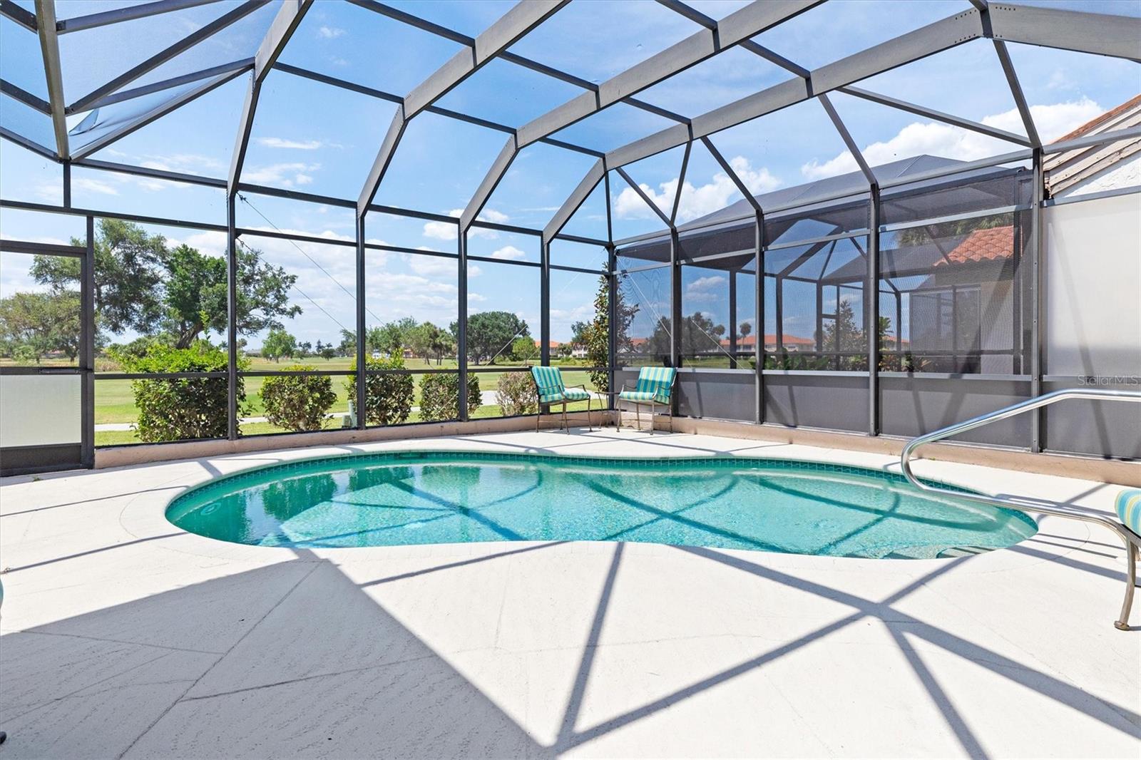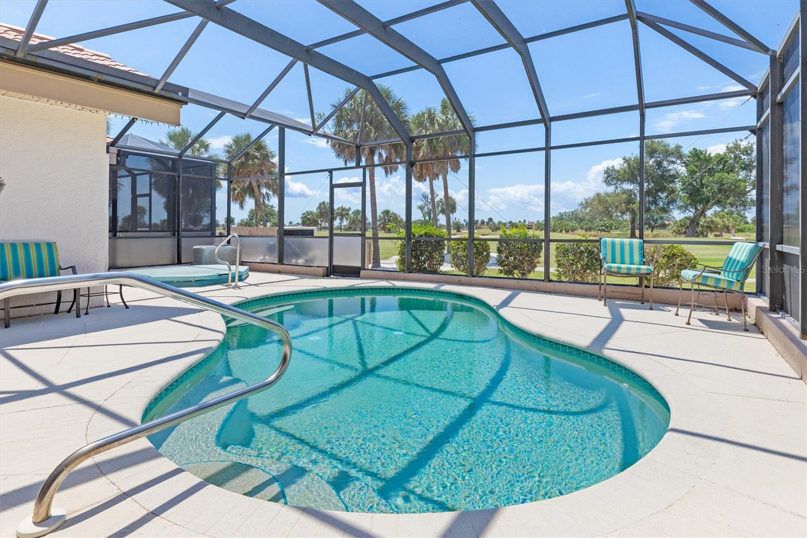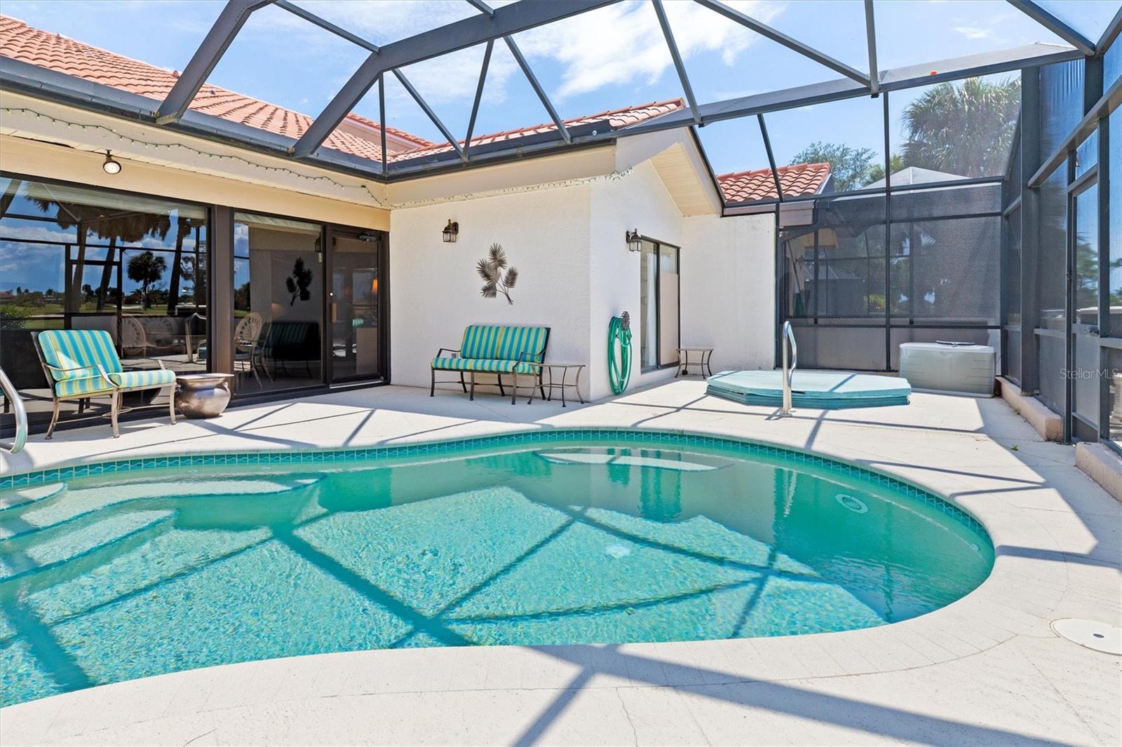 SIGNIFICANT PRICE ADJUSTMENT!!!! IMMACULATE 2 bedroom/2bath/ 1635 sq ft home with heated pool, spa and 2 car garage located in Burnt Store Villas is READY FOR YOU NOW. TASTEFULLY DECORATED AND TURNKEY! The villa entrance features a welcoming private courtyard/garden at the front door. The interior floor plan is designed to flow as the SPACIOUS great room/dining room is open to the kitchen and family room. With high ceilings, it is light and bright with splendid views of the kidney-shaped pool, ( new pump 2025) heated spa, screened lanai, and the golf course. A perfect place for entertaining or just relaxing! Beautiful diagonal 17” tile throughout plus new plank tile flooring in the bedrooms add to the value and appeal. The updated kitchen has custom wood cabinets, hard-surface countertops, stone backsplash, seamless sink, under cabinet lighting with Jenn-Air refrigerator and GE Profile range and microwave. The home has been re-plumbed and there is instant hot water in the kitchen and bath for your convenience. The generous primary bedroom has room for a sitting area. The en suite bath has attractive hard surface counter, tall cabinets, and tiled shower. You will love easy access to the spa/pool through sliding doors from your bathroom. A large walk-in closet and separate linen closet provide lots of storage. Other amenities include: handy inside laundry, guest bedroom with sizable closet and guest bath with tub/shower combination. 6 ceiling fans throughout the villa add to your comfort. The 2-car garage has a workbench and attic storage. LOW HOA monthly fee is $210 for 2025 which Includes lawn maintenance, trimming, spraying and annual driveway and roof cleaning. The community dock is a great place to throw in a line or have a glass of wine! Launch your kayak and enjoy the wildlife on Alligator Creek. This community is a hidden gem on private dead-end road, yet it’s walking distance to grocery store, restaurants, pharmacy, medical offices, pet store and more. Golfers will love the Twin Isles Golf Club (memberships available). Burnt Store Villas community is just minutes from historic downtown Punta Gorda (named top 10 best small town for several years) Fisherman’s Village, boutique shopping, unique restaurants plus the new Sunseeker Resort! Close to Rt 41, I-75 and Punta Gorda airport. READY TO MOVE IN!! OR GREAT INVESTMENT FOR LEASE. 3 MONTH MIN LEASE.