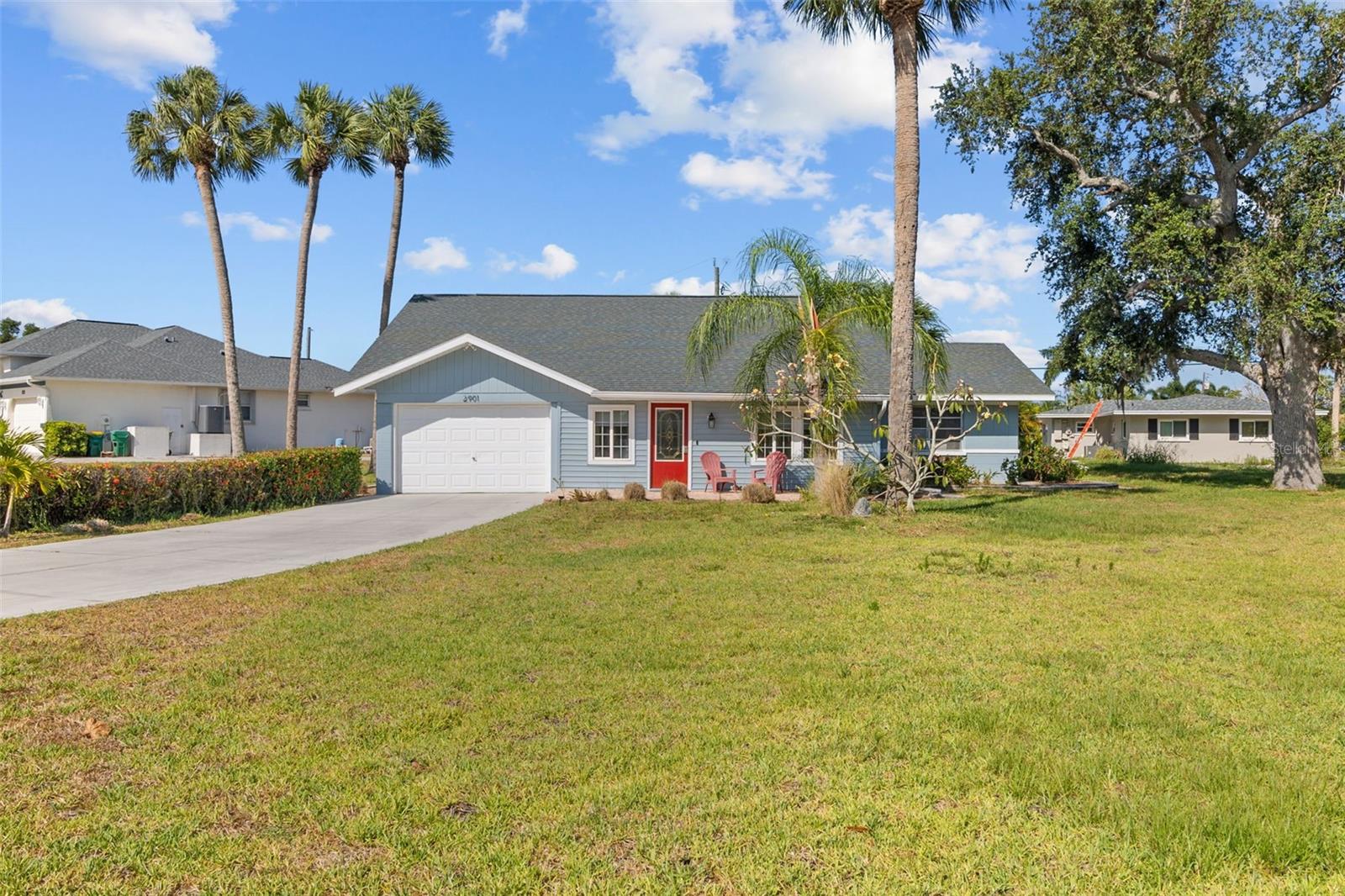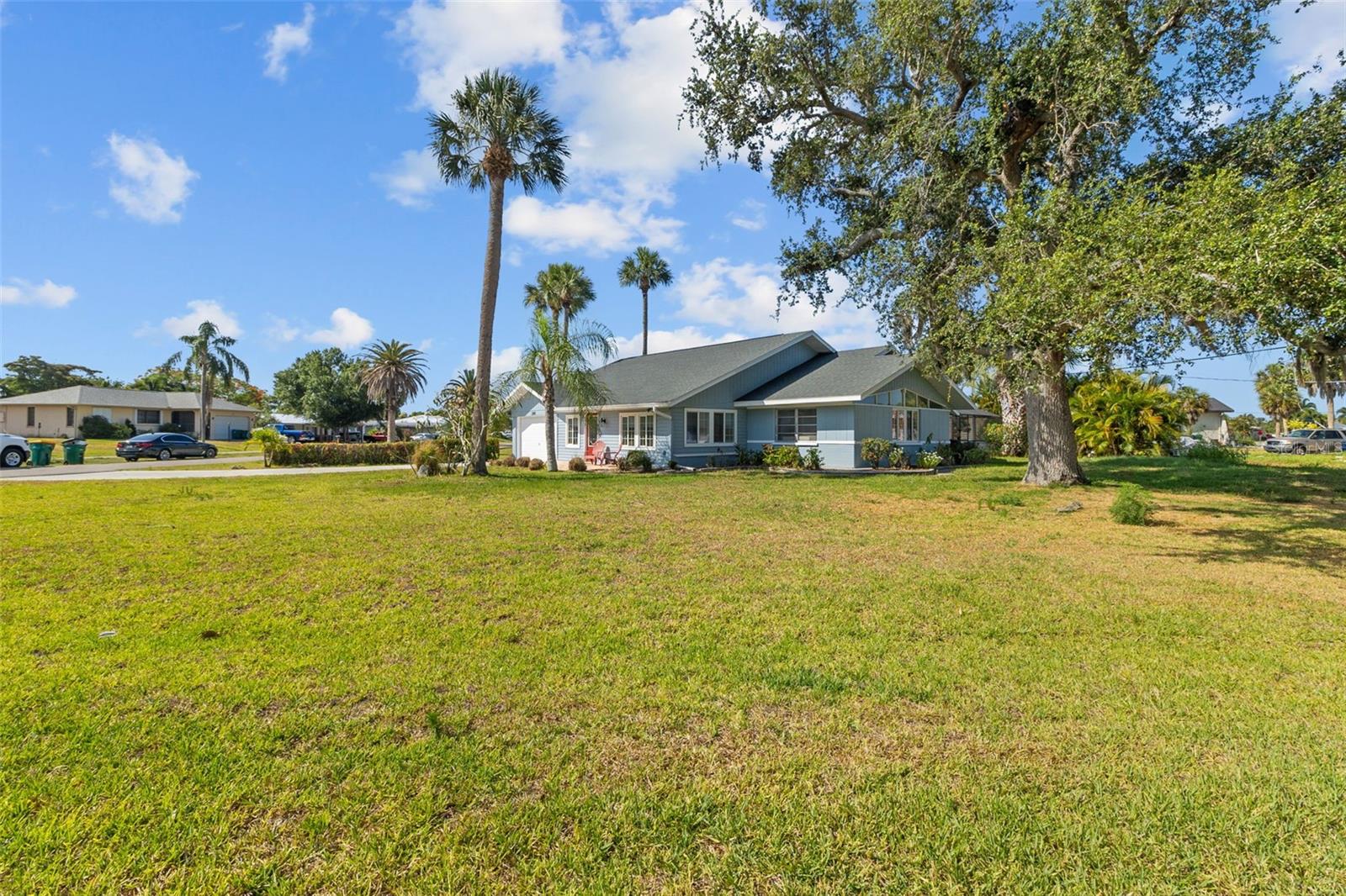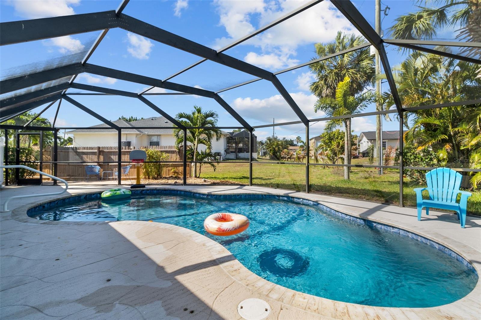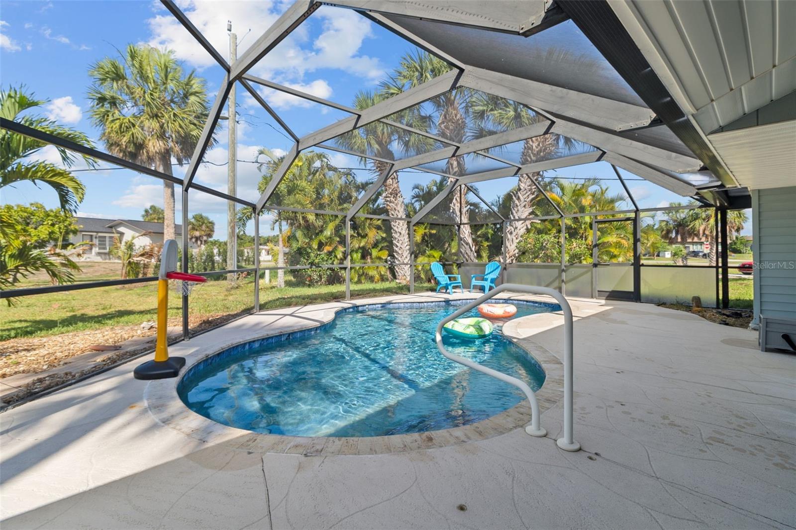 Embrace coastal charm in this delightful 3-bedroom, 2-bath Pool home in Punta Gorda, FL. Situated on an oversized corner lot with mature trees, this residence boasts an abundance of natural light throughout its open floor plan. Enjoy vaulted ceilings, a corner fireplace, and a sky-lit kitchen featuring wood cabinets and countertops. The primary bedroom is a serene retreat with exposed beams and an en-suite bathroom adorned with a stained-glass window, jetted bathtub, and shower. Bright guest bedrooms with high-set windows and a guest bathroom with a spacious walk-in tiled shower offer comfort for all. Additional features include a new roof (2023), newly resurfaced pool, sunroom, oversized laundry room, and smart thermostat. The lanai and pool area, featuring an outdoor shower, create an ideal space for entertaining and relaxation. Boaters will appreciate the private boat ramp access available for a small monthly fee, making it easy to explore the pristine waters of Charlotte Harbor. Just a 5-minute drive from downtown Punta Gorda and Fisherman's Village, offering a variety of dining, shopping, and entertainment options, this home perfectly combines comfort, style, and convenience, creating the ideal coastal lifestyle.