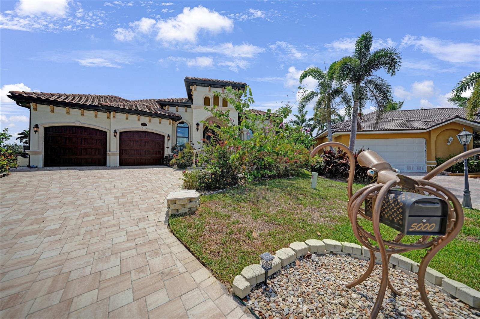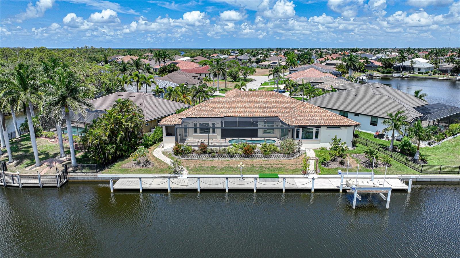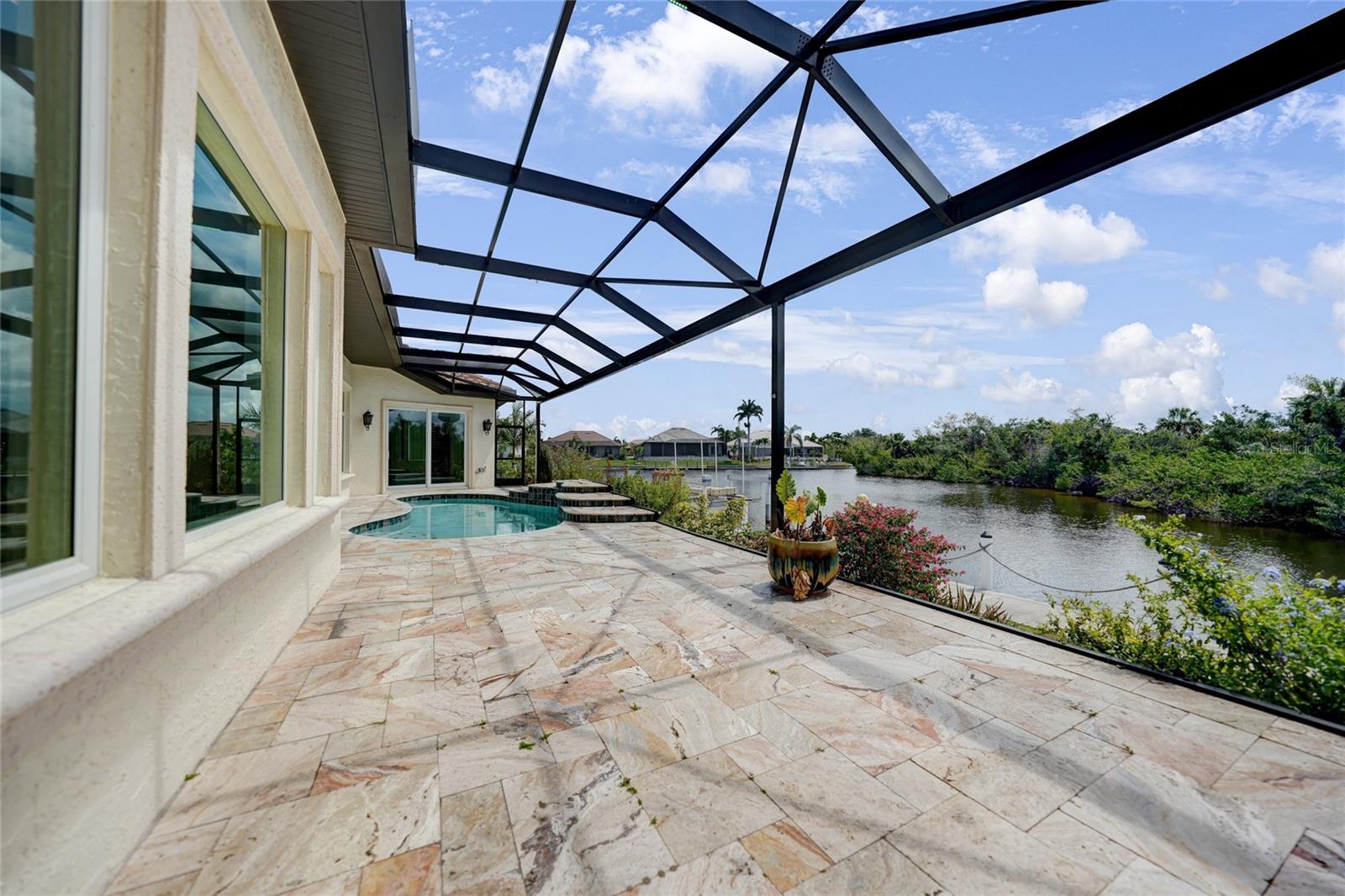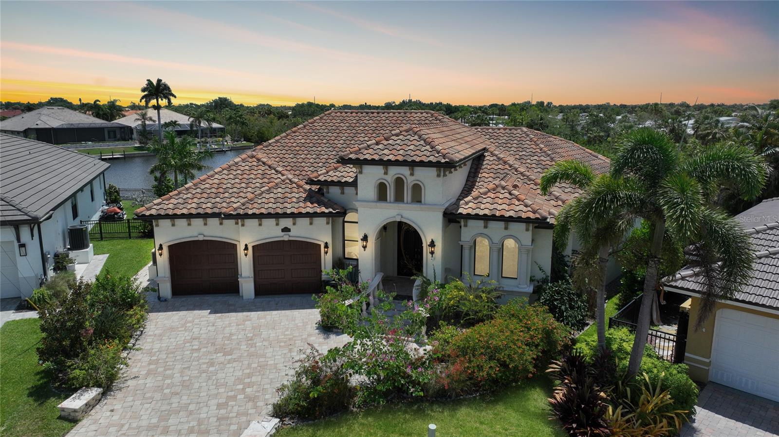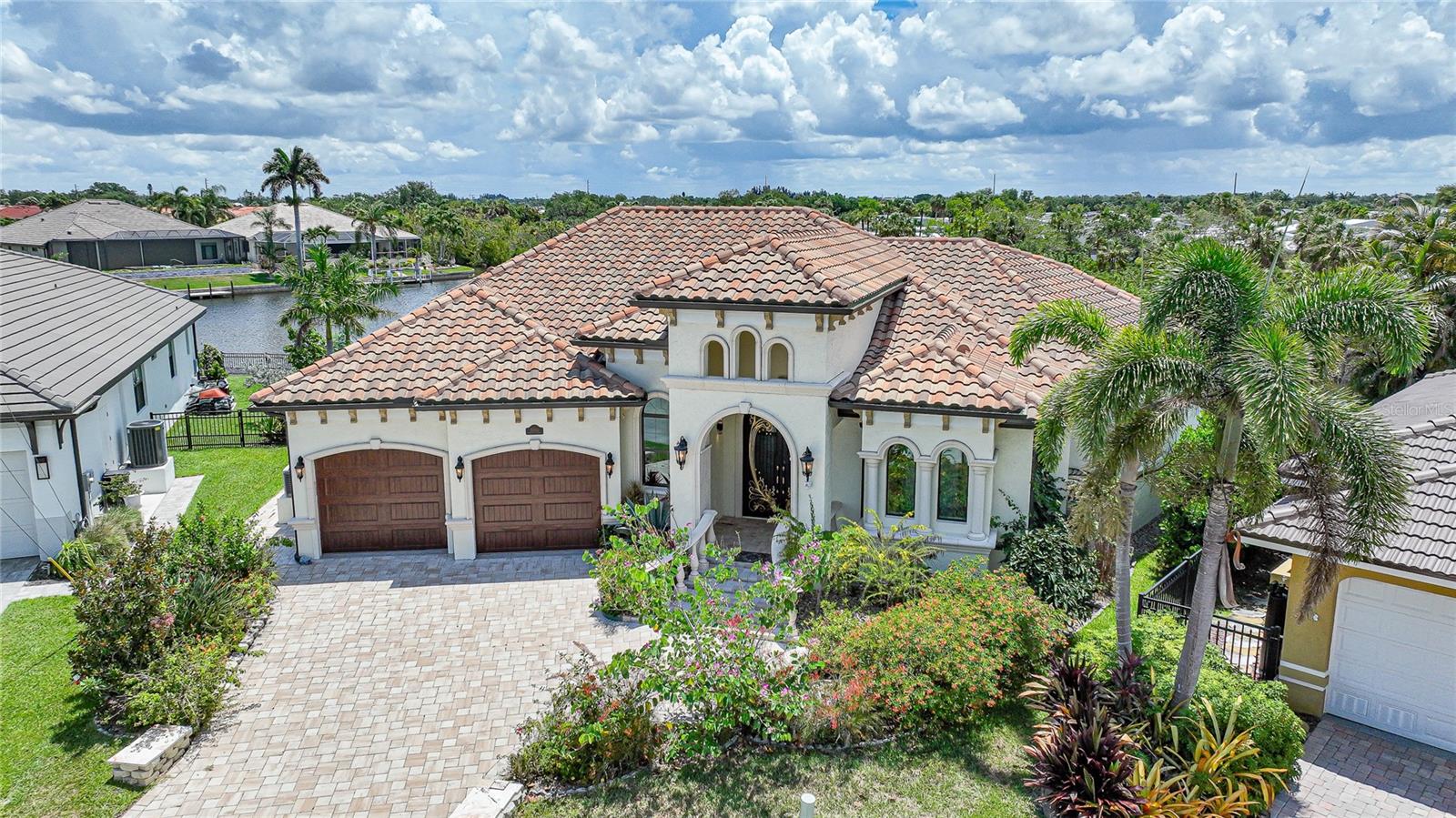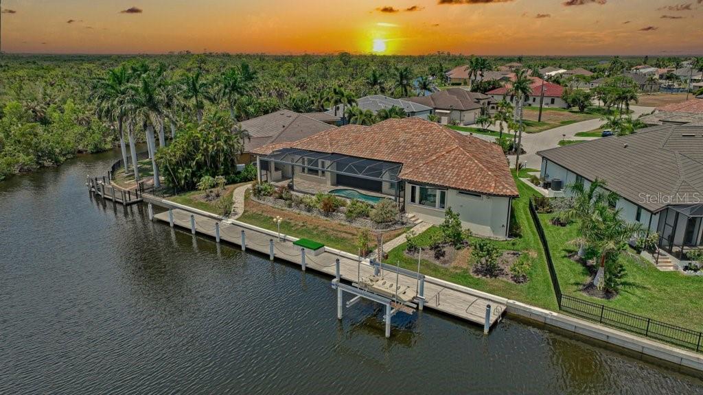 Live the dream in this magnificent waterfront estate, situated on a key lot in Punta Gorda's Burnt Store Isles golfing and boating community. Unwind in unparalleled luxury. This 2,709 sq ft haven offers a split floor plan of 3 bedrooms, 3 baths, dual lavish primary suites, and a chef’s kitchen, all with water and nature preserve views. The spacious chef’s kitchen is enhanced with top-tier Thermador and Meile appliances, solid wood cabinets, a gas range with a handcrafted commercial-grade copper hood, three ovens, and an artisan copper and verdigris sink. Dine in the dining area or at the stunning waterfall island, and take in the expansive zero-corner water views. Each primary suite features waterfront views, spacious closets, and opulent en suite bathrooms. With hand-carved sinks and sumptuous bathing areas, one suite’s Roman shower enclosure is highlighted by a bespoke carved glass surround. On sailboat water with access to Charlotte Harbor and the Gulf of Mexico, the key lot offers 140 feet of frontage and a 120-foot tile dock with a 20,000 lb. lift. Entertain in the outdoor kitchen or relax by the pool while nature surrounds appreciate the waterfowl, manatees, and the serene beauty of the water and nature preserve. Drive down the cul-de-sac to the whimsical Louis Vuitton octopus mailbox. The entire home boasts soaring 12 to 14-foot ceilings. Enjoy year-round comfort with a 20K generator with a 500-gallon fuel tank, hurricane protection, reverse-osmosis water filtration, and four-zone air conditioning – including the oversized garage. Make an appointment today to see this incredible home.