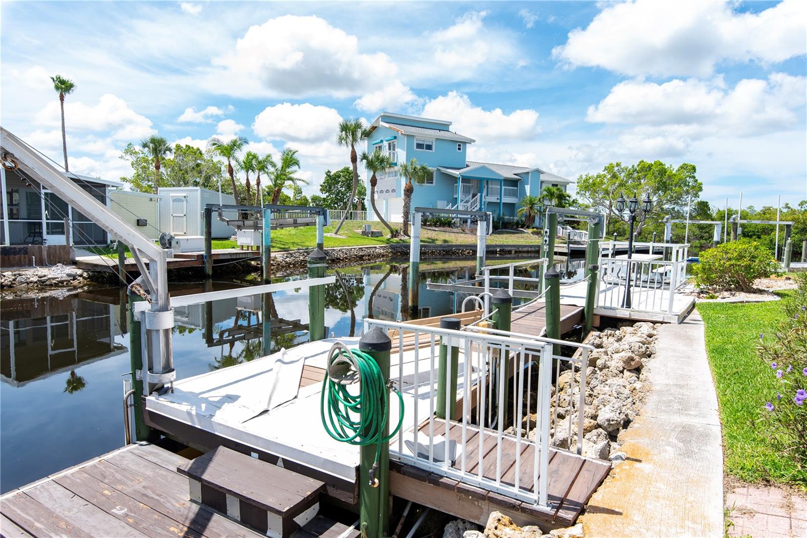 Nestled within the desirable 55+ community of Windmill Village, this charming waterfront property offers a blend of elegance and comfort. The residence features 2 bedrooms and 2 bathrooms, boasting an open concept design enhanced by drywall finishes and crown molding throughout. The kitchen is a chef's delight with granite counters, ample storage, a cozy dining space, and modern stainless steel appliances, including a refrigerator and stove. Newer roof and new carport in 2023. An insulated Florida room and a convenient laundry room add to the home's functionality. The outdoor space is equally impressive, with a 42-foot long grandfathered dock, a 7000 lb boat lift, hurricane shutters, and a spacious deck that provides stunning water views. Additionally, a workshop with loft storage caters to all your creative and storage needs. This property truly captures the essence of serene waterfront living. Plus, the HOA of $230.00 covers water, sewer, trash, grass maintenance, common area upkeep, and road maintenance, ensuring a hassle-free lifestyle for residents. Don't miss your chance to experience the comfort and convenience of waterfront living in this meticulously maintained home at Windmill Village! This active lifestyle community features two private marinas, boat ramp, trailer storage yard, horseshoe pits, shuffleboard, bocce ball, billiards, indoor pickleball, a large community center and many clubs catering to your hobby interests. The Pavilion by the heated pool offers an area for holding gatherings. Punta Gorda was voted “#1 Best Small Place to Live” by Money Magazine and Forbes. Purchase price does not include $20,285 for Buy-In Share and Bond, which is refunded when you sell. Don't miss the opportunity to make this thoughtfully upgraded and beautifully maintained home in Windmill Village yours! Schedule your showing today-this is your paradise.