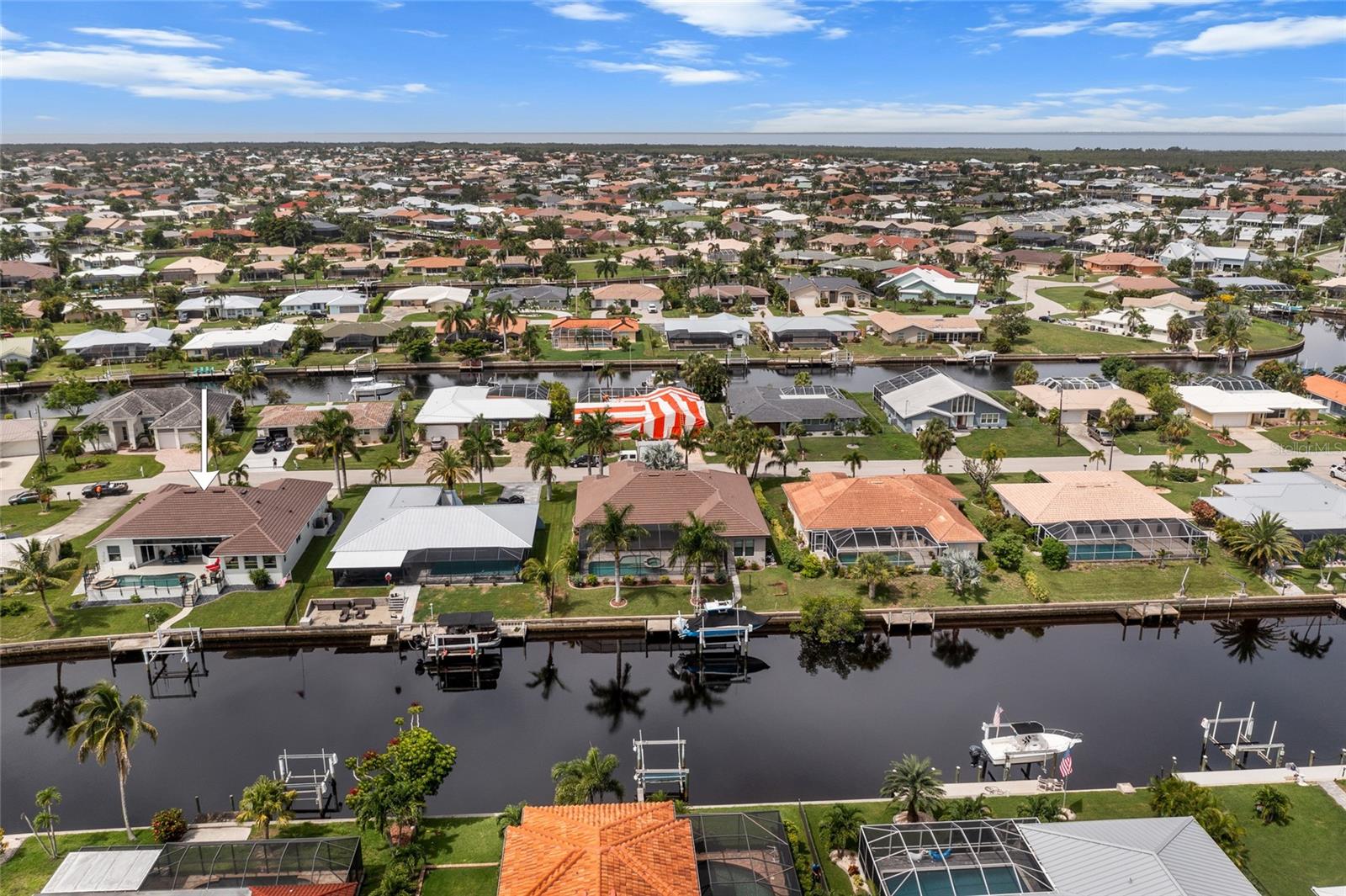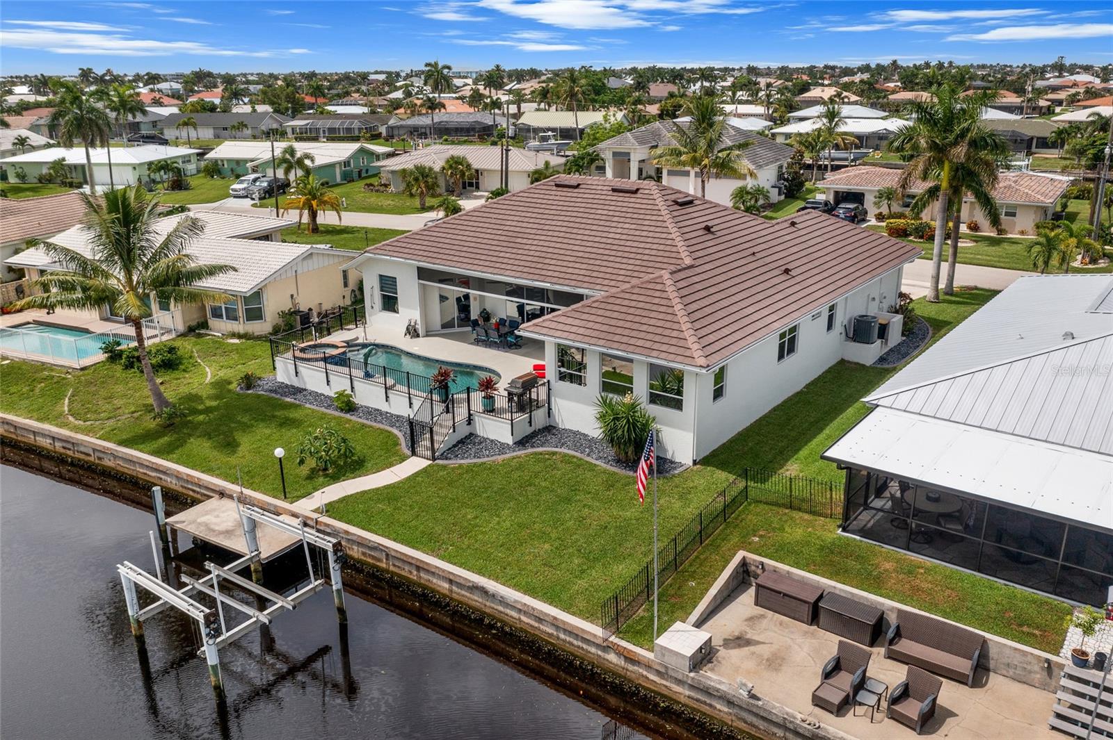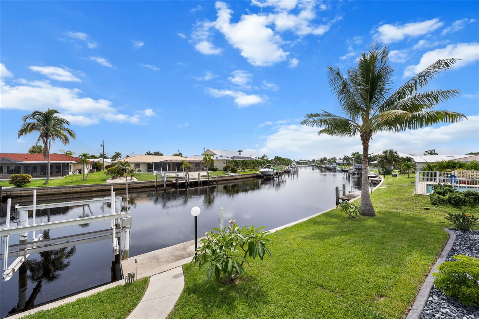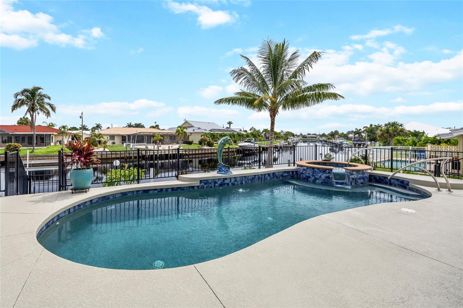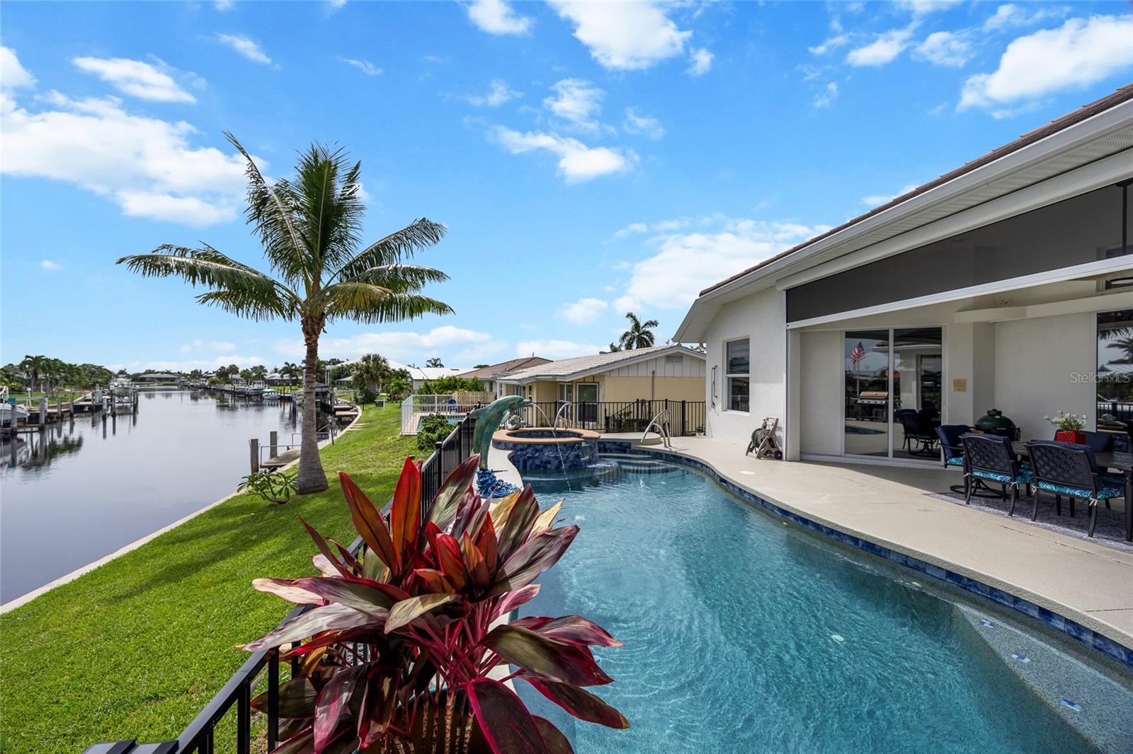 LOOKING FOR A NEW HOME, THIS COMPLETELY REMODELED HOME IS IT! This gorgeous 3-bedroom, 2-bath, 2-car garage waterfront pool home offers a modern lifestyle with stunning features and 10-minute powerboat access to Charlotte Harbor leading to the Gulf of Mexico! This home is designed for those who appreciate luxury, leisure and awesome views of the pool and water from almost every room! As you step inside, you'll be greeted by an open floor plan with many custom features and updates including volume and tray ceilings, crown molding, transom windows, arched entryways, built-in accents, custom window treatments and new NuCORE LVP flooring in the main areas, creating an inviting and spacious atmosphere. The living room boasts a lighted double tray ceiling and a 12’ pocket slider that opens to the pool and water views, allowing for seamless indoor-outdoor living. The remodeled kitchen is a chef's dream, featuring an 11’ x 5’ quartzite island, new contemporary interior lighting, and new kitchen appliances including a 36” KitchenAid range. The breakfast nook with an aquarium window offers a delightful spot to enjoy your morning coffee. There is also a spacious bonus room that can serve as additional dining room or game room. The extra-large primary suite is a serene retreat with a pocket slider to the pool, his and hers walk-in closets, and a remodeled master bath highlighted by dual vanities, a walk-in shower with herringbone tile, and a freestanding tub. The split floor plan provides privacy for guests, with new carpet in the guest bedrooms. Step outside to the covered lanai and remodeled heated saltwater pool and spa with dolphin water feature and Intellibrite lighting, a great space for entertaining. For the boating enthusiast, this property offers 73' of waterfrontage, concrete dock with water and electric and a 10,000 lb. boat lift. This home is not just about luxury indoors; it also offers a 30’ motorized retractable lanai screen, a new decorative iron fence surrounding the patio/pool, and mature tropical landscaping, creating a private oasis for relaxation and entertainment. Additional notable features include new tile roof (2023), Manabloc plumbing system, new epoxy floor in garage and new total coverage interior and exterior paint. Located in a popular golf and boating community, this home is just minutes from the Yacht Club, Fishermen's Village, and the historic downtown area of Punta Gorda. Enjoy access to arts, community events, entertainment, world-class fishing, boating, fine dining, and beautiful parks, as well as easy access to the SWFL gulf beaches. Don't miss the opportunity to make this exceptional home your new Florida retreat! Schedule your private showing today!