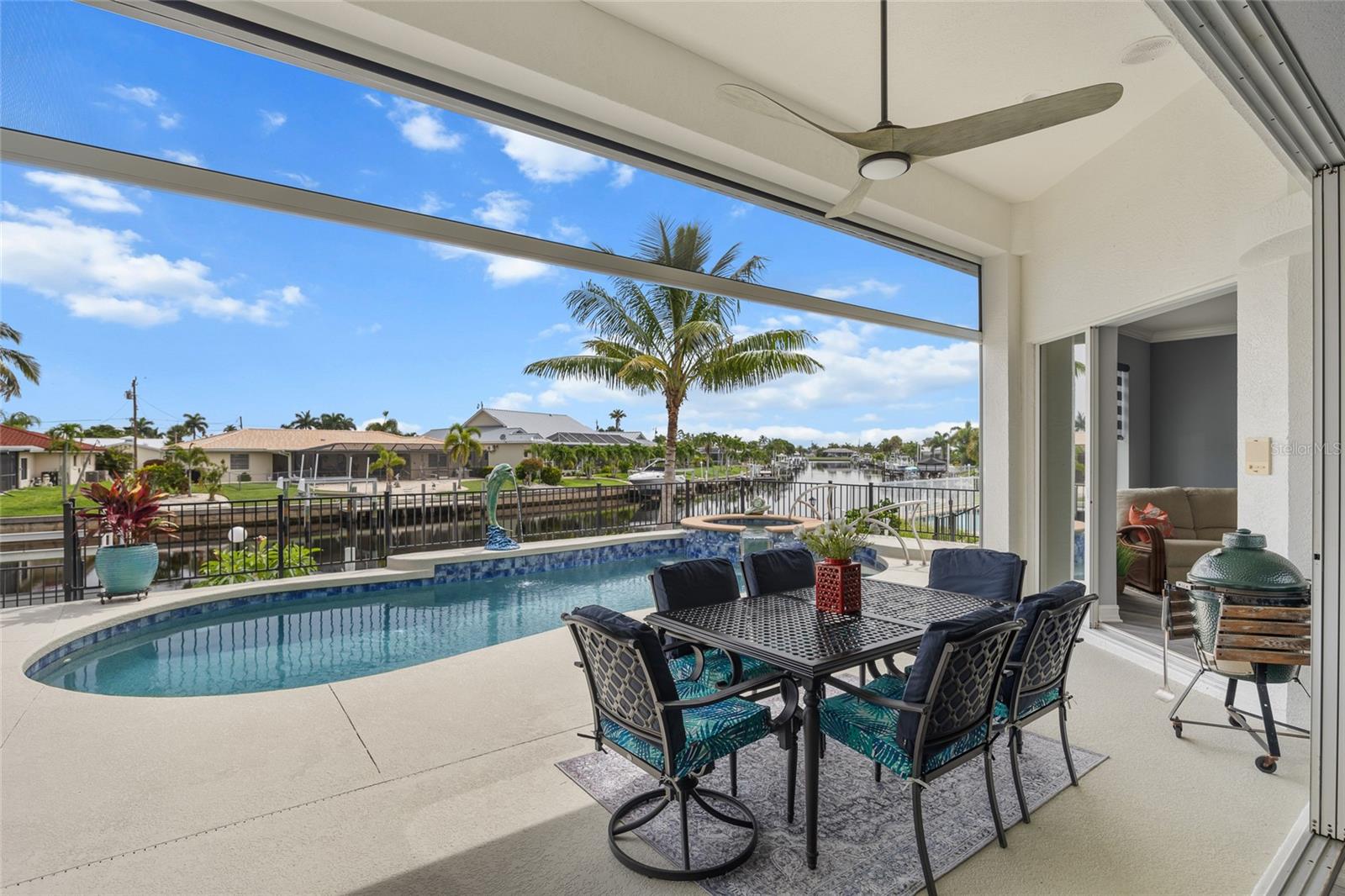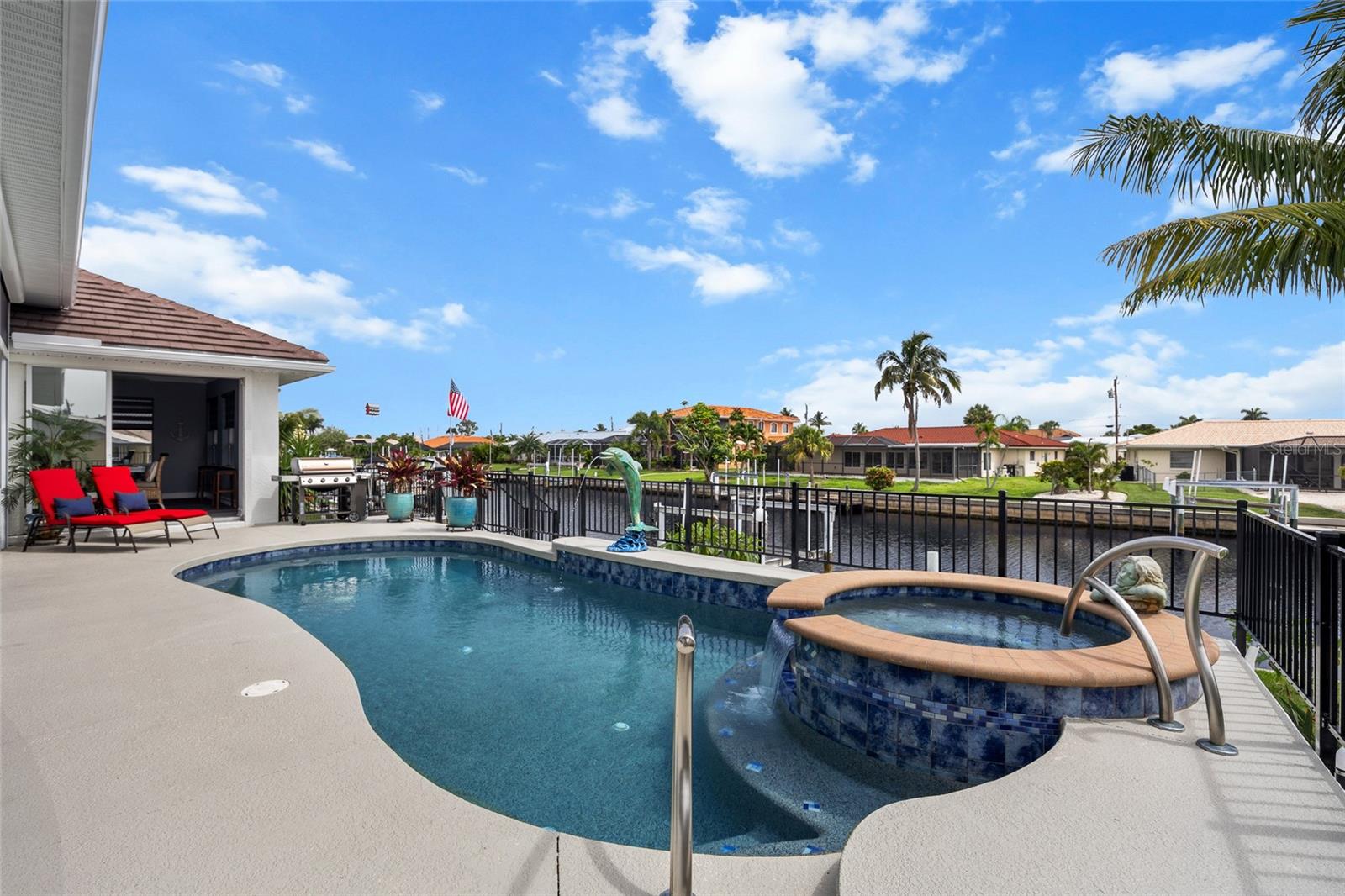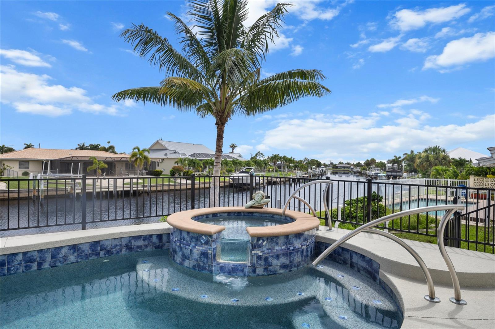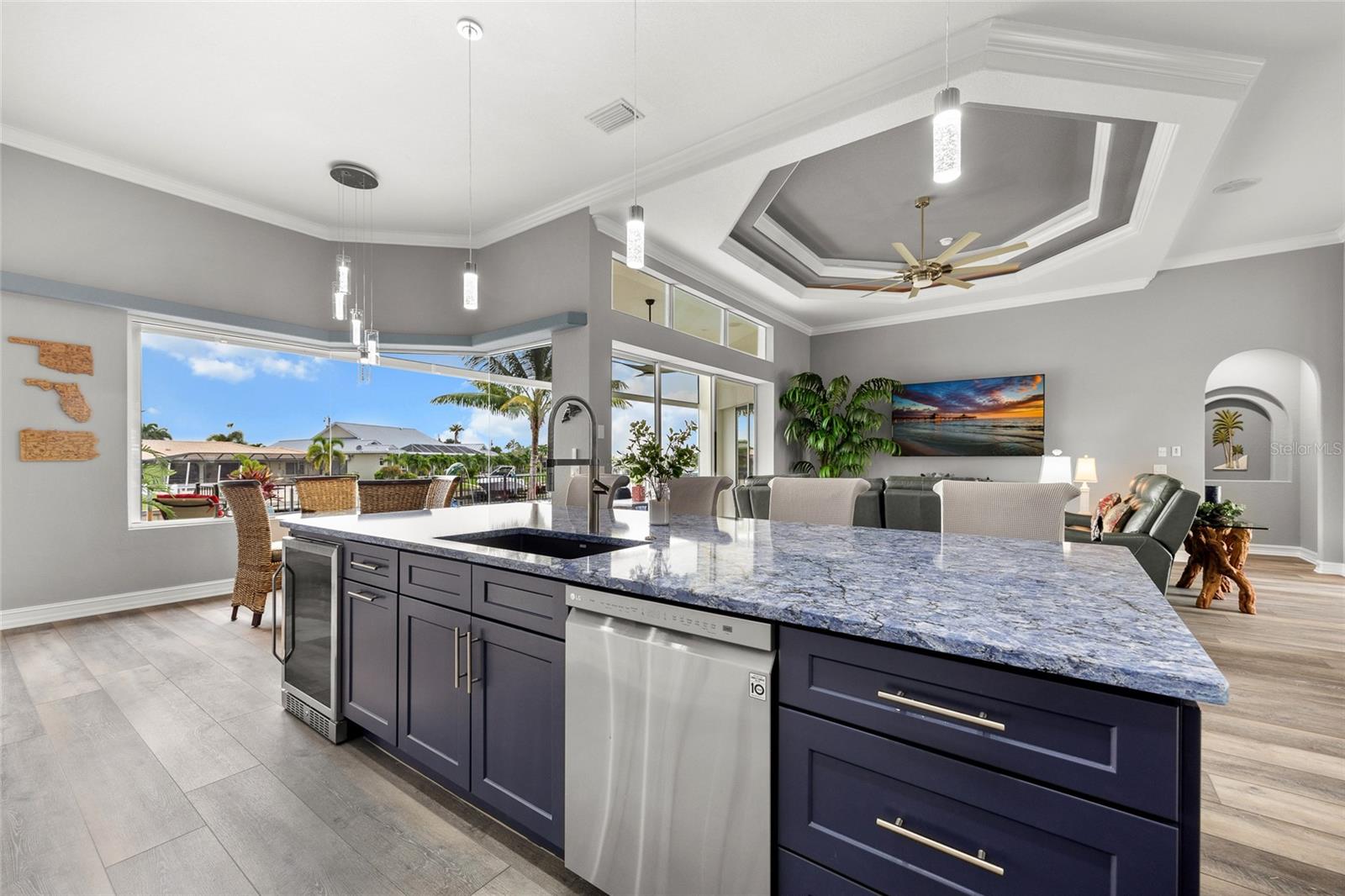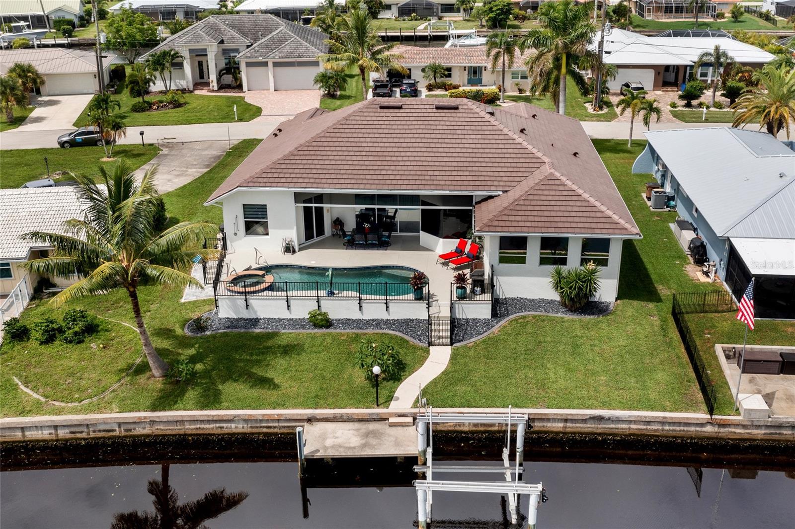 LOOKING FOR A NEW HOME, THIS COMPLETELY REMODELED HOME IS IT! This gorgeous 3-bedroom, 2-bath, 2-car garage waterfront pool home offers a modern lifestyle with stunning features and 10-minute powerboat access to Charlotte Harbor leading to the Gulf of Mexico! This home is designed for those who appreciate luxury, leisure and awesome views of the pool and water from almost every room! As you step inside, you'll be greeted by an open floor plan with many custom features and updates including volume and tray ceilings, crown molding, transom windows, arched entryways, built-in accents, custom window treatments and new NuCORE LVP flooring in the main areas, creating an inviting and spacious atmosphere. The living room boasts a lighted double tray ceiling and a 12’ pocket slider that opens to the pool and water views, allowing for seamless indoor-outdoor living. The remodeled kitchen is a chef's dream, featuring an 11’ x 5’ quartzite island, new contemporary interior lighting, and new kitchen appliances including a 36” KitchenAid range. The breakfast nook with an aquarium window offers a delightful spot to enjoy your morning coffee. There is also a spacious bonus room that can serve as additional dining room or game room. The extra-large primary suite is a serene retreat with a pocket slider to the pool, his and hers walk-in closets, and a remodeled master bath highlighted by dual vanities, a walk-in shower with herringbone tile, and a freestanding tub. The split floor plan provides privacy for guests, with new carpet in the guest bedrooms. Step outside to the covered lanai and remodeled heated saltwater pool and spa with dolphin water feature and Intellibrite lighting, a great space for entertaining. For the boating enthusiast, this property offers 73' of waterfrontage, concrete dock with water and electric and a 10,000 lb. boat lift. This home is not just about luxury indoors; it also offers a 30’ motorized retractable lanai screen, a new decorative iron fence surrounding the patio/pool, and mature tropical landscaping, creating a private oasis for relaxation and entertainment. Additional notable features include new tile roof (2023), Manabloc plumbing system, new epoxy floor in garage and new total coverage interior and exterior paint. Located in a popular golf and boating community, this home is just minutes from the Yacht Club, Fishermen's Village, and the historic downtown area of Punta Gorda. Enjoy access to arts, community events, entertainment, world-class fishing, boating, fine dining, and beautiful parks, as well as easy access to the SWFL gulf beaches. Don't miss the opportunity to make this exceptional home your new Florida retreat! Schedule your private showing today!