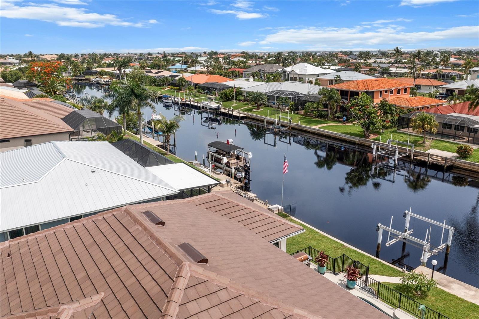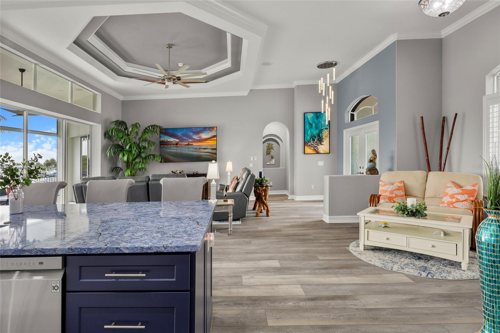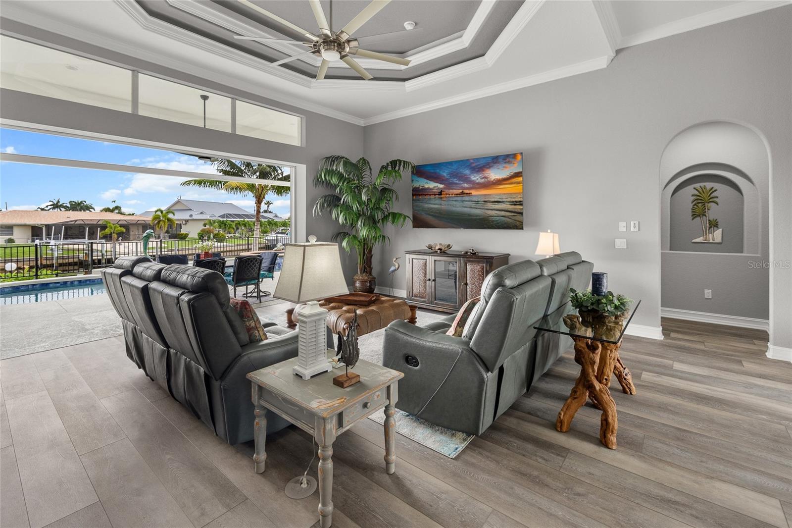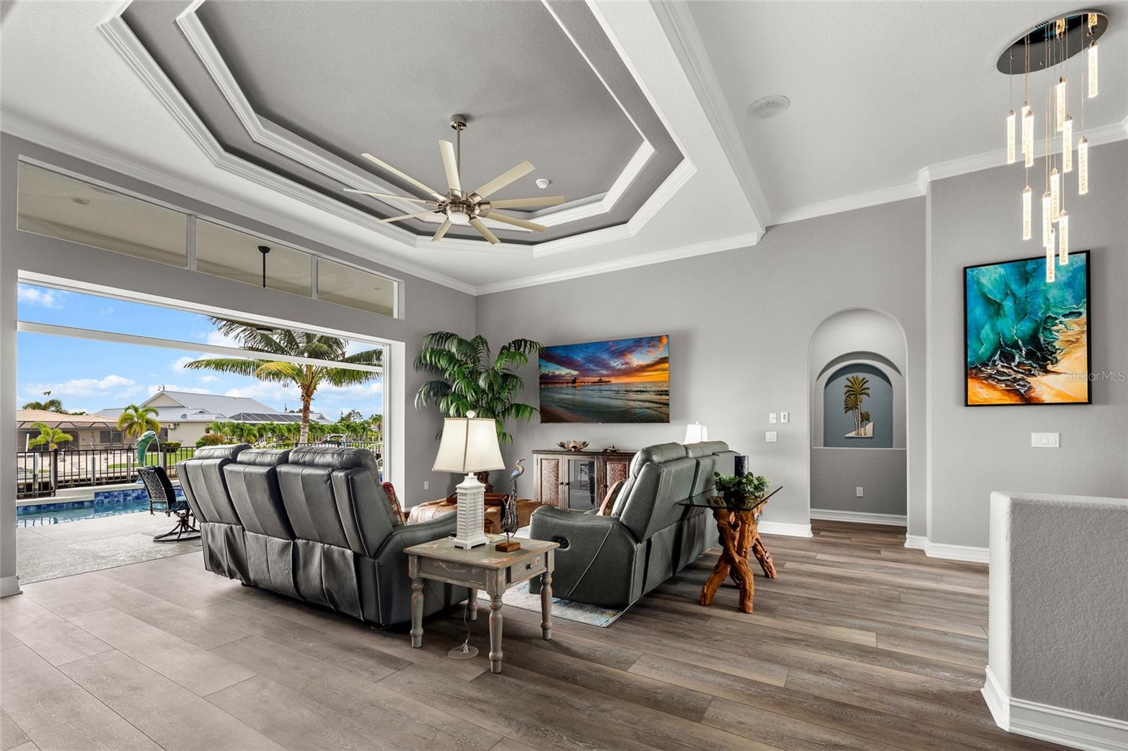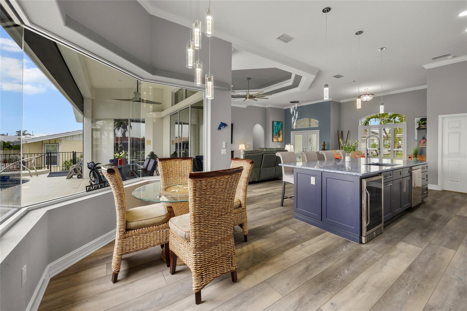 LOOKING FOR A NEW HOME, THIS COMPLETELY REMODELED HOME IS IT! This gorgeous 3-bedroom, 2-bath, 2-car garage waterfront pool home offers a modern lifestyle with stunning features and 10-minute powerboat access to Charlotte Harbor leading to the Gulf of Mexico! This home is designed for those who appreciate luxury, leisure and awesome views of the pool and water from almost every room! As you step inside, you'll be greeted by an open floor plan with many custom features and updates including volume and tray ceilings, crown molding, transom windows, arched entryways, built-in accents, custom window treatments and new NuCORE LVP flooring in the main areas, creating an inviting and spacious atmosphere. The living room boasts a lighted double tray ceiling and a 12’ pocket slider that opens to the pool and water views, allowing for seamless indoor-outdoor living. The remodeled kitchen is a chef's dream, featuring an 11’ x 5’ quartzite island, new contemporary interior lighting, and new kitchen appliances including a 36” KitchenAid range. The breakfast nook with an aquarium window offers a delightful spot to enjoy your morning coffee. There is also a spacious bonus room that can serve as additional dining room or game room. The extra-large primary suite is a serene retreat with a pocket slider to the pool, his and hers walk-in closets, and a remodeled master bath highlighted by dual vanities, a walk-in shower with herringbone tile, and a freestanding tub. The split floor plan provides privacy for guests, with new carpet in the guest bedrooms. Step outside to the covered lanai and remodeled heated saltwater pool and spa with dolphin water feature and Intellibrite lighting, a great space for entertaining. For the boating enthusiast, this property offers 73' of waterfrontage, concrete dock with water and electric and a 10,000 lb. boat lift. This home is not just about luxury indoors; it also offers a 30’ motorized retractable lanai screen, a new decorative iron fence surrounding the patio/pool, and mature tropical landscaping, creating a private oasis for relaxation and entertainment. Additional notable features include new tile roof (2023), Manabloc plumbing system, new epoxy floor in garage and new total coverage interior and exterior paint. Located in a popular golf and boating community, this home is just minutes from the Yacht Club, Fishermen's Village, and the historic downtown area of Punta Gorda. Enjoy access to arts, community events, entertainment, world-class fishing, boating, fine dining, and beautiful parks, as well as easy access to the SWFL gulf beaches. Don't miss the opportunity to make this exceptional home your new Florida retreat! Schedule your private showing today!