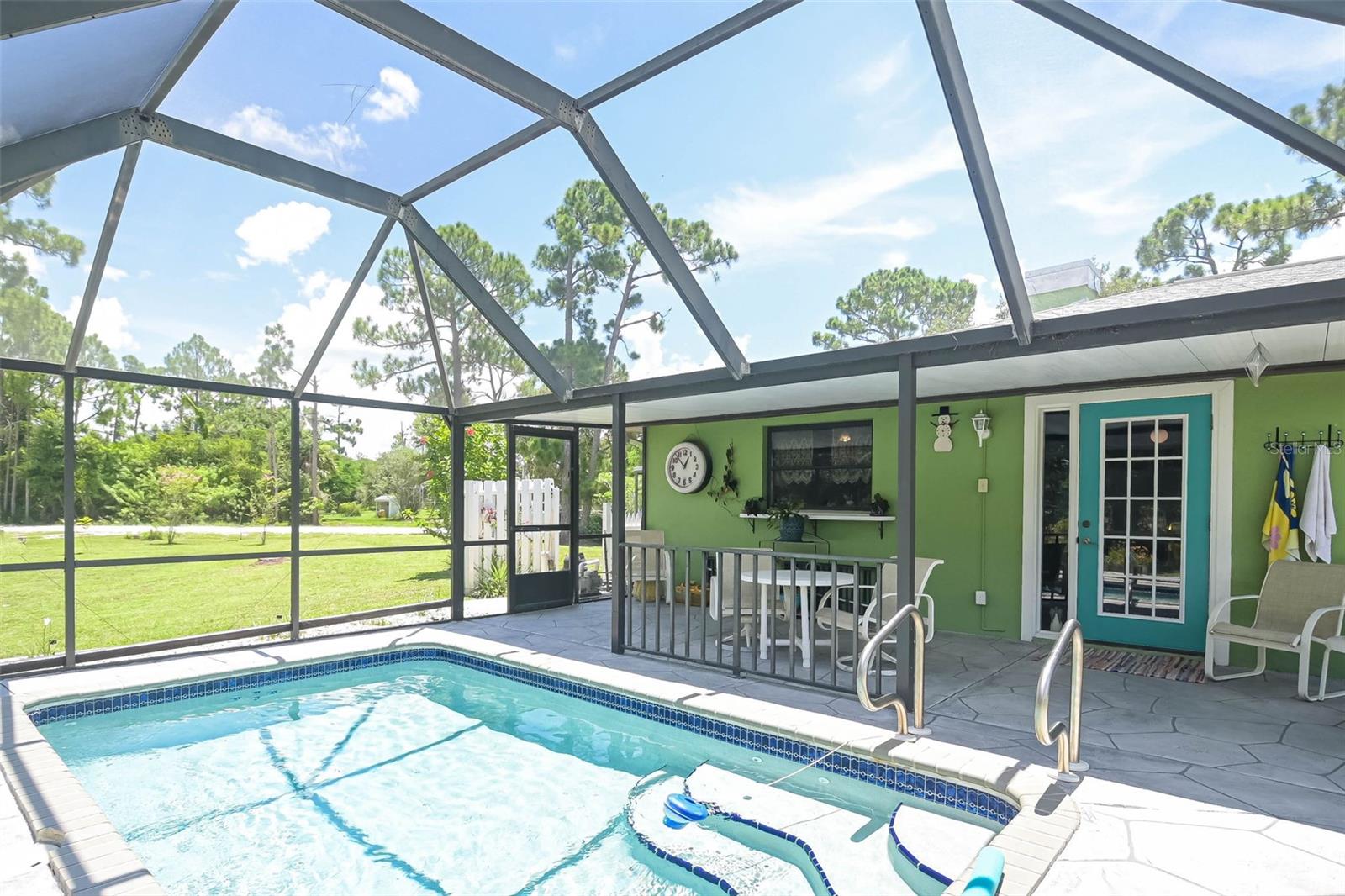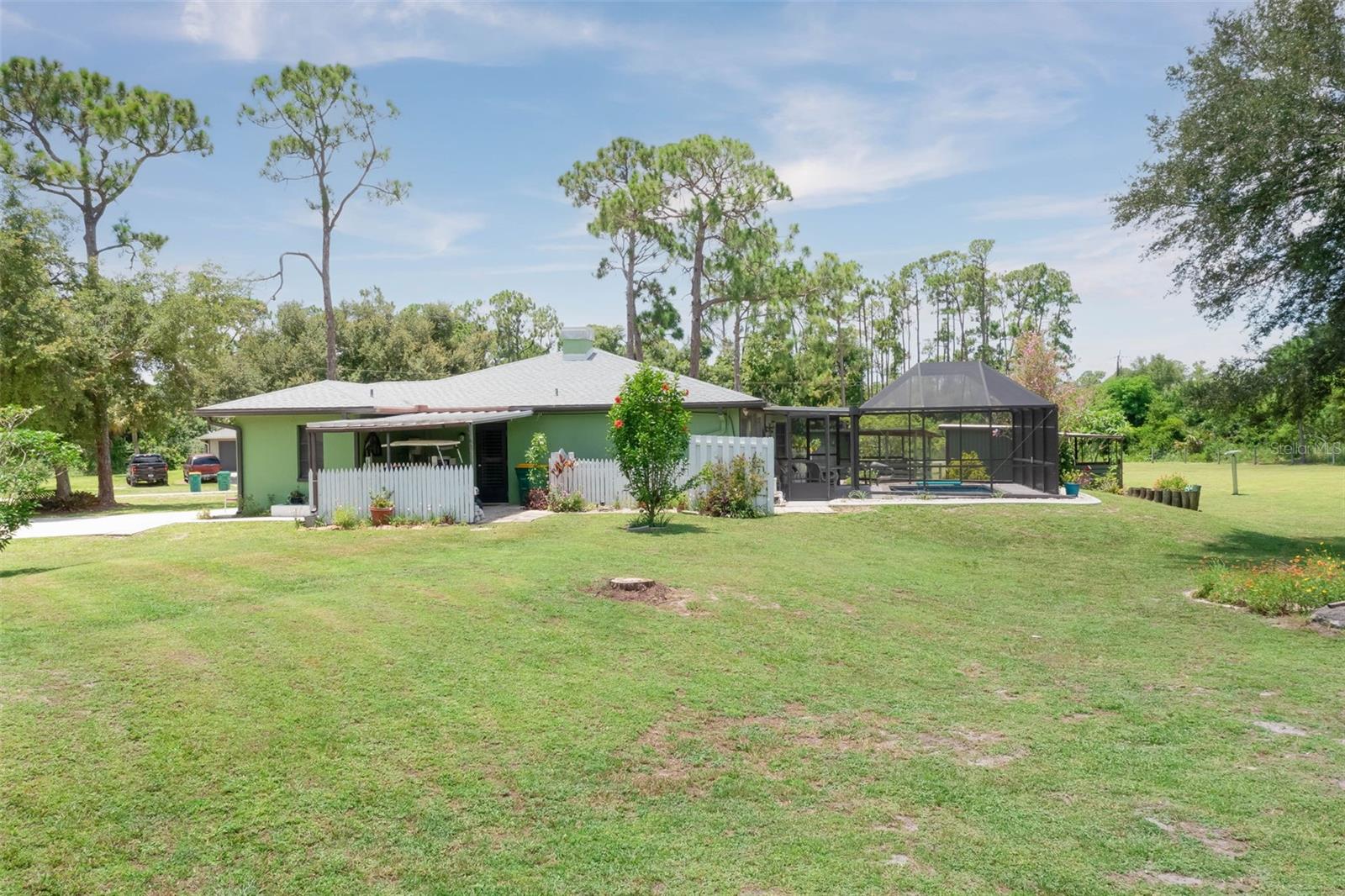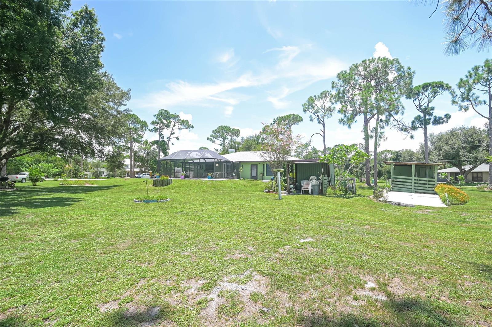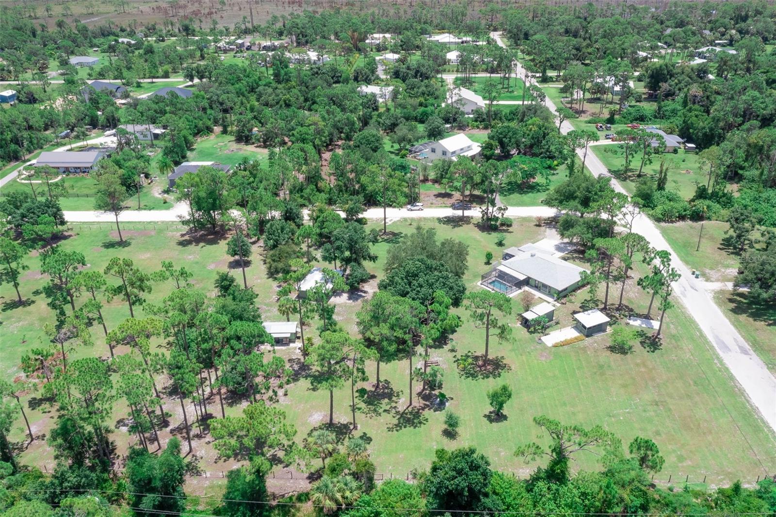 Escape to your country retreat in sunny Florida, where your dream home awaits on 2.5 acres (about the area of a Manhattan city block) of agriculture land that allows peace and quiet for relaxing days and evenings, the ability to become a self-sustaining farm, or even a petting zoo. Enjoy preparing pool side BBQ, low-key dinners, family brunch or happy-hour charcuterie masterpieces in this updated kitchen with granite counter tops, solid wood cabinetry, and plenty of prep space. A private-entrance bonus room allows privacy for extended guests, adult family members, or a business –in-home office. Enjoy cozy evenings around the fireplace, hot summer pool parties, or working on the farm – this is country living at its finest, perfectly blending tranquility with modern conveniences and limitless recreational opportunities. Large, detached outbuilding with a workshop - perfect for a garage, tractors, boats, and other outdoor toys! With an upgraded roof and new AC – move in with worry-free confidence. Property includes studio apartment that offers flexibility as an in-law suite, income-generating rental, or arts and crafts studio. Amenities and life-conveniences are easy access on paved roads in a dirt road community just 5 minutes from Punta Gorda Airport and the I75 interchange. Located within an easy drive are grocery stores (5-7 miles) and the quaint downtown of Punta Gorda (15 min), bustling with shopping, dining, and entertainment options. The newly developed Allegiant Sunseeker Resort is a short drive away (18 min), while downtown Fort Myers beckons in just 25 minutes. Embrace the outdoors with Gulf beaches and State Parks a mere 45-60 minutes away. Relish the freedom to keep livestock, horses, or indulge in ATV adventures right at home.
