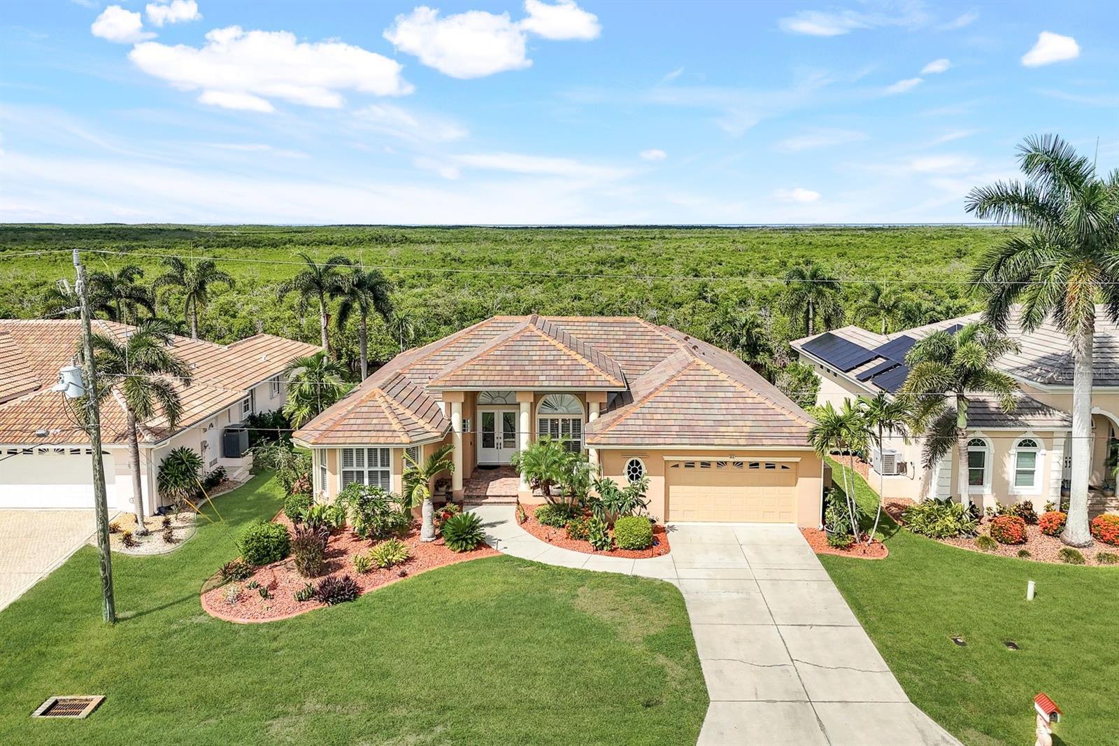Welcome to your dream waterfront home! Perfect for boating enthusiasts, this home, located in the desirable Gulf access community of Burnt Store Isles, is the perfect blend of luxury and comfort. Curb appeal abounds thanks to lovely landscaping and the impressive entryway, complete with brand new front doors. Step inside, and you'll be greeted by the spaciousness of vaulted ceilings and luxurious details throughout, including the beautiful woodwork, accented floor tile, tray ceilings, and custom plantation shutters for a touch of Southern charm. The kitchen is a chef's delight, boasting brand new stainless steel appliances, and elegant maple cabinetry with soft-close doors and drawers, a walk-in pantry, and reverse osmosis system. The recently remodeled master bathroom features backlit mirrors, custom tile work, and a jetted tub with aromatherapy-dispensing capabilities, for the ultimate spa-like experience! Large windows and sliding glass doors flood the space with natural light and provide stunning views of the canal and preserve. Step outside to the expansive lanai, perfect for outdoor dining, lounging, or simply soaking in the tranquility of your surroundings. The sparkling pool, with its Pebble Tec finish, waterfall feature, and a “beach” walk-in entry, is the highlight of this outdoor oasis, offering endless opportunities for fun and relaxation. You’ll bask in the serene views, thanks to the home’s desirable location on the “rim” canal, with the privacy of the mangroves behind you. The lot is ideally situated for boaters, complete with a brand new 10,000 lb capacity boat lift, on the sailboat direct-access canal (45 minutes to Boca Grande Pass). This home also includes a brand new roof, installed in 2024, ensuring peace of mind for years to come, and the homeowner’s and flood insurance for this property are incredibly low. Every detail of this home has been carefully considered to provide the ultimate in comfort and luxury. From the high-end finishes to the thoughtfully designed layout, this property offers an unparalleled living experience.