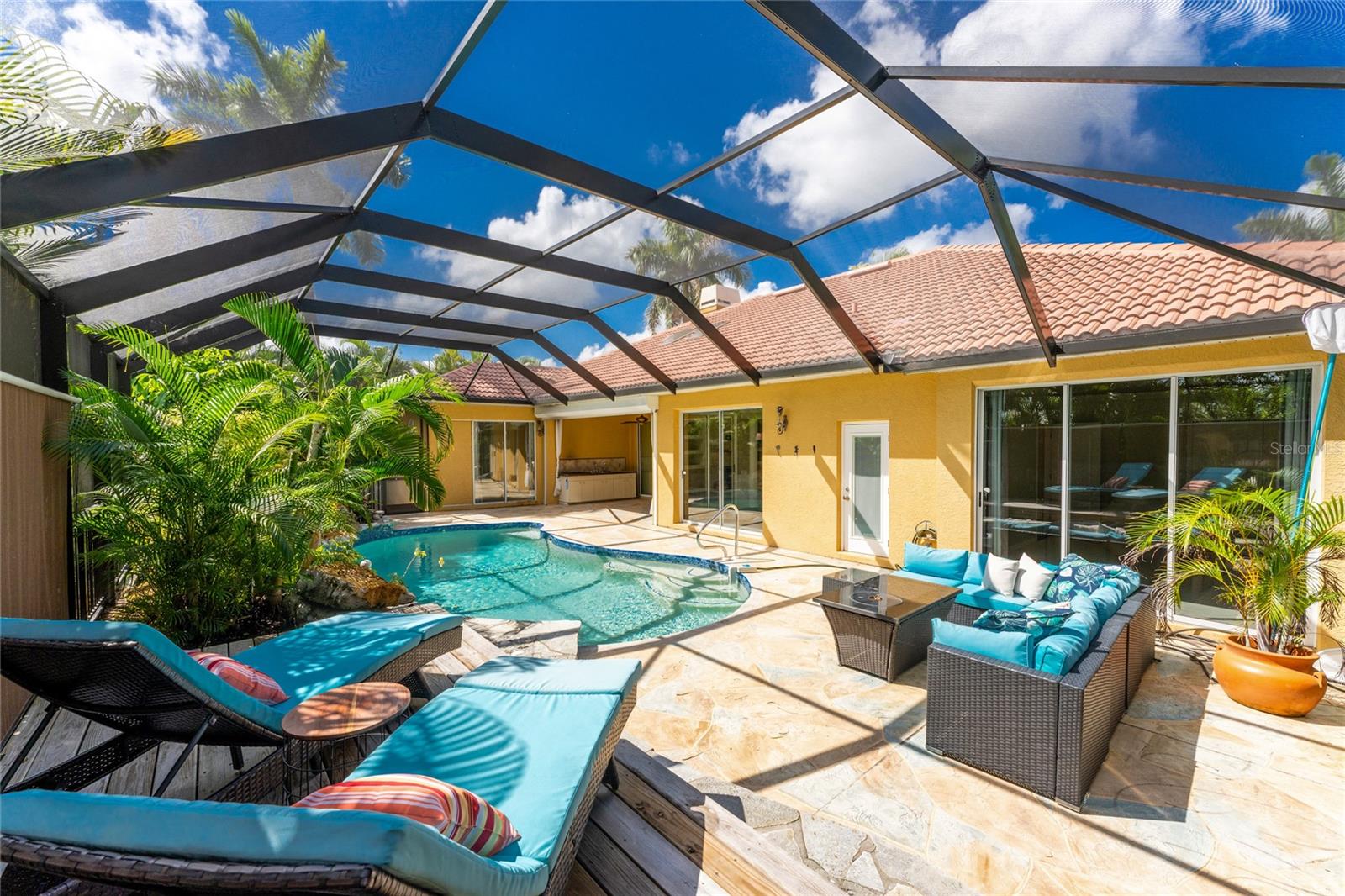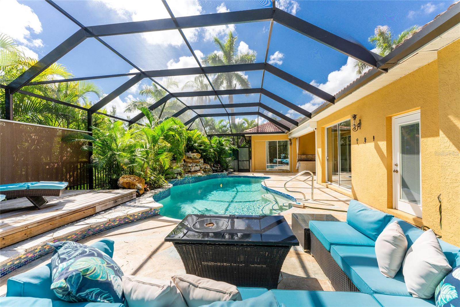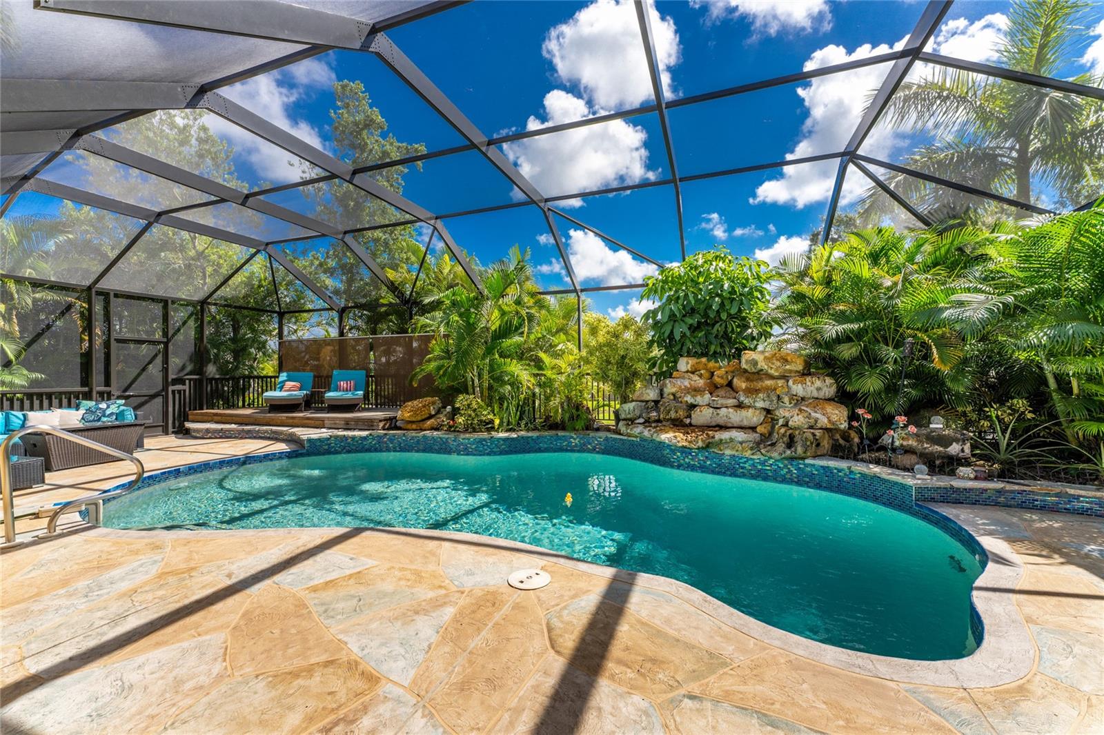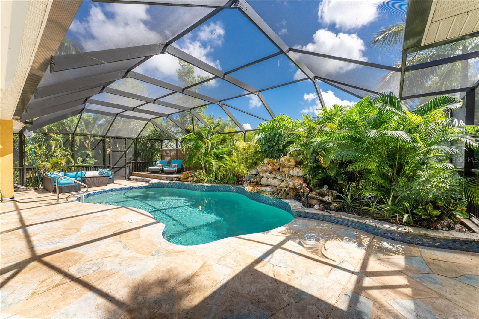 Priced to Sell! You cannot beat this location!! This former model home has 3 bedrooms and 2 bathrooms, located in Historic Downtown Punta Gorda. Tropical landscaping and custom exterior lighting create a lovely tropical feel. Step inside through double glass front doors to discover a spacious, open floor plan perfect for both relaxing and entertaining. The great room has a full wall of sliders providing a view of the rock waterfall, pool, and mature tropical landscaping. A working stone fireplace is a nice addition for the rare cool evening. The well-appointed kitchen features contemporary finishes and a breakfast bar area perfect for entertainment. Need a home office? A large office is just off the great room with custom built-in shelves. It can also serve as a hobby area or as an extra bedroom. Enjoy the serene ambiance of the master suite, complete with a luxurious ensuite bathroom, double walk-in closets and large walk-in shower. The additional two bedrooms are spacious and share a hall bathroom with lanai access. The screened-in lanai feels like a private island oasis! Multiple seating areas, both shaded and sunny, provide plenty of space to entertain. Just imagine beginning your day on the lanai listening to your very own waterfall! Just off the lanai is a fenced area for your pets. One of this home’s greatest features is its prime location. Enjoy easy walking or biking to Fishermen’s Village, Gilchrist Park, the Saturday Farmer’s Market, History Park, downtown restaurants and boutiques, or the 18 miles of bike and walking paths – all within a mile. Daily shopping needs such as groceries, pharmacies or big box stores are 10 minutes or less away. Punta Gorda Airport is also within 10 minutes, allowing easy travel. This home checks all the boxes for Punta Gorda coastal life. No water in the home from hurricanes.