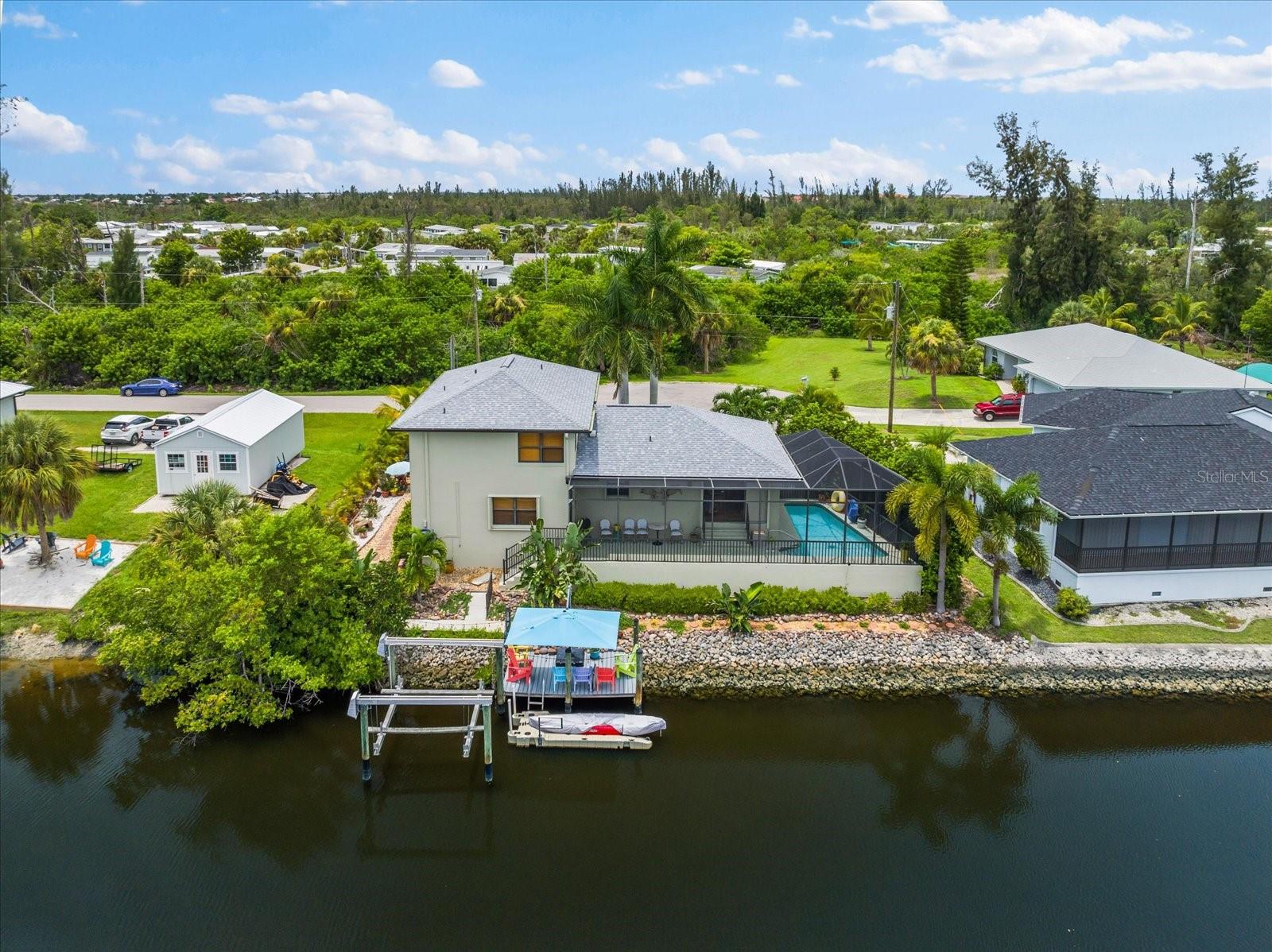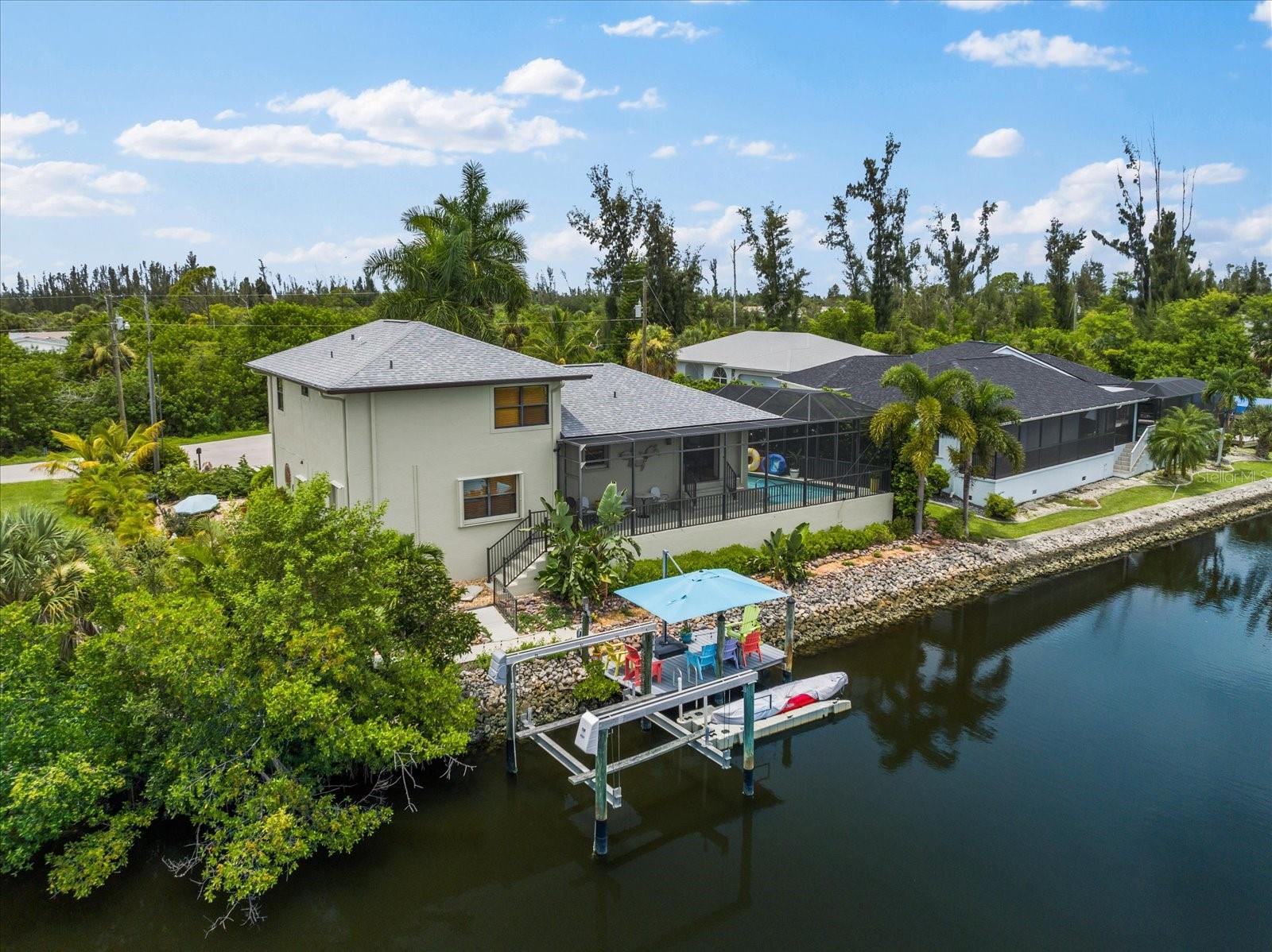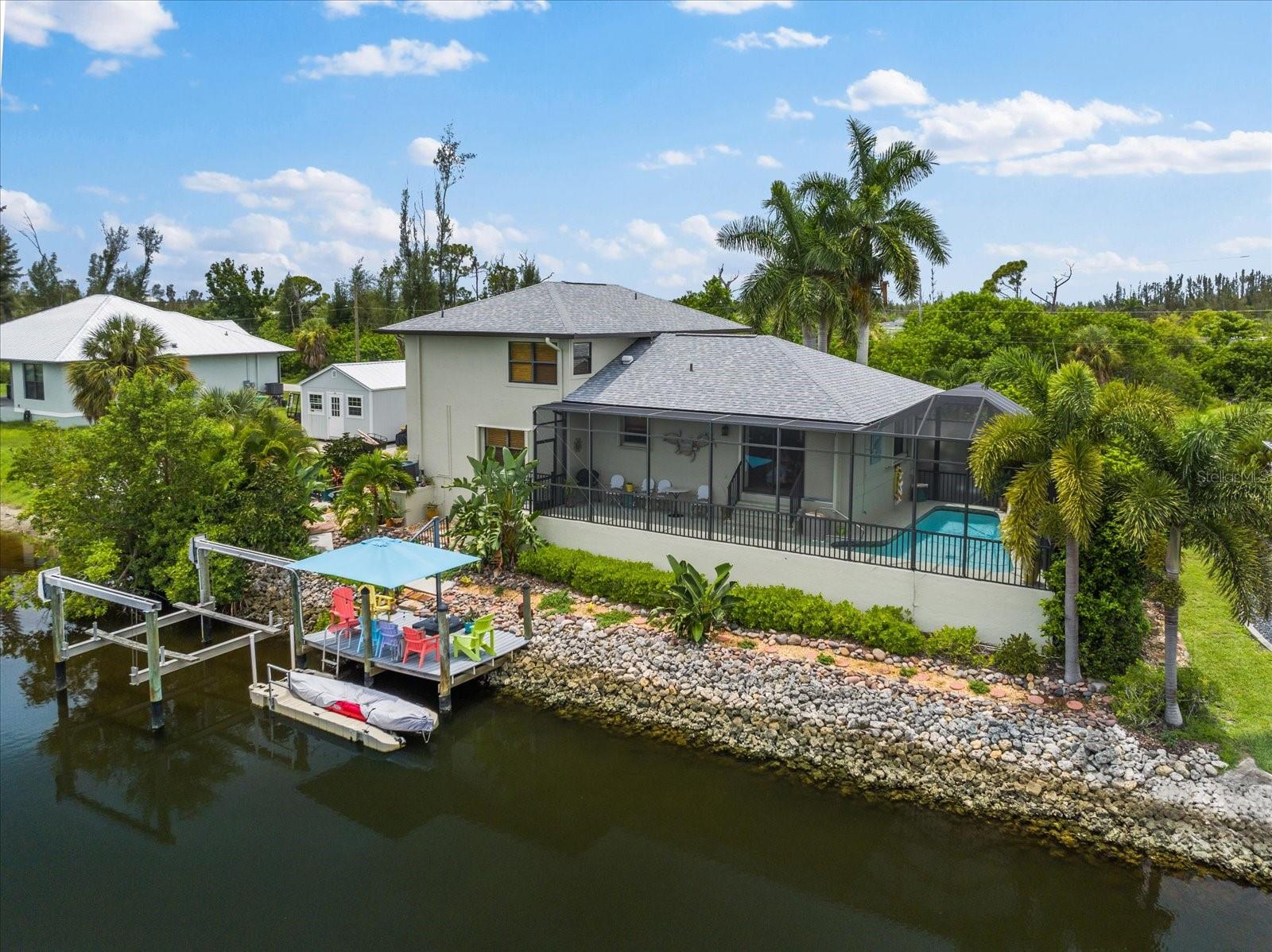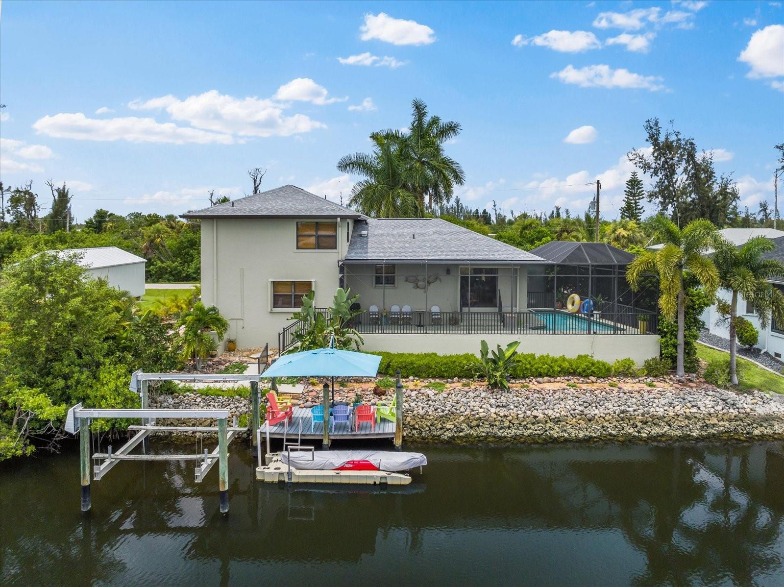 NO HURRICANE DAMAGE AND NO FLOODING!! Experience the joy of coastal living in this incredible two-story pool home with direct GULF ACCESS, nestled in the serene community of Punta Gorda. This property features 3 spacious bedrooms, 2.5 bathrooms, and 1,768 square feet of beautifully appointed living space. As you approach, you’ll be greeted by meticulously maintained landscaping that surrounds the home, enhancing its charm and curb appeal. The exterior boasts a fresh coat of paint applied this year, giving it a modern and vibrant look. Step inside to find a spacious living room adorned with a beautiful electric holographic fireplace, perfect for cozy evenings. The open-concept design seamlessly connects the living area to the kitchen, which is equipped with top-of-the-line stainless steel appliances, including a double range oven and a wine refrigerator. The kitchen and living room windows provide stunning water views, creating a serene backdrop for your daily activities. From the main floor, a short flight of steps leads down to the dining room and the attached garage. Adjacent to the dining area, you'll find a convenient powder bathroom, ideal for guests. All three bedrooms are located on the second floor, each featuring generous walk-in closets. The upper floor is fitted with hurricane impact glass, ensuring safety and peace of mind. The home boasts numerous recent upgrades, including a NEW ROOF installed in 2023, repiped plumbing in 2022, and a water heater installed in 2021. The first level features accordion shutters for added storm protection. The cocktail pool is perfect for those looking to soak up the sun and unwind in their private retreat. A large propane tank on the south side of the house is available to help generate power when needed. The property also includes a well pump and water conditioning system, both installed within the last few years. Enjoy the convenience of an 8,000-pound boat lift and a beautiful dock, surrounded by lush landscaping. The waterfront location provides easy and quick access to the Gulf. Situated at the end of a quiet cul-de-sac, this home offers unparalleled peace and privacy with NO HOA and NO DEED RESTRICTIONS. Despite its tranquil setting, it’s just minutes away from downtown Punta Gorda, Fisherman’s Village, and Gilchrist Park. Don’t miss your chance to own this exceptional waterfront property. Schedule your showing today before it's too late!