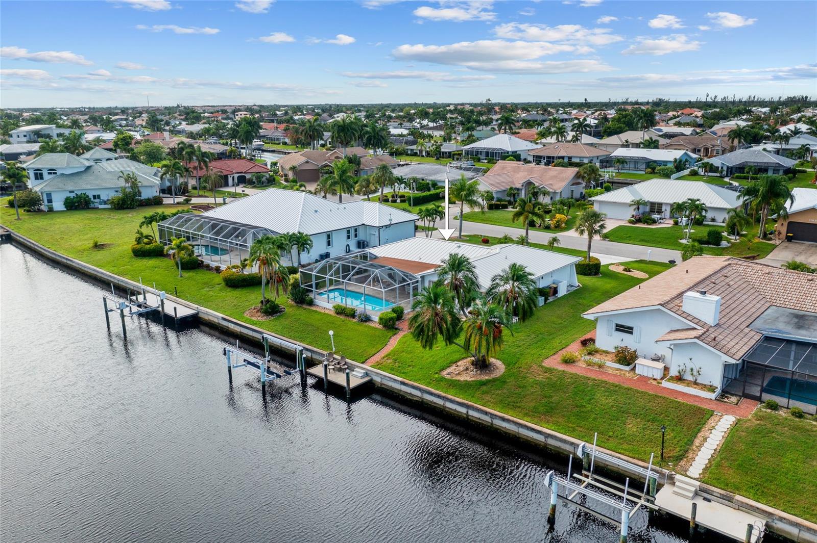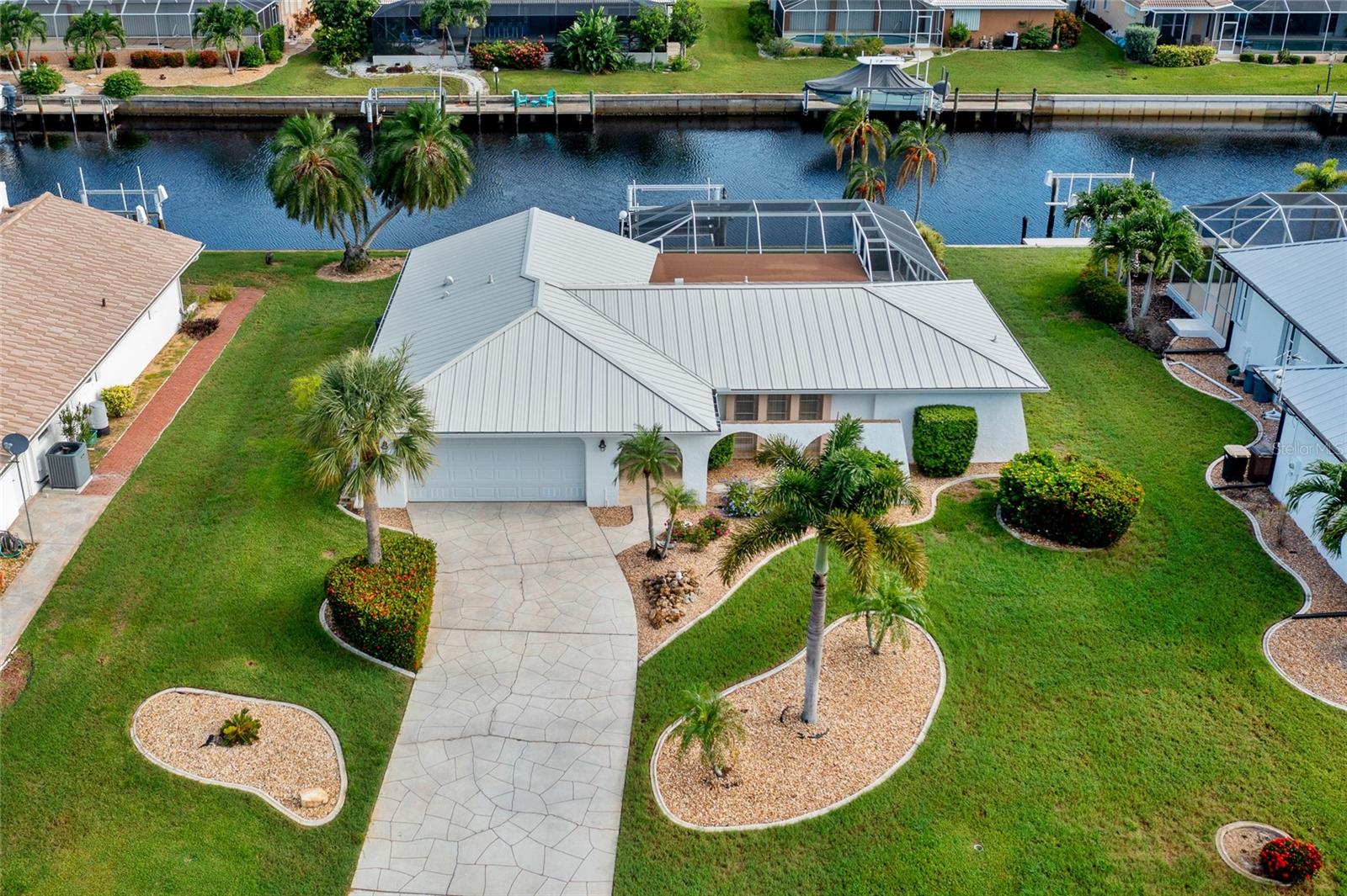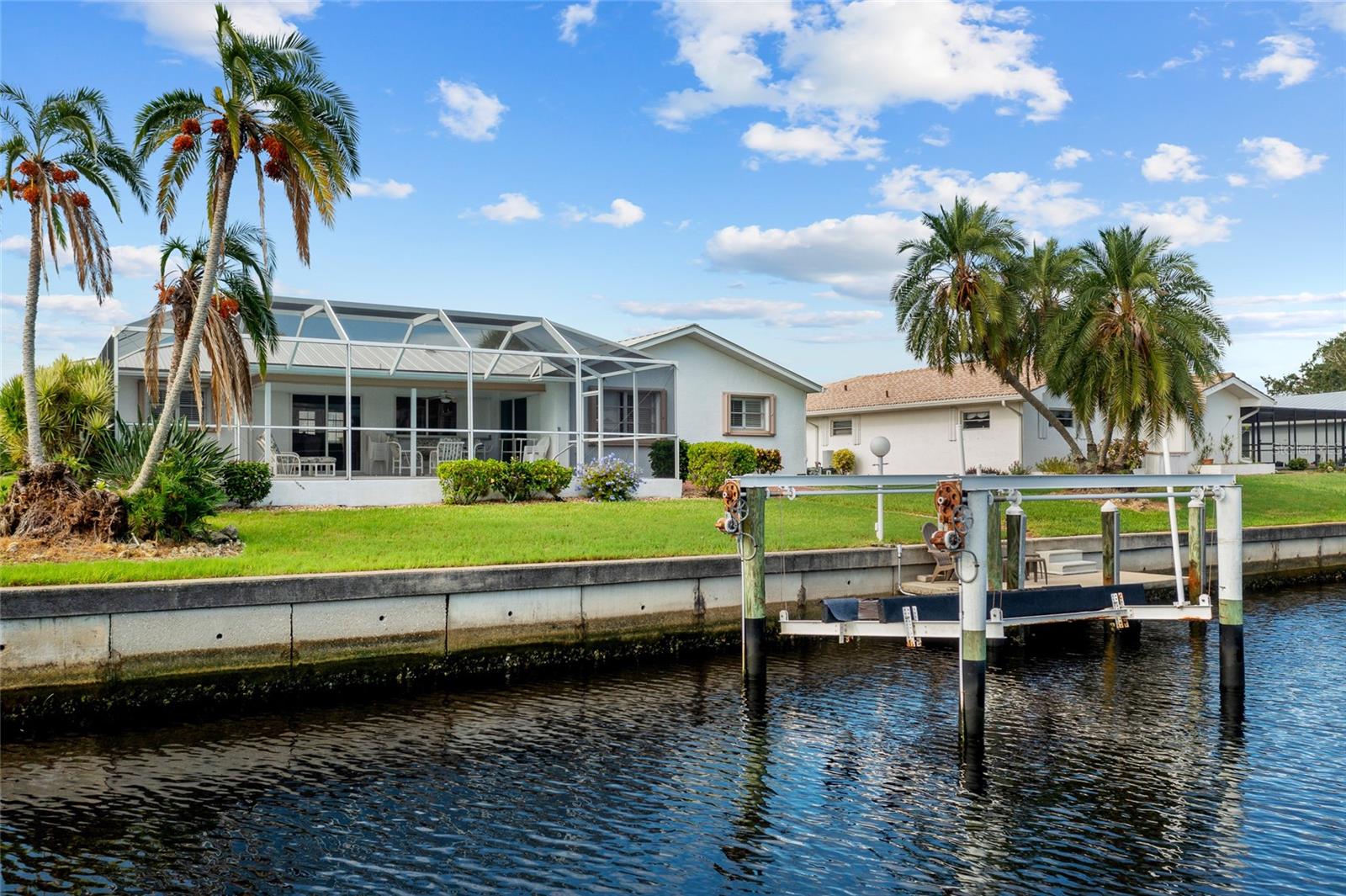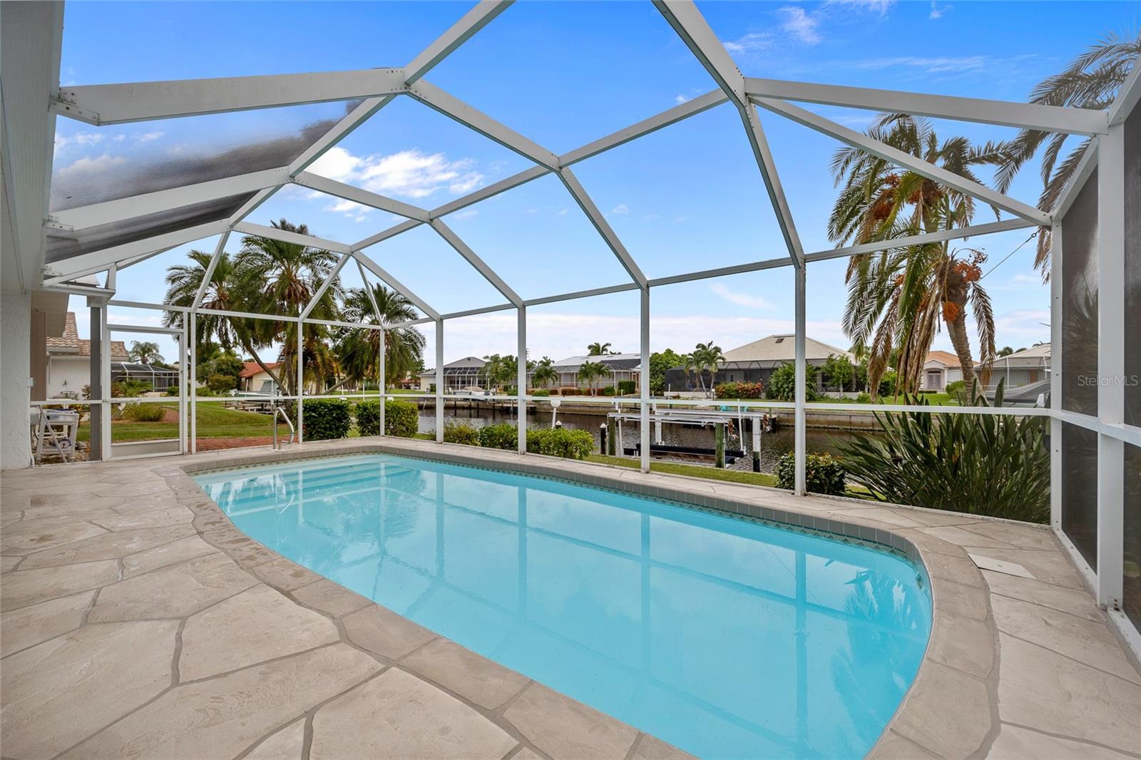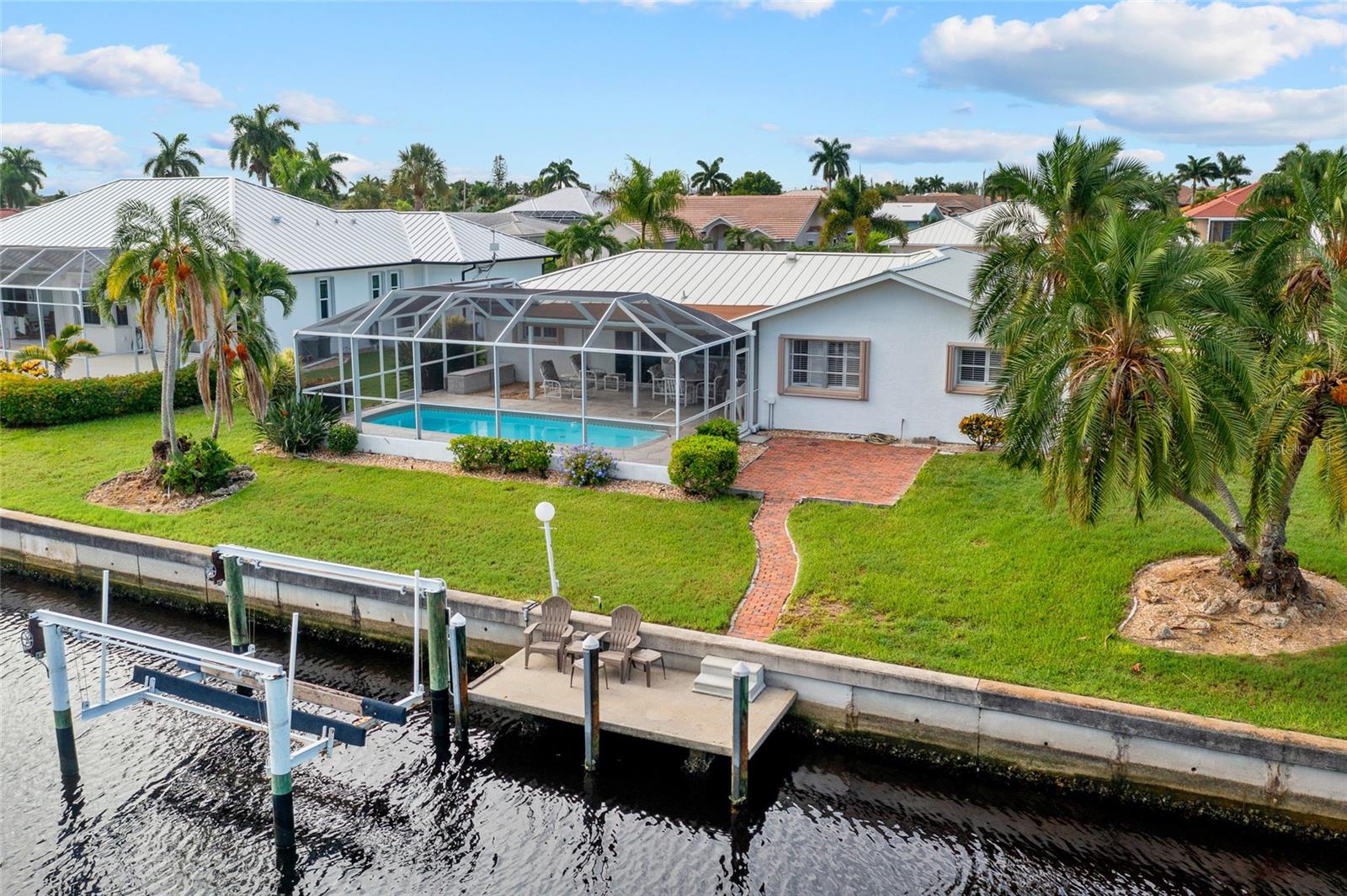PRIME WATERFRONT LOCATION IN PUNTA GORDA ISLES! ATTRACTIVE 2 BEDROOM, 2 BATH, 2-CAR GARAGE POOL HOME WITH 10-MINUTE POWERBOAT ACCESS TO CHARLOTTE HARBOR LEADING TO THE GULF OF MEXICO! Boaters dream offering 83 feet of waterfrontage, concrete dock with water and electric, boat lift and beautiful water views. This home offers living/dining combo, plantation shutters, abundance of natural light, pocket sliding doors to lanai and tile flooring throughout. The kitchen offers newer Hickory cabinets, granite counter tops, cooktop, built-in microwave and oven, large pass-through window to the lanai plus a second dining area with slider to lanai and pool. The split floor plan offers a primary bedroom featuring a walk-in closet and a private bath with a walk-in shower and the second bedroom along with guest bath is on the opposite side of the home which offers privacy when your friends and family come visit! Step outside to the lanai, which offers a heated pool, water views, as well as a separate paver area on the outside of the screened lanai for additional seating area which leads to the concrete dock. Additional features include NEW METAL ROOF 2023, mature landscape around the entire home, hurricane shutters, limited traffic on street and underground utilities. In the heart of Punta Gorda and close to downtown Historic District with shopping, restaurants, entertainment and more! Close to numerous golf courses, beautiful parks, schools, Fisherman's Village and The Yacht Club. Don’t miss this opportunity to make this your new Florida retreat or permanent home. Schedule your private showing today!