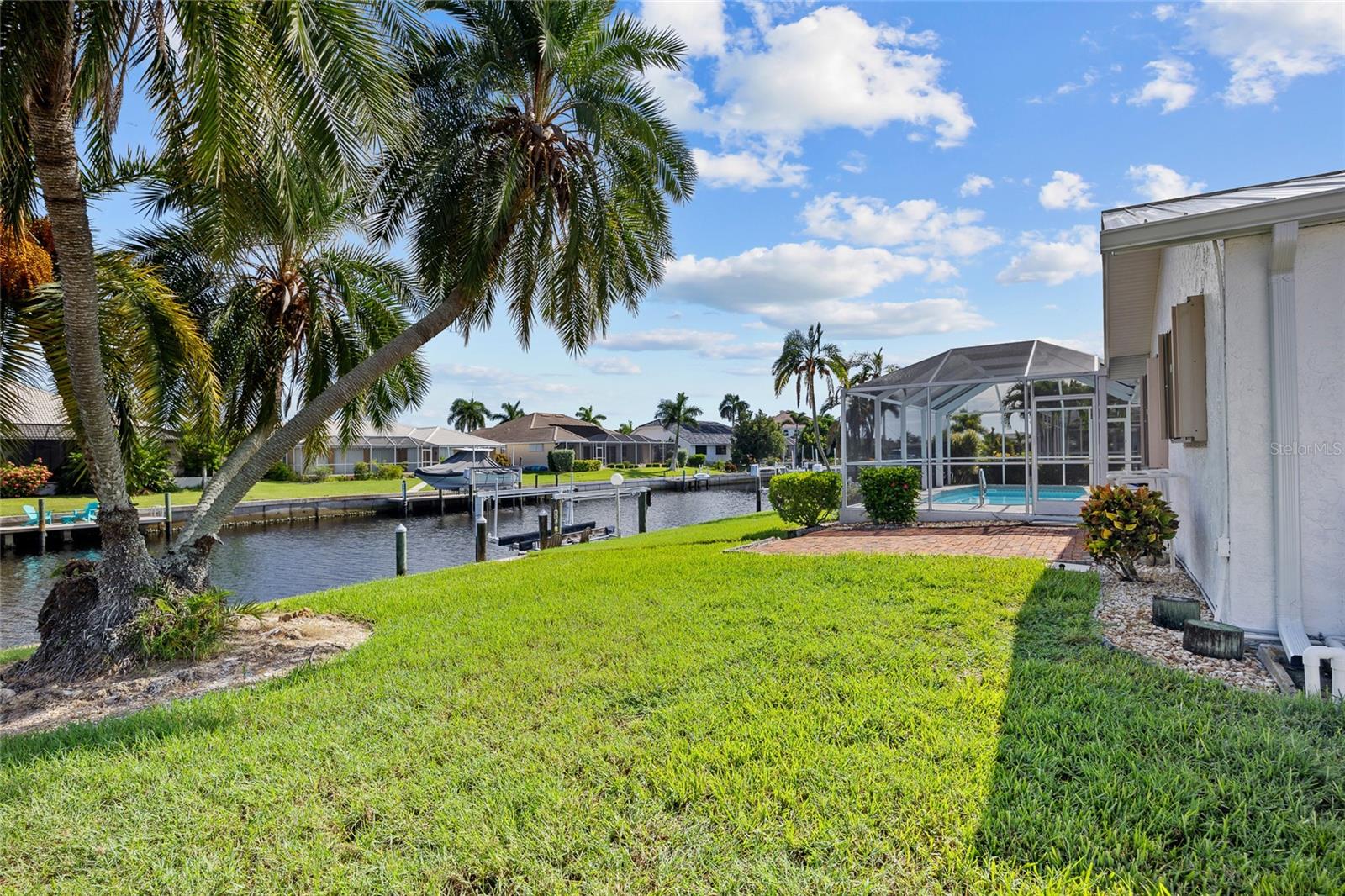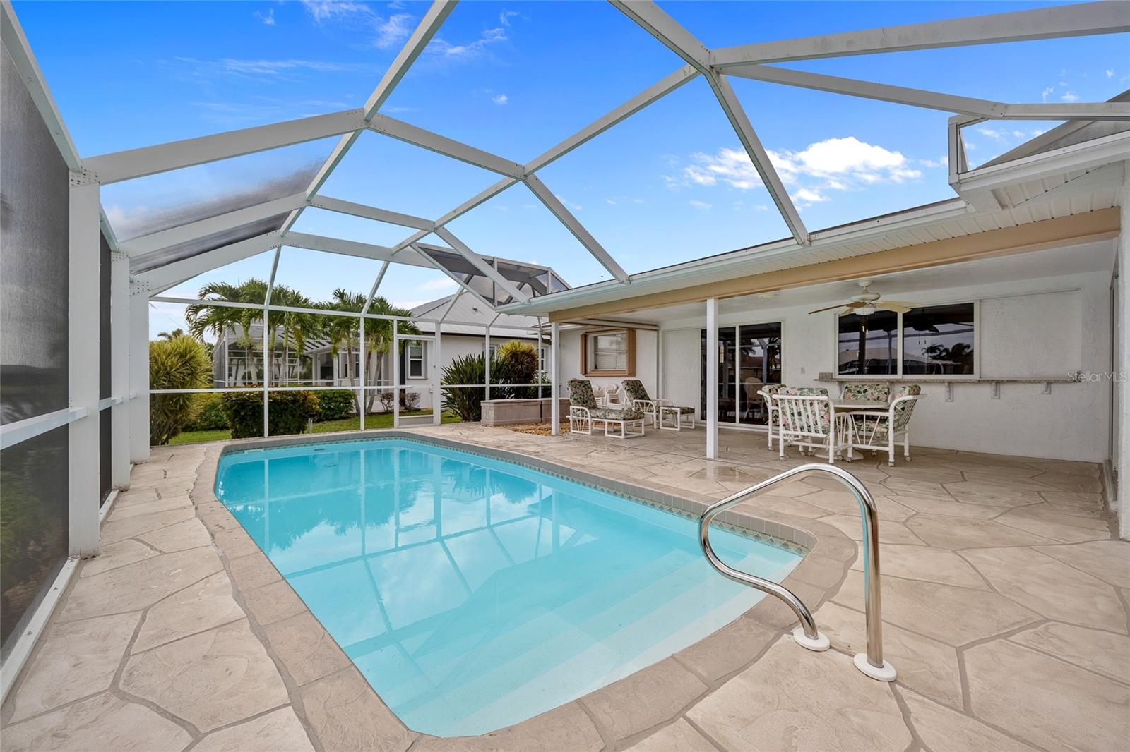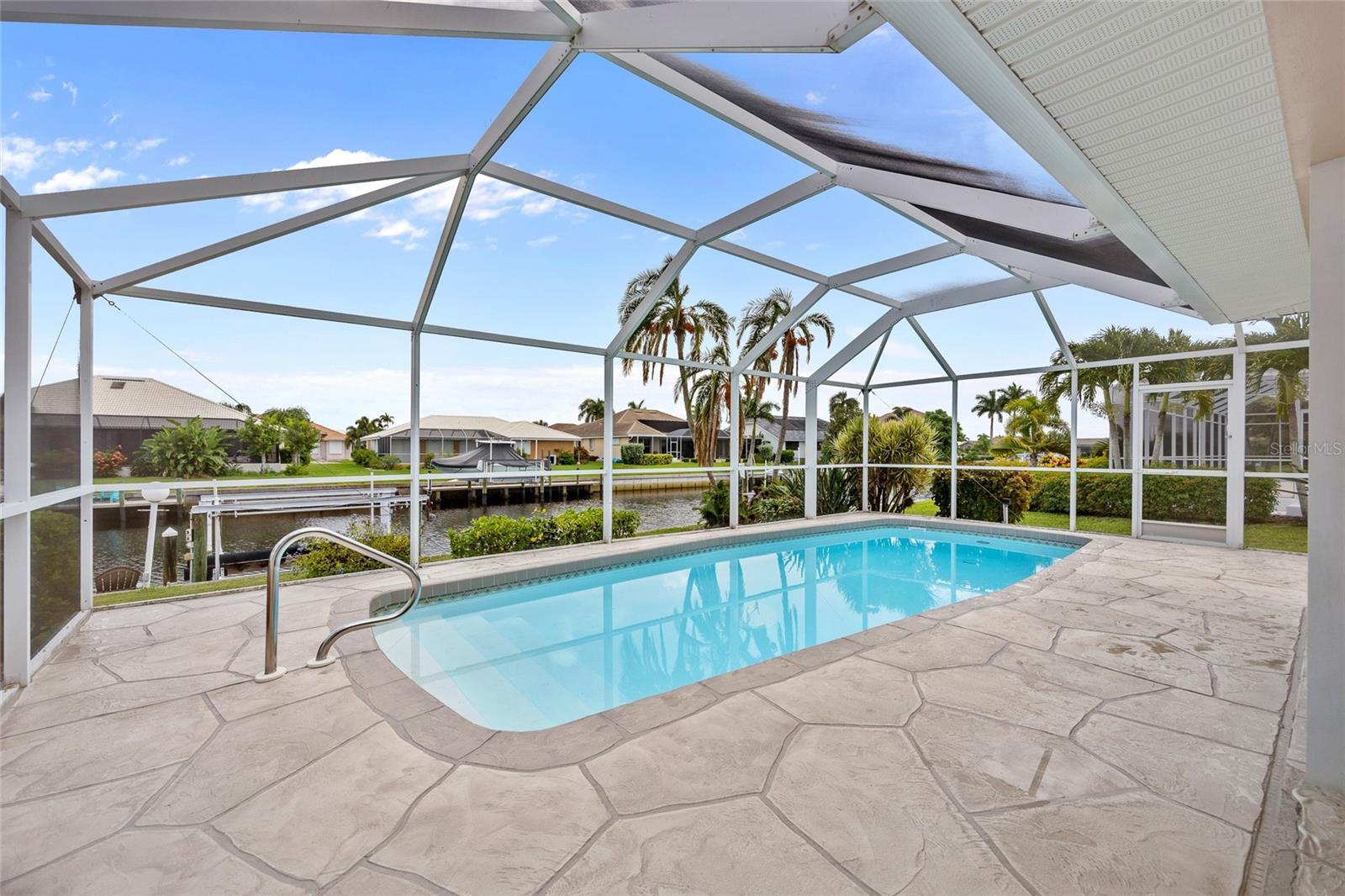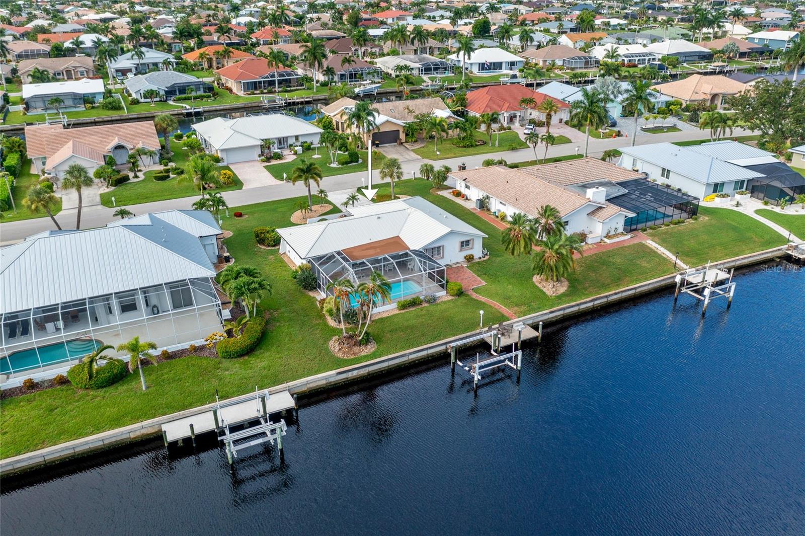 PRIME WATERFRONT LOCATION IN PUNTA GORDA ISLES! ATTRACTIVE 2 BEDROOM, 2 BATH, 2-CAR GARAGE POOL HOME WITH 10-MINUTE POWERBOAT ACCESS TO CHARLOTTE HARBOR LEADING TO THE GULF OF MEXICO! Boaters dream offering 83 feet of waterfrontage, concrete dock with water and electric, boat lift and beautiful water views. This home offers living/dining combo, plantation shutters, abundance of natural light, pocket sliding doors to lanai and tile flooring throughout. The kitchen offers newer Hickory cabinets, granite counter tops, cooktop, built-in microwave and oven, large pass-through window to the lanai plus a second dining area with slider to lanai and pool. The split floor plan offers a primary bedroom featuring a walk-in closet and a private bath with a walk-in shower and the second bedroom along with guest bath is on the opposite side of the home which offers privacy when your friends and family come visit! Step outside to the lanai, which offers a heated pool, water views, as well as a separate paver area on the outside of the screened lanai for additional seating area which leads to the concrete dock. Additional features include NEW METAL ROOF 2023, mature landscape around the entire home, hurricane shutters, limited traffic on street and underground utilities. In the heart of Punta Gorda and close to downtown Historic District with shopping, restaurants, entertainment and more! Close to numerous golf courses, beautiful parks, schools, Fisherman's Village and The Yacht Club. Don’t miss this opportunity to make this your new Florida retreat or permanent home. Schedule your private showing today!