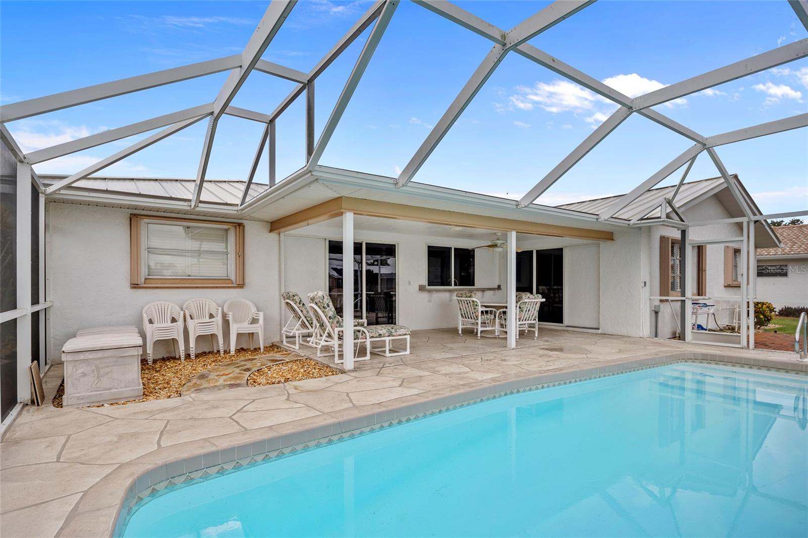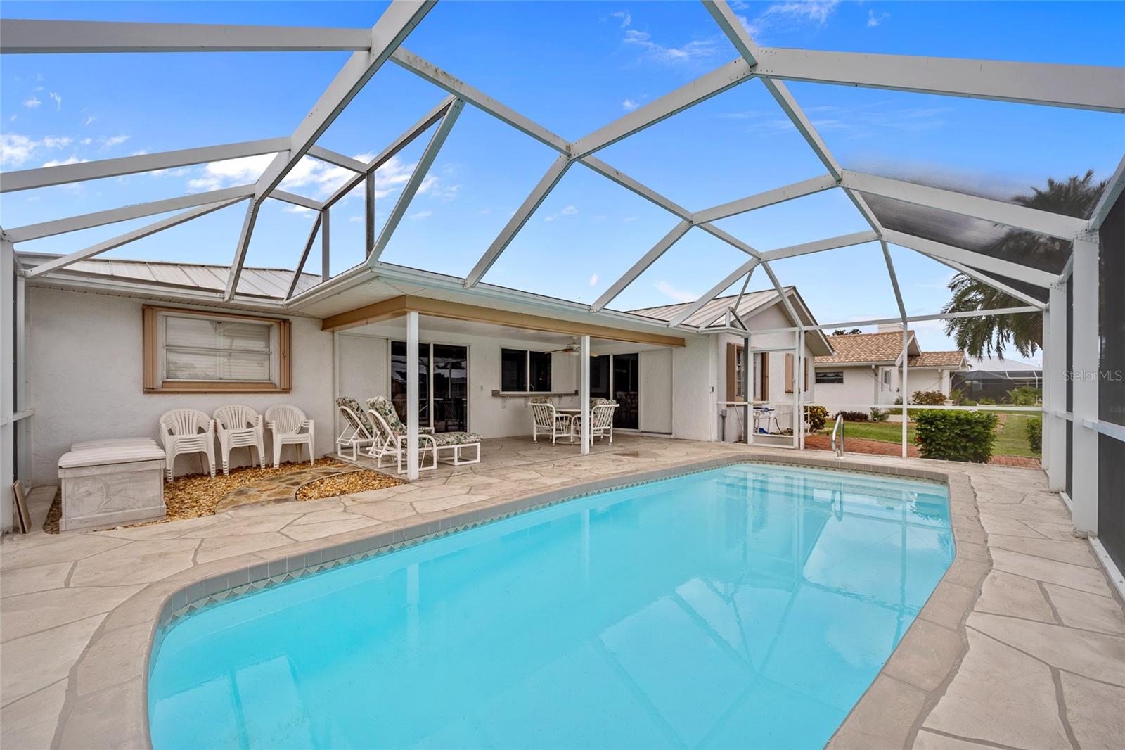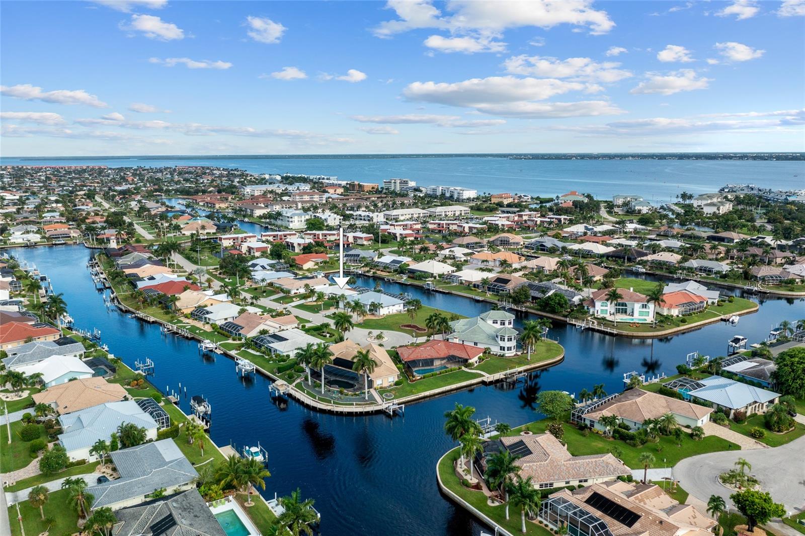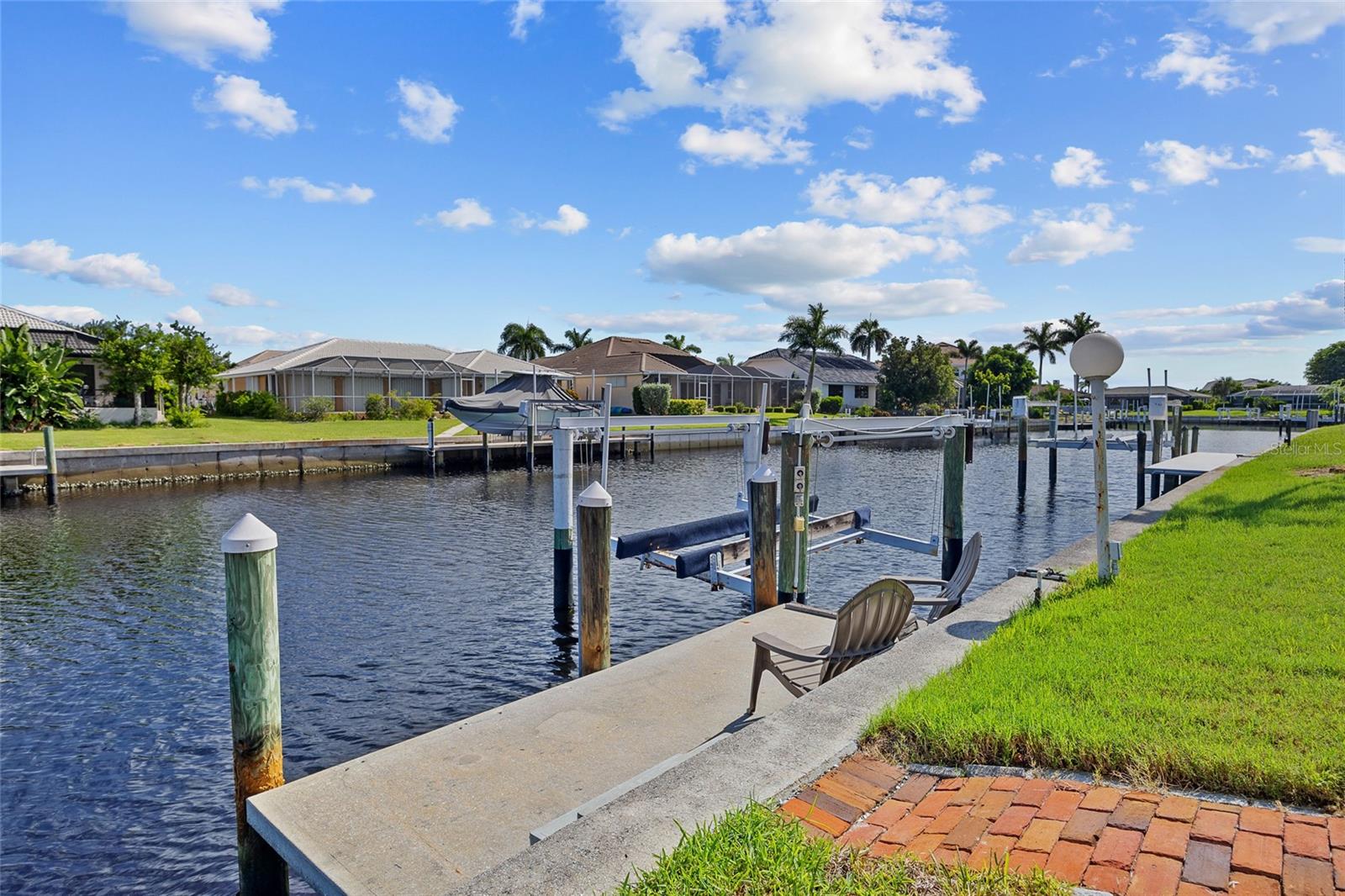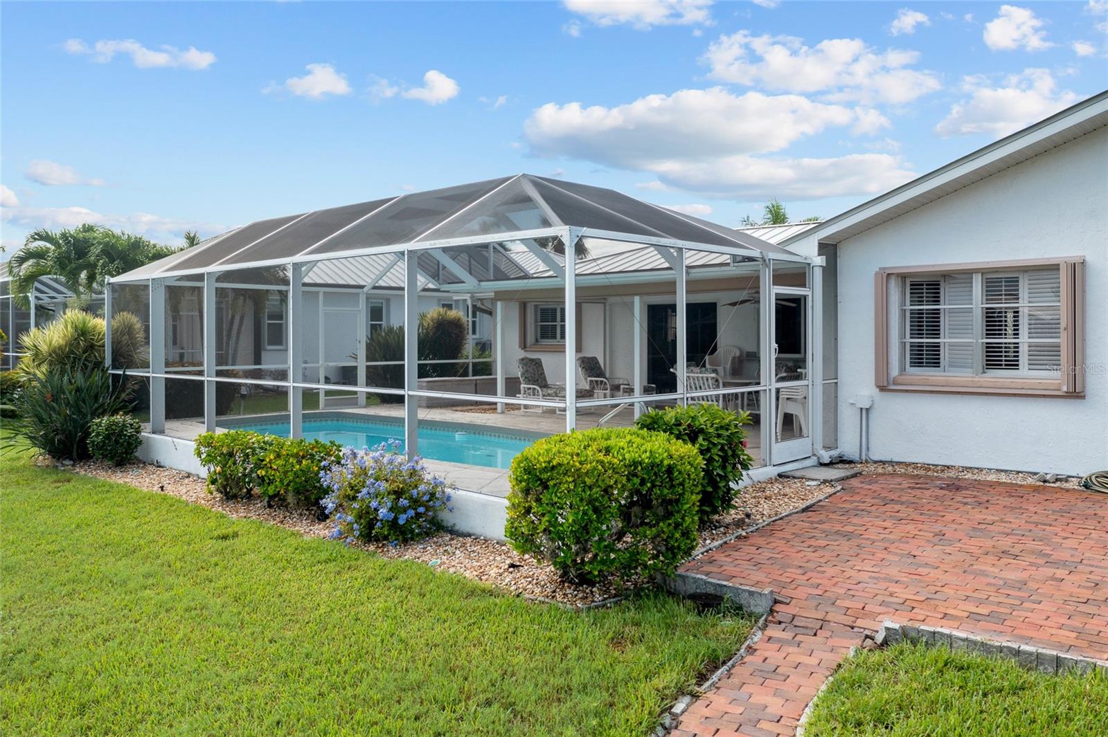 PRIME WATERFRONT LOCATION IN PUNTA GORDA ISLES! ATTRACTIVE 2 BEDROOM, 2 BATH, 2-CAR GARAGE POOL HOME WITH 10-MINUTE POWERBOAT ACCESS TO CHARLOTTE HARBOR LEADING TO THE GULF OF MEXICO! Boaters dream offering 83 feet of waterfrontage, concrete dock with water and electric, boat lift and beautiful water views. This home offers living/dining combo, plantation shutters, abundance of natural light, pocket sliding doors to lanai and tile flooring throughout. The kitchen offers newer Hickory cabinets, granite counter tops, cooktop, built-in microwave and oven, large pass-through window to the lanai plus a second dining area with slider to lanai and pool. The split floor plan offers a primary bedroom featuring a walk-in closet and a private bath with a walk-in shower and the second bedroom along with guest bath is on the opposite side of the home which offers privacy when your friends and family come visit! Step outside to the lanai, which offers a heated pool, water views, as well as a separate paver area on the outside of the screened lanai for additional seating area which leads to the concrete dock. Additional features include NEW METAL ROOF 2023, mature landscape around the entire home, hurricane shutters, limited traffic on street and underground utilities. In the heart of Punta Gorda and close to downtown Historic District with shopping, restaurants, entertainment and more! Close to numerous golf courses, beautiful parks, schools, Fisherman's Village and The Yacht Club. Don’t miss this opportunity to make this your new Florida retreat or permanent home. Schedule your private showing today!