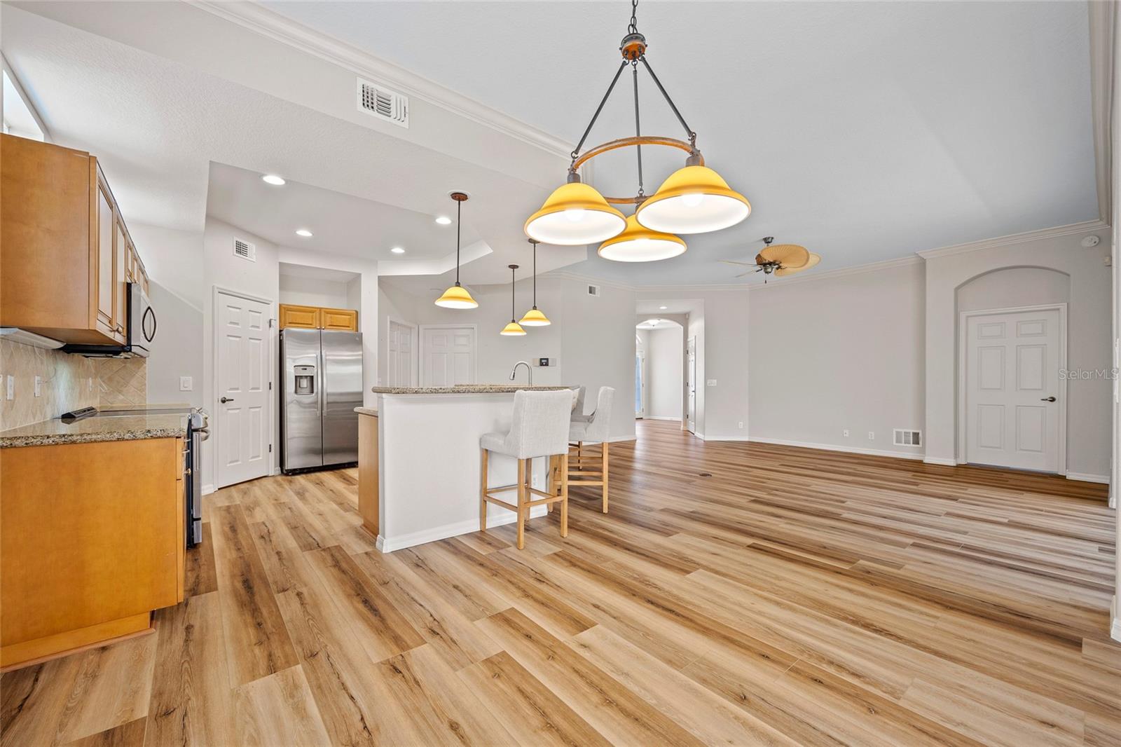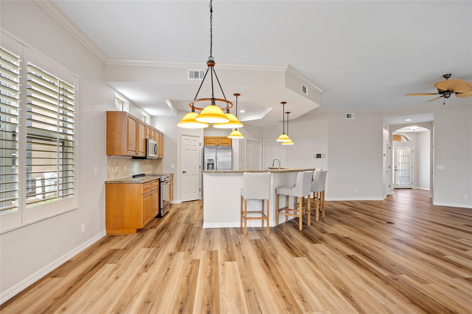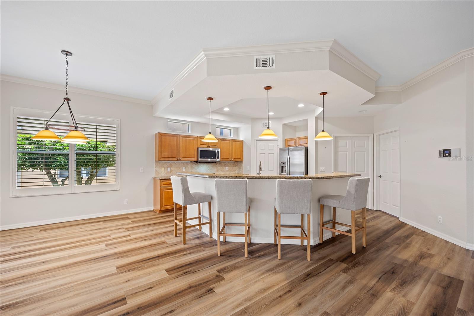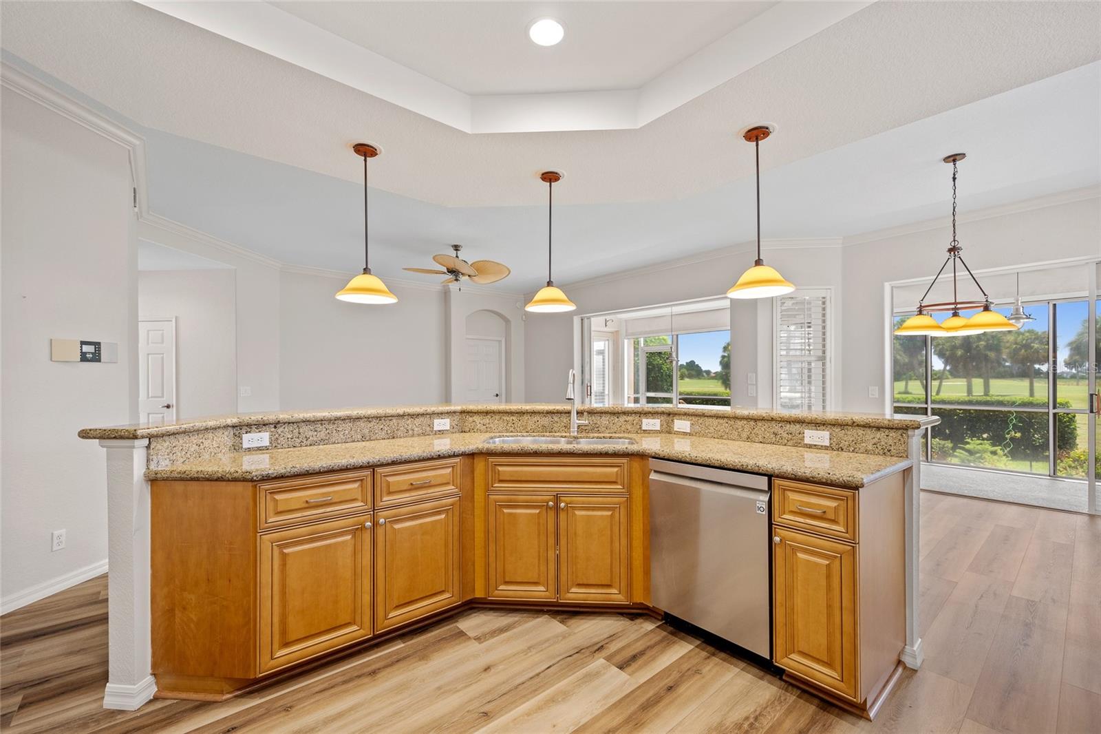 Welcome to this beautiful luxury first floor condo in the desirable boating and golf community of Burnt Store Isles offering serene lake and golf course views of the 8th hole at Twin Isles Golf Club! This impeccable home offers a spacious and open floor plan with 3 bedrooms, 2 baths and 1,883 square feet of living space. As you step inside, you'll immediately notice the attention to detail with crown molding, neutral décor, plantation shutters, plenty of windows for an abundance of natural light plus luxury vinyl flooring throughout. The living and dining areas feature sliders that lead out to a large, covered lanai, allowing for seamless indoor-outdoor living. The kitchen is a chef's dream, complete with granite countertops, tile backsplash, stainless appliances, a breakfast bar, closet pantry, and plenty of counter space for meal preparation. The primary suite offers golf course views, access to lanai, large walk-in closet and private bath with dual sinks and a walk-in shower. The guest bedrooms are generously sized and share a separate full bath, perfect for accommodating family or guests. The lanai boasts southwestern exposure to enjoy amazing SWFL sunsets. Additional features include inside laundry with cabinetry, 2-car attached garage with extra storage space plus electric hurricane roll down on lanai and accordion shutter on front door. Outside, you'll find lush tropical landscaping that adds to the overall beauty of the property. This home is in a quiet, deed-restricted golf course community that offers plenty of privacy. Optional memberships are available just steps away at the Twin Isles Country Club. Here, you can take advantage of an 18-hole championship golf course, a swimming pool, a tennis complex, and a spacious clubhouse that hosts dining and social events. Great location close to I-75 and just a short drive to nearby restaurants, shopping, The Yacht Club, Fishermen's Village, and historic downtown Punta Gorda. This home is truly one of a kind and is ready for you to move in today. Don't miss out on this incredible opportunity to live in luxury and enjoy the best that Burnt Store Isles has to offer. Schedule your private showing today!