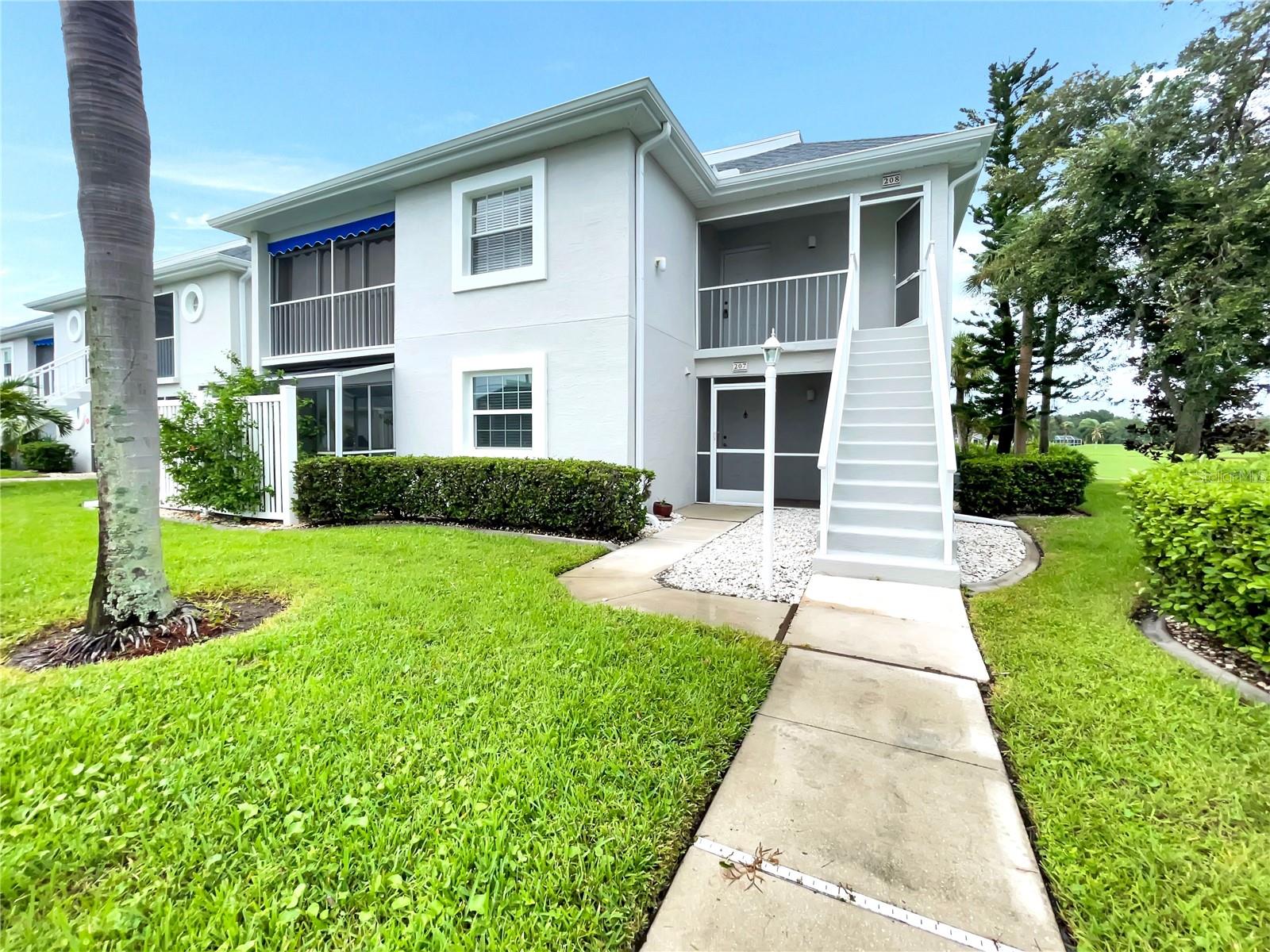 Welcome to this charming first-floor 3-bed, 2-bath condo with a deeded garage. You'll enjoy a spacious screened lanai with hurricane roll-down shutters, offering prime views of the ninth hole on Deep Creek Golf Course. The primary bedroom features two closets, including a walk-in, and opens directly to the lanai. The second bedroom also opens to the lanai, while the third bedroom offers a private screened-in lanai/garden area. The unit features impact windows throughout. The kitchen has granite countertops and plenty of storage. Additionally, A bonus patio off the main lanai offers even more outdoor living space for your enjoyment. The Fairway Pines community has recently been upgraded with new roofs, fresh paint, new awnings, and a resurfaced pool. HOA fees are $1,200 quarterly, including TV cable, water, and sewer. Community amenities include a heated private pool, community grill, and a shared garage with tools and ladders.
