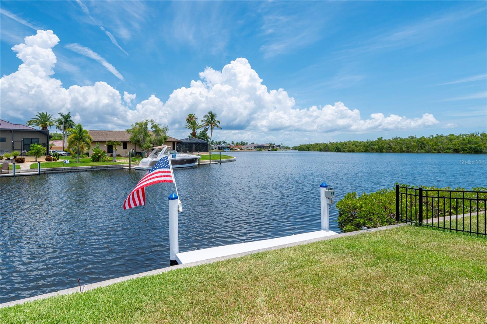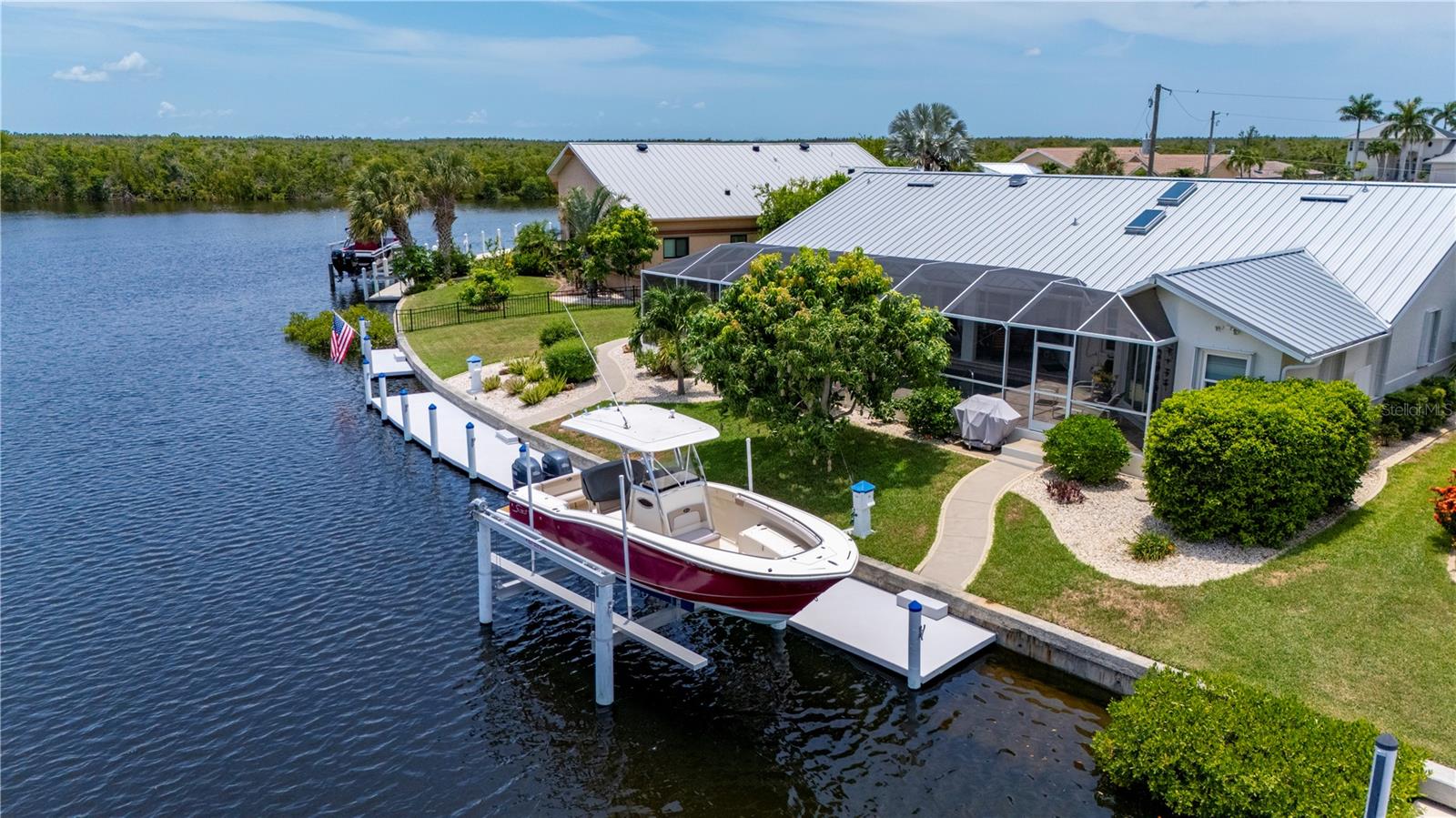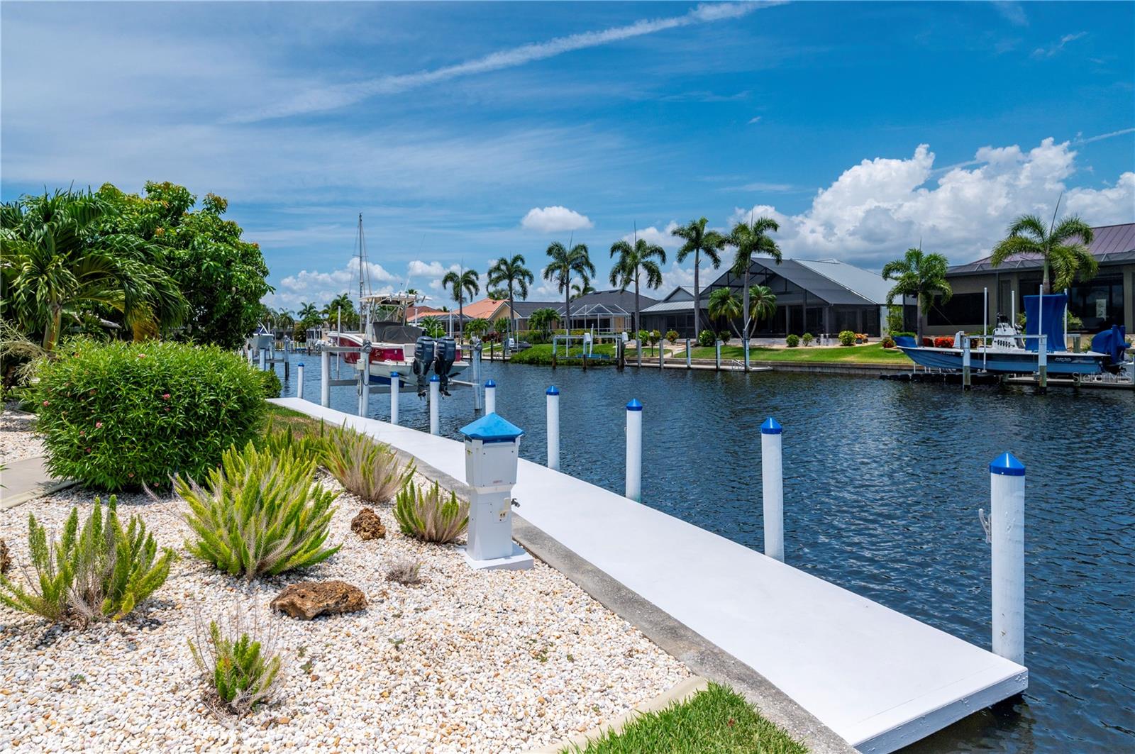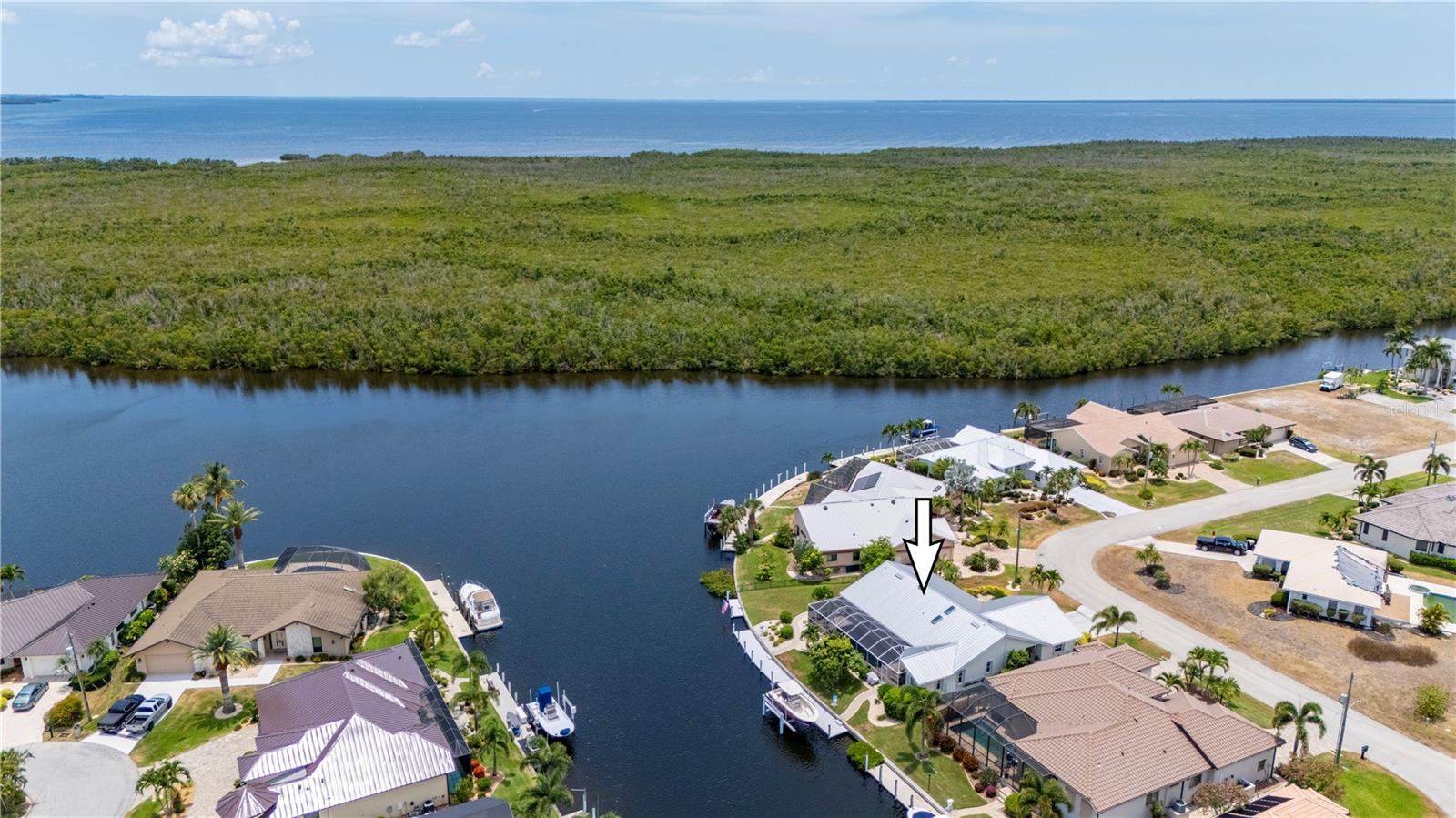 WIDE WATER VIEW! Please enjoy the aerial views and dolphin sighting in the YouTube video. Located on the quiet south end of Bal Harbor in the highly sought after PGI Sec 12. NO HOA. Public Water & Sewer. 8 MIN RIDE TO open water through Buckley's Pass, or a leisurely 20 min ride along the perimeter canal and out Ponce exit. 12'x31' in-ground saltwater swimming pool with screened cage. One-of-a-kind custom floorplan offers TWO Master Suites, Split plan bedrooms for privacy, THREE FULL BATHROOMS. Bath 1 and Bath 2 are en suite; Bath 3 is adjacent to third bedroom. Kitchen has 10' long cooktop island with downdraft exhaust, wood cabinet doors, engineered quartz countertops. Two Skylights in Kitchen. Wet bar in living room has combo mini fridge/wine cooler. The bump-out area of the garage has a 14' x 7' air conditioned workshop space with 2 PGT Impact windows. Galvalume Standing Seam 20 gauge aluminum roof ('23). PGT Impact & Low E windows and IMPACT sliders ('20). Full hurricane protection. No water damage from Helene or Milton! The 118 feet of seawall is maintained by City of Punta Gorda. TWO Concrete Docks; 78' long and 15' long ('20) with 2 power & water pedestals at seawall ('19). 12,000 pound Golden Boat Lift ('20). Dredged along entire seawall area. TWO paved walkways to docks. Underwater Fish Light ('24). Large side yard perfect for pets. In addition to the ever changing view of passing boats, we've seen dolphin, tarpon, rays, manatees, ducks, herons, osprey, pelicans and jumping fish all in the backyard. Oversized lot with grassy area perfect for your pet. Five year old Valencia Pride MANGO tree produces large and super sweet fruit every year. The annual Last Saturday Before Christmas Lighted Boat Parade goes right past the house as it circles through the Sunset Lake basin. In addition to boating, there's always something fun to do in PGI! Owners can join the Civic Association and it's sub-groups & clubs - for everything from fishing to card games, boating excursions to tennis. Look at pgica.org for more info. You'll also enjoy shows at the Charlotte Harbor Event Center, award winning restaurants, Fisherman's Village, shopping, several parks, weekend farmer markets, pickleball courts, tennis courts, over 20 golf courses in the area, PGD Airport, new library at History Park, bicycle and walking trails, picnic areas, kayaking, fishing and much more. Note that listing agent is owner. It is all about the daily views here, there's even a view of Sunset Lake Turning Basin from the picture window at kitchen sink! Call today to make it yours and start to Live the Gulf Life!!