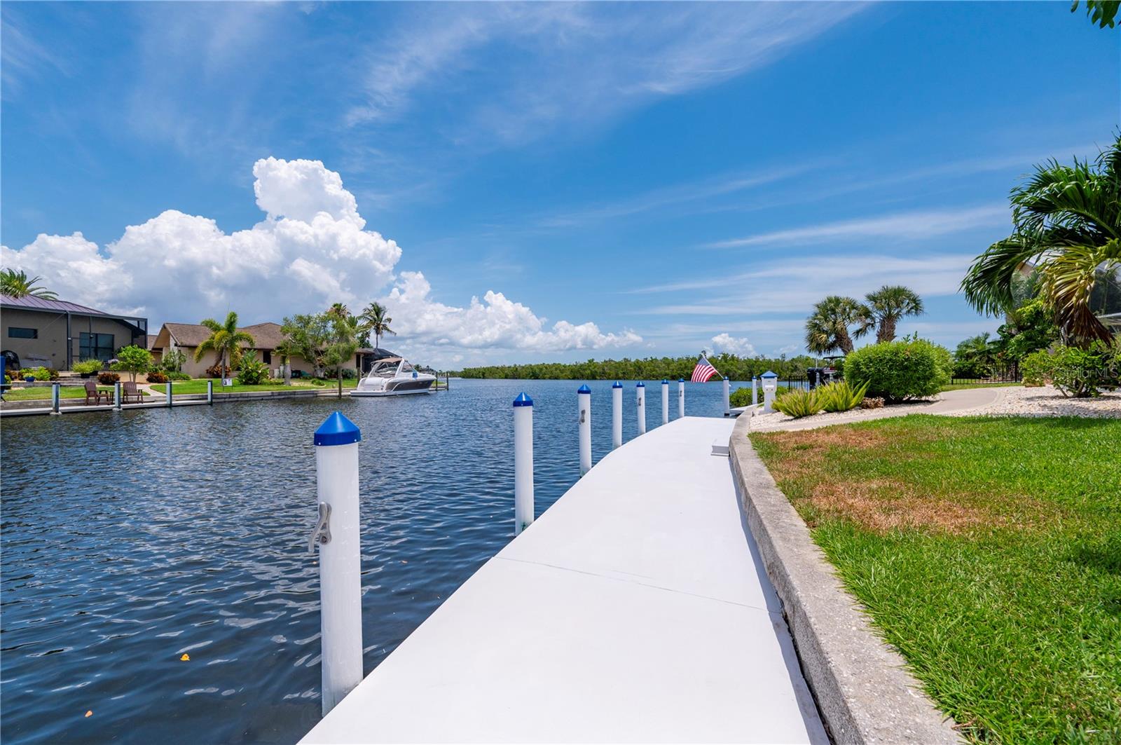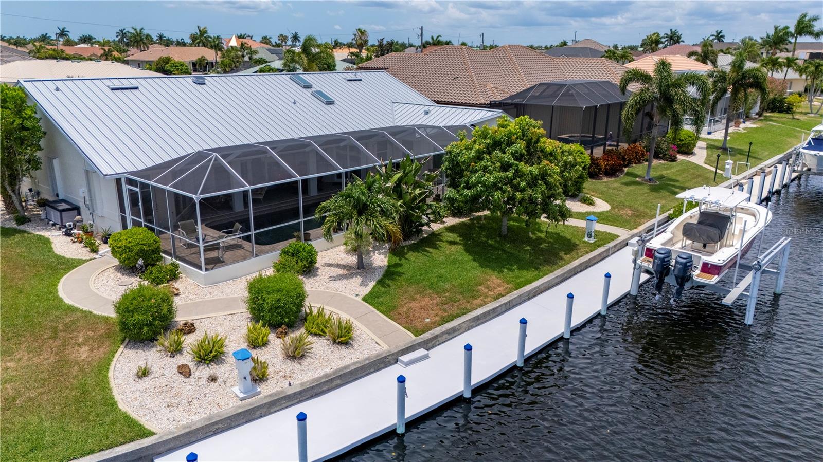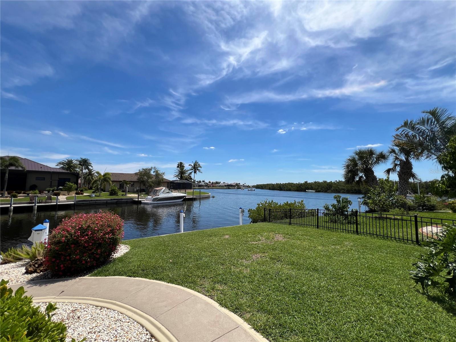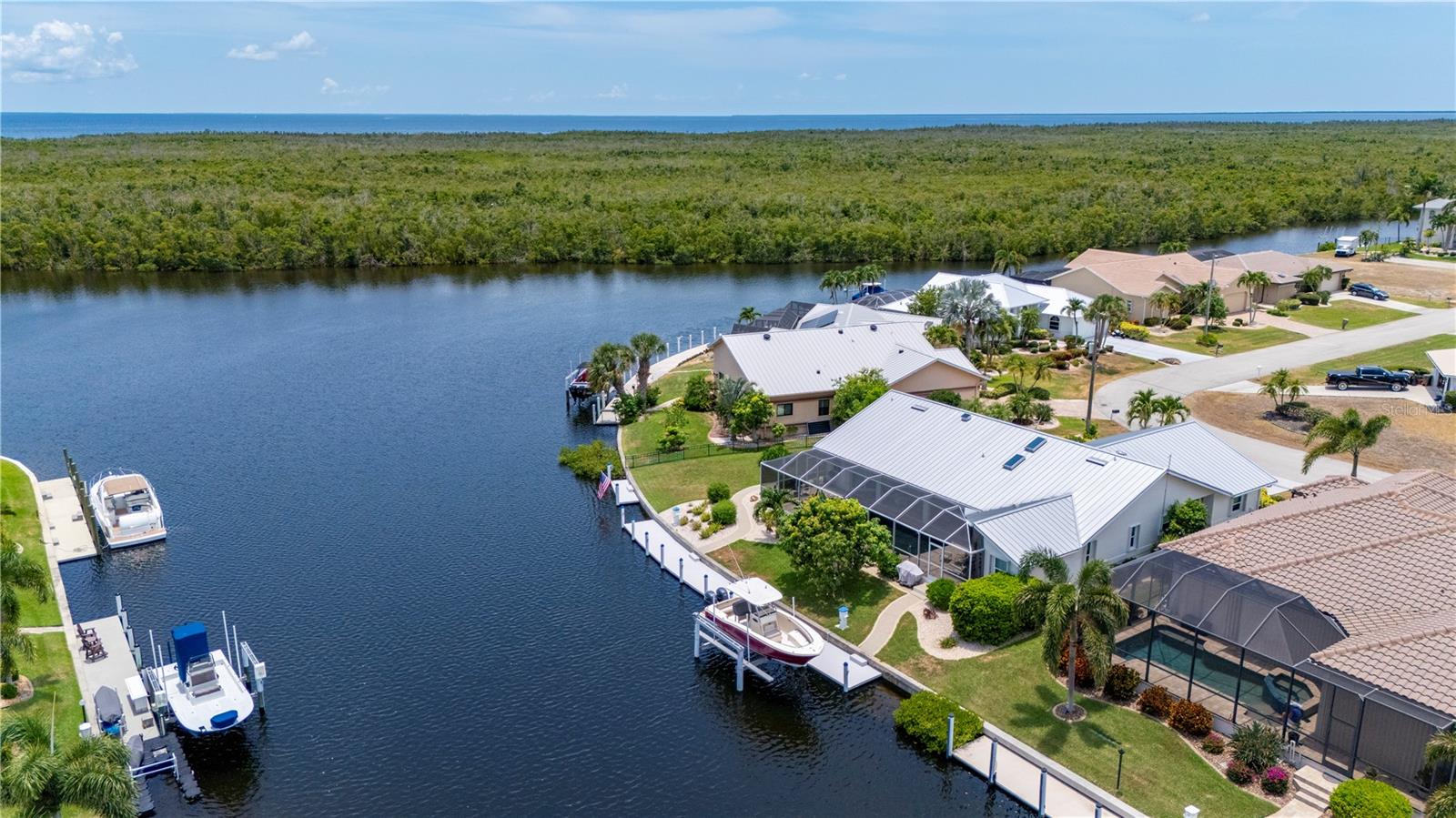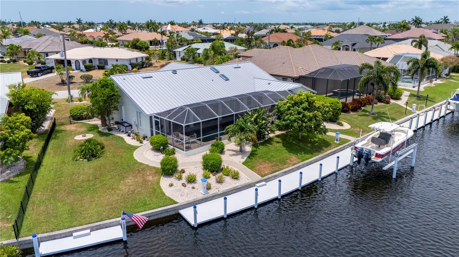 WIDE WATER VIEW! Please enjoy the aerial views and dolphin sighting in the YouTube video. Located on the quiet south end of Bal Harbor in the highly sought after PGI Sec 12. NO HOA. Public Water & Sewer. 8 MIN RIDE TO open water through Buckley's Pass, or a leisurely 20 min ride along the perimeter canal and out Ponce exit. 12'x31' in-ground saltwater swimming pool with screened cage. One-of-a-kind custom floorplan offers TWO Master Suites, Split plan bedrooms for privacy, THREE FULL BATHROOMS. Bath 1 and Bath 2 are en suite; Bath 3 is adjacent to third bedroom. Kitchen has 10' long cooktop island with downdraft exhaust, wood cabinet doors, engineered quartz countertops. Two Skylights in Kitchen. Wet bar in living room has combo mini fridge/wine cooler. The bump-out area of the garage has a 14' x 7' air conditioned workshop space with 2 PGT Impact windows. Galvalume Standing Seam 20 gauge aluminum roof ('23). PGT Impact & Low E windows and IMPACT sliders ('20). Full hurricane protection. No water damage from Helene or Milton! The 118 feet of seawall is maintained by City of Punta Gorda. TWO Concrete Docks; 78' long and 15' long ('20) with 2 power & water pedestals at seawall ('19). 12,000 pound Golden Boat Lift ('20). Dredged along entire seawall area. TWO paved walkways to docks. Underwater Fish Light ('24). Large side yard perfect for pets. In addition to the ever changing view of passing boats, we've seen dolphin, tarpon, rays, manatees, ducks, herons, osprey, pelicans and jumping fish all in the backyard. Oversized lot with grassy area perfect for your pet. Five year old Valencia Pride MANGO tree produces large and super sweet fruit every year. The annual Last Saturday Before Christmas Lighted Boat Parade goes right past the house as it circles through the Sunset Lake basin. In addition to boating, there's always something fun to do in PGI! Owners can join the Civic Association and it's sub-groups & clubs - for everything from fishing to card games, boating excursions to tennis. Look at pgica.org for more info. You'll also enjoy shows at the Charlotte Harbor Event Center, award winning restaurants, Fisherman's Village, shopping, several parks, weekend farmer markets, pickleball courts, tennis courts, over 20 golf courses in the area, PGD Airport, new library at History Park, bicycle and walking trails, picnic areas, kayaking, fishing and much more. Note that listing agent is owner. It is all about the daily views here, there's even a view of Sunset Lake Turning Basin from the picture window at kitchen sink! Call today to make it yours and start to Live the Gulf Life!!