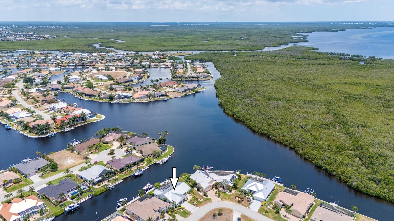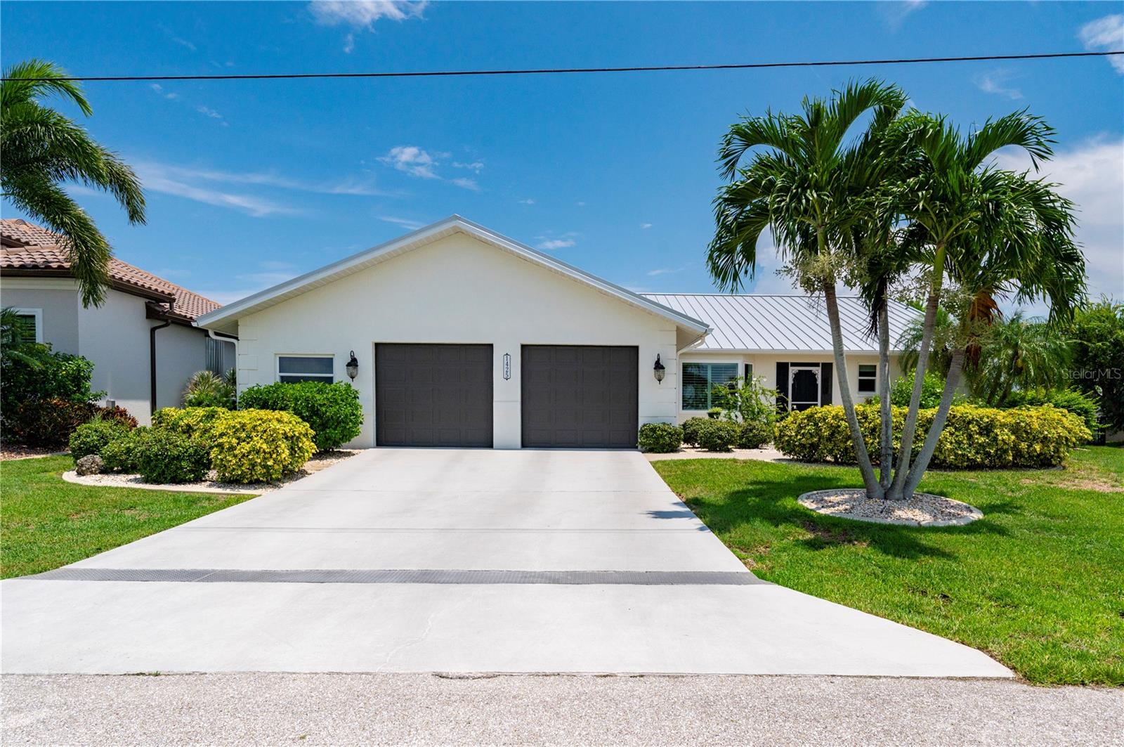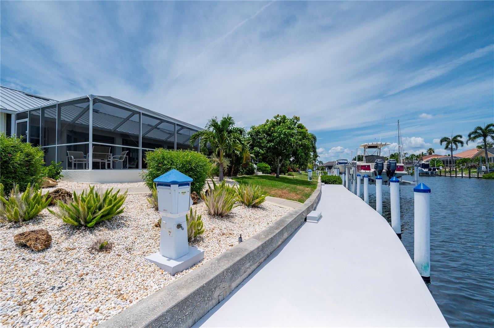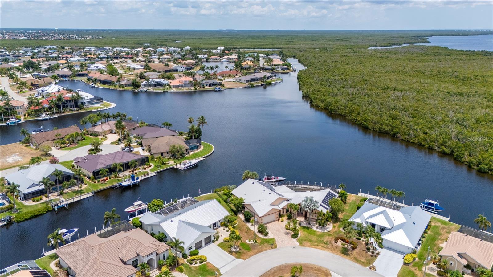 WIDE WATER VIEW! Please enjoy the aerial views and dolphin sighting in the YouTube video. Located on the quiet south end of Bal Harbor in the highly sought after PGI Sec 12. NO HOA. Public Water & Sewer. 8 MIN RIDE TO open water through Buckley's Pass, or a leisurely 20 min ride along the perimeter canal and out Ponce exit. 12'x31' in-ground saltwater swimming pool with screened cage. One-of-a-kind custom floorplan offers TWO Master Suites, Split plan bedrooms for privacy, THREE FULL BATHROOMS. Bath 1 and Bath 2 are en suite; Bath 3 is adjacent to third bedroom. Kitchen has 10' long cooktop island with downdraft exhaust, wood cabinet doors, engineered quartz countertops. Two Skylights in Kitchen. Wet bar in living room has combo mini fridge/wine cooler. The bump-out area of the garage has a 14' x 7' air conditioned workshop space with 2 PGT Impact windows. Galvalume Standing Seam 20 gauge aluminum roof ('23). PGT Impact & Low E windows and IMPACT sliders ('20). Full hurricane protection. No water damage from Helene or Milton! The 118 feet of seawall is maintained by City of Punta Gorda. TWO Concrete Docks; 78' long and 15' long ('20) with 2 power & water pedestals at seawall ('19). 12,000 pound Golden Boat Lift ('20). Dredged along entire seawall area. TWO paved walkways to docks. Underwater Fish Light ('24). Large side yard perfect for pets. In addition to the ever changing view of passing boats, we've seen dolphin, tarpon, rays, manatees, ducks, herons, osprey, pelicans and jumping fish all in the backyard. Oversized lot with grassy area perfect for your pet. Five year old Valencia Pride MANGO tree produces large and super sweet fruit every year. The annual Last Saturday Before Christmas Lighted Boat Parade goes right past the house as it circles through the Sunset Lake basin. In addition to boating, there's always something fun to do in PGI! Owners can join the Civic Association and it's sub-groups & clubs - for everything from fishing to card games, boating excursions to tennis. Look at pgica.org for more info. You'll also enjoy shows at the Charlotte Harbor Event Center, award winning restaurants, Fisherman's Village, shopping, several parks, weekend farmer markets, pickleball courts, tennis courts, over 20 golf courses in the area, PGD Airport, new library at History Park, bicycle and walking trails, picnic areas, kayaking, fishing and much more. Note that listing agent is owner. It is all about the daily views here, there's even a view of Sunset Lake Turning Basin from the picture window at kitchen sink! Call today to make it yours and start to Live the Gulf Life!!