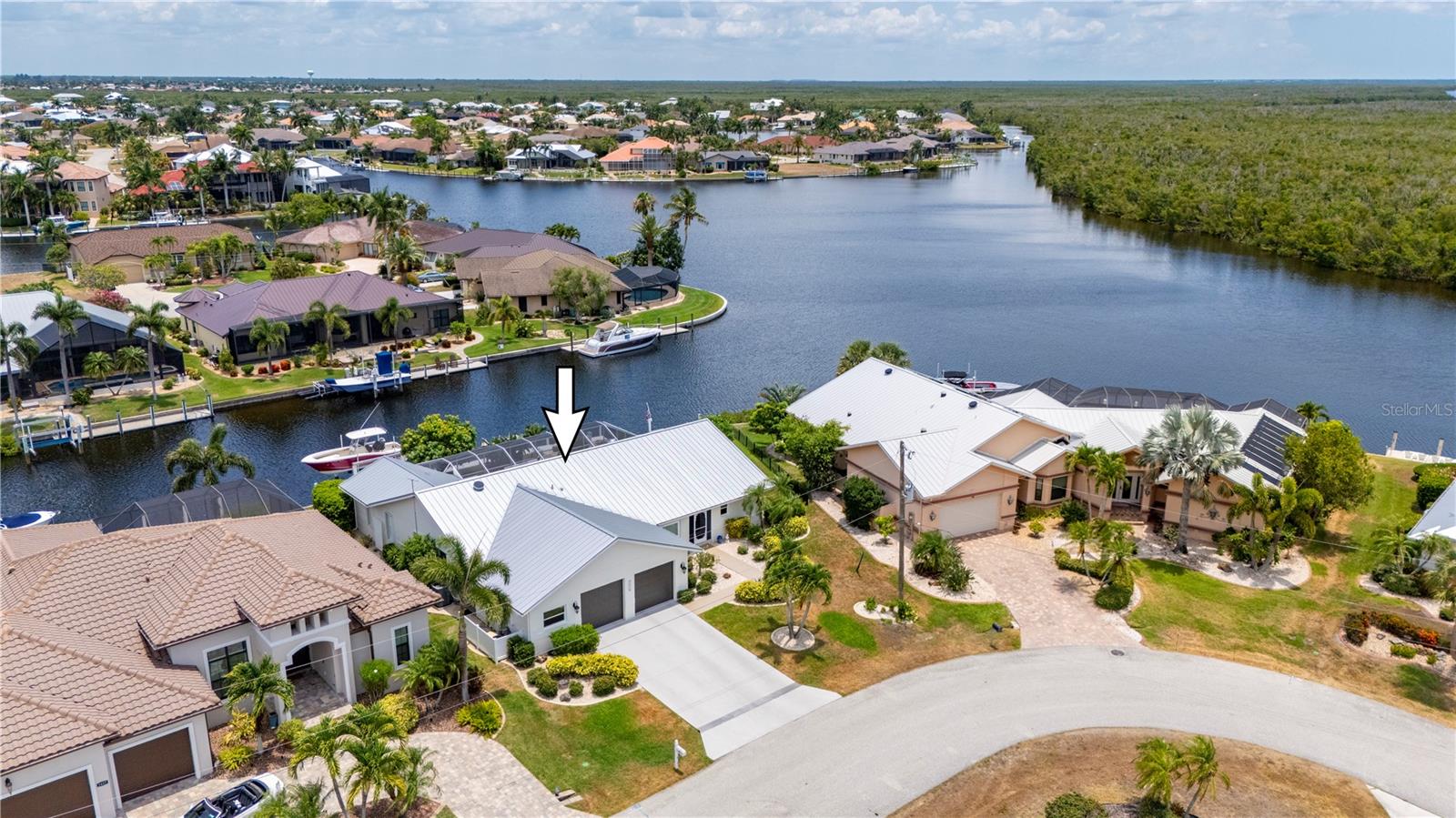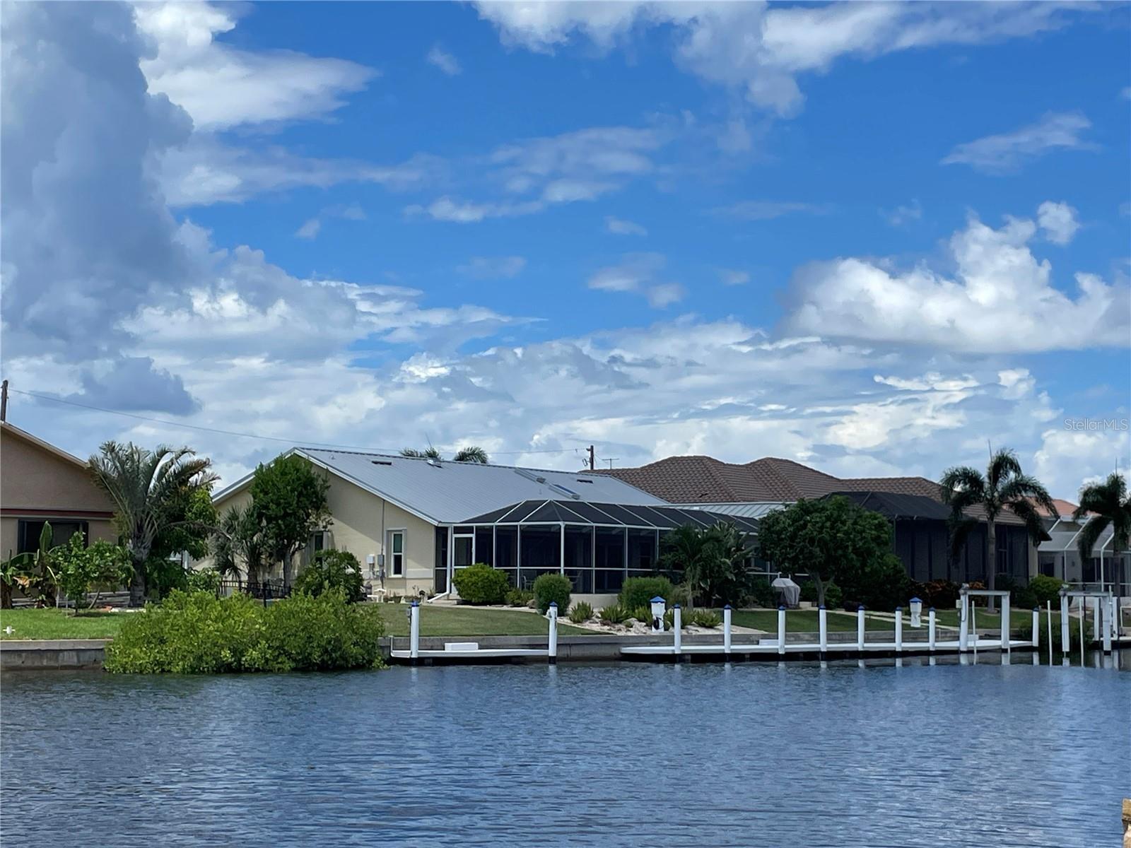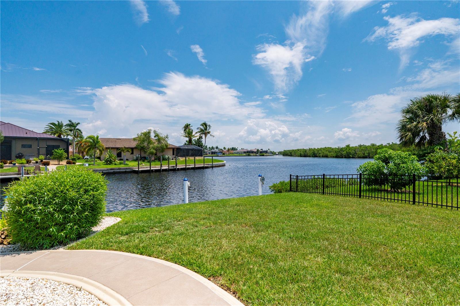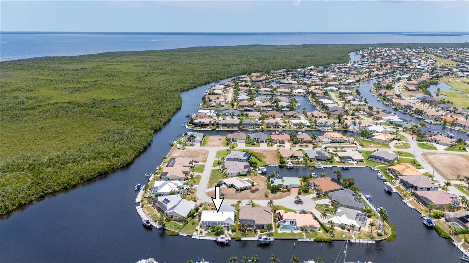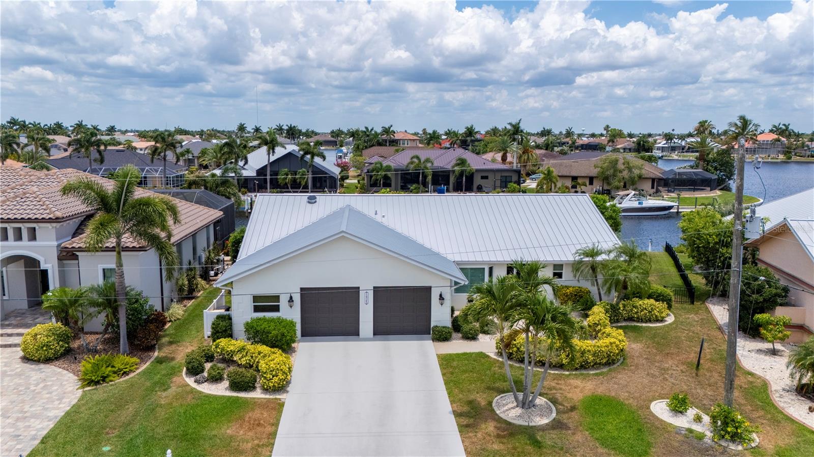WIDE WATER VIEW! Please enjoy the aerial views and dolphin sighting in the YouTube video. Located on the quiet south end of Bal Harbor in the highly sought after PGI Sec 12. NO HOA. Public Water & Sewer. 8 MIN RIDE TO open water through Buckley's Pass, or a leisurely 20 min ride along the perimeter canal and out Ponce exit. 12'x31' in-ground saltwater swimming pool with screened cage. One-of-a-kind custom floorplan offers TWO Master Suites, Split plan bedrooms for privacy, THREE FULL BATHROOMS. Bath 1 and Bath 2 are en suite; Bath 3 is adjacent to third bedroom. Kitchen has 10' long cooktop island with downdraft exhaust, wood cabinet doors, engineered quartz countertops. Two Skylights in Kitchen. Wet bar in living room has combo mini fridge/wine cooler. The bump-out area of the garage has a 14' x 7' air conditioned workshop space with 2 PGT Impact windows. Galvalume Standing Seam 20 gauge aluminum roof ('23). PGT Impact & Low E windows and IMPACT sliders ('20). Full hurricane protection. No water damage from Helene or Milton! The 118 feet of seawall is maintained by City of Punta Gorda. TWO Concrete Docks; 78' long and 15' long ('20) with 2 power & water pedestals at seawall ('19). 12,000 pound Golden Boat Lift ('20). Dredged along entire seawall area. TWO paved walkways to docks. Underwater Fish Light ('24). Large side yard perfect for pets. In addition to the ever changing view of passing boats, we've seen dolphin, tarpon, rays, manatees, ducks, herons, osprey, pelicans and jumping fish all in the backyard. Oversized lot with grassy area perfect for your pet. Five year old Valencia Pride MANGO tree produces large and super sweet fruit every year. The annual Last Saturday Before Christmas Lighted Boat Parade goes right past the house as it circles through the Sunset Lake basin. In addition to boating, there's always something fun to do in PGI! Owners can join the Civic Association and it's sub-groups & clubs - for everything from fishing to card games, boating excursions to tennis. Look at pgica.org for more info. You'll also enjoy shows at the Charlotte Harbor Event Center, award winning restaurants, Fisherman's Village, shopping, several parks, weekend farmer markets, pickleball courts, tennis courts, over 20 golf courses in the area, PGD Airport, new library at History Park, bicycle and walking trails, picnic areas, kayaking, fishing and much more. Note that listing agent is owner. It is all about the daily views here, there's even a view of Sunset Lake Turning Basin from the picture window at kitchen sink! Call today to make it yours and start to Live the Gulf Life!!