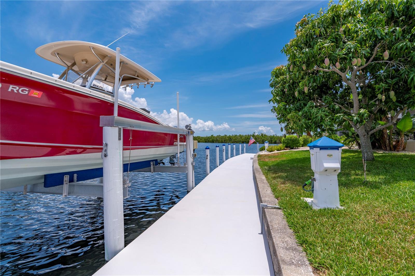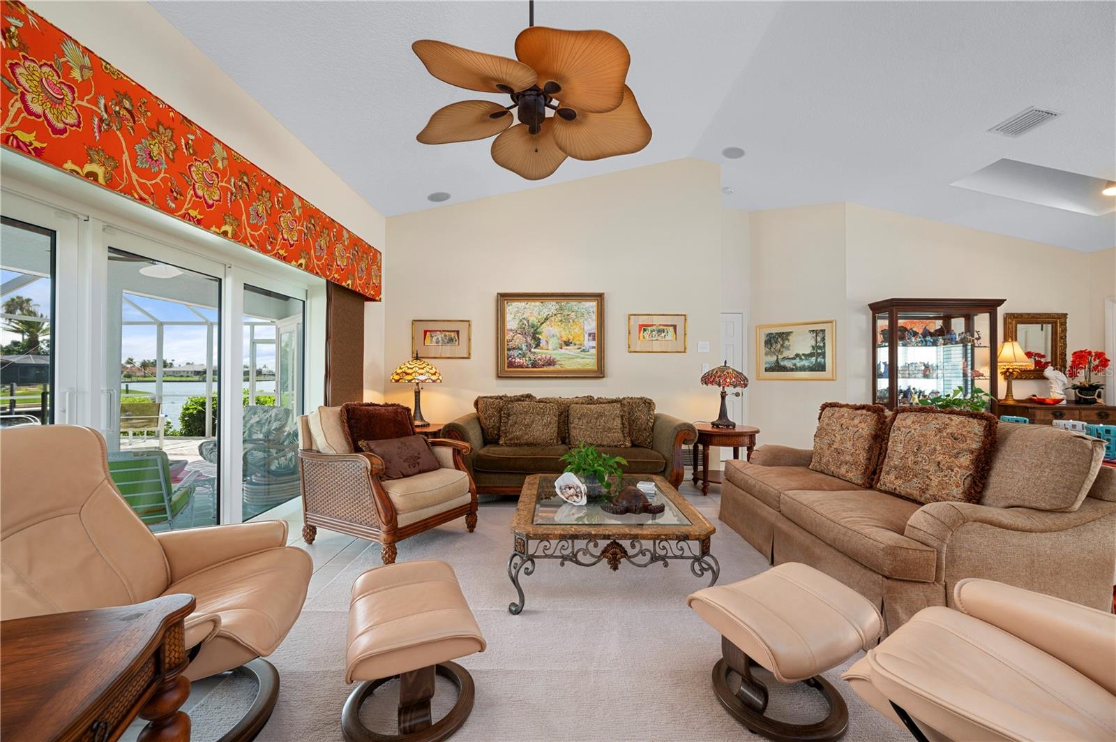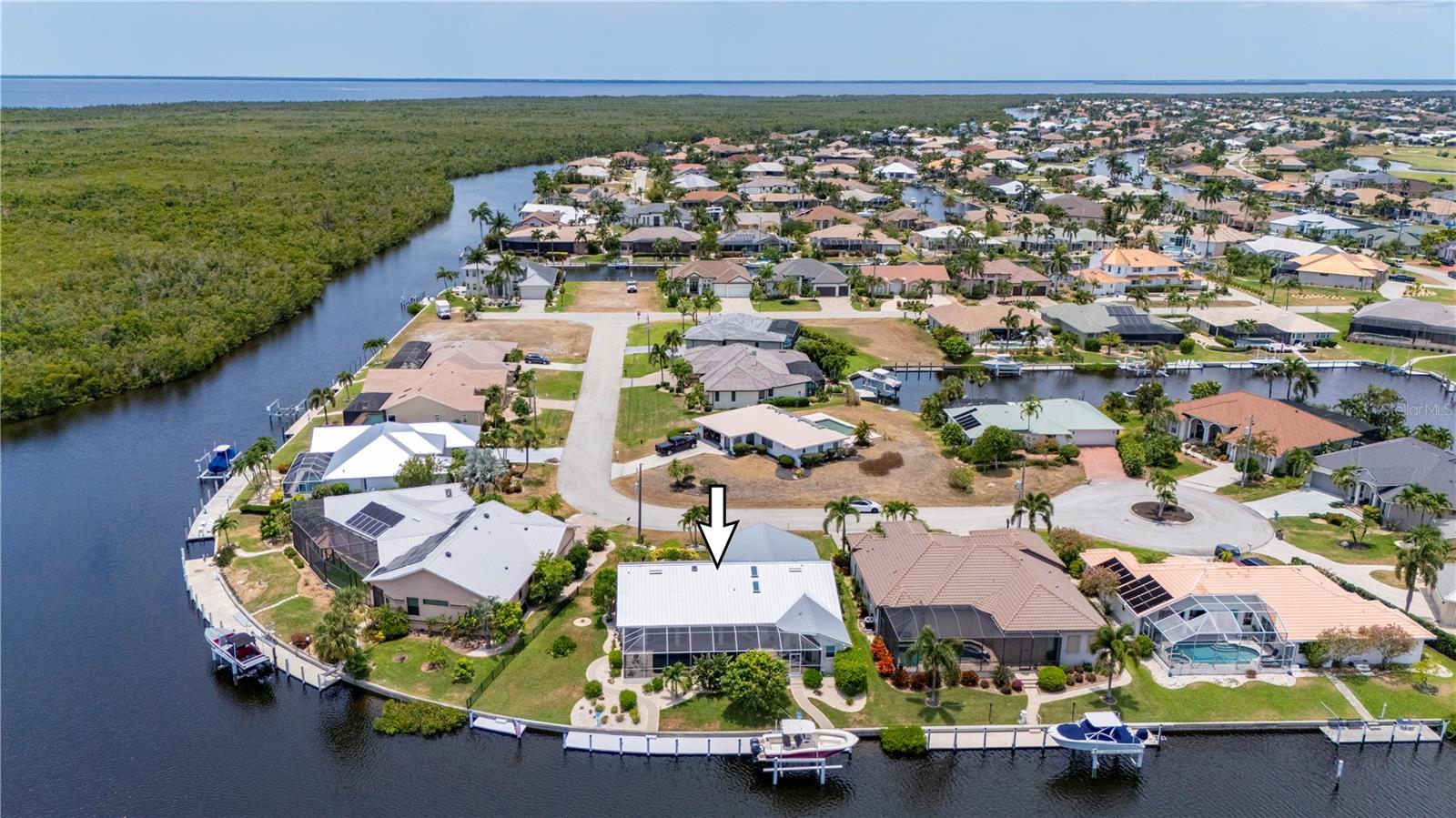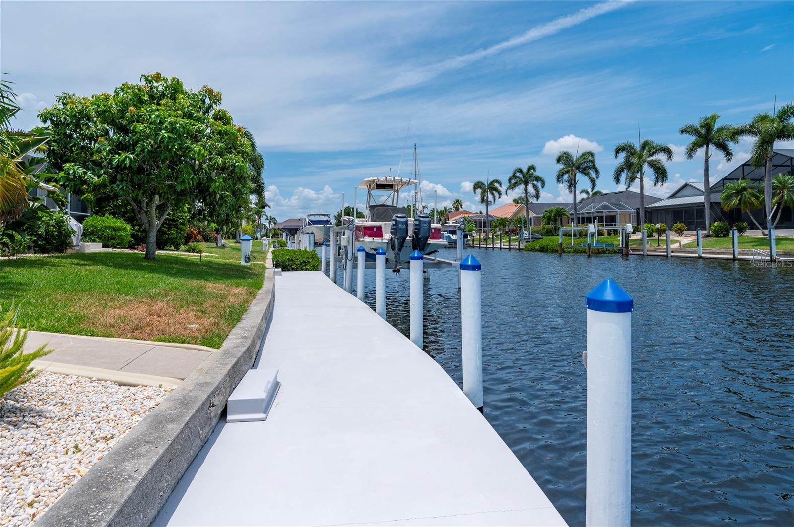 WIDE WATER VIEW! Please enjoy the aerial views and dolphin sighting in the YouTube video. Located on the quiet south end of Bal Harbor in the highly sought after PGI Sec 12. NO HOA. Public Water & Sewer. 8 MIN RIDE TO open water through Buckley's Pass, or a leisurely 20 min ride along the perimeter canal and out Ponce exit. 12'x31' in-ground saltwater swimming pool with screened cage. One-of-a-kind custom floorplan offers TWO Master Suites, Split plan bedrooms for privacy, THREE FULL BATHROOMS. Bath 1 and Bath 2 are en suite; Bath 3 is adjacent to third bedroom. Kitchen has 10' long cooktop island with downdraft exhaust, wood cabinet doors, engineered quartz countertops. Two Skylights in Kitchen. Wet bar in living room has combo mini fridge/wine cooler. The bump-out area of the garage has a 14' x 7' air conditioned workshop space with 2 PGT Impact windows. Galvalume Standing Seam 20 gauge aluminum roof ('23). PGT Impact & Low E windows and IMPACT sliders ('20). Full hurricane protection. No water damage from Helene or Milton! The 118 feet of seawall is maintained by City of Punta Gorda. TWO Concrete Docks; 78' long and 15' long ('20) with 2 power & water pedestals at seawall ('19). 12,000 pound Golden Boat Lift ('20). Dredged along entire seawall area. TWO paved walkways to docks. Underwater Fish Light ('24). Large side yard perfect for pets. In addition to the ever changing view of passing boats, we've seen dolphin, tarpon, rays, manatees, ducks, herons, osprey, pelicans and jumping fish all in the backyard. Oversized lot with grassy area perfect for your pet. Five year old Valencia Pride MANGO tree produces large and super sweet fruit every year. The annual Last Saturday Before Christmas Lighted Boat Parade goes right past the house as it circles through the Sunset Lake basin. In addition to boating, there's always something fun to do in PGI! Owners can join the Civic Association and it's sub-groups & clubs - for everything from fishing to card games, boating excursions to tennis. Look at pgica.org for more info. You'll also enjoy shows at the Charlotte Harbor Event Center, award winning restaurants, Fisherman's Village, shopping, several parks, weekend farmer markets, pickleball courts, tennis courts, over 20 golf courses in the area, PGD Airport, new library at History Park, bicycle and walking trails, picnic areas, kayaking, fishing and much more. Note that listing agent is owner. It is all about the daily views here, there's even a view of Sunset Lake Turning Basin from the picture window at kitchen sink! Call today to make it yours and start to Live the Gulf Life!!