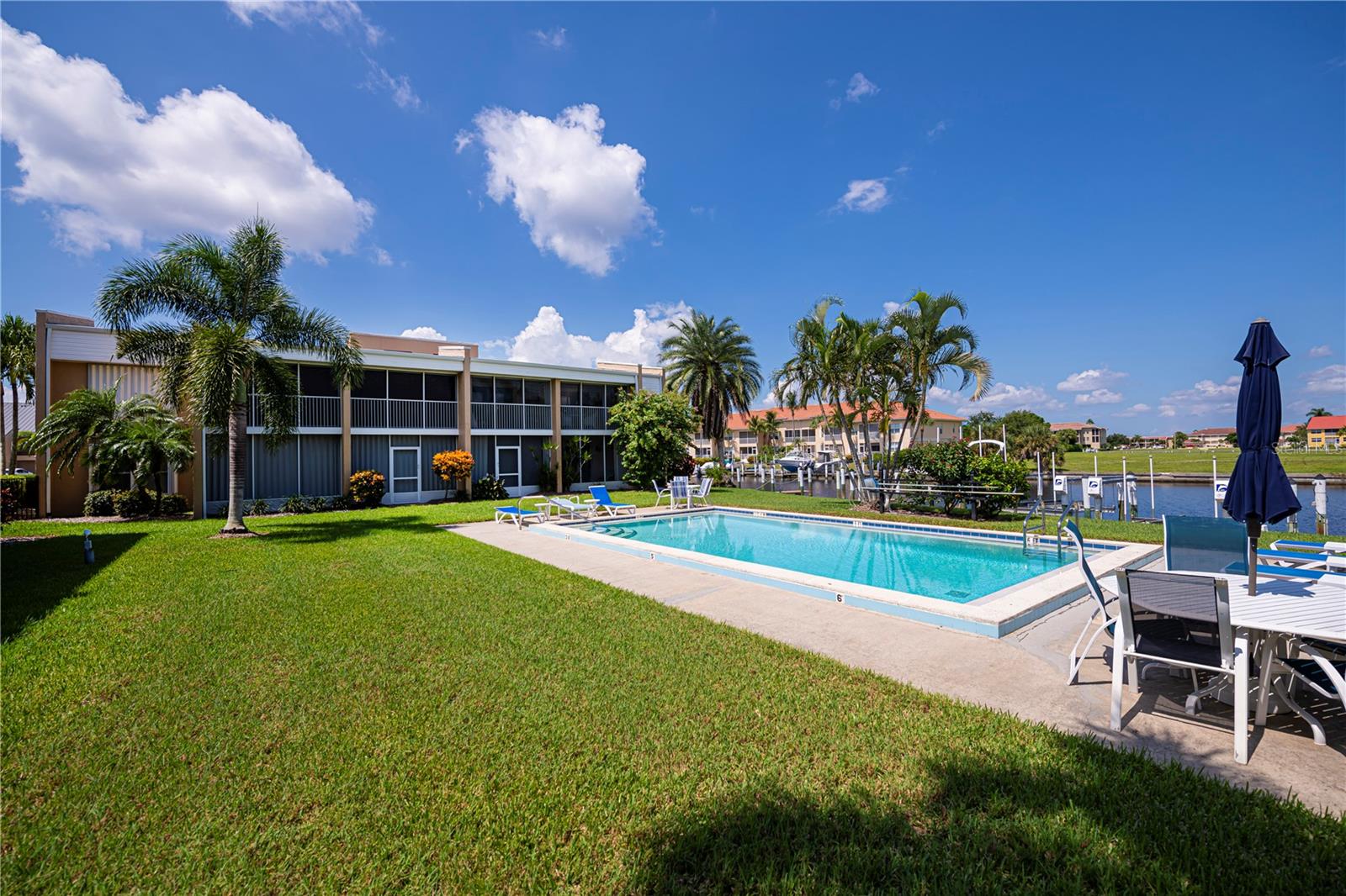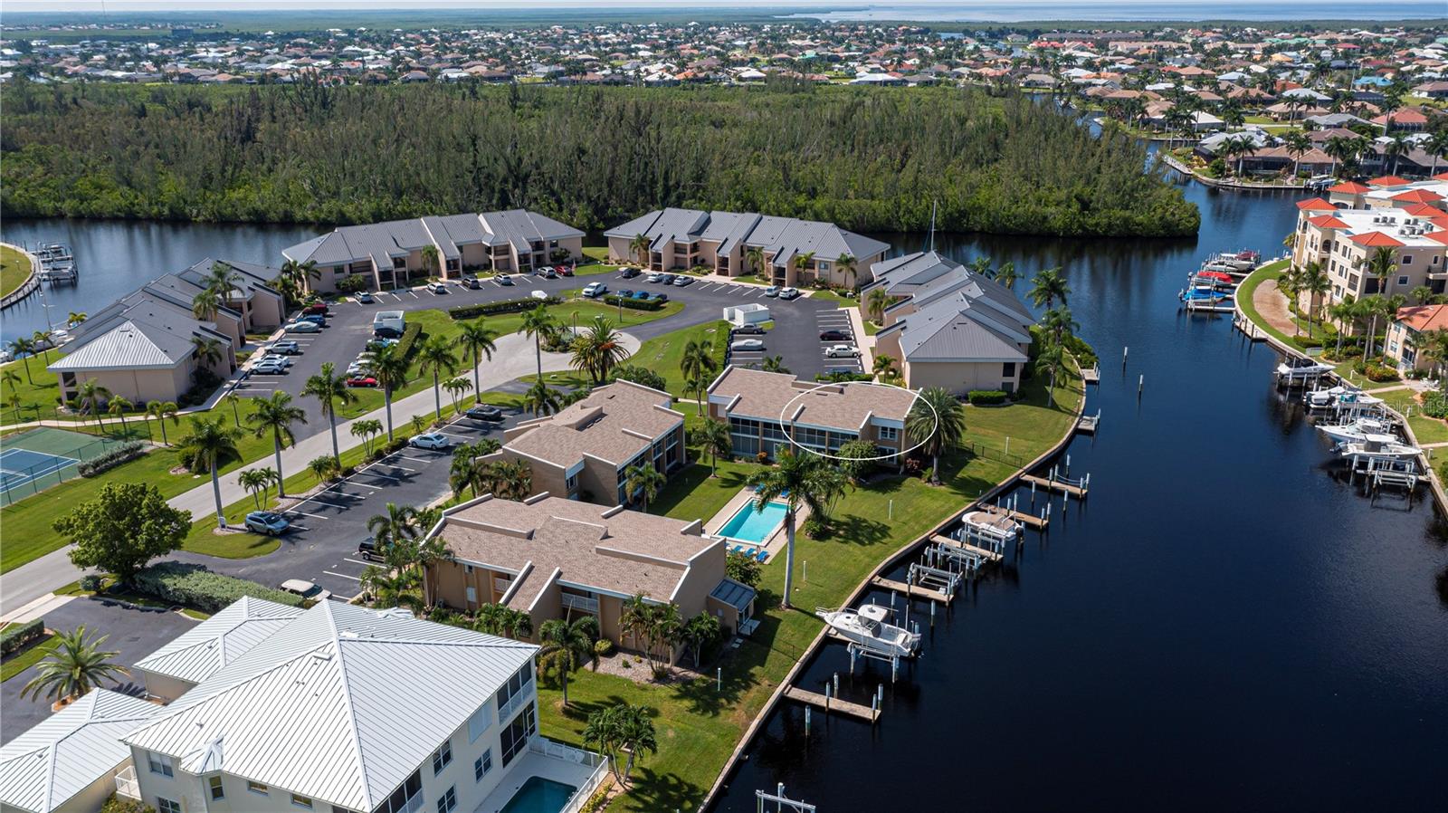 Take a close look at this stunning 2nd floor, open water access condo! Split bedroom floor plan with remodeled kitchen & baths, gracious entry foyer, high-end oak hardwood floors, interior laundry, and a spacious lanai! MANY upgrades including tilt-in windows, accordion hurricane shutters, newly painted interior. Some furnishings are included. Assigned dock is included. Boat to open water, then return home to maintenance-free living to relax in the community pool or enjoy the evening on your spacious lanai, complete with vinyl sliders for year-round enjoyment. Your piece of paradise is here, close to fine dining, shopping, world-class fishing, golfing, beaches, entertainment, and more!