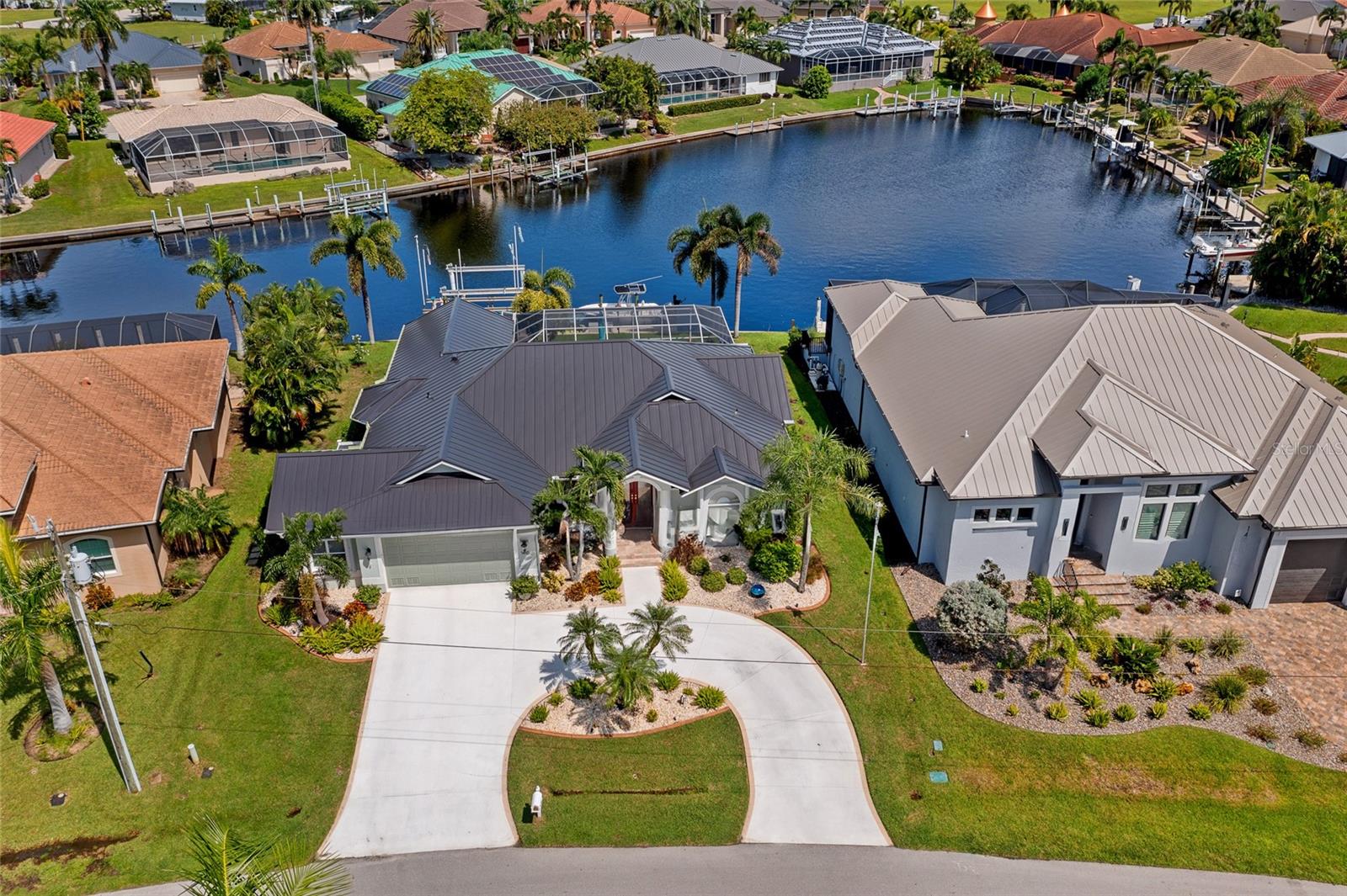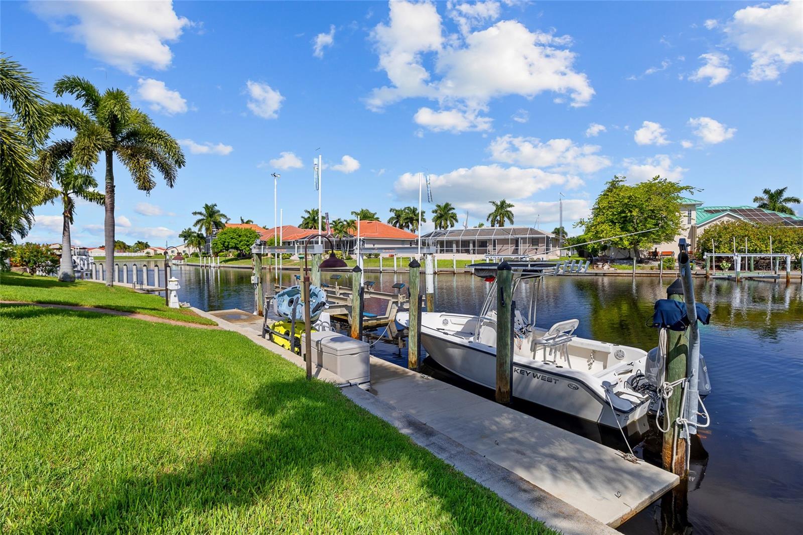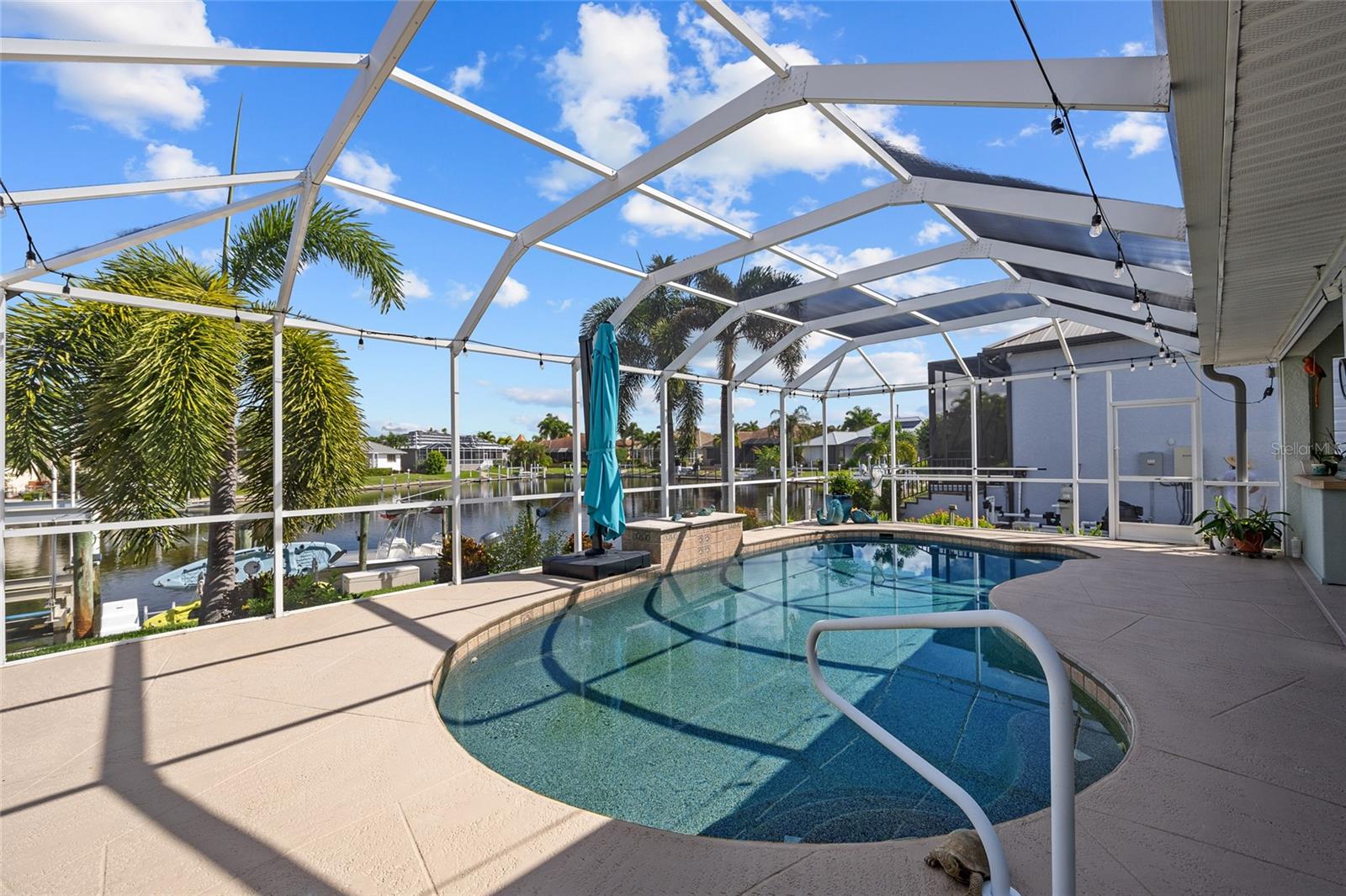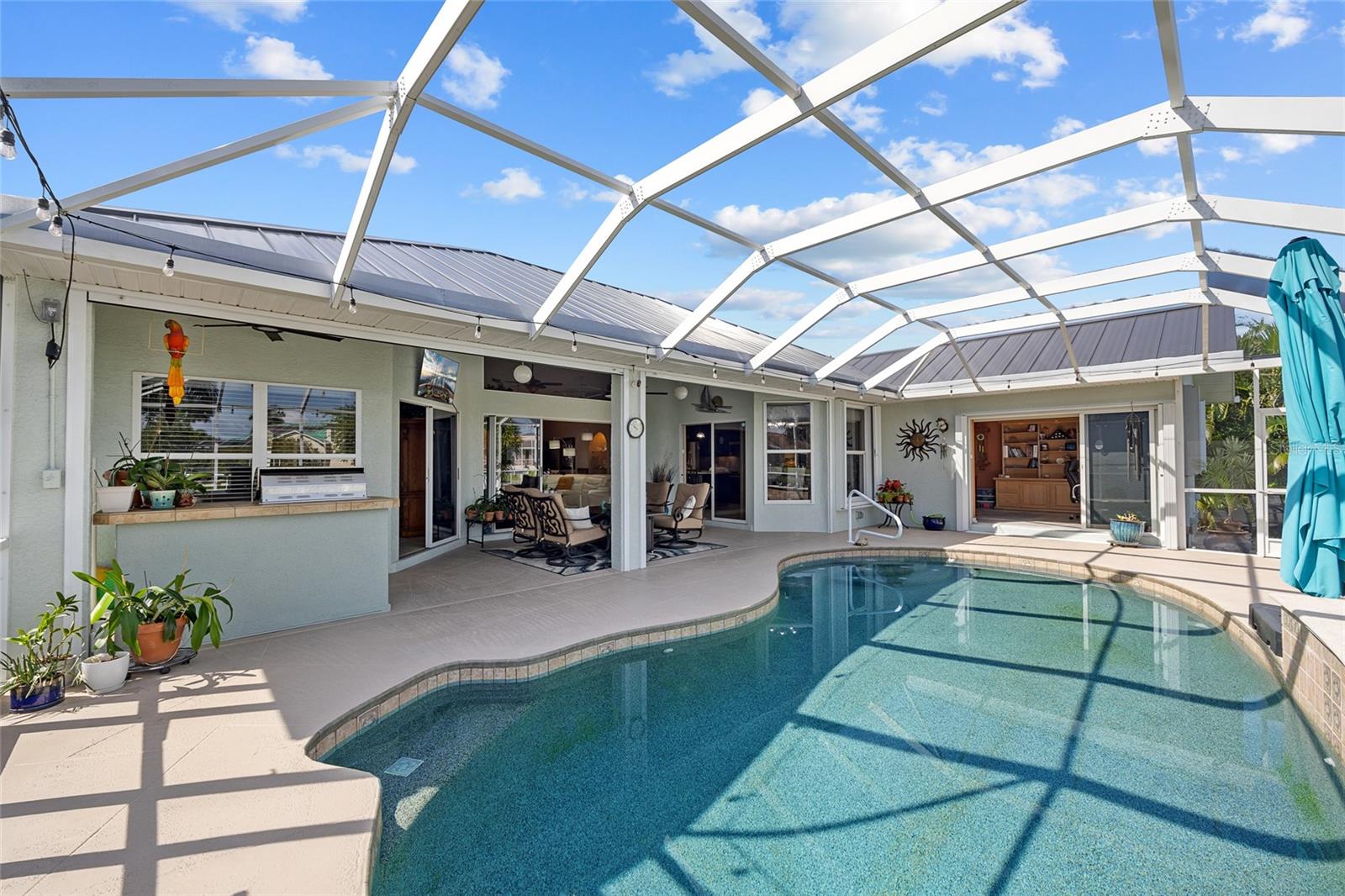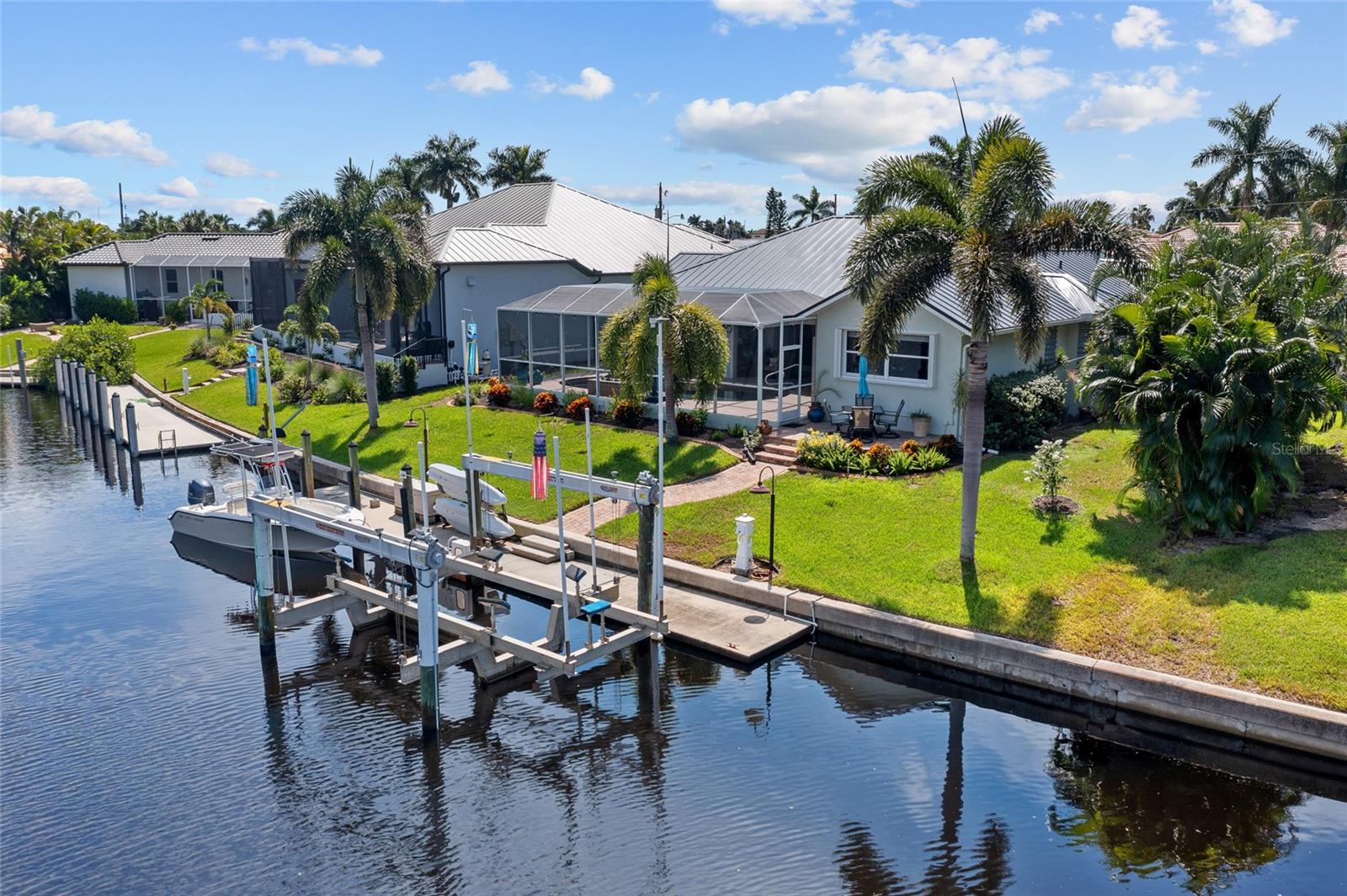 PUNTA GORDA ISLES! GORGEOUS 3 BEDROOM, 2 BATH, 2-CAR GARAGE POOL HOME WITH SAILBOAT ACCESS TO CHARLOTTE HARBOR LEADING TO THE GULF OF MEXICO VIA BUCKLEY’S PASS! A boaters dream with 91’ of waterfrontage, 54’ concrete dock with water and power pedestal, 28,000 lb. boat lift and davit on large deep turning basin. As you approach the home, you'll be greeted by a double door-stained glass entry that opens into an inviting open floor plan with high ceilings, elegant fixtures, indirect lighting for nighttime accents, built-in accents, and tile flooring throughout. Plantation shutters and a soothing décor complement the spacious living area, which features a large slider that seamlessly blends indoor and outdoor living. The beautifully remodeled open kitchen is a chef's dream, featuring granite counters, custom wood cabinetry with pull-out shelves, and stainless appliances, including a new refrigerator and dishwasher. The large center island with breakfast bar and casual dining nook offers stunning views of the pool and waterfront. The updated primary suite is a private oasis, with access to the lanai, double walk-in closets with automatic lighting, dual sinks, a garden bath, and a glass walk-in shower. The split bedroom plan ensures privacy for all, with the second bedroom offering a Murphy bed and the third bedroom providing ample natural light and water views plus separate bath offering an updated walk-in shower with rain shower and jets. Step outside to the covered, rescreened lanai, complete with an outdoor grill and refrigerator, screened heated saltwater pebble Tec pool with waterfall and pool light - perfect for year-round enjoyment plus outdoor paver patio with walkway to dock. Additional special features include a new metal roof, gutters, accordion storm shutters, and remote-control Storm Smart hurricane shutters on the lanai. The home also includes a versatile air-conditioned workshop, security system with surveillance cameras, A/C system with ultraviolet light, generator connection, and convenient circular driveway and lush tropical landscaping. Located in a vibrant golf and boating community, you're just minutes away from St. Andrews South Golf Club, the Yacht Club, Fishermen's Village, and the historic downtown area of Punta Gorda. Enjoy access to arts, community events, entertainment, world-class fishing, boating, fine dining, and beautiful parks, as well as easy access to the Southwest Florida Gulf beaches. Don't miss this opportunity to make this amazing property your new snowbird retreat or permanent home. Schedule your private showing today!