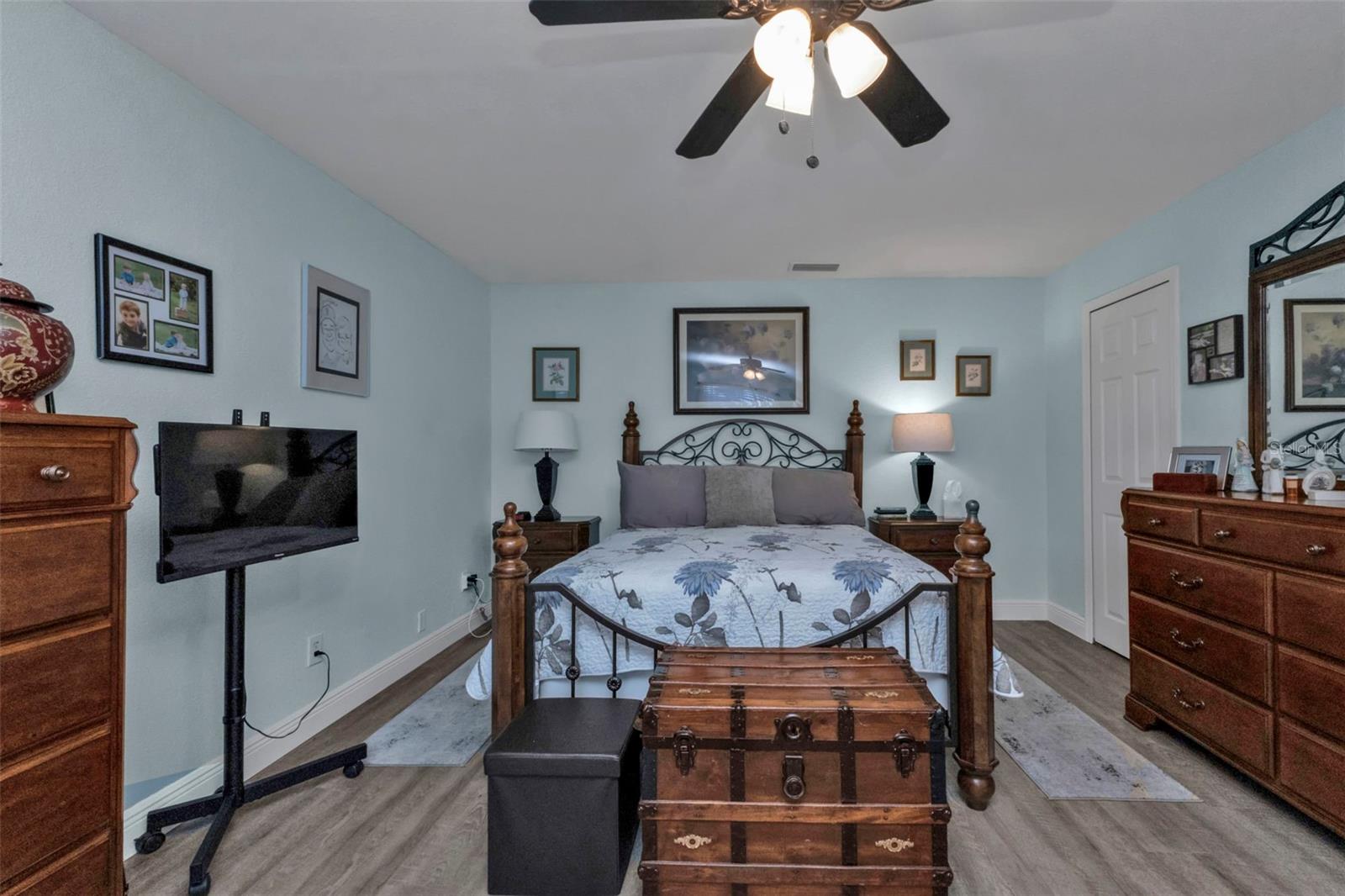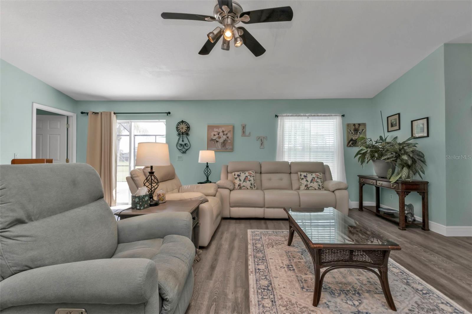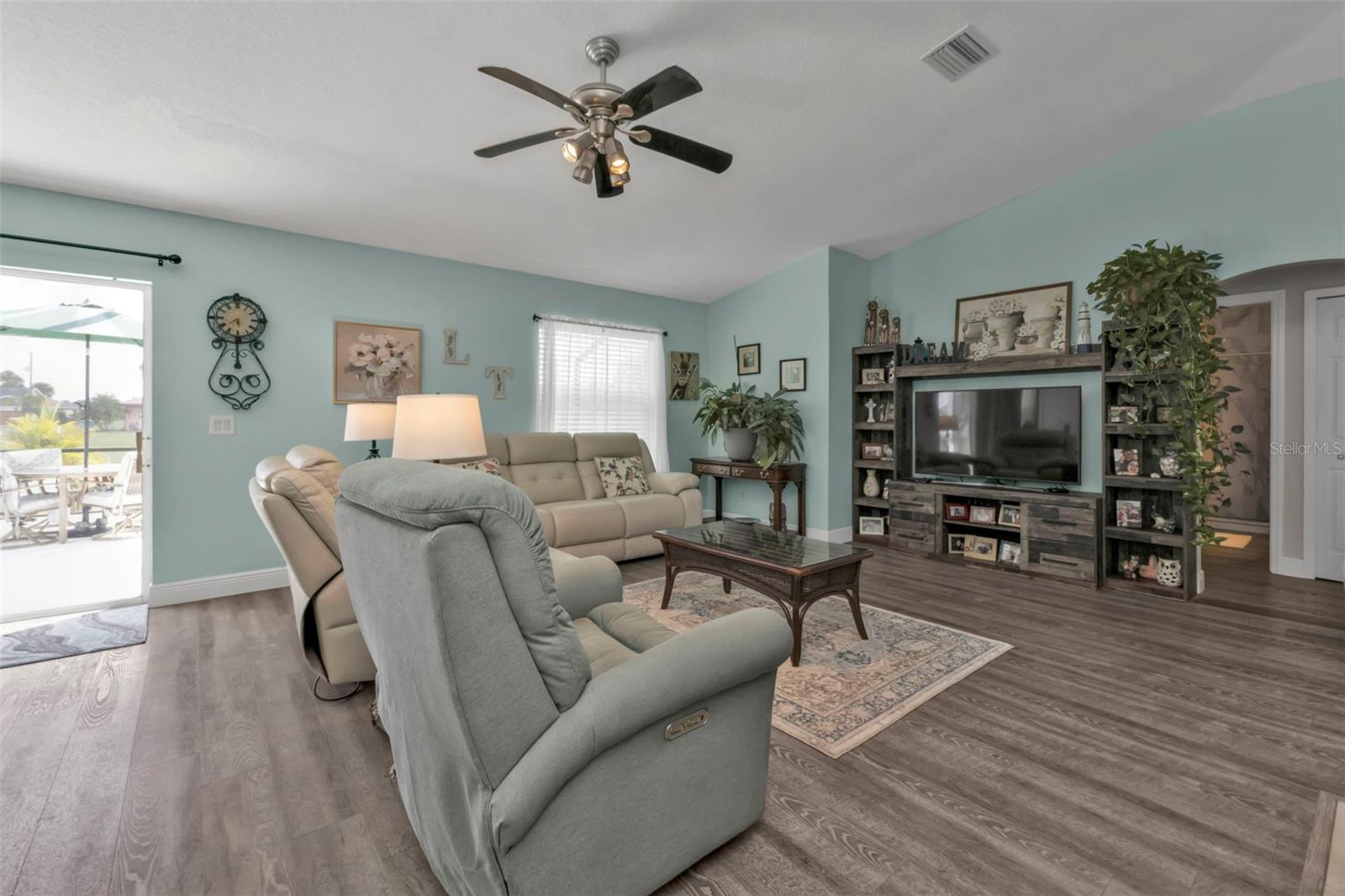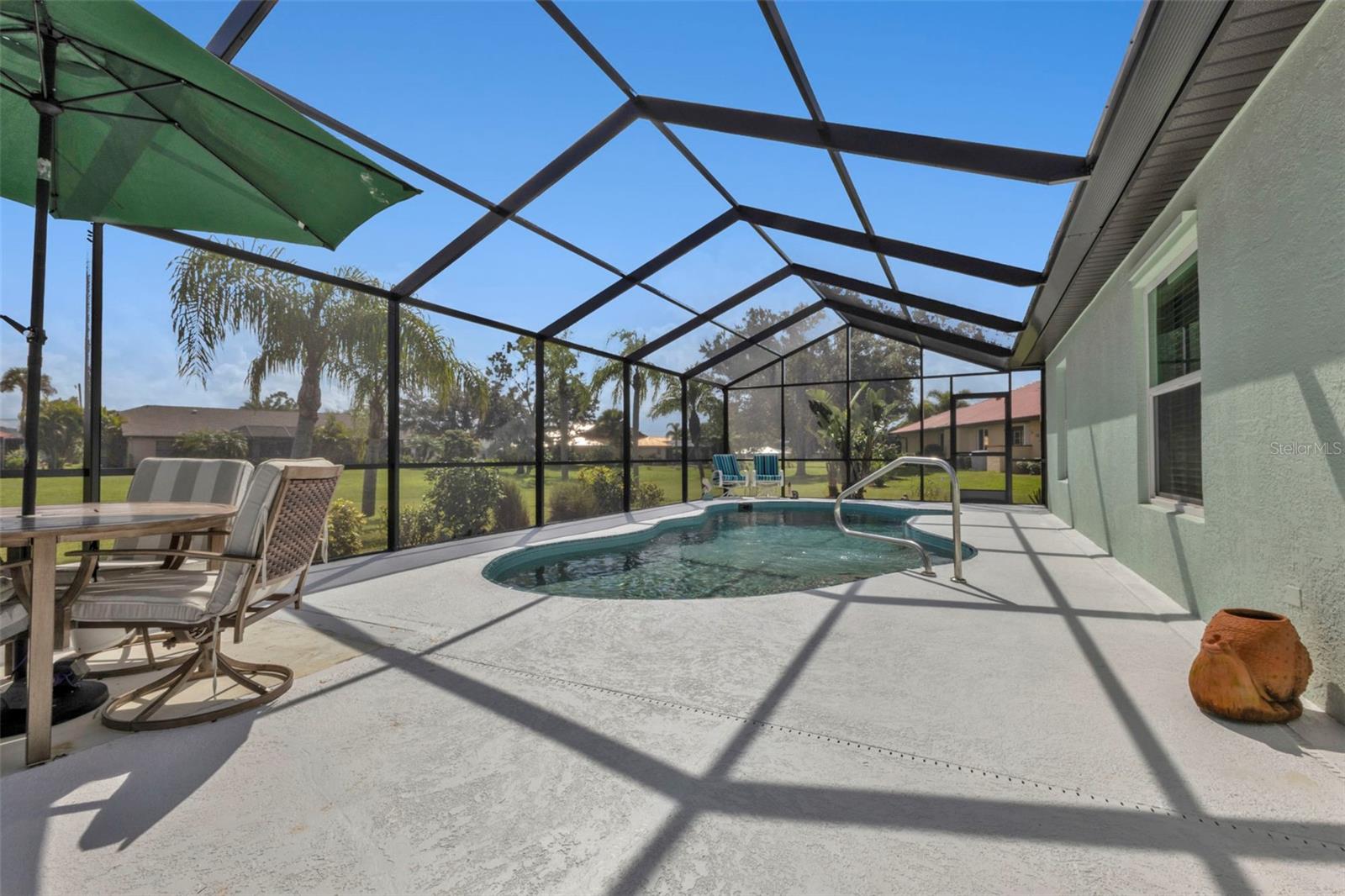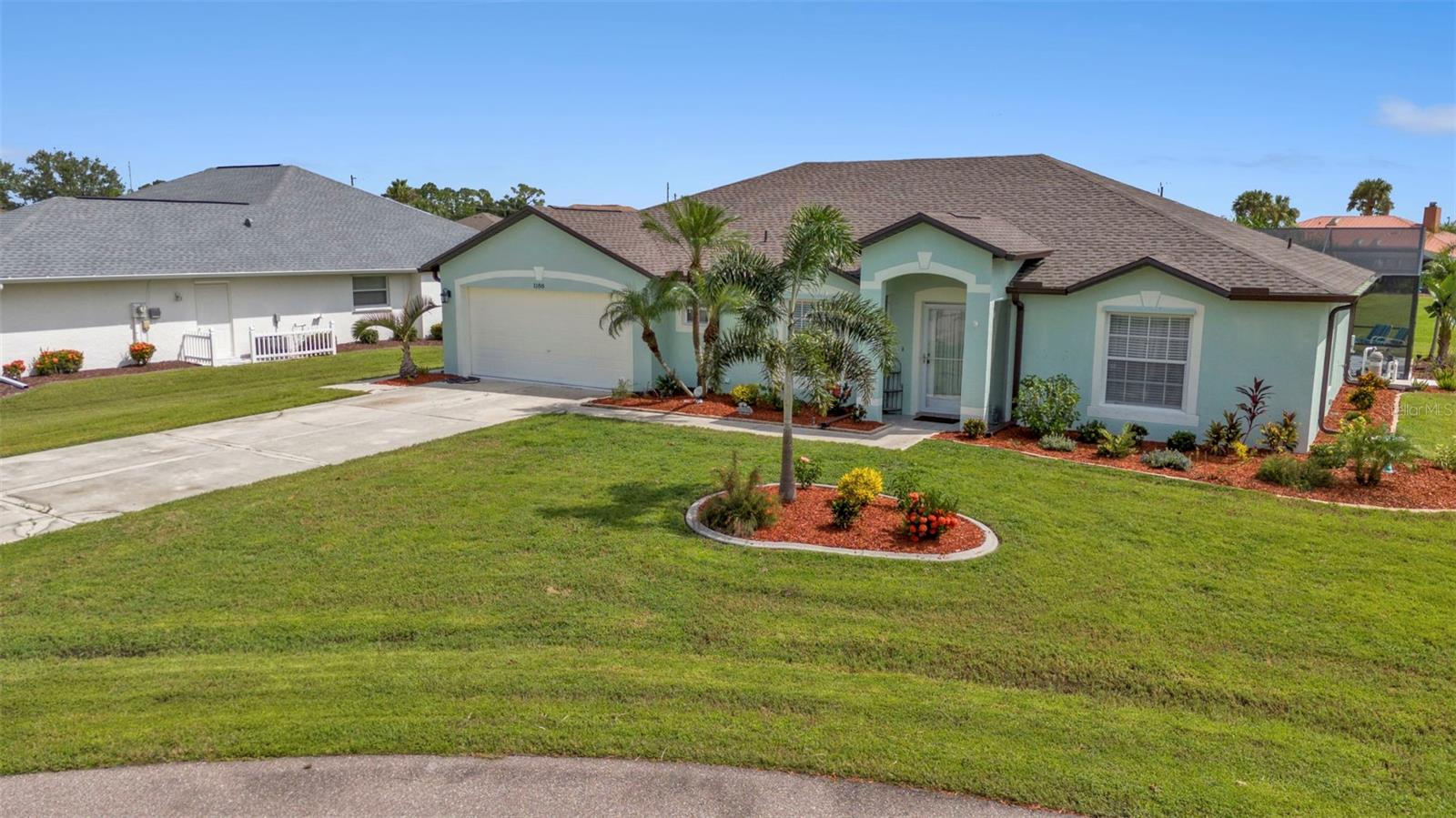 This charming residence offers 3 bedrooms plus a versatile den (or 4th bedroom) and is perfectly situated in a serene cul-de-sac. The kitchen has been beautifully remodeled with granite counters, soft-close cabinets, and a spacious pantry. Enjoy modern amenities including newer Stainless Steel appliances, a tile backsplash, and an island that seamlessly connects to the living and dining areas. An additional corner bar/coffee/wine area enhances your entertaining and storage options. The home features a thoughtful split floor plan. The guest bath has been updated with a new vanity, new fixtures, and a newly tiled shower. The expansive master bedroom (19x13) boasts windows overlooking the pool area and a generous walk-in closet. The master bath has been newly upgraded with dual sinks, modern lighting fixtures, a brand-new shower with floating shelves and a bench seat, and a convenient cabana door leading to the pool area. Additional highlights include a new A/C system (2022), a new roof (2023), and fresh interior and exterior paint. The pool deck, which spans 64 feet across the back of the home, offers ample space for relaxation and entertainment. The pool has been resurfaced, and the enclosure was just installed in August 2024. The exterior features fresh mulch, mature, trimmed landscaping, and a sprinkler system. Located in a NON-flood zone and just off the lake, this home combines style, comfort, and practicality. New hurricane shutters just ordered. BONUS .................To VA buyers......this home has an assumable % rate of 2.65. Don’t miss out on this stunning property!