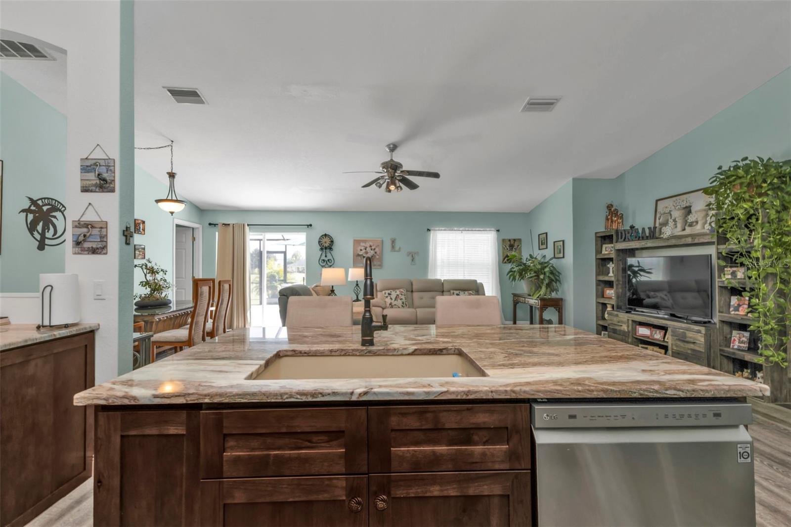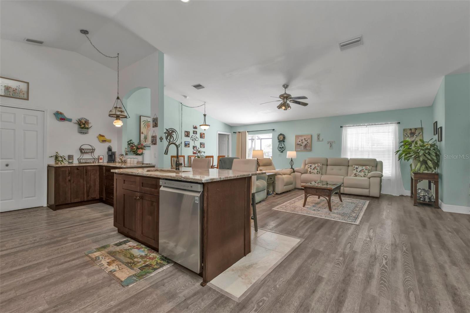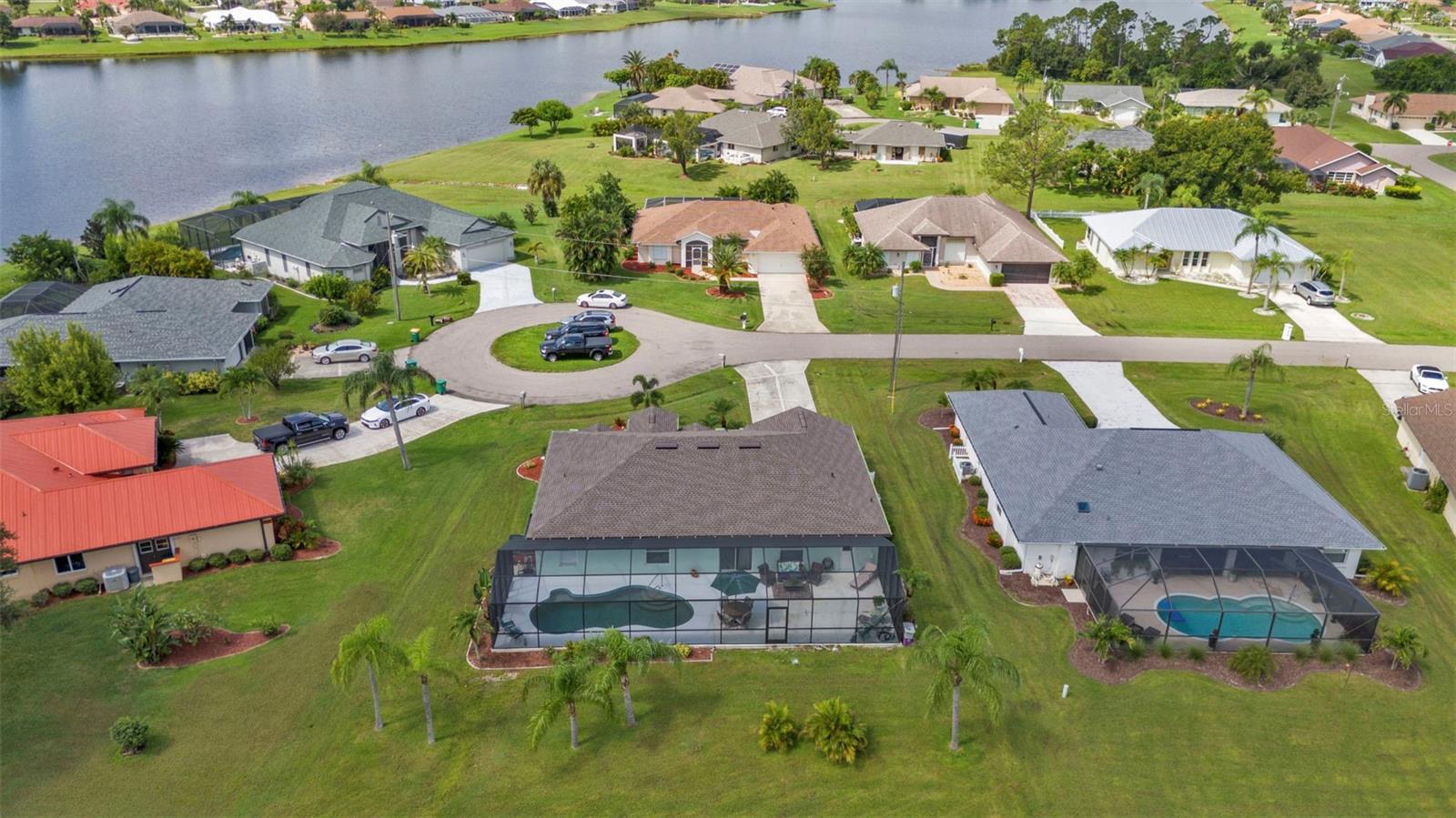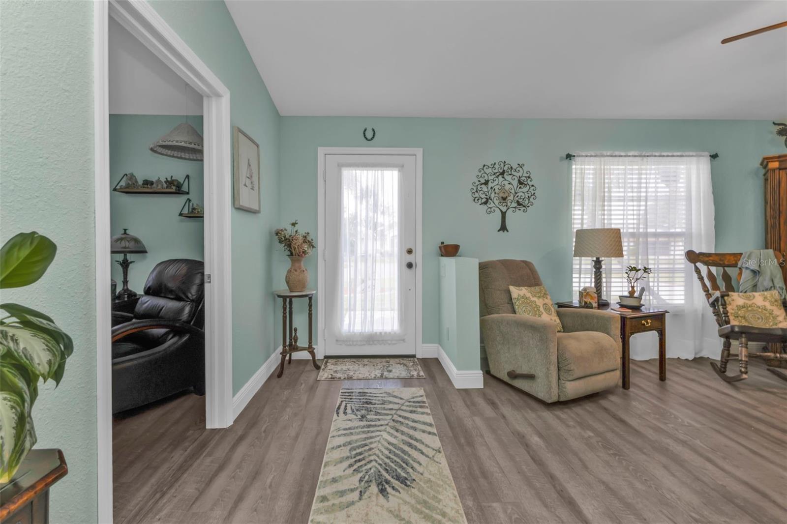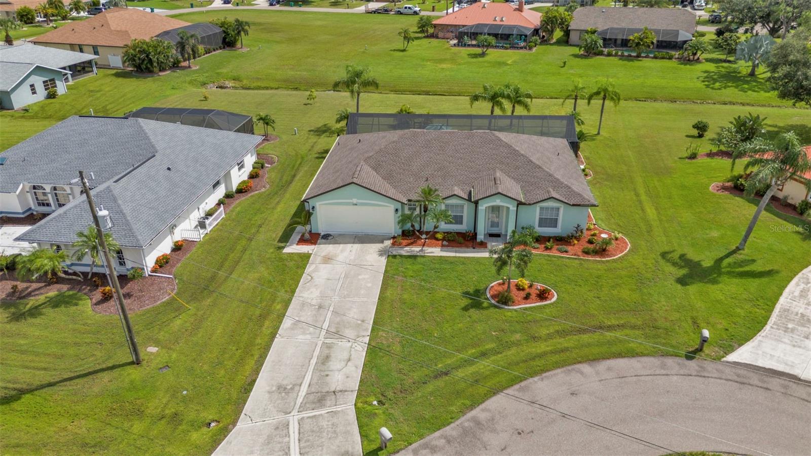 This charming residence offers 3 bedrooms plus a versatile den (or 4th bedroom) and is perfectly situated in a serene cul-de-sac. The kitchen has been beautifully remodeled with granite counters, soft-close cabinets, and a spacious pantry. Enjoy modern amenities including newer Stainless Steel appliances, a tile backsplash, and an island that seamlessly connects to the living and dining areas. An additional corner bar/coffee/wine area enhances your entertaining and storage options. The home features a thoughtful split floor plan. The guest bath has been updated with a new vanity, new fixtures, and a newly tiled shower. The expansive master bedroom (19x13) boasts windows overlooking the pool area and a generous walk-in closet. The master bath has been newly upgraded with dual sinks, modern lighting fixtures, a brand-new shower with floating shelves and a bench seat, and a convenient cabana door leading to the pool area. Additional highlights include a new A/C system (2022), a new roof (2023), and fresh interior and exterior paint. The pool deck, which spans 64 feet across the back of the home, offers ample space for relaxation and entertainment. The pool has been resurfaced, and the enclosure was just installed in August 2024. The exterior features fresh mulch, mature, trimmed landscaping, and a sprinkler system. Located in a NON-flood zone and just off the lake, this home combines style, comfort, and practicality. New hurricane shutters just ordered. BONUS .................To VA buyers......this home has an assumable % rate of 2.65. Don’t miss out on this stunning property!
