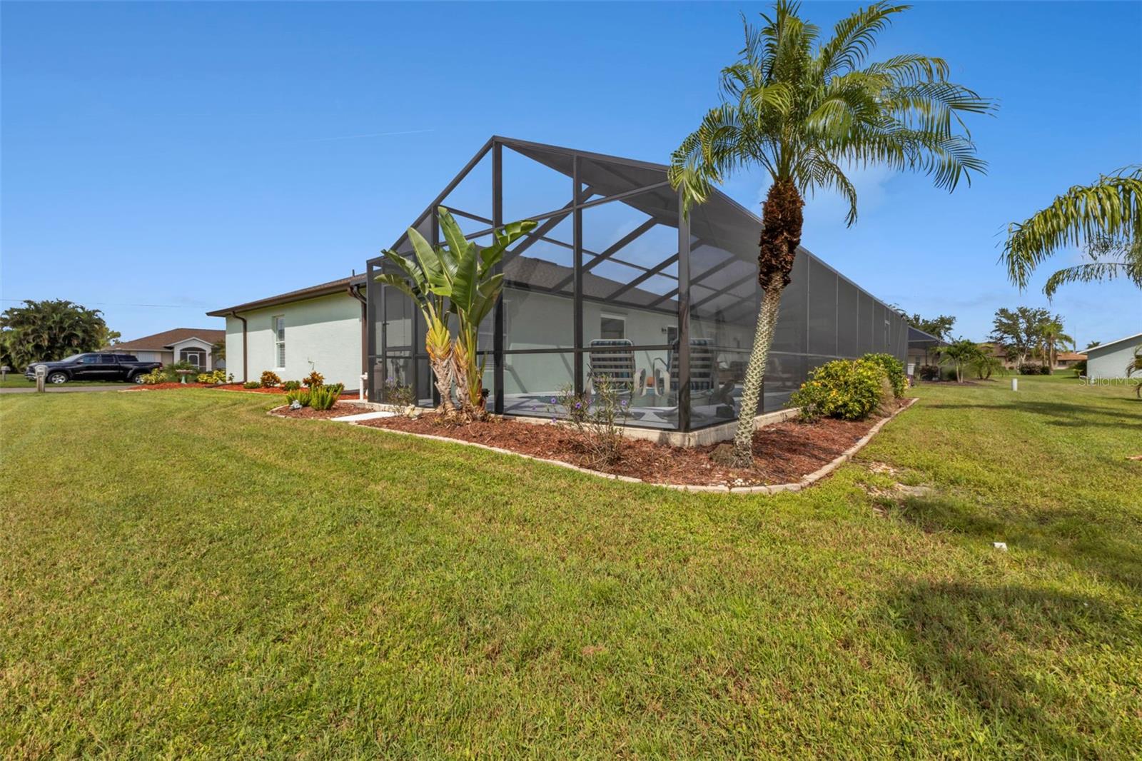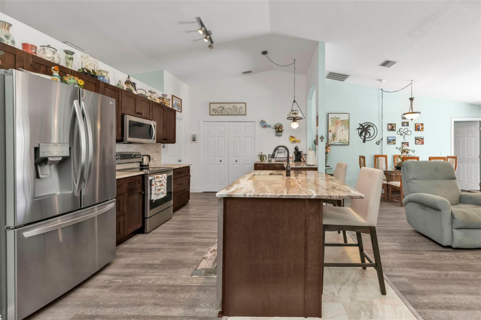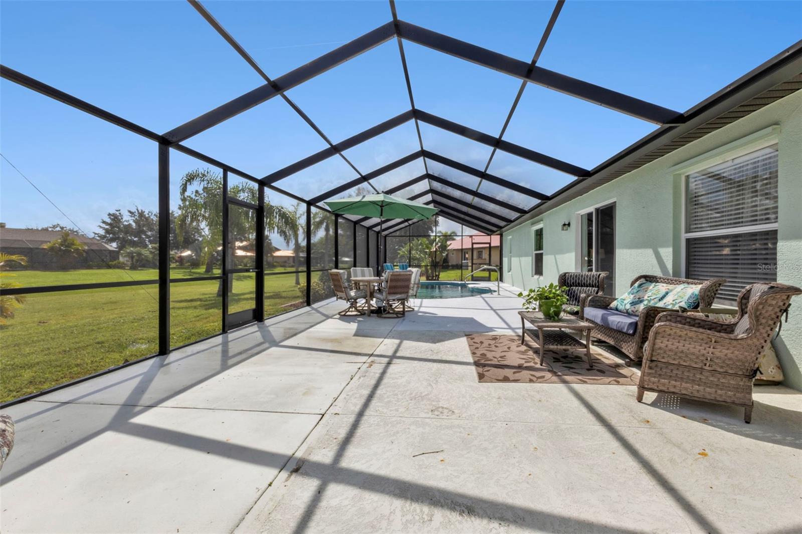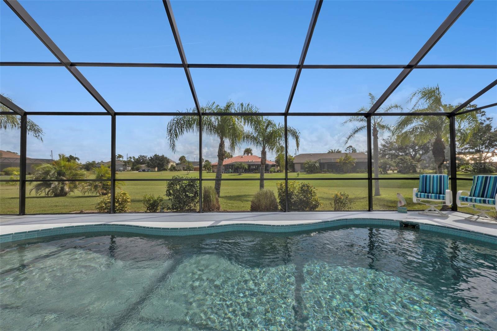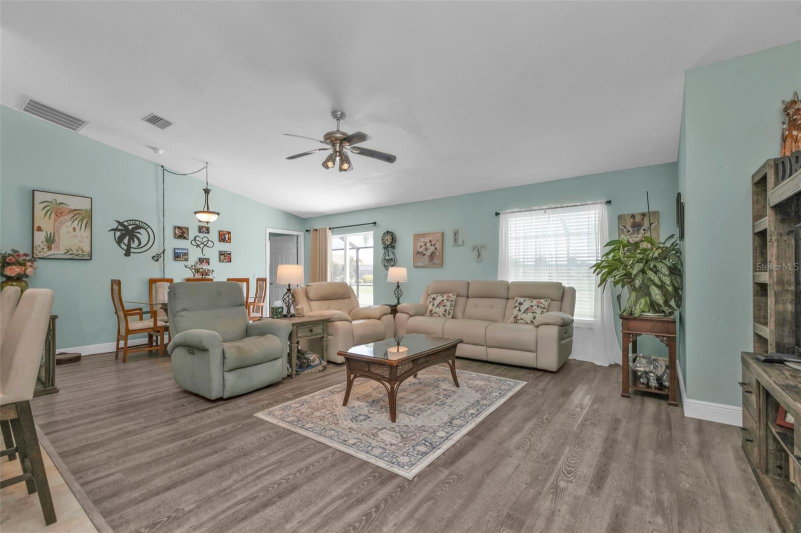This charming residence offers 3 bedrooms plus a versatile den (or 4th bedroom) and is perfectly situated in a serene cul-de-sac. The kitchen has been beautifully remodeled with granite counters, soft-close cabinets, and a spacious pantry. Enjoy modern amenities including newer Stainless Steel appliances, a tile backsplash, and an island that seamlessly connects to the living and dining areas. An additional corner bar/coffee/wine area enhances your entertaining and storage options. The home features a thoughtful split floor plan. The guest bath has been updated with a new vanity, new fixtures, and a newly tiled shower. The expansive master bedroom (19x13) boasts windows overlooking the pool area and a generous walk-in closet. The master bath has been newly upgraded with dual sinks, modern lighting fixtures, a brand-new shower with floating shelves and a bench seat, and a convenient cabana door leading to the pool area. Additional highlights include a new A/C system (2022), a new roof (2023), and fresh interior and exterior paint. The pool deck, which spans 64 feet across the back of the home, offers ample space for relaxation and entertainment. The pool has been resurfaced, and the enclosure was just installed in August 2024. The exterior features fresh mulch, mature, trimmed landscaping, and a sprinkler system. Located in a NON-flood zone and just off the lake, this home combines style, comfort, and practicality. New hurricane shutters just ordered. BONUS .................To VA buyers......this home has an assumable % rate of 2.65. Don’t miss out on this stunning property!