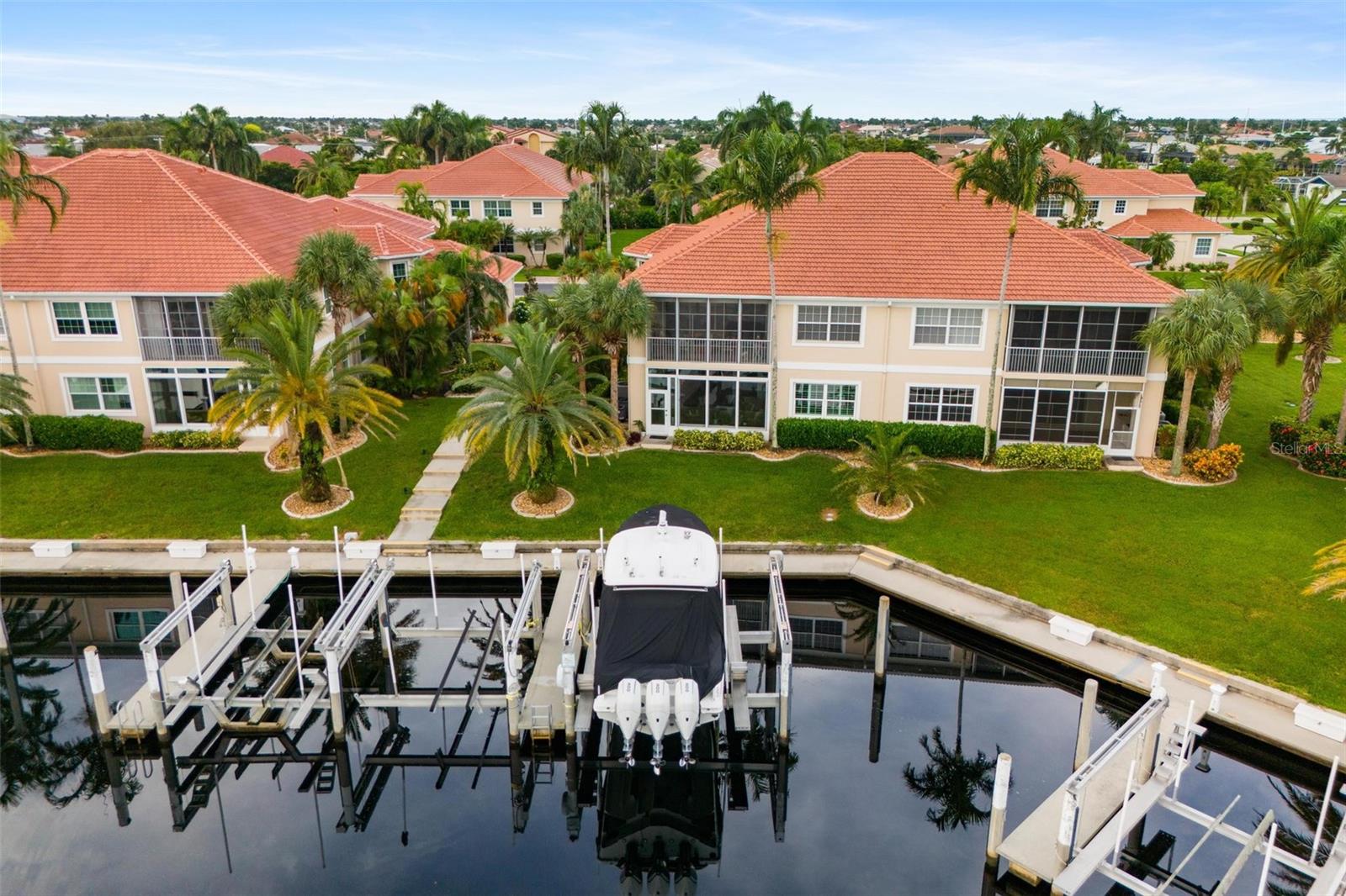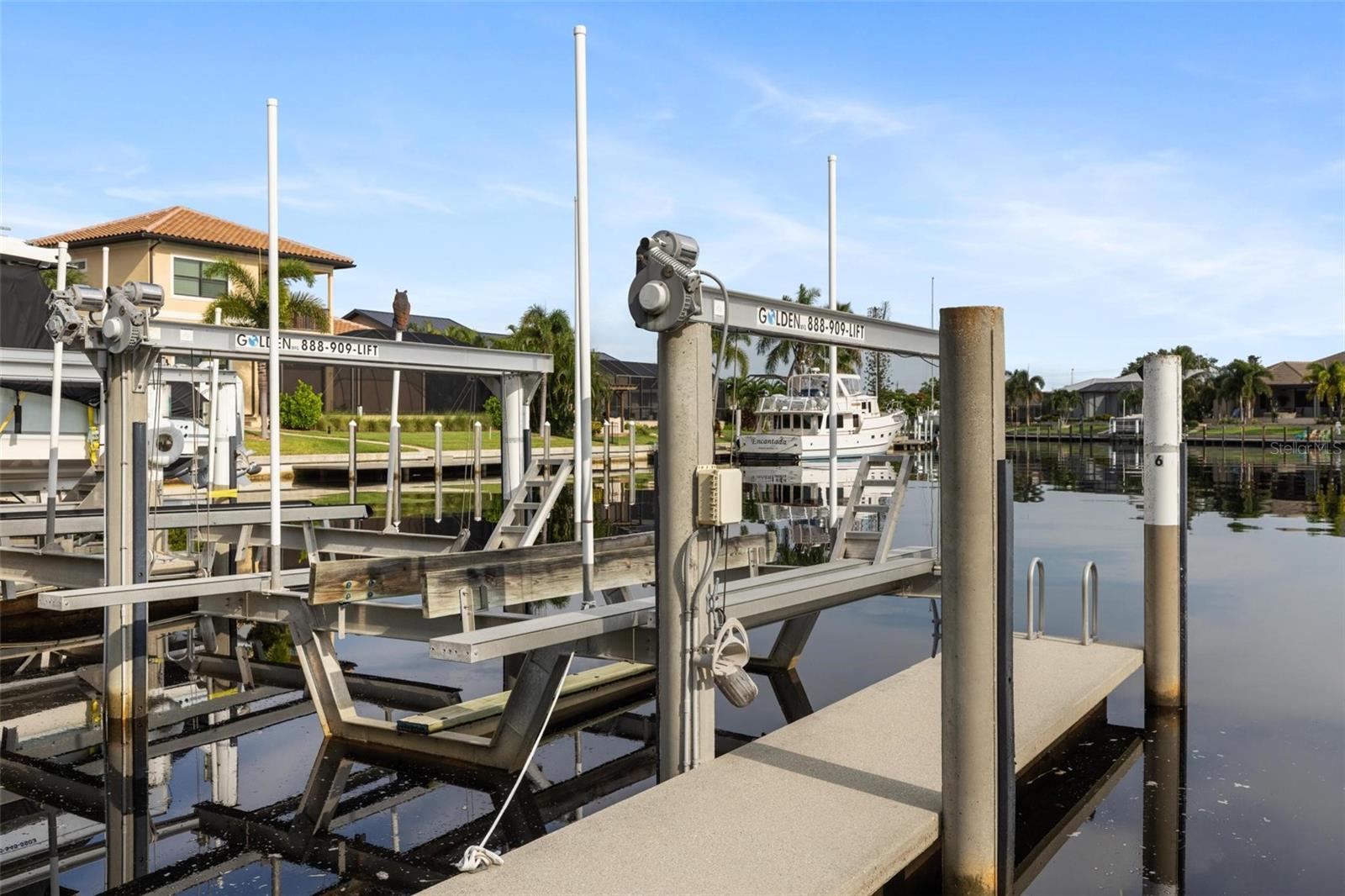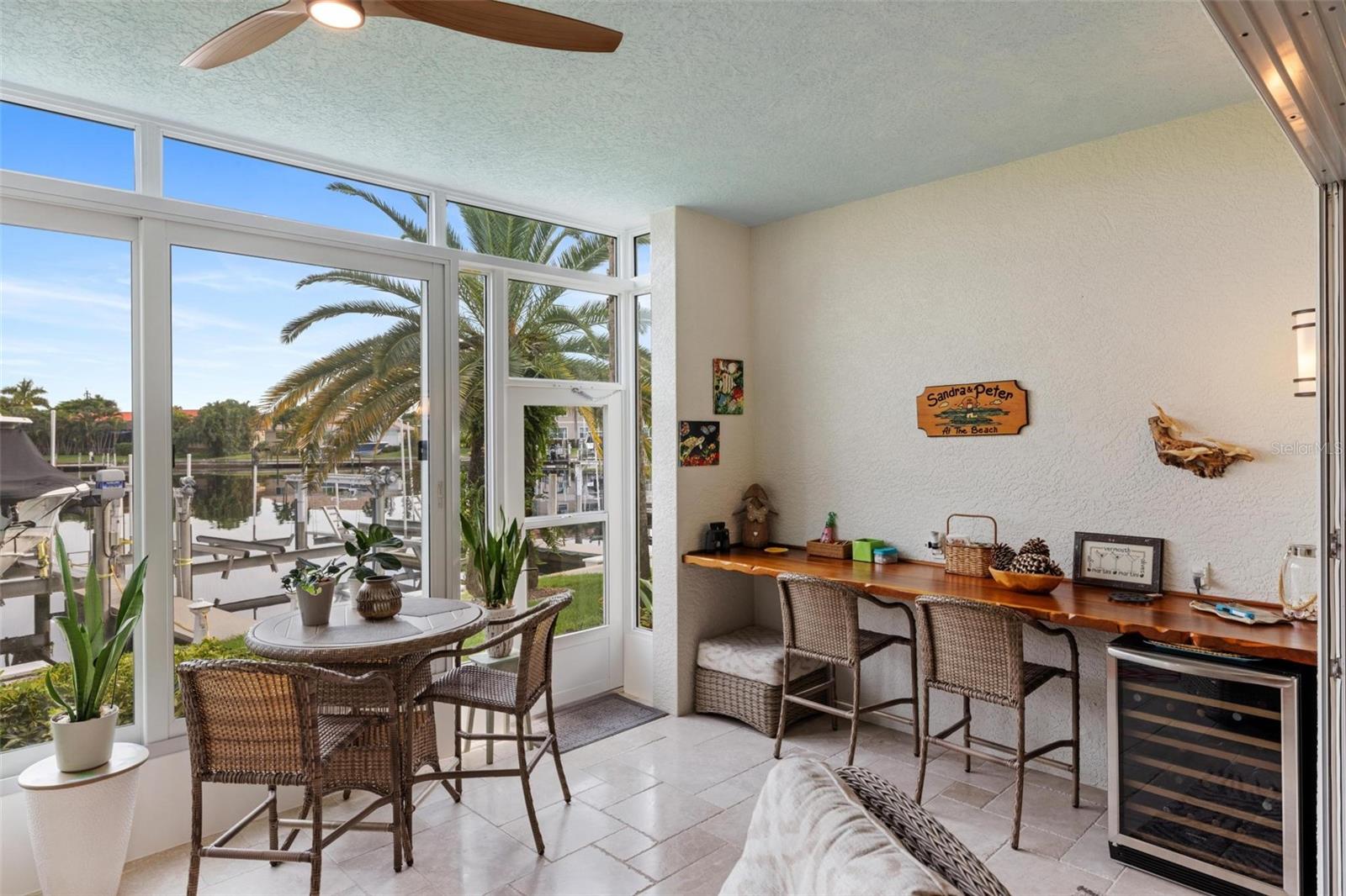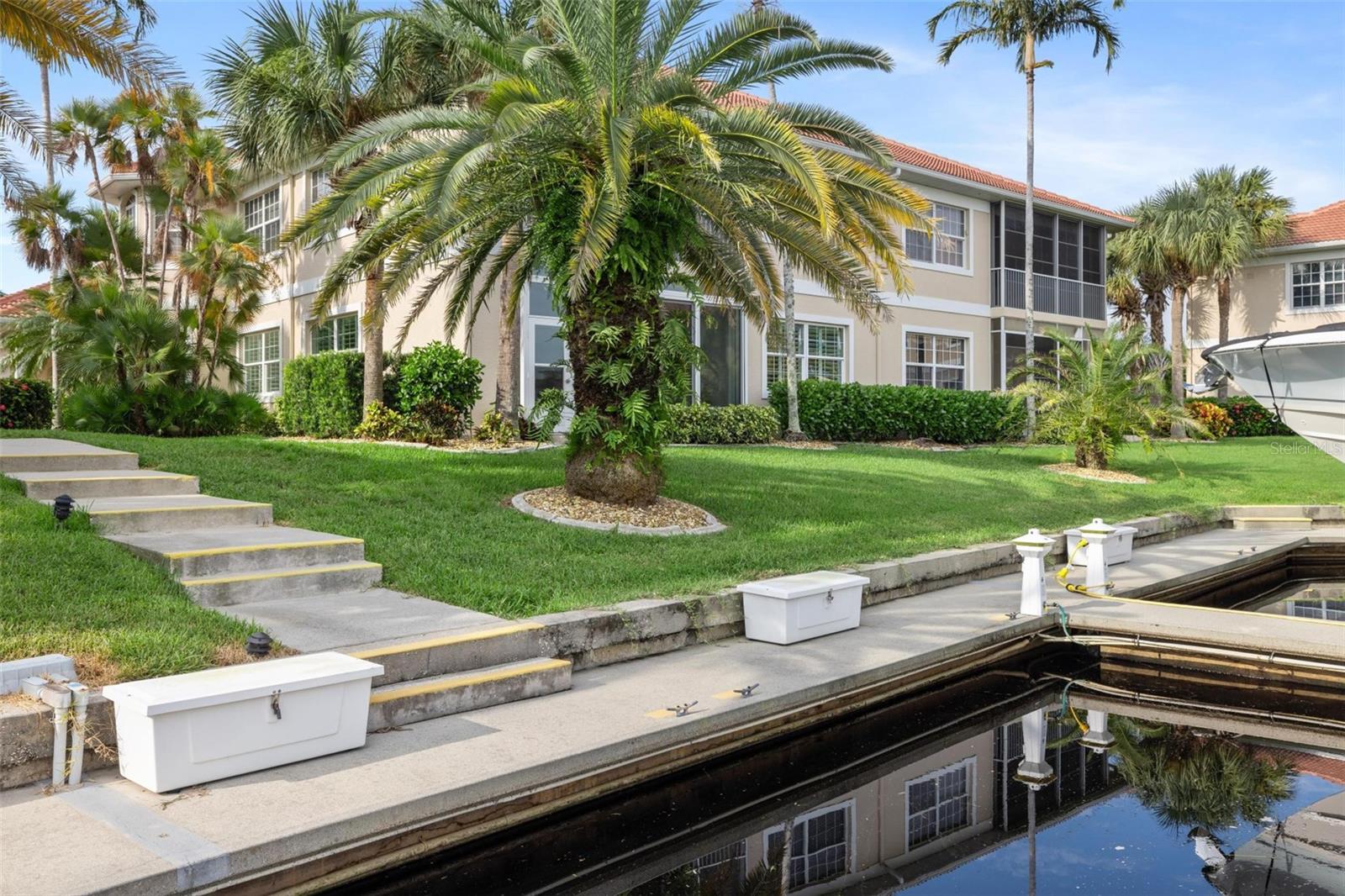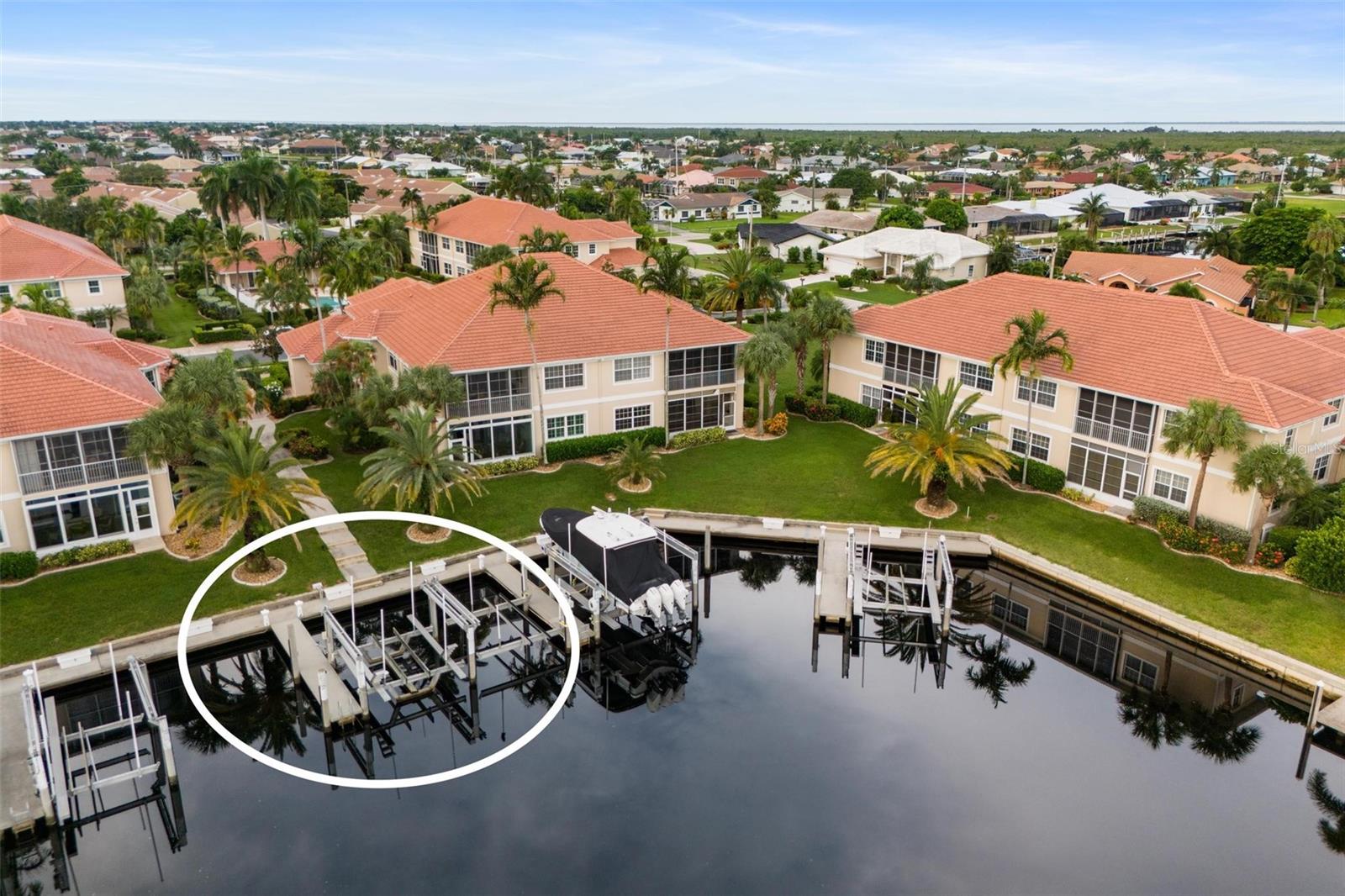 Impeccable ground floor waterfront condo with a deeded dock and 10,000 lb boat lift is a must see! This contemporary coastal inspired condo is located on the canal basin just steps from your deeded dock and the pool/clubhouse. No bridges and quick access to harbor! Strategically designed to maximize the water and lush landscape views with 10' ceilings, 8' doors and large windows throughout makes the home light and bright, but not overwhelming thanks to nearly every window facing east and north. A welcoming paved walkway with lush landscaping leads you to the front porch with beautiful glass door entry, marble flooring, spacious foyer with a large entry walk-in closet and art niche to greet you. A den/study that can double as an office or guest space (no closet) is very light and welcoming with glass french doors, warm wood flooring and a large window. You can also host overnight guests in the spacious guest bedroom located off of a shared hallway with a guest bathroom and laundry room, featuring a pocketing door at the hall entry that closes creating an en-suite feel. The large laundry room has a walk-in pantry style storage area with built in shelving rarely seen in condominiums. The kitchen is absolutely stunning, with Cambria quartz counters, custom wood cabinetry featuring pantry storage, pocketing storage and contemporary hardware. The high-end stainless steel appliances and the induction cooktop with custom hood are complimented by a custom iridescent mosaic backsplash The intelligent design of the kitchen offers seating at the breakfast bar, or in the kitchen nook nestled in a bay window created space, surrounded by stunning views. The exotic wood flooring enhances the upscale feel of this space. As you enter the main living area, you will be enchanted by the wall of windows showcasing the waterfront and the tropical landscaping. The open concept design of this area is perfect for entertaining large groups and allowing flexibility in design to fit your style. A wall of sliding hurricane impact doors leads to the lanai area, which features a custom wooden table/bar that is a textural delight, seats 3-4 adults and extends the entire width of the wall...a great place to have evening drinks after a day on the boat! Abundant seating on the lanai makes this feel like another living space, with the benefit of an unobstructed view of the docks, including yours! The lanai is enclosed, but has sliding windows to allow the breezes inside. The master bedroom is canal front with a large window and is very spacious, the current owners have a king sized bed and other furniture with plenty of space to spare. Large walk-in closet and an en-suite bathroom makes this space so functional and private. This condo has been meticulously maintained and beautifully upgraded throughout, it is hard to find a combination of large rooms, abundant storage, 2 car oversized garage and a deeded boat dock with lift right outside your door when you are looking at condominiums, which makes this a unique opportunity for you. The Tarpon Cove Condominium community is professionally managed and beautifully maintained with a clubhouse, heated pool and spa, fitness area, and guest parking. The docks are 30'concrete and have a dock box, water and electric pedestals. Another unique feature is that this dock space #5 can accommodate a boat up to 38 feet in length. Oversized garage has abundant shelving and elevated ceilings as well as a large window.