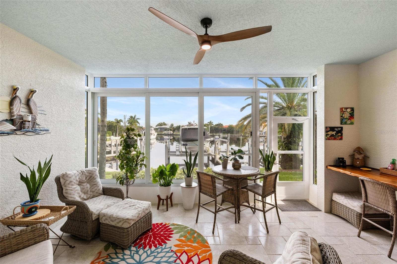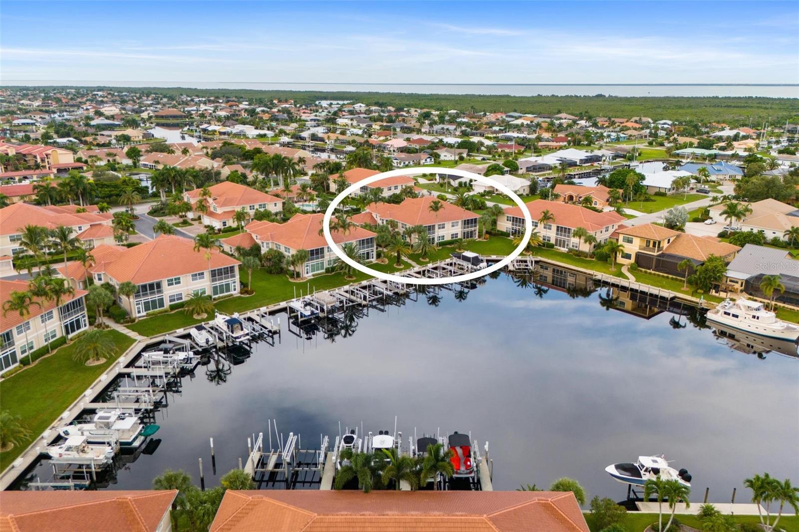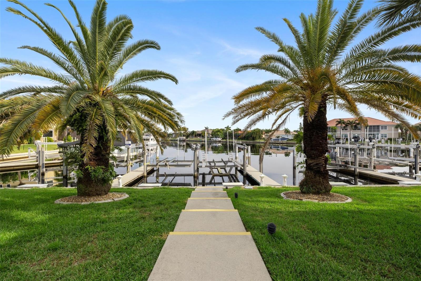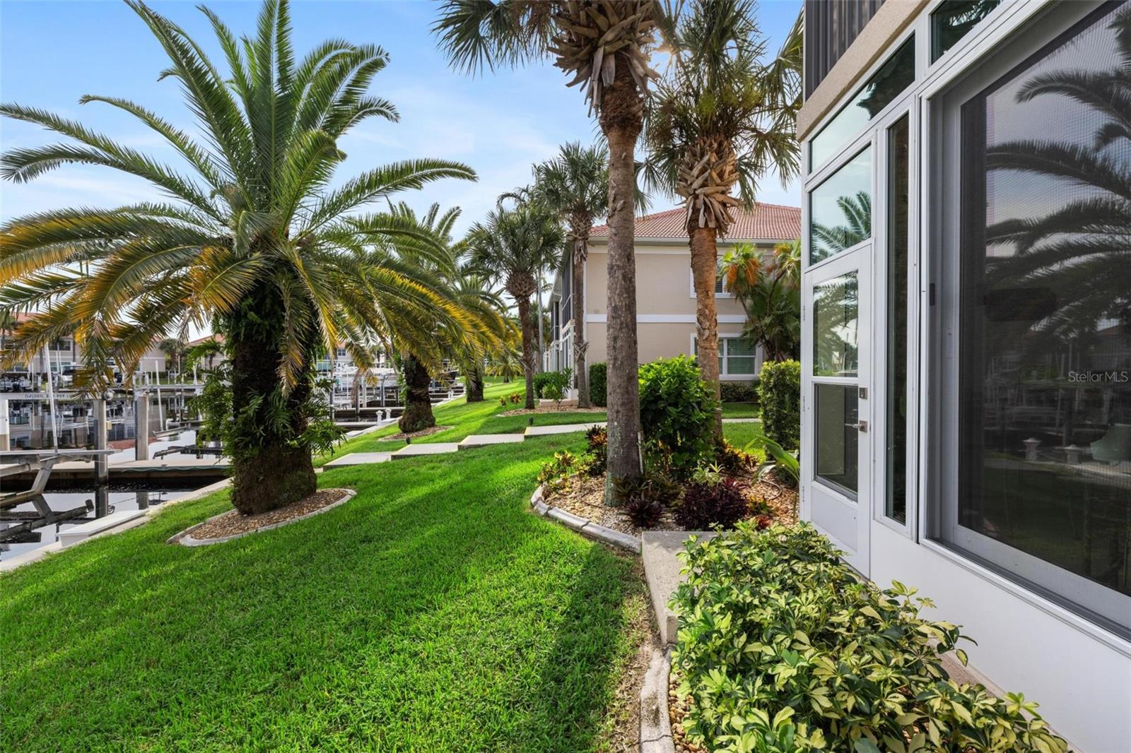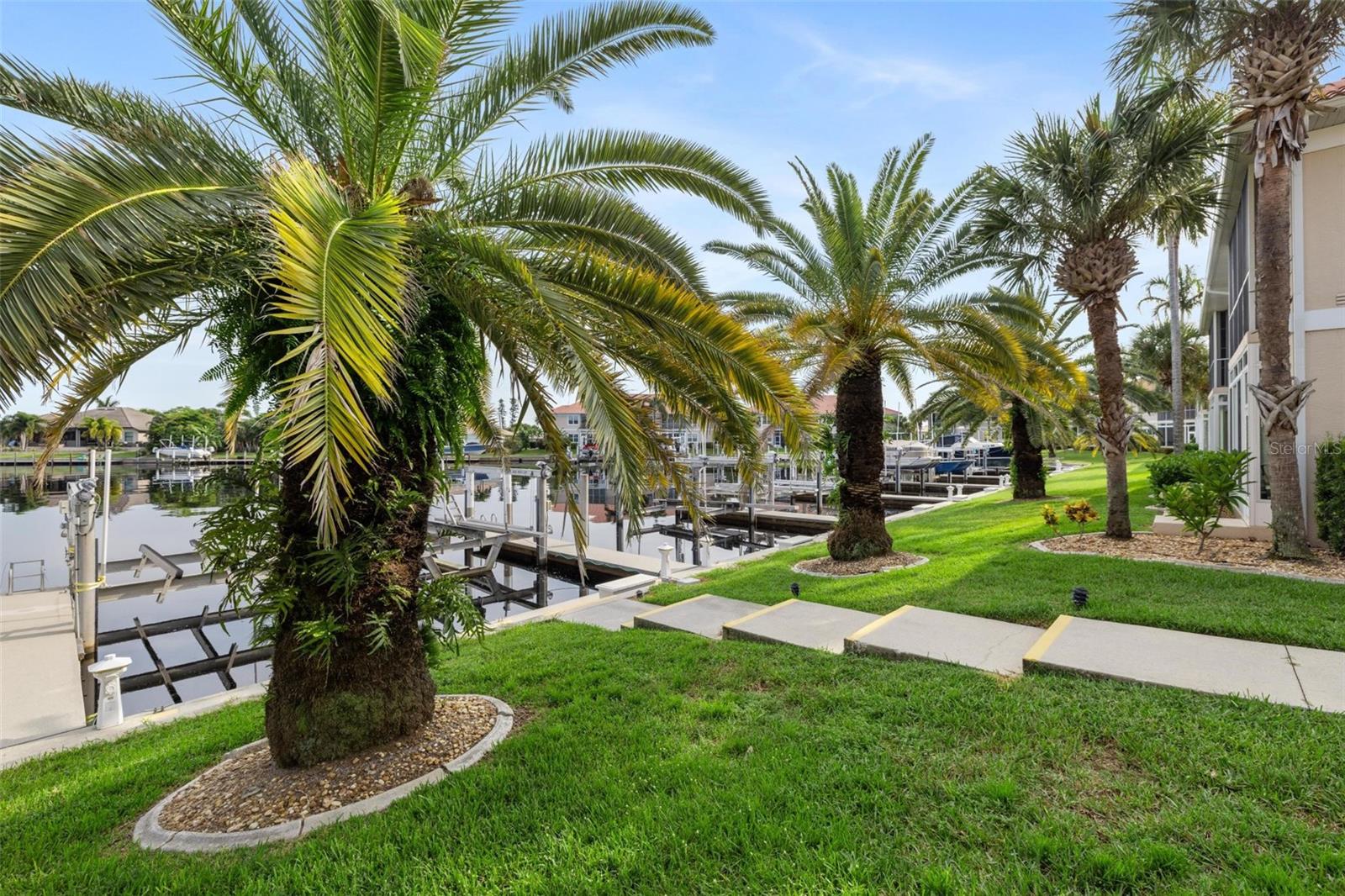 Impeccable ground floor waterfront condo with a deeded dock and 10,000 lb boat lift is a must see! This contemporary coastal inspired condo is located on the canal basin just steps from your deeded dock and the pool/clubhouse. No bridges and quick access to harbor! Strategically designed to maximize the water and lush landscape views with 10' ceilings, 8' doors and large windows throughout makes the home light and bright, but not overwhelming thanks to nearly every window facing east and north. A welcoming paved walkway with lush landscaping leads you to the front porch with beautiful glass door entry, marble flooring, spacious foyer with a large entry walk-in closet and art niche to greet you. A den/study that can double as an office or guest space (no closet) is very light and welcoming with glass french doors, warm wood flooring and a large window. You can also host overnight guests in the spacious guest bedroom located off of a shared hallway with a guest bathroom and laundry room, featuring a pocketing door at the hall entry that closes creating an en-suite feel. The large laundry room has a walk-in pantry style storage area with built in shelving rarely seen in condominiums. The kitchen is absolutely stunning, with Cambria quartz counters, custom wood cabinetry featuring pantry storage, pocketing storage and contemporary hardware. The high-end stainless steel appliances and the induction cooktop with custom hood are complimented by a custom iridescent mosaic backsplash The intelligent design of the kitchen offers seating at the breakfast bar, or in the kitchen nook nestled in a bay window created space, surrounded by stunning views. The exotic wood flooring enhances the upscale feel of this space. As you enter the main living area, you will be enchanted by the wall of windows showcasing the waterfront and the tropical landscaping. The open concept design of this area is perfect for entertaining large groups and allowing flexibility in design to fit your style. A wall of sliding hurricane impact doors leads to the lanai area, which features a custom wooden table/bar that is a textural delight, seats 3-4 adults and extends the entire width of the wall...a great place to have evening drinks after a day on the boat! Abundant seating on the lanai makes this feel like another living space, with the benefit of an unobstructed view of the docks, including yours! The lanai is enclosed, but has sliding windows to allow the breezes inside. The master bedroom is canal front with a large window and is very spacious, the current owners have a king sized bed and other furniture with plenty of space to spare. Large walk-in closet and an en-suite bathroom makes this space so functional and private. This condo has been meticulously maintained and beautifully upgraded throughout, it is hard to find a combination of large rooms, abundant storage, 2 car oversized garage and a deeded boat dock with lift right outside your door when you are looking at condominiums, which makes this a unique opportunity for you. The Tarpon Cove Condominium community is professionally managed and beautifully maintained with a clubhouse, heated pool and spa, fitness area, and guest parking. The docks are 30'concrete and have a dock box, water and electric pedestals. Another unique feature is that this dock space #5 can accommodate a boat up to 38 feet in length. Oversized garage has abundant shelving and elevated ceilings as well as a large window.