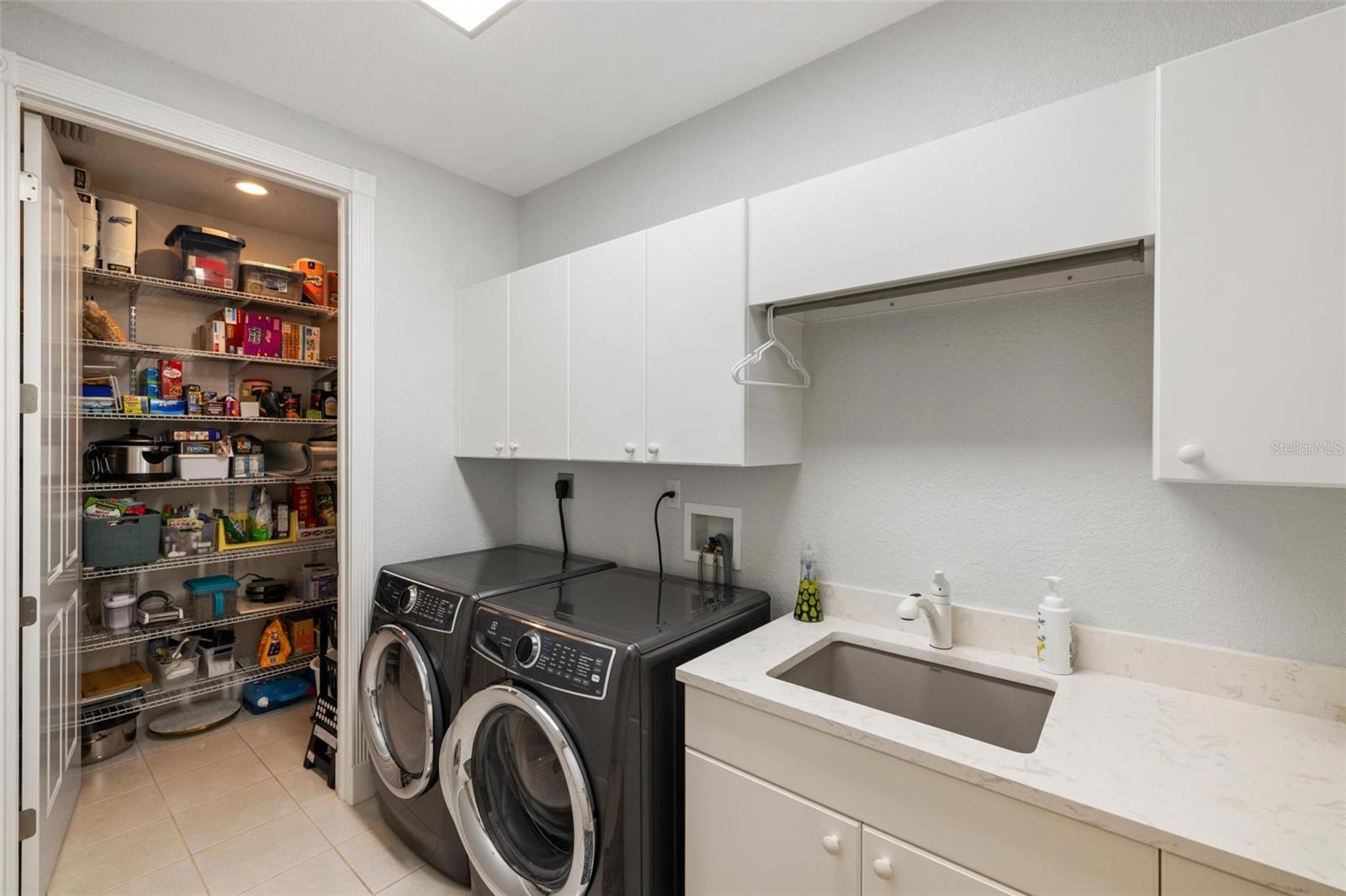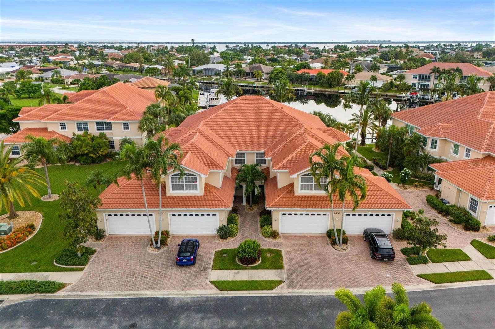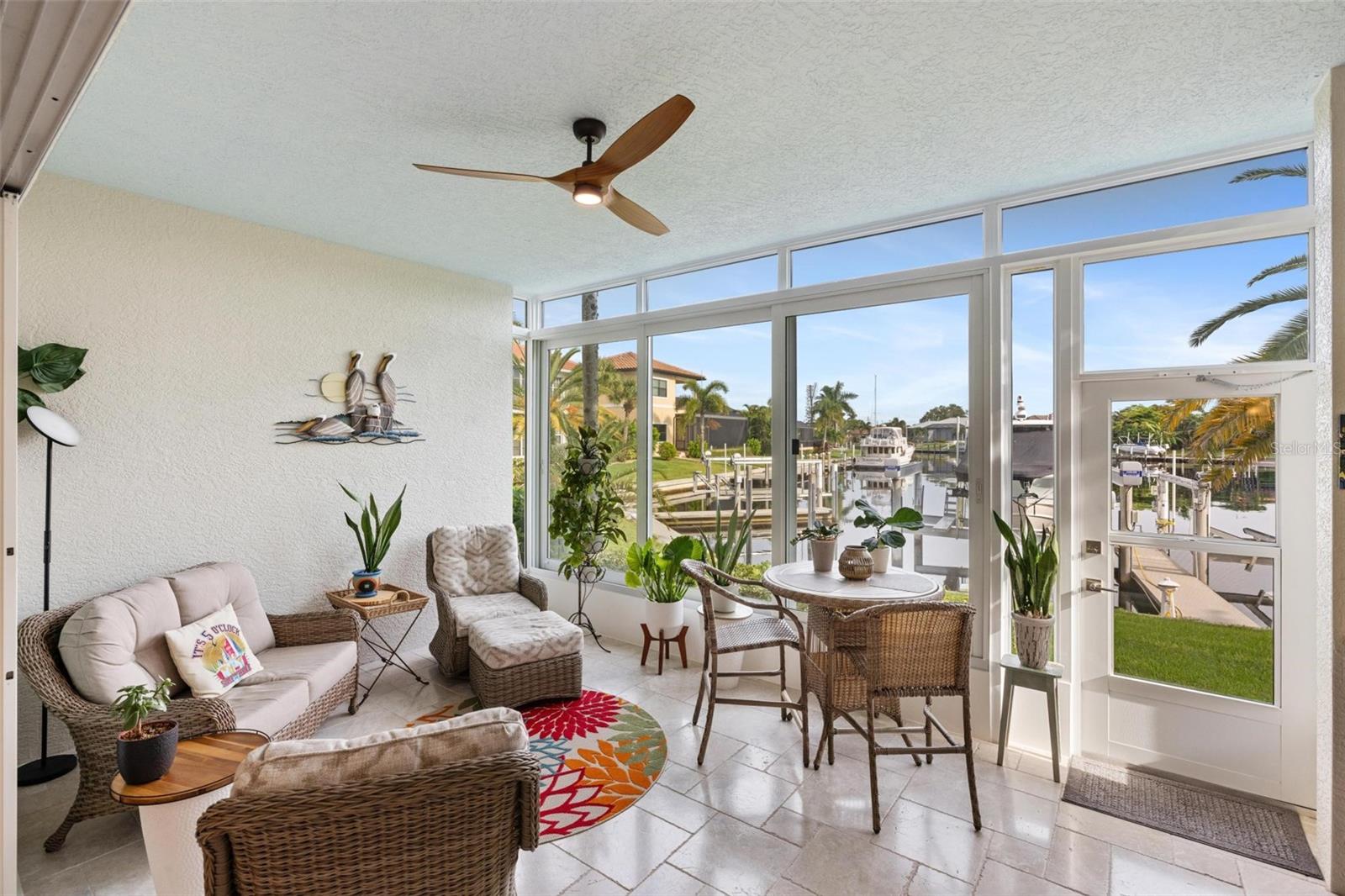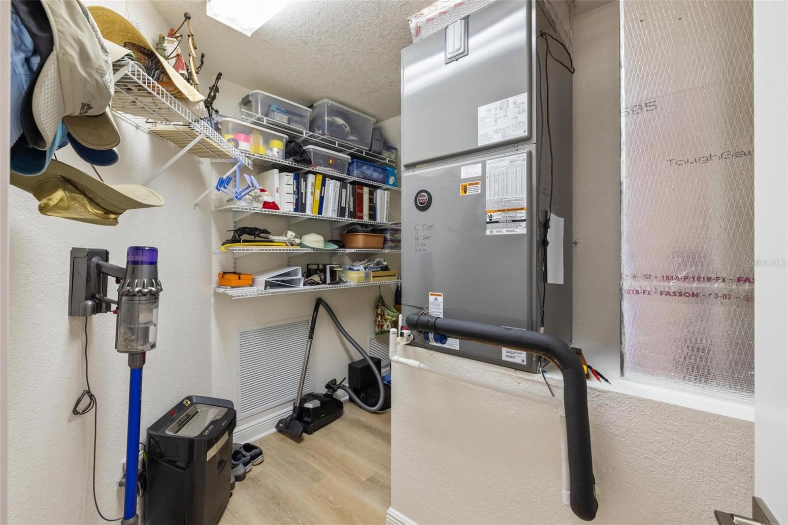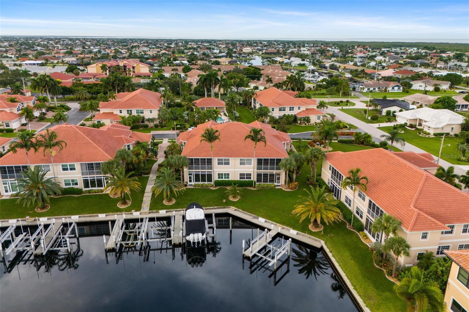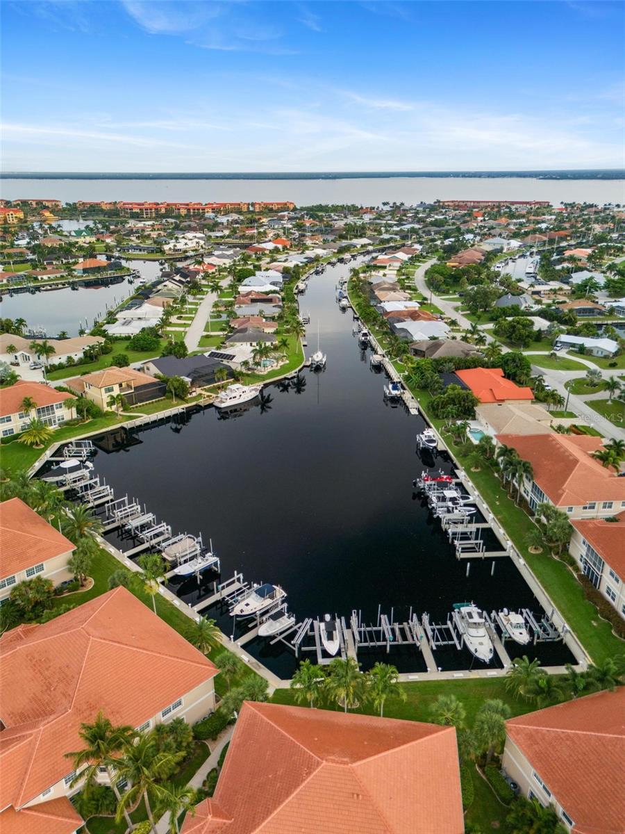 Impeccable ground floor waterfront condo with a deeded dock and 10,000 lb boat lift is a must see! This contemporary coastal inspired condo is located on the canal basin just steps from your deeded dock and the pool/clubhouse. No bridges and quick access to harbor! Strategically designed to maximize the water and lush landscape views with 10' ceilings, 8' doors and large windows throughout makes the home light and bright, but not overwhelming thanks to nearly every window facing east and north. A welcoming paved walkway with lush landscaping leads you to the front porch with beautiful glass door entry, marble flooring, spacious foyer with a large entry walk-in closet and art niche to greet you. A den/study that can double as an office or guest space (no closet) is very light and welcoming with glass french doors, warm wood flooring and a large window. You can also host overnight guests in the spacious guest bedroom located off of a shared hallway with a guest bathroom and laundry room, featuring a pocketing door at the hall entry that closes creating an en-suite feel. The large laundry room has a walk-in pantry style storage area with built in shelving rarely seen in condominiums. The kitchen is absolutely stunning, with Cambria quartz counters, custom wood cabinetry featuring pantry storage, pocketing storage and contemporary hardware. The high-end stainless steel appliances and the induction cooktop with custom hood are complimented by a custom iridescent mosaic backsplash The intelligent design of the kitchen offers seating at the breakfast bar, or in the kitchen nook nestled in a bay window created space, surrounded by stunning views. The exotic wood flooring enhances the upscale feel of this space. As you enter the main living area, you will be enchanted by the wall of windows showcasing the waterfront and the tropical landscaping. The open concept design of this area is perfect for entertaining large groups and allowing flexibility in design to fit your style. A wall of sliding hurricane impact doors leads to the lanai area, which features a custom wooden table/bar that is a textural delight, seats 3-4 adults and extends the entire width of the wall...a great place to have evening drinks after a day on the boat! Abundant seating on the lanai makes this feel like another living space, with the benefit of an unobstructed view of the docks, including yours! The lanai is enclosed, but has sliding windows to allow the breezes inside. The master bedroom is canal front with a large window and is very spacious, the current owners have a king sized bed and other furniture with plenty of space to spare. Large walk-in closet and an en-suite bathroom makes this space so functional and private. This condo has been meticulously maintained and beautifully upgraded throughout, it is hard to find a combination of large rooms, abundant storage, 2 car oversized garage and a deeded boat dock with lift right outside your door when you are looking at condominiums, which makes this a unique opportunity for you. The Tarpon Cove Condominium community is professionally managed and beautifully maintained with a clubhouse, heated pool and spa, fitness area, and guest parking. The docks are 30'concrete and have a dock box, water and electric pedestals. Another unique feature is that this dock space #5 can accommodate a boat up to 38 feet in length. Oversized garage has abundant shelving and elevated ceilings as well as a large window.
