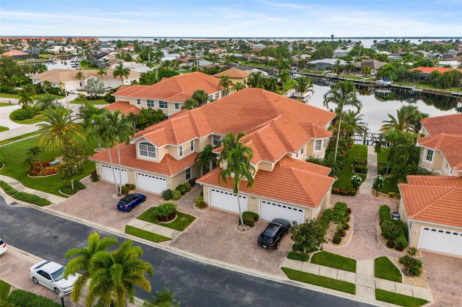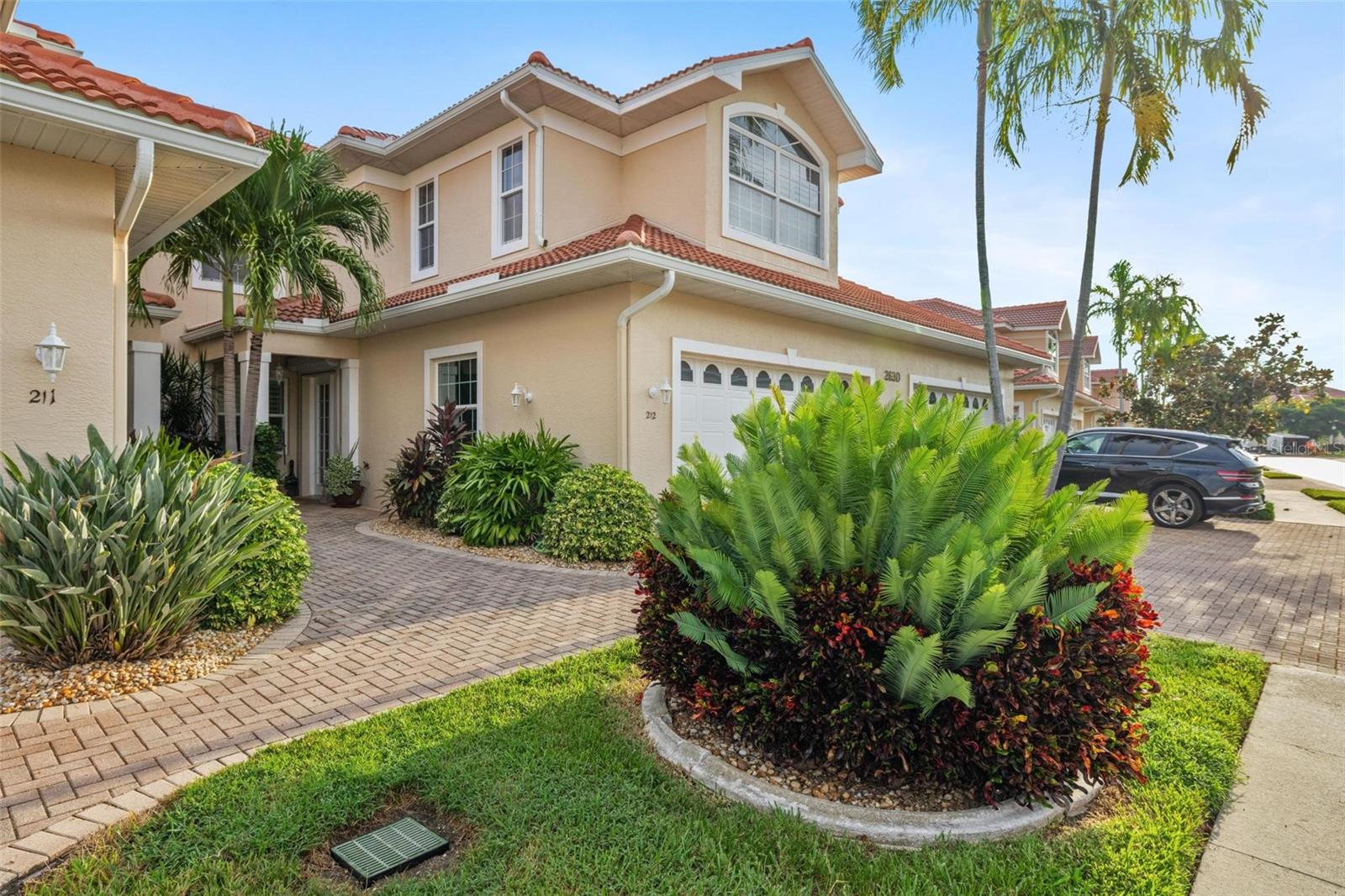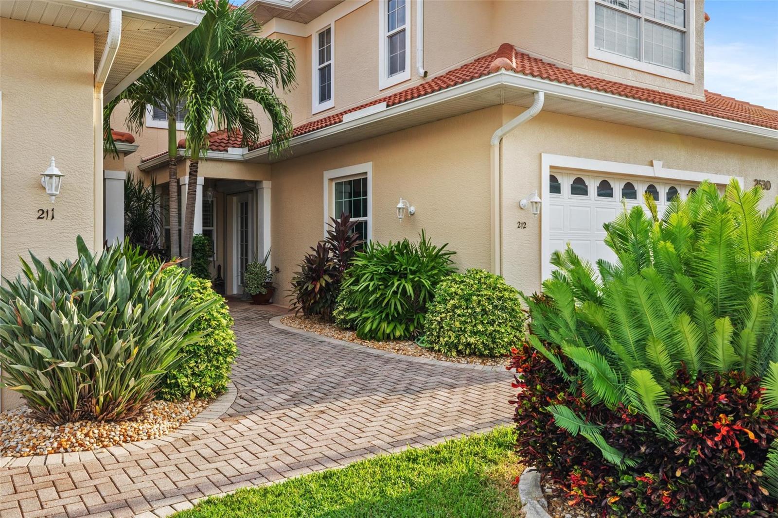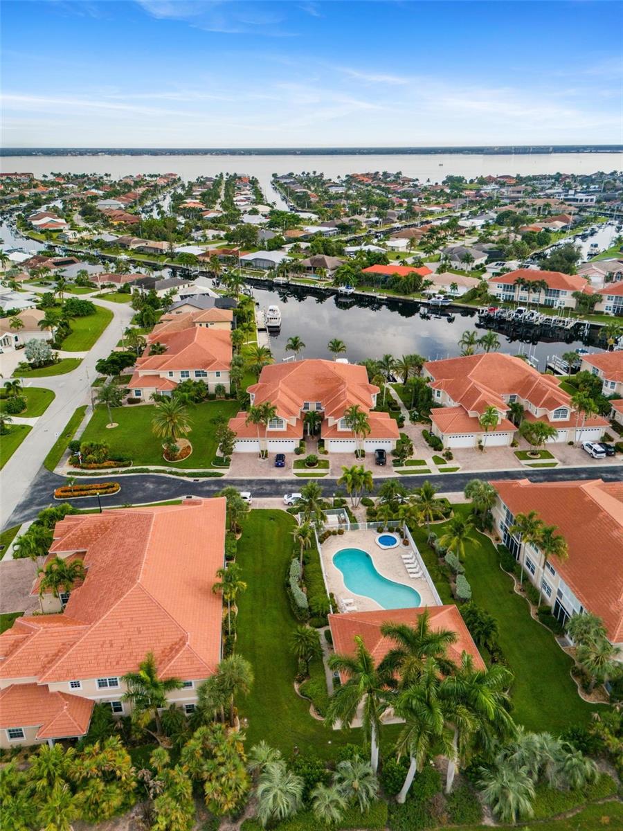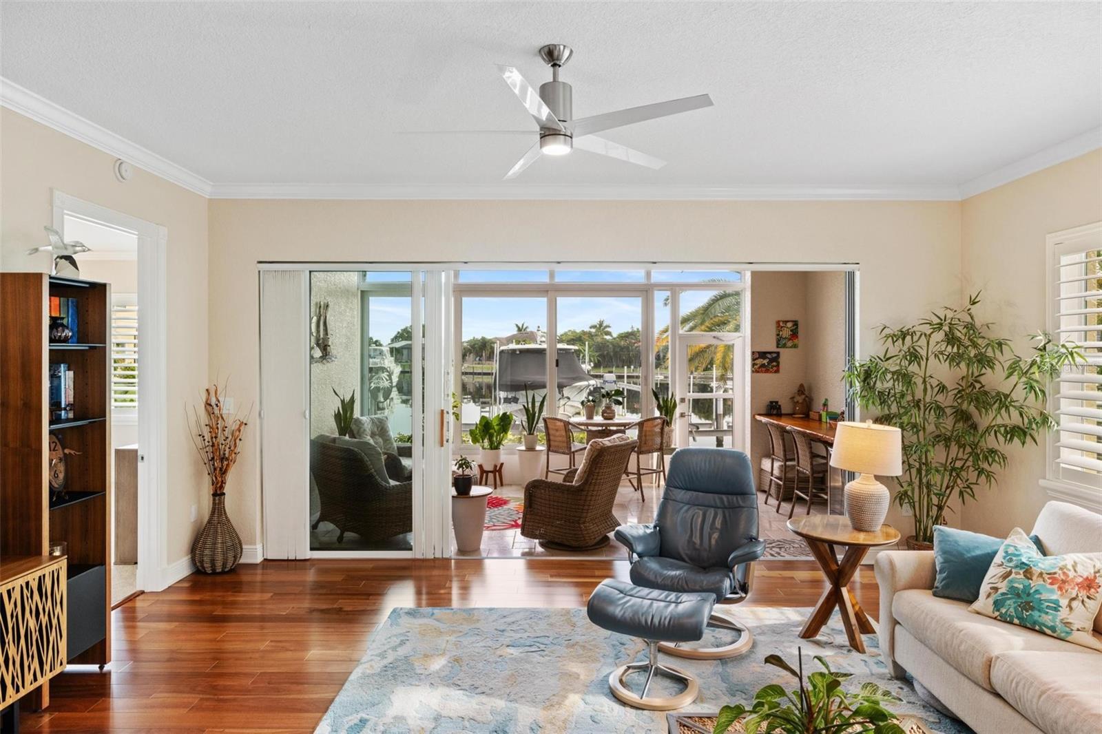 Impeccable ground floor waterfront condo with a deeded dock and 10,000 lb boat lift is a must see! This contemporary coastal inspired condo is located on the canal basin just steps from your deeded dock and the pool/clubhouse. No bridges and quick access to harbor! Strategically designed to maximize the water and lush landscape views with 10' ceilings, 8' doors and large windows throughout makes the home light and bright, but not overwhelming thanks to nearly every window facing east and north. A welcoming paved walkway with lush landscaping leads you to the front porch with beautiful glass door entry, marble flooring, spacious foyer with a large entry walk-in closet and art niche to greet you. A den/study that can double as an office or guest space (no closet) is very light and welcoming with glass french doors, warm wood flooring and a large window. You can also host overnight guests in the spacious guest bedroom located off of a shared hallway with a guest bathroom and laundry room, featuring a pocketing door at the hall entry that closes creating an en-suite feel. The large laundry room has a walk-in pantry style storage area with built in shelving rarely seen in condominiums. The kitchen is absolutely stunning, with Cambria quartz counters, custom wood cabinetry featuring pantry storage, pocketing storage and contemporary hardware. The high-end stainless steel appliances and the induction cooktop with custom hood are complimented by a custom iridescent mosaic backsplash The intelligent design of the kitchen offers seating at the breakfast bar, or in the kitchen nook nestled in a bay window created space, surrounded by stunning views. The exotic wood flooring enhances the upscale feel of this space. As you enter the main living area, you will be enchanted by the wall of windows showcasing the waterfront and the tropical landscaping. The open concept design of this area is perfect for entertaining large groups and allowing flexibility in design to fit your style. A wall of sliding hurricane impact doors leads to the lanai area, which features a custom wooden table/bar that is a textural delight, seats 3-4 adults and extends the entire width of the wall...a great place to have evening drinks after a day on the boat! Abundant seating on the lanai makes this feel like another living space, with the benefit of an unobstructed view of the docks, including yours! The lanai is enclosed, but has sliding windows to allow the breezes inside. The master bedroom is canal front with a large window and is very spacious, the current owners have a king sized bed and other furniture with plenty of space to spare. Large walk-in closet and an en-suite bathroom makes this space so functional and private. This condo has been meticulously maintained and beautifully upgraded throughout, it is hard to find a combination of large rooms, abundant storage, 2 car oversized garage and a deeded boat dock with lift right outside your door when you are looking at condominiums, which makes this a unique opportunity for you. The Tarpon Cove Condominium community is professionally managed and beautifully maintained with a clubhouse, heated pool and spa, fitness area, and guest parking. The docks are 30'concrete and have a dock box, water and electric pedestals. Another unique feature is that this dock space #5 can accommodate a boat up to 38 feet in length. Oversized garage has abundant shelving and elevated ceilings as well as a large window.