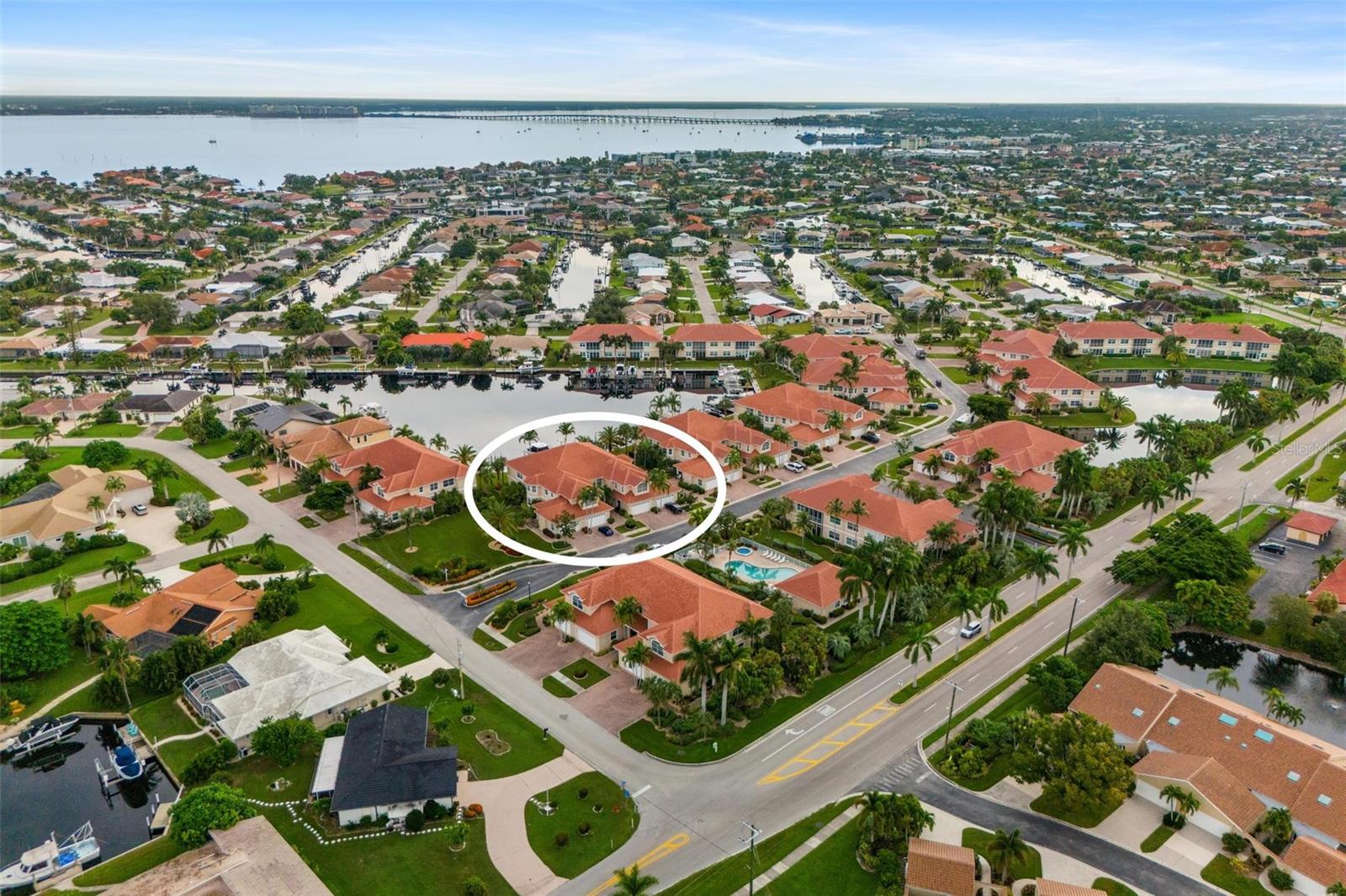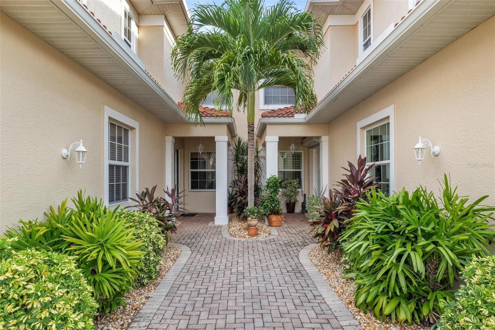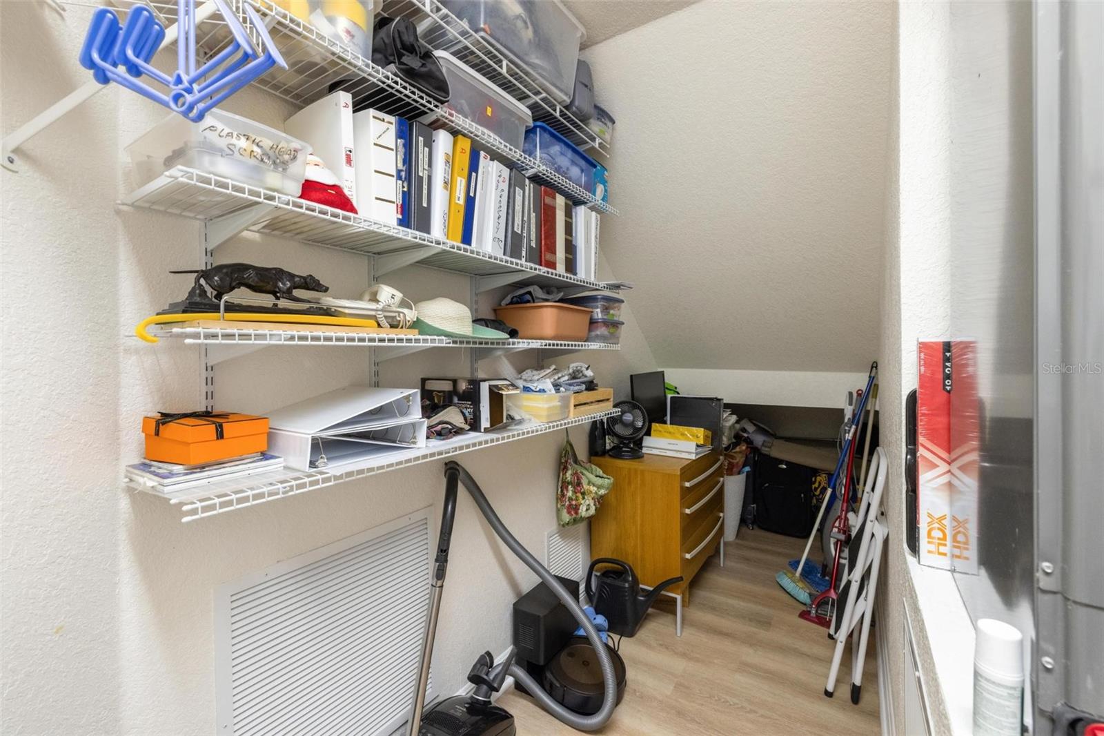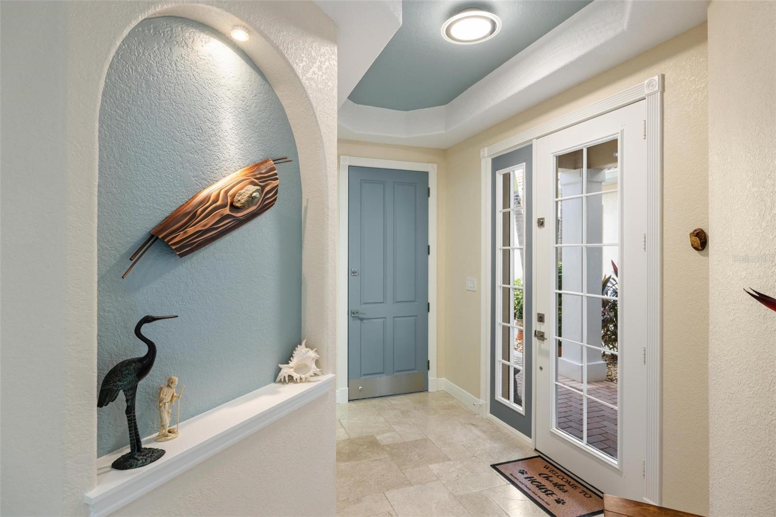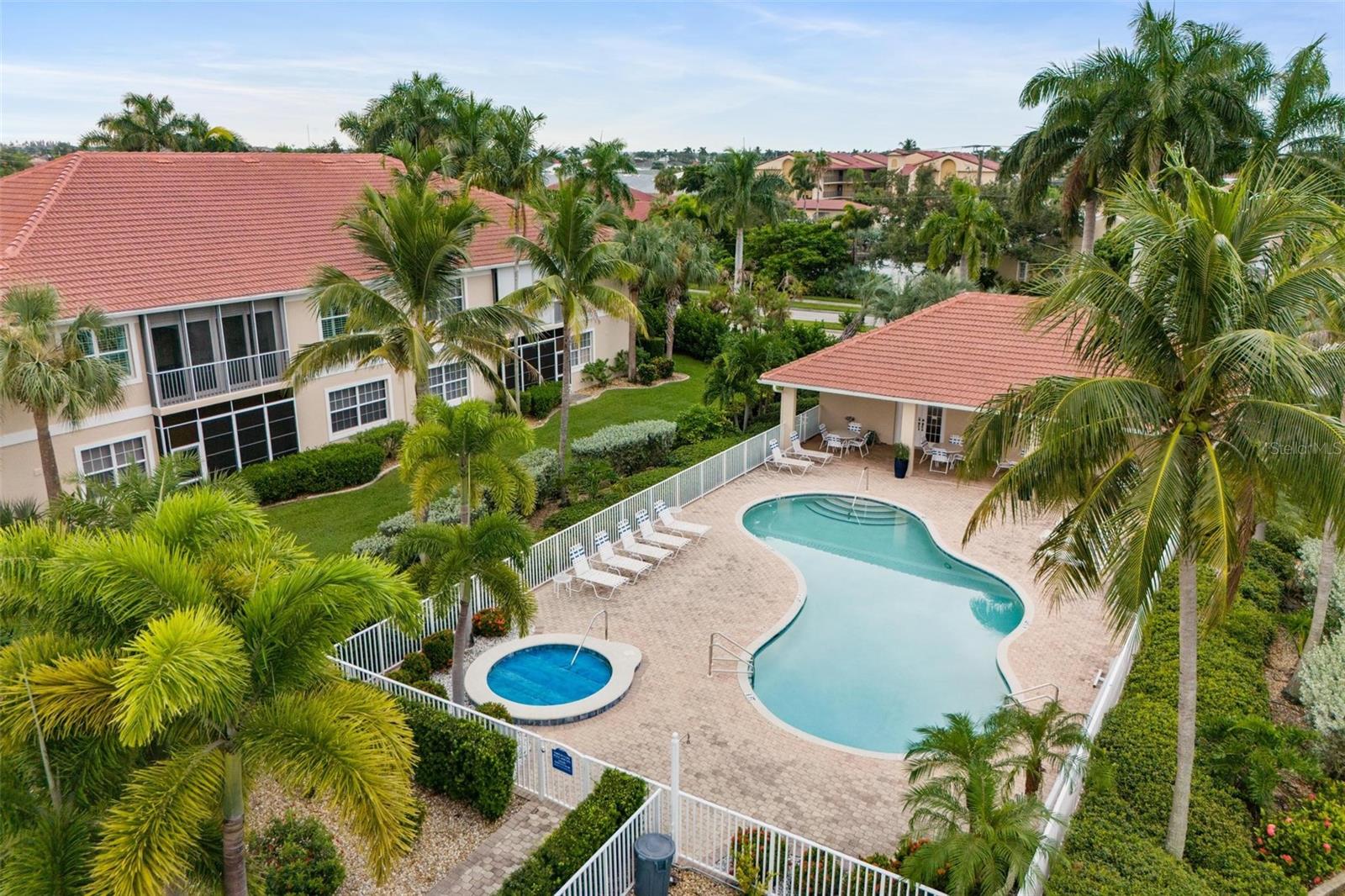 Impeccable ground floor waterfront condo with a deeded dock and 10,000 lb boat lift is a must see! This contemporary coastal inspired condo is located on the canal basin just steps from your deeded dock and the pool/clubhouse. No bridges and quick access to harbor! Strategically designed to maximize the water and lush landscape views with 10' ceilings, 8' doors and large windows throughout makes the home light and bright, but not overwhelming thanks to nearly every window facing east and north. A welcoming paved walkway with lush landscaping leads you to the front porch with beautiful glass door entry, marble flooring, spacious foyer with a large entry walk-in closet and art niche to greet you. A den/study that can double as an office or guest space (no closet) is very light and welcoming with glass french doors, warm wood flooring and a large window. You can also host overnight guests in the spacious guest bedroom located off of a shared hallway with a guest bathroom and laundry room, featuring a pocketing door at the hall entry that closes creating an en-suite feel. The large laundry room has a walk-in pantry style storage area with built in shelving rarely seen in condominiums. The kitchen is absolutely stunning, with Cambria quartz counters, custom wood cabinetry featuring pantry storage, pocketing storage and contemporary hardware. The high-end stainless steel appliances and the induction cooktop with custom hood are complimented by a custom iridescent mosaic backsplash The intelligent design of the kitchen offers seating at the breakfast bar, or in the kitchen nook nestled in a bay window created space, surrounded by stunning views. The exotic wood flooring enhances the upscale feel of this space. As you enter the main living area, you will be enchanted by the wall of windows showcasing the waterfront and the tropical landscaping. The open concept design of this area is perfect for entertaining large groups and allowing flexibility in design to fit your style. A wall of sliding hurricane impact doors leads to the lanai area, which features a custom wooden table/bar that is a textural delight, seats 3-4 adults and extends the entire width of the wall...a great place to have evening drinks after a day on the boat! Abundant seating on the lanai makes this feel like another living space, with the benefit of an unobstructed view of the docks, including yours! The lanai is enclosed, but has sliding windows to allow the breezes inside. The master bedroom is canal front with a large window and is very spacious, the current owners have a king sized bed and other furniture with plenty of space to spare. Large walk-in closet and an en-suite bathroom makes this space so functional and private. This condo has been meticulously maintained and beautifully upgraded throughout, it is hard to find a combination of large rooms, abundant storage, 2 car oversized garage and a deeded boat dock with lift right outside your door when you are looking at condominiums, which makes this a unique opportunity for you. The Tarpon Cove Condominium community is professionally managed and beautifully maintained with a clubhouse, heated pool and spa, fitness area, and guest parking. The docks are 30'concrete and have a dock box, water and electric pedestals. Another unique feature is that this dock space #5 can accommodate a boat up to 38 feet in length. Oversized garage has abundant shelving and elevated ceilings as well as a large window.