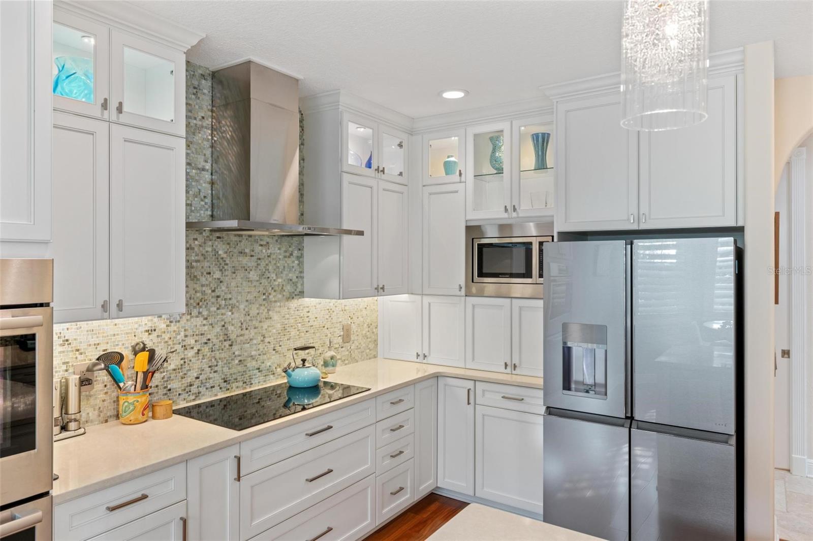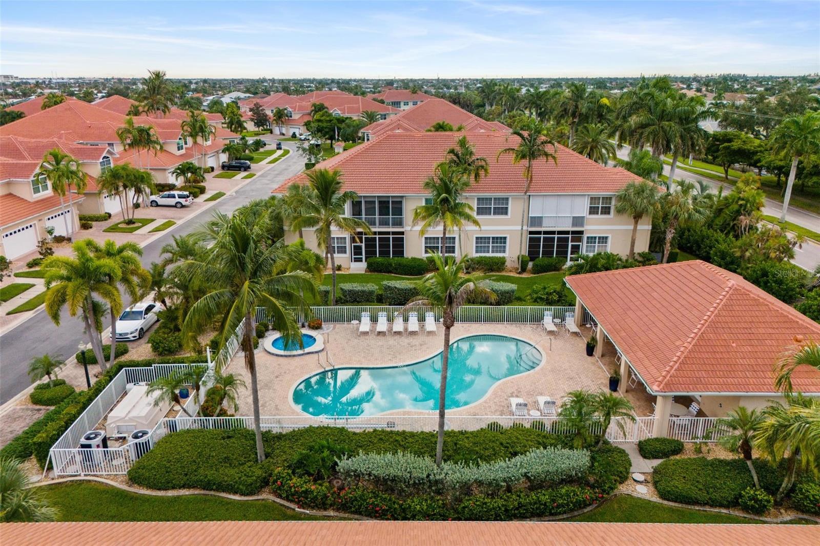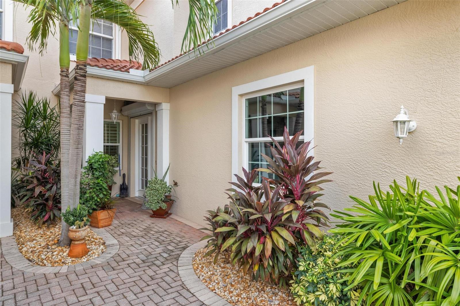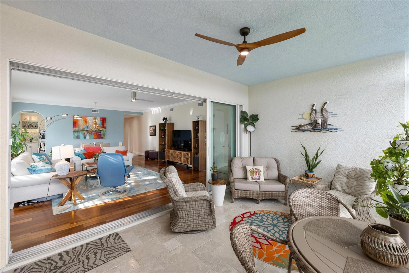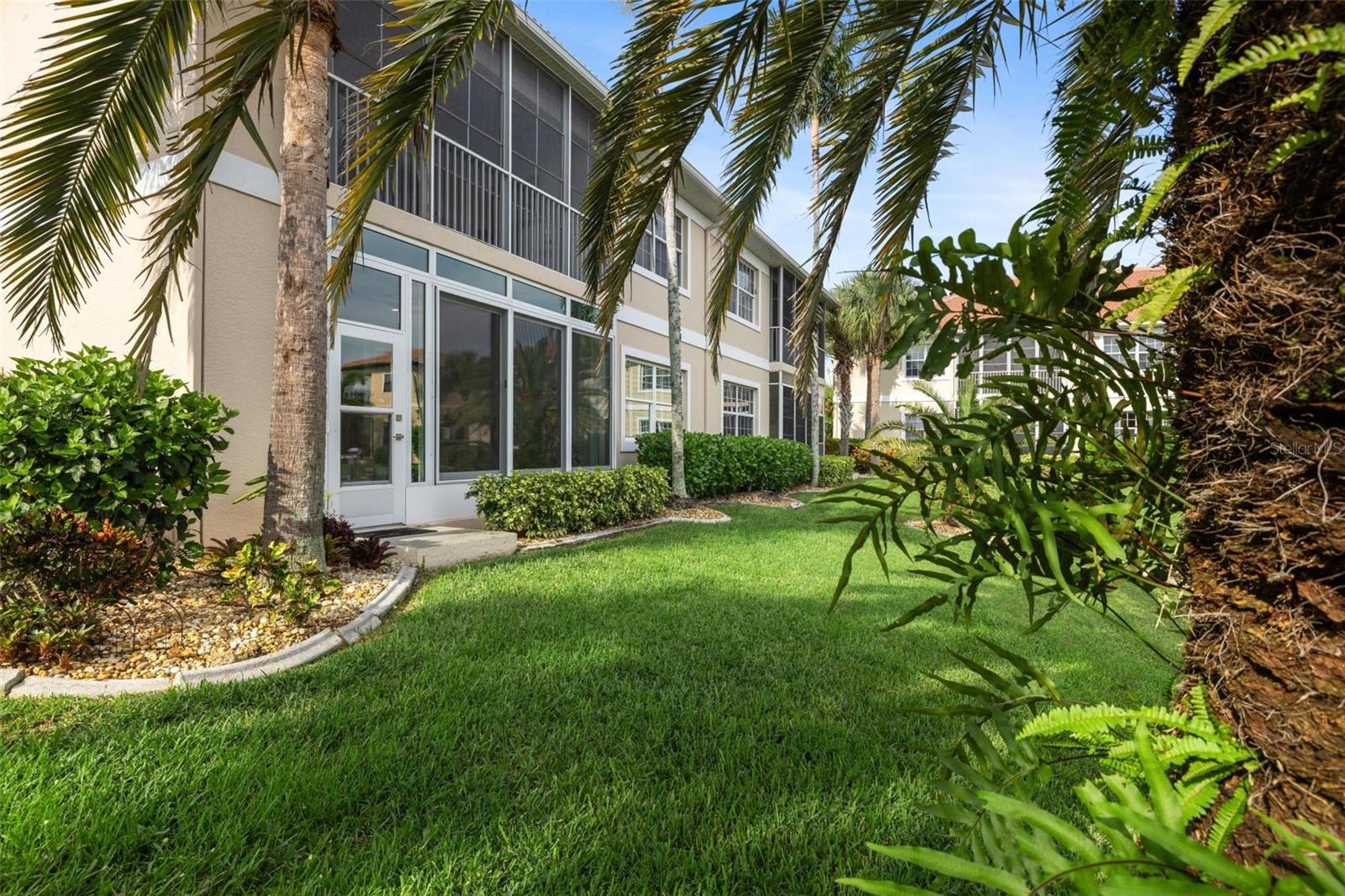 Impeccable ground floor waterfront condo with a deeded dock and 10,000 lb boat lift is a must see! This contemporary coastal inspired condo is located on the canal basin just steps from your deeded dock and the pool/clubhouse. No bridges and quick access to harbor! Strategically designed to maximize the water and lush landscape views with 10' ceilings, 8' doors and large windows throughout makes the home light and bright, but not overwhelming thanks to nearly every window facing east and north. A welcoming paved walkway with lush landscaping leads you to the front porch with beautiful glass door entry, marble flooring, spacious foyer with a large entry walk-in closet and art niche to greet you. A den/study that can double as an office or guest space (no closet) is very light and welcoming with glass french doors, warm wood flooring and a large window. You can also host overnight guests in the spacious guest bedroom located off of a shared hallway with a guest bathroom and laundry room, featuring a pocketing door at the hall entry that closes creating an en-suite feel. The large laundry room has a walk-in pantry style storage area with built in shelving rarely seen in condominiums. The kitchen is absolutely stunning, with Cambria quartz counters, custom wood cabinetry featuring pantry storage, pocketing storage and contemporary hardware. The high-end stainless steel appliances and the induction cooktop with custom hood are complimented by a custom iridescent mosaic backsplash The intelligent design of the kitchen offers seating at the breakfast bar, or in the kitchen nook nestled in a bay window created space, surrounded by stunning views. The exotic wood flooring enhances the upscale feel of this space. As you enter the main living area, you will be enchanted by the wall of windows showcasing the waterfront and the tropical landscaping. The open concept design of this area is perfect for entertaining large groups and allowing flexibility in design to fit your style. A wall of sliding hurricane impact doors leads to the lanai area, which features a custom wooden table/bar that is a textural delight, seats 3-4 adults and extends the entire width of the wall...a great place to have evening drinks after a day on the boat! Abundant seating on the lanai makes this feel like another living space, with the benefit of an unobstructed view of the docks, including yours! The lanai is enclosed, but has sliding windows to allow the breezes inside. The master bedroom is canal front with a large window and is very spacious, the current owners have a king sized bed and other furniture with plenty of space to spare. Large walk-in closet and an en-suite bathroom makes this space so functional and private. This condo has been meticulously maintained and beautifully upgraded throughout, it is hard to find a combination of large rooms, abundant storage, 2 car oversized garage and a deeded boat dock with lift right outside your door when you are looking at condominiums, which makes this a unique opportunity for you. The Tarpon Cove Condominium community is professionally managed and beautifully maintained with a clubhouse, heated pool and spa, fitness area, and guest parking. The docks are 30'concrete and have a dock box, water and electric pedestals. Another unique feature is that this dock space #5 can accommodate a boat up to 38 feet in length. Oversized garage has abundant shelving and elevated ceilings as well as a large window.