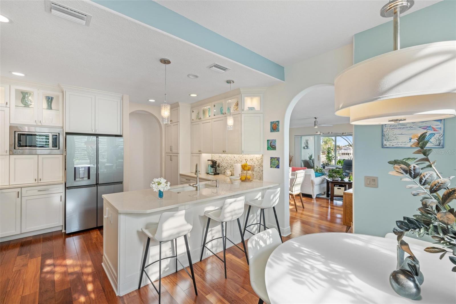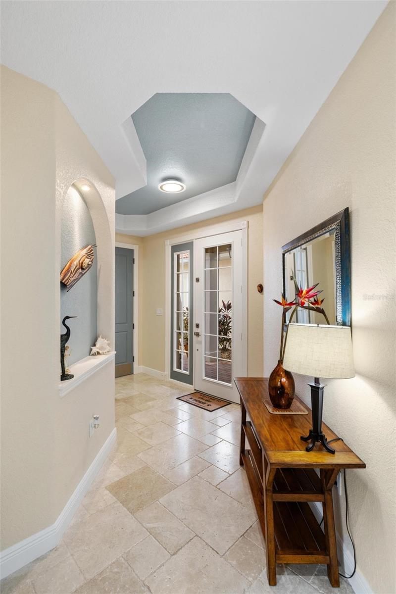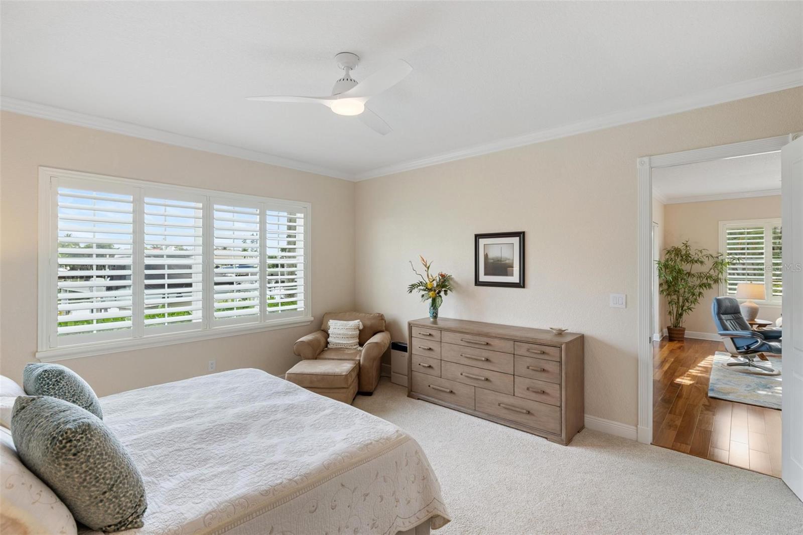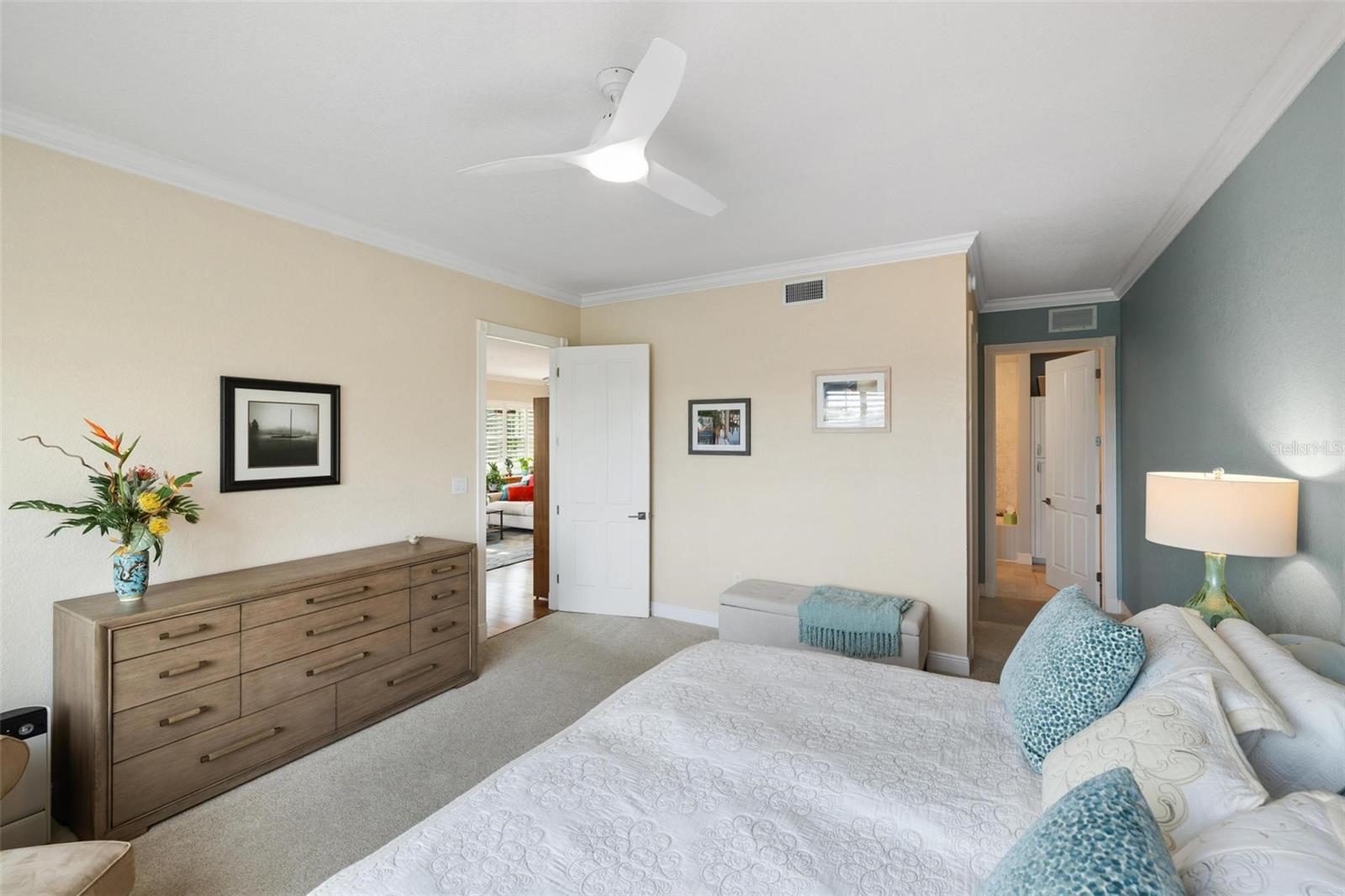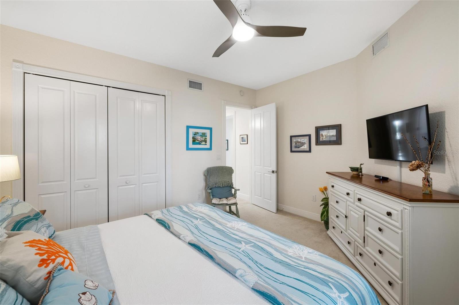 Impeccable ground floor waterfront condo with a deeded dock and 10,000 lb boat lift is a must see! This contemporary coastal inspired condo is located on the canal basin just steps from your deeded dock and the pool/clubhouse. No bridges and quick access to harbor! Strategically designed to maximize the water and lush landscape views with 10' ceilings, 8' doors and large windows throughout makes the home light and bright, but not overwhelming thanks to nearly every window facing east and north. A welcoming paved walkway with lush landscaping leads you to the front porch with beautiful glass door entry, marble flooring, spacious foyer with a large entry walk-in closet and art niche to greet you. A den/study that can double as an office or guest space (no closet) is very light and welcoming with glass french doors, warm wood flooring and a large window. You can also host overnight guests in the spacious guest bedroom located off of a shared hallway with a guest bathroom and laundry room, featuring a pocketing door at the hall entry that closes creating an en-suite feel. The large laundry room has a walk-in pantry style storage area with built in shelving rarely seen in condominiums. The kitchen is absolutely stunning, with Cambria quartz counters, custom wood cabinetry featuring pantry storage, pocketing storage and contemporary hardware. The high-end stainless steel appliances and the induction cooktop with custom hood are complimented by a custom iridescent mosaic backsplash The intelligent design of the kitchen offers seating at the breakfast bar, or in the kitchen nook nestled in a bay window created space, surrounded by stunning views. The exotic wood flooring enhances the upscale feel of this space. As you enter the main living area, you will be enchanted by the wall of windows showcasing the waterfront and the tropical landscaping. The open concept design of this area is perfect for entertaining large groups and allowing flexibility in design to fit your style. A wall of sliding hurricane impact doors leads to the lanai area, which features a custom wooden table/bar that is a textural delight, seats 3-4 adults and extends the entire width of the wall...a great place to have evening drinks after a day on the boat! Abundant seating on the lanai makes this feel like another living space, with the benefit of an unobstructed view of the docks, including yours! The lanai is enclosed, but has sliding windows to allow the breezes inside. The master bedroom is canal front with a large window and is very spacious, the current owners have a king sized bed and other furniture with plenty of space to spare. Large walk-in closet and an en-suite bathroom makes this space so functional and private. This condo has been meticulously maintained and beautifully upgraded throughout, it is hard to find a combination of large rooms, abundant storage, 2 car oversized garage and a deeded boat dock with lift right outside your door when you are looking at condominiums, which makes this a unique opportunity for you. The Tarpon Cove Condominium community is professionally managed and beautifully maintained with a clubhouse, heated pool and spa, fitness area, and guest parking. The docks are 30'concrete and have a dock box, water and electric pedestals. Another unique feature is that this dock space #5 can accommodate a boat up to 38 feet in length. Oversized garage has abundant shelving and elevated ceilings as well as a large window.