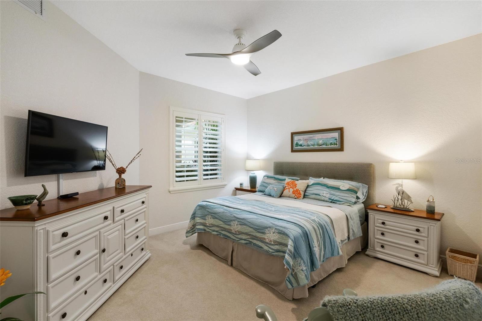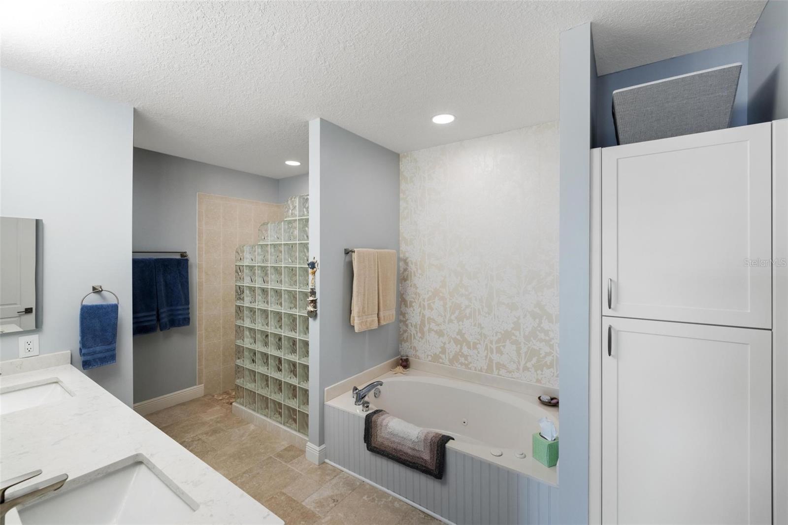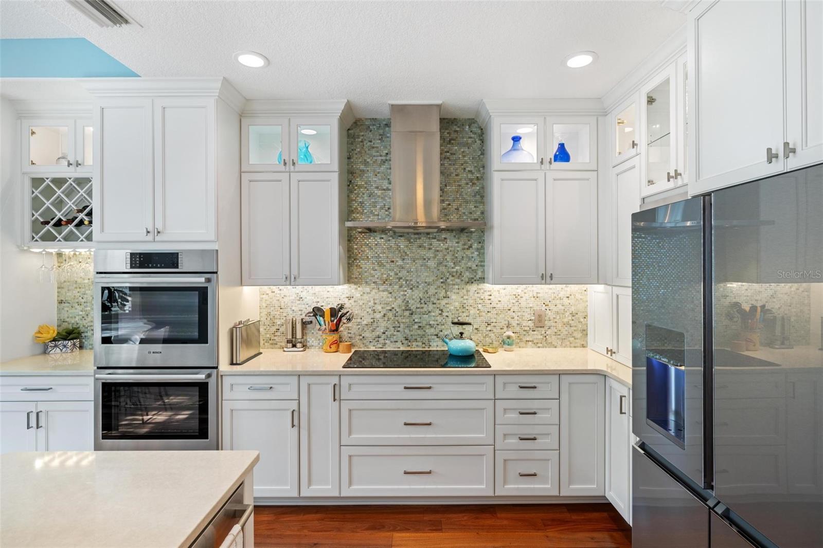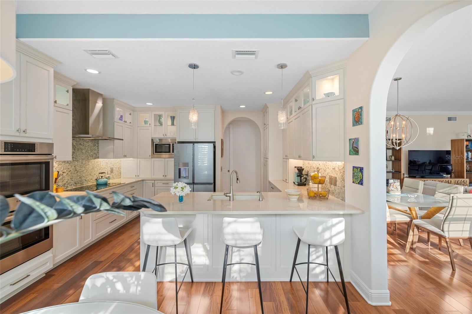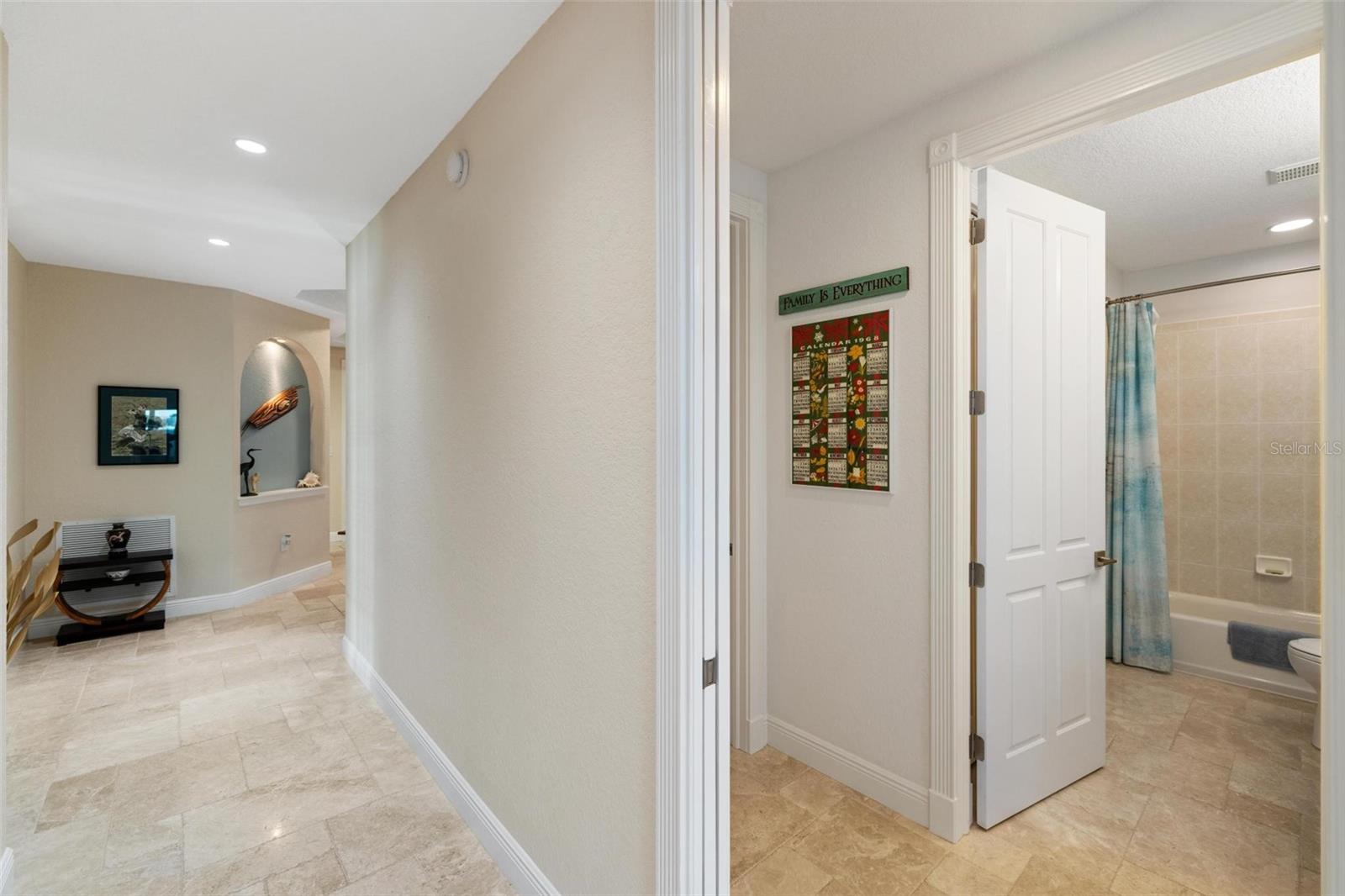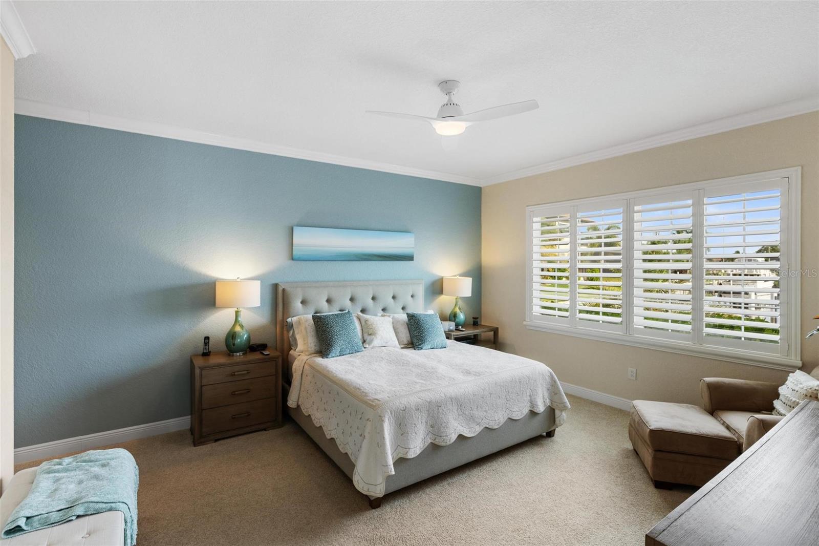 Impeccable ground floor waterfront condo with a deeded dock and 10,000 lb boat lift is a must see! This contemporary coastal inspired condo is located on the canal basin just steps from your deeded dock and the pool/clubhouse. No bridges and quick access to harbor! Strategically designed to maximize the water and lush landscape views with 10' ceilings, 8' doors and large windows throughout makes the home light and bright, but not overwhelming thanks to nearly every window facing east and north. A welcoming paved walkway with lush landscaping leads you to the front porch with beautiful glass door entry, marble flooring, spacious foyer with a large entry walk-in closet and art niche to greet you. A den/study that can double as an office or guest space (no closet) is very light and welcoming with glass french doors, warm wood flooring and a large window. You can also host overnight guests in the spacious guest bedroom located off of a shared hallway with a guest bathroom and laundry room, featuring a pocketing door at the hall entry that closes creating an en-suite feel. The large laundry room has a walk-in pantry style storage area with built in shelving rarely seen in condominiums. The kitchen is absolutely stunning, with Cambria quartz counters, custom wood cabinetry featuring pantry storage, pocketing storage and contemporary hardware. The high-end stainless steel appliances and the induction cooktop with custom hood are complimented by a custom iridescent mosaic backsplash The intelligent design of the kitchen offers seating at the breakfast bar, or in the kitchen nook nestled in a bay window created space, surrounded by stunning views. The exotic wood flooring enhances the upscale feel of this space. As you enter the main living area, you will be enchanted by the wall of windows showcasing the waterfront and the tropical landscaping. The open concept design of this area is perfect for entertaining large groups and allowing flexibility in design to fit your style. A wall of sliding hurricane impact doors leads to the lanai area, which features a custom wooden table/bar that is a textural delight, seats 3-4 adults and extends the entire width of the wall...a great place to have evening drinks after a day on the boat! Abundant seating on the lanai makes this feel like another living space, with the benefit of an unobstructed view of the docks, including yours! The lanai is enclosed, but has sliding windows to allow the breezes inside. The master bedroom is canal front with a large window and is very spacious, the current owners have a king sized bed and other furniture with plenty of space to spare. Large walk-in closet and an en-suite bathroom makes this space so functional and private. This condo has been meticulously maintained and beautifully upgraded throughout, it is hard to find a combination of large rooms, abundant storage, 2 car oversized garage and a deeded boat dock with lift right outside your door when you are looking at condominiums, which makes this a unique opportunity for you. The Tarpon Cove Condominium community is professionally managed and beautifully maintained with a clubhouse, heated pool and spa, fitness area, and guest parking. The docks are 30'concrete and have a dock box, water and electric pedestals. Another unique feature is that this dock space #5 can accommodate a boat up to 38 feet in length. Oversized garage has abundant shelving and elevated ceilings as well as a large window.