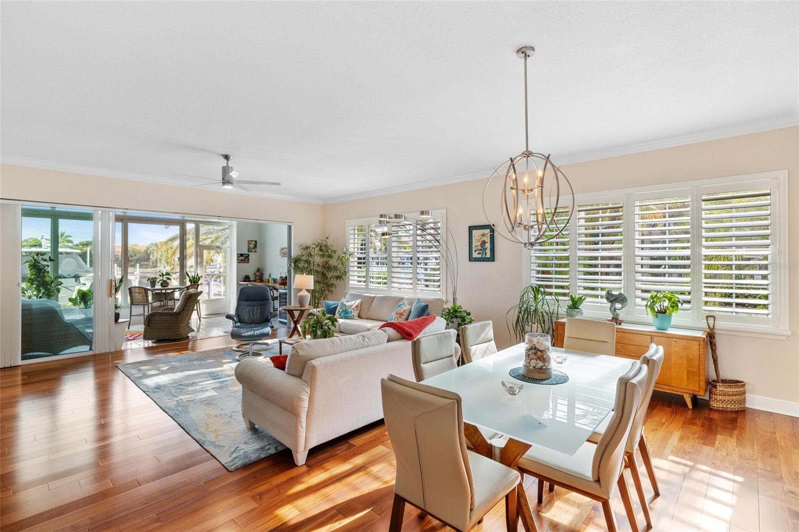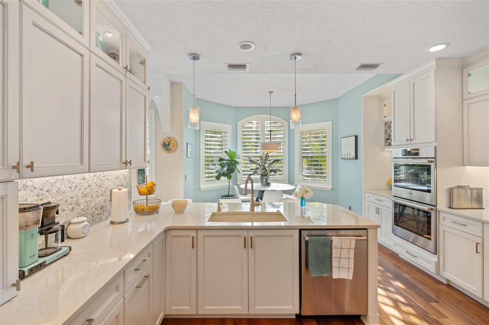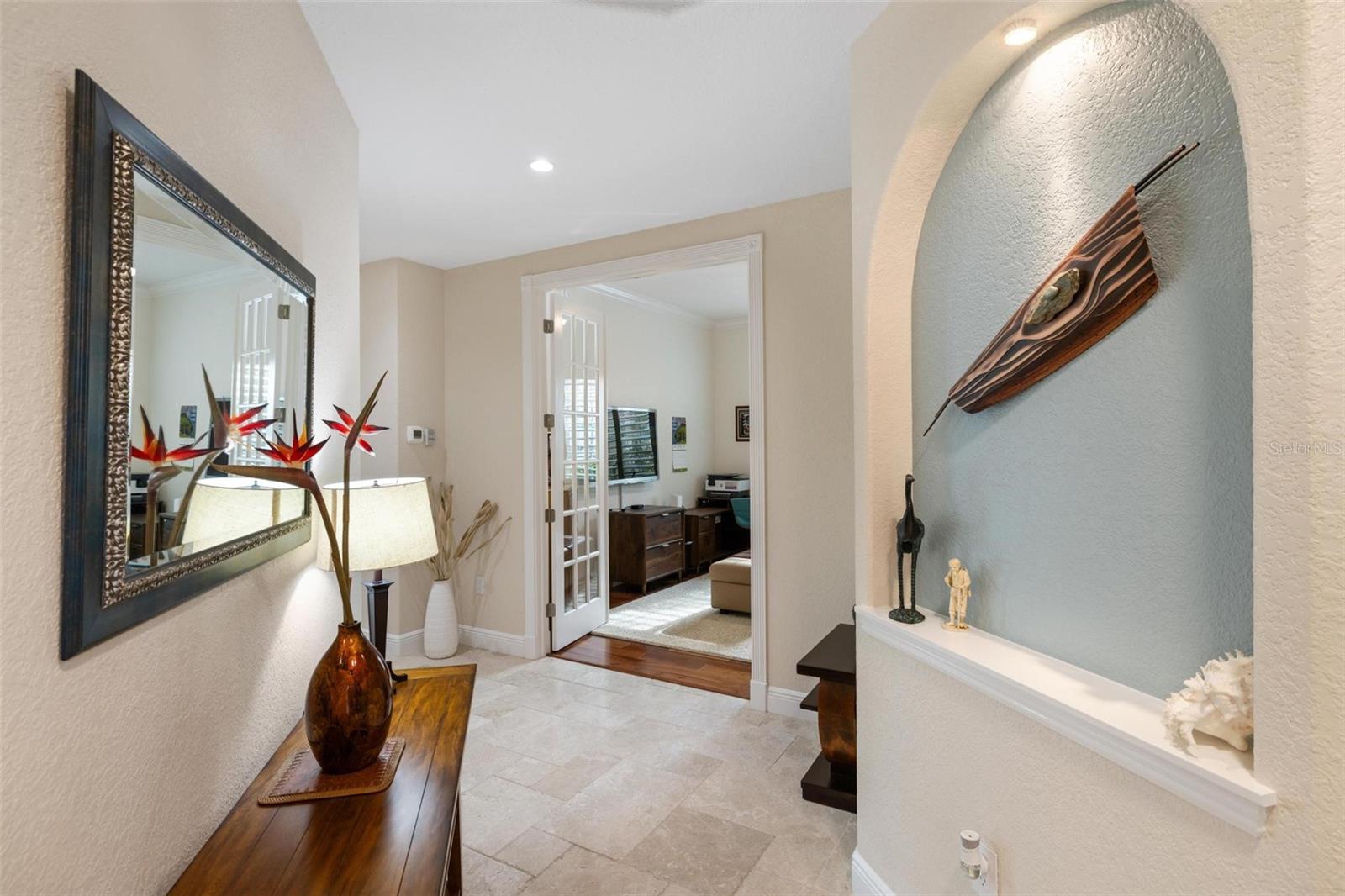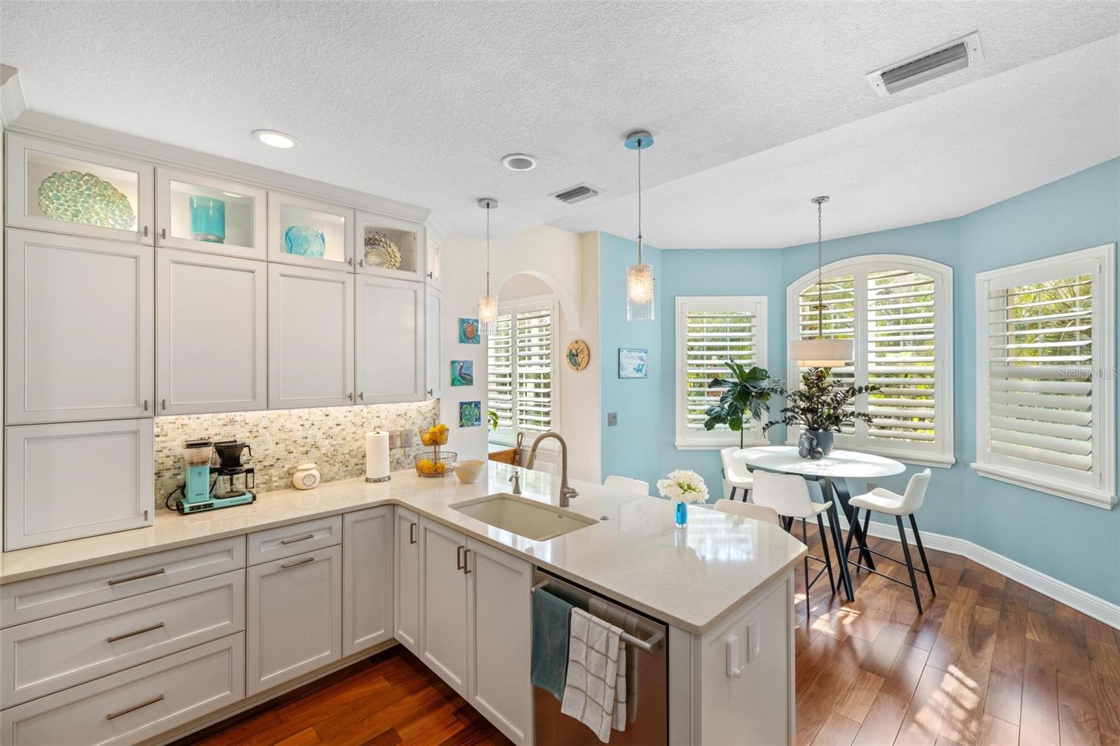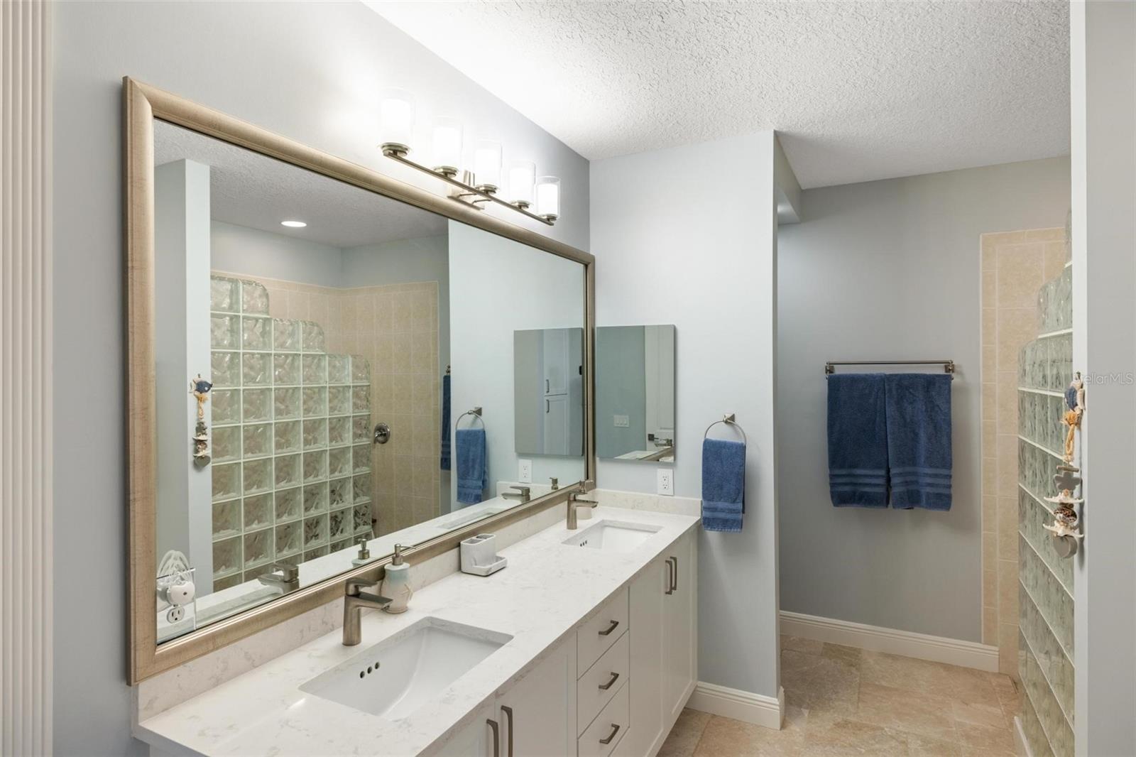 Impeccable ground floor waterfront condo with a deeded dock and 10,000 lb boat lift is a must see! This contemporary coastal inspired condo is located on the canal basin just steps from your deeded dock and the pool/clubhouse. No bridges and quick access to harbor! Strategically designed to maximize the water and lush landscape views with 10' ceilings, 8' doors and large windows throughout makes the home light and bright, but not overwhelming thanks to nearly every window facing east and north. A welcoming paved walkway with lush landscaping leads you to the front porch with beautiful glass door entry, marble flooring, spacious foyer with a large entry walk-in closet and art niche to greet you. A den/study that can double as an office or guest space (no closet) is very light and welcoming with glass french doors, warm wood flooring and a large window. You can also host overnight guests in the spacious guest bedroom located off of a shared hallway with a guest bathroom and laundry room, featuring a pocketing door at the hall entry that closes creating an en-suite feel. The large laundry room has a walk-in pantry style storage area with built in shelving rarely seen in condominiums. The kitchen is absolutely stunning, with Cambria quartz counters, custom wood cabinetry featuring pantry storage, pocketing storage and contemporary hardware. The high-end stainless steel appliances and the induction cooktop with custom hood are complimented by a custom iridescent mosaic backsplash The intelligent design of the kitchen offers seating at the breakfast bar, or in the kitchen nook nestled in a bay window created space, surrounded by stunning views. The exotic wood flooring enhances the upscale feel of this space. As you enter the main living area, you will be enchanted by the wall of windows showcasing the waterfront and the tropical landscaping. The open concept design of this area is perfect for entertaining large groups and allowing flexibility in design to fit your style. A wall of sliding hurricane impact doors leads to the lanai area, which features a custom wooden table/bar that is a textural delight, seats 3-4 adults and extends the entire width of the wall...a great place to have evening drinks after a day on the boat! Abundant seating on the lanai makes this feel like another living space, with the benefit of an unobstructed view of the docks, including yours! The lanai is enclosed, but has sliding windows to allow the breezes inside. The master bedroom is canal front with a large window and is very spacious, the current owners have a king sized bed and other furniture with plenty of space to spare. Large walk-in closet and an en-suite bathroom makes this space so functional and private. This condo has been meticulously maintained and beautifully upgraded throughout, it is hard to find a combination of large rooms, abundant storage, 2 car oversized garage and a deeded boat dock with lift right outside your door when you are looking at condominiums, which makes this a unique opportunity for you. The Tarpon Cove Condominium community is professionally managed and beautifully maintained with a clubhouse, heated pool and spa, fitness area, and guest parking. The docks are 30'concrete and have a dock box, water and electric pedestals. Another unique feature is that this dock space #5 can accommodate a boat up to 38 feet in length. Oversized garage has abundant shelving and elevated ceilings as well as a large window.