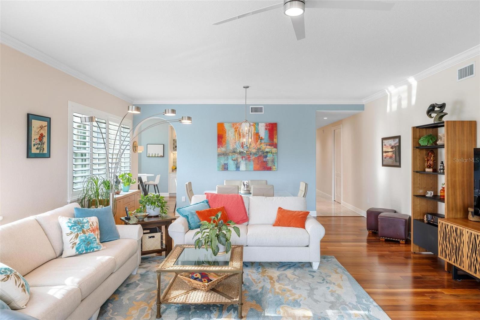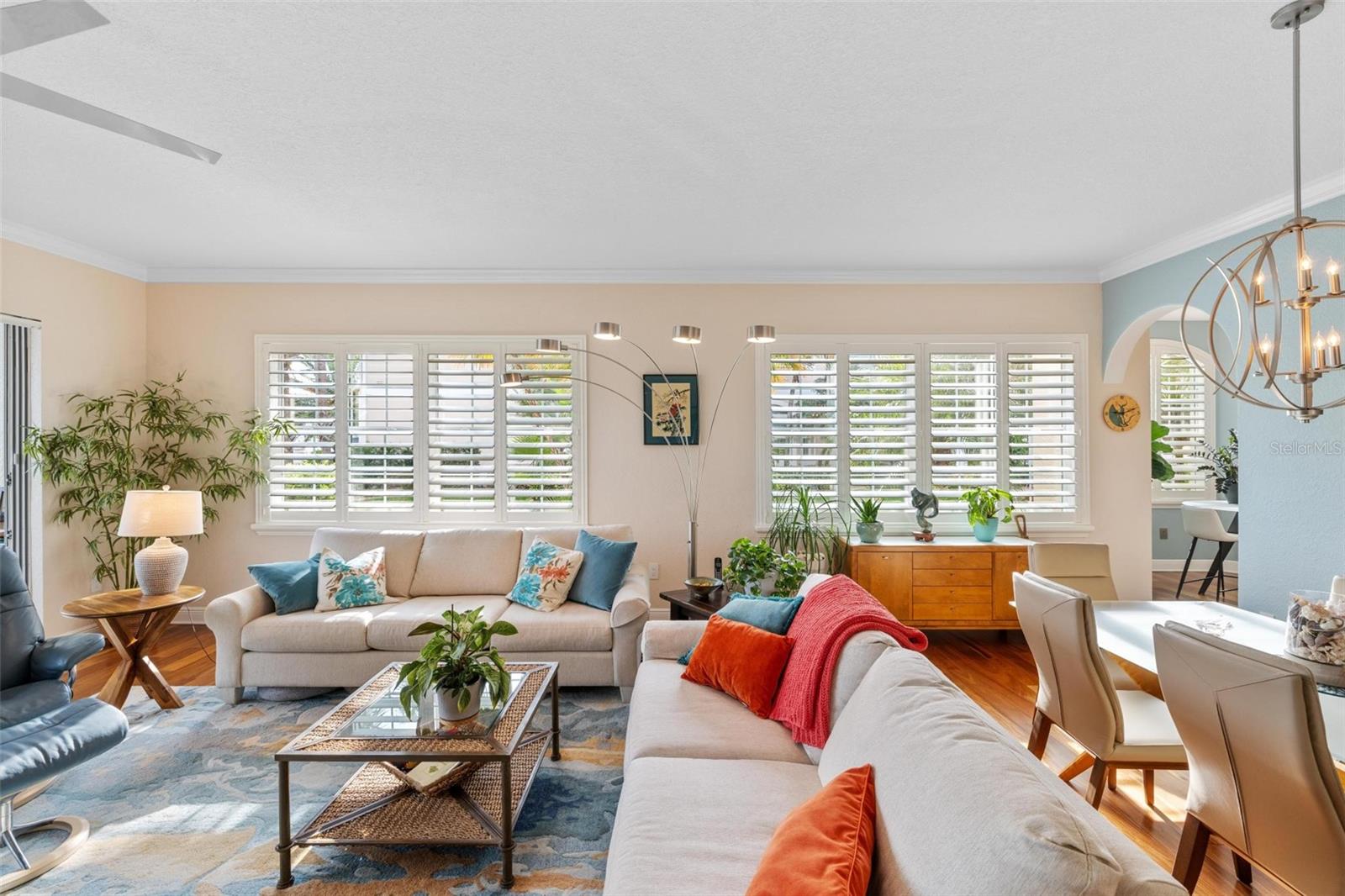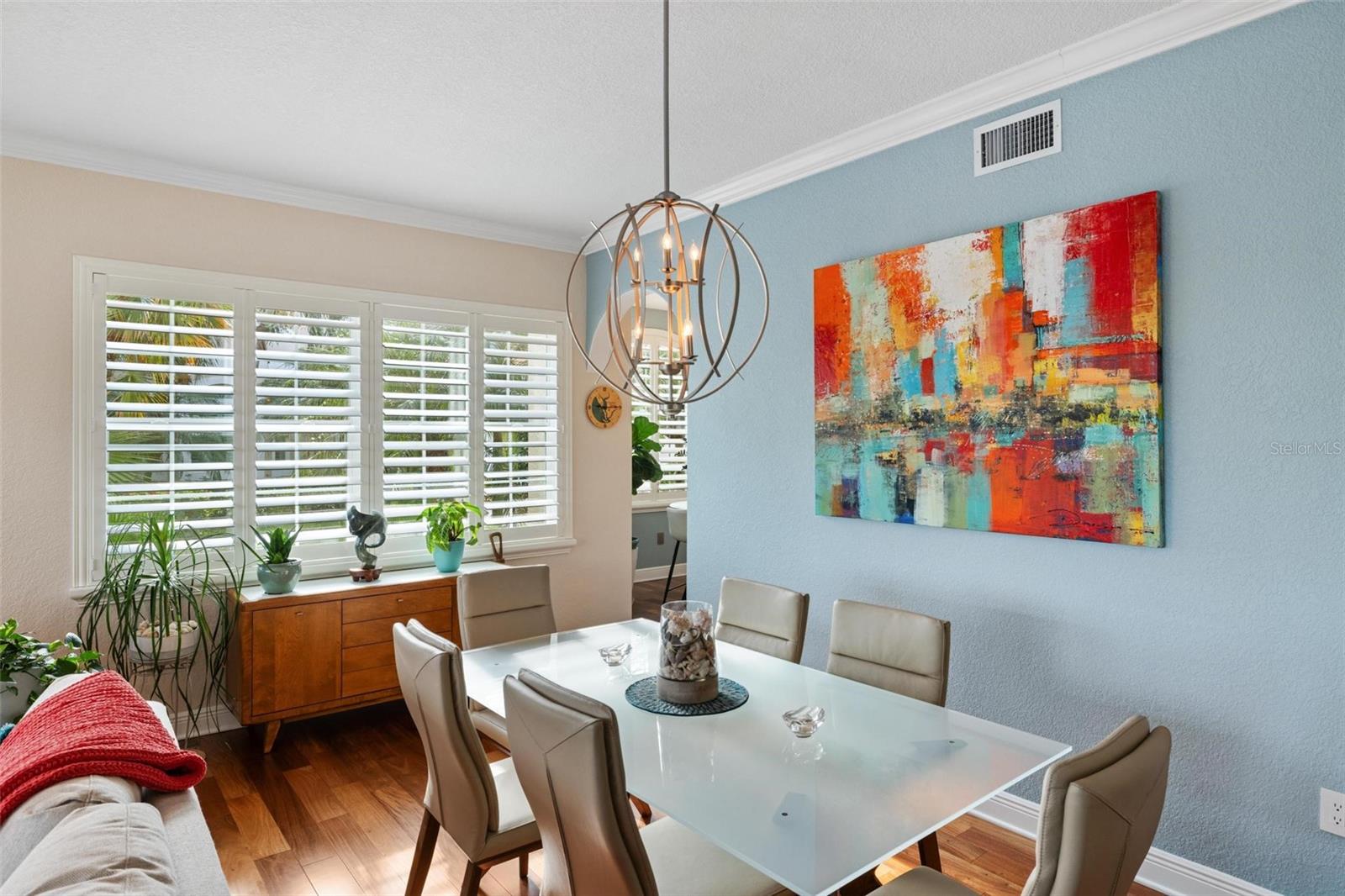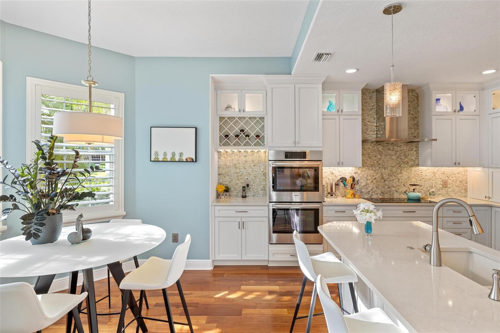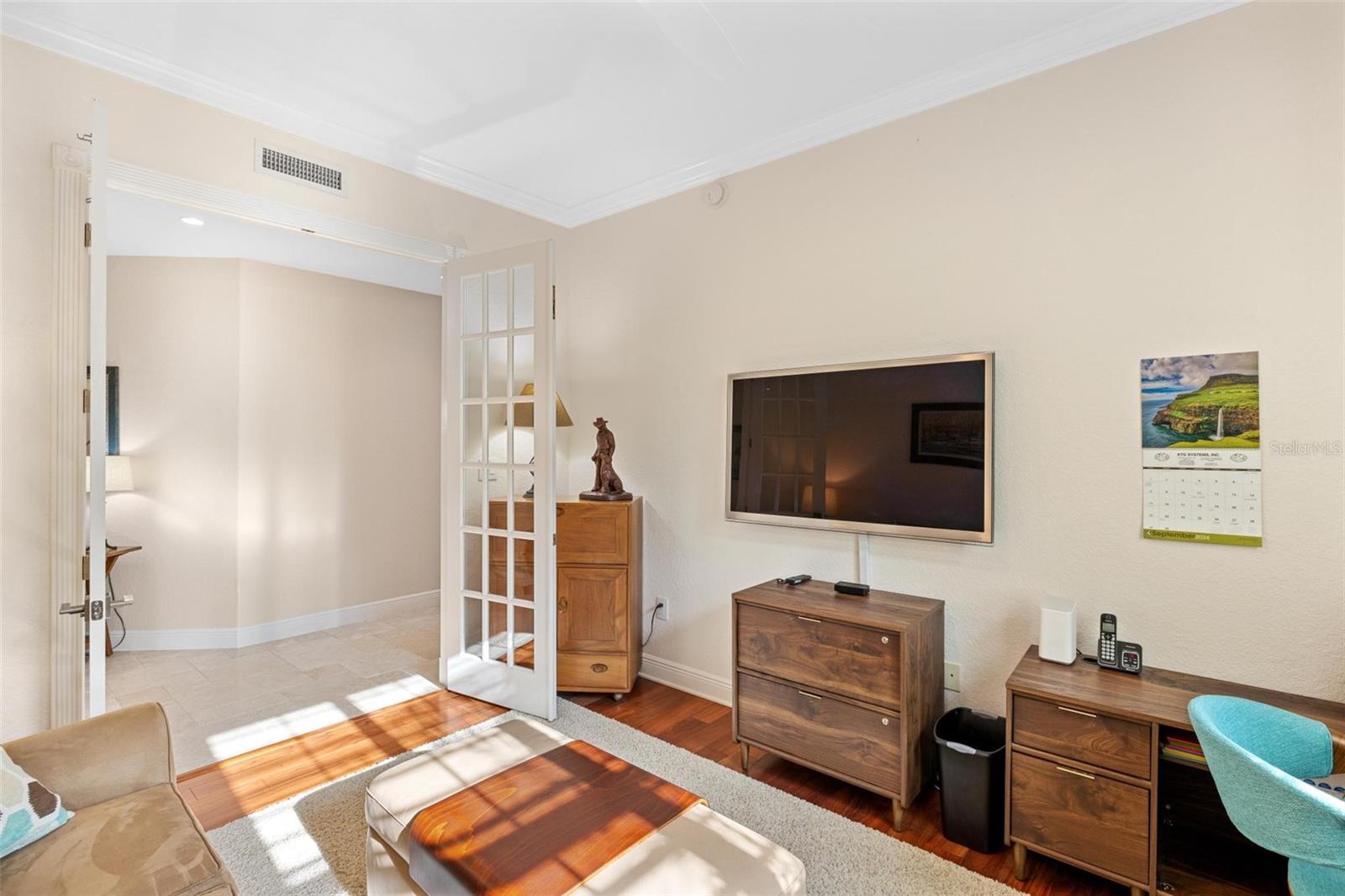 Impeccable ground floor waterfront condo with a deeded dock and 10,000 lb boat lift is a must see! This contemporary coastal inspired condo is located on the canal basin just steps from your deeded dock and the pool/clubhouse. No bridges and quick access to harbor! Strategically designed to maximize the water and lush landscape views with 10' ceilings, 8' doors and large windows throughout makes the home light and bright, but not overwhelming thanks to nearly every window facing east and north. A welcoming paved walkway with lush landscaping leads you to the front porch with beautiful glass door entry, marble flooring, spacious foyer with a large entry walk-in closet and art niche to greet you. A den/study that can double as an office or guest space (no closet) is very light and welcoming with glass french doors, warm wood flooring and a large window. You can also host overnight guests in the spacious guest bedroom located off of a shared hallway with a guest bathroom and laundry room, featuring a pocketing door at the hall entry that closes creating an en-suite feel. The large laundry room has a walk-in pantry style storage area with built in shelving rarely seen in condominiums. The kitchen is absolutely stunning, with Cambria quartz counters, custom wood cabinetry featuring pantry storage, pocketing storage and contemporary hardware. The high-end stainless steel appliances and the induction cooktop with custom hood are complimented by a custom iridescent mosaic backsplash The intelligent design of the kitchen offers seating at the breakfast bar, or in the kitchen nook nestled in a bay window created space, surrounded by stunning views. The exotic wood flooring enhances the upscale feel of this space. As you enter the main living area, you will be enchanted by the wall of windows showcasing the waterfront and the tropical landscaping. The open concept design of this area is perfect for entertaining large groups and allowing flexibility in design to fit your style. A wall of sliding hurricane impact doors leads to the lanai area, which features a custom wooden table/bar that is a textural delight, seats 3-4 adults and extends the entire width of the wall...a great place to have evening drinks after a day on the boat! Abundant seating on the lanai makes this feel like another living space, with the benefit of an unobstructed view of the docks, including yours! The lanai is enclosed, but has sliding windows to allow the breezes inside. The master bedroom is canal front with a large window and is very spacious, the current owners have a king sized bed and other furniture with plenty of space to spare. Large walk-in closet and an en-suite bathroom makes this space so functional and private. This condo has been meticulously maintained and beautifully upgraded throughout, it is hard to find a combination of large rooms, abundant storage, 2 car oversized garage and a deeded boat dock with lift right outside your door when you are looking at condominiums, which makes this a unique opportunity for you. The Tarpon Cove Condominium community is professionally managed and beautifully maintained with a clubhouse, heated pool and spa, fitness area, and guest parking. The docks are 30'concrete and have a dock box, water and electric pedestals. Another unique feature is that this dock space #5 can accommodate a boat up to 38 feet in length. Oversized garage has abundant shelving and elevated ceilings as well as a large window.