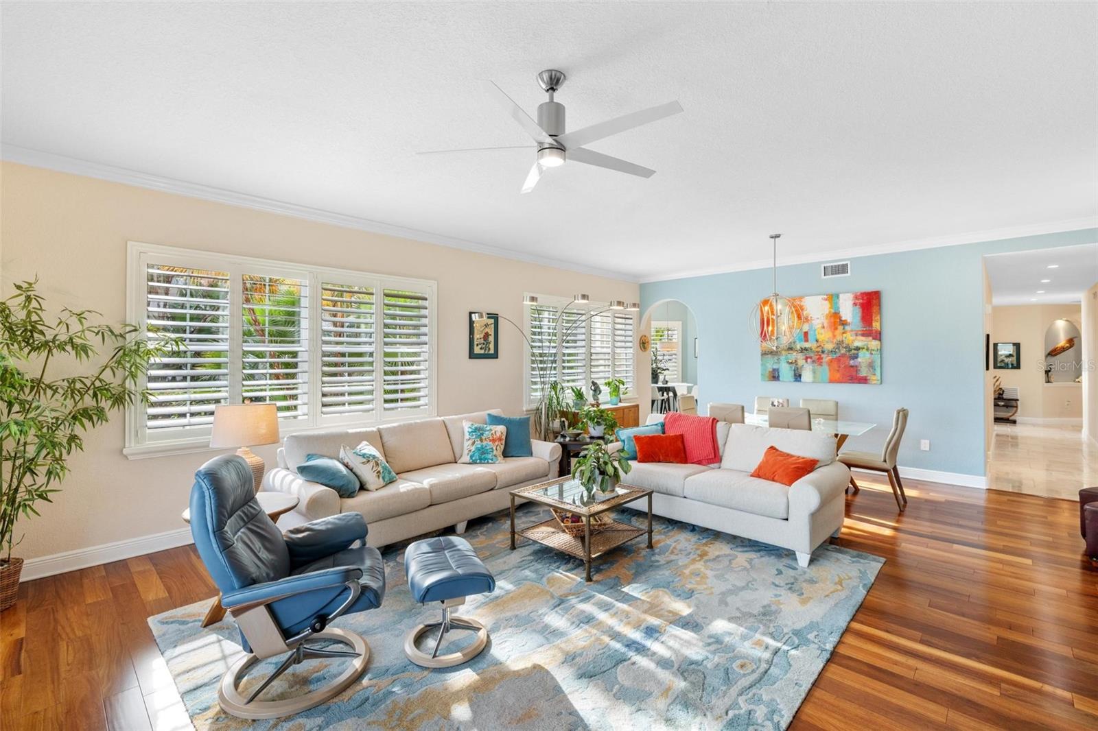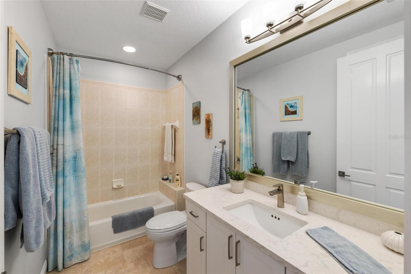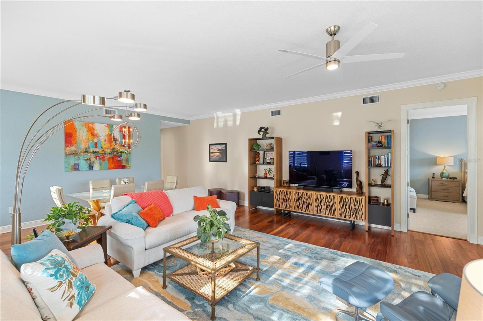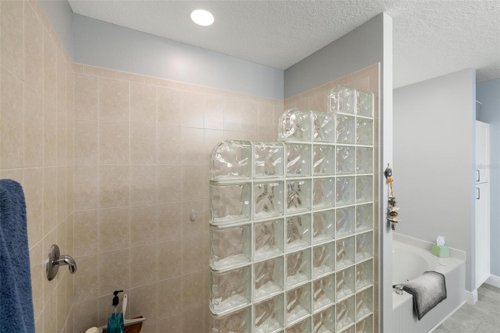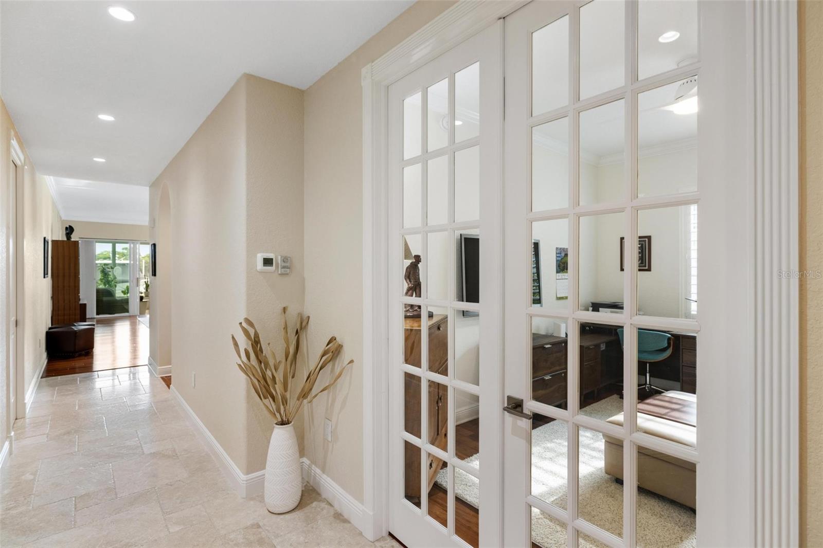 Impeccable ground floor waterfront condo with a deeded dock and 10,000 lb boat lift is a must see! This contemporary coastal inspired condo is located on the canal basin just steps from your deeded dock and the pool/clubhouse. No bridges and quick access to harbor! Strategically designed to maximize the water and lush landscape views with 10' ceilings, 8' doors and large windows throughout makes the home light and bright, but not overwhelming thanks to nearly every window facing east and north. A welcoming paved walkway with lush landscaping leads you to the front porch with beautiful glass door entry, marble flooring, spacious foyer with a large entry walk-in closet and art niche to greet you. A den/study that can double as an office or guest space (no closet) is very light and welcoming with glass french doors, warm wood flooring and a large window. You can also host overnight guests in the spacious guest bedroom located off of a shared hallway with a guest bathroom and laundry room, featuring a pocketing door at the hall entry that closes creating an en-suite feel. The large laundry room has a walk-in pantry style storage area with built in shelving rarely seen in condominiums. The kitchen is absolutely stunning, with Cambria quartz counters, custom wood cabinetry featuring pantry storage, pocketing storage and contemporary hardware. The high-end stainless steel appliances and the induction cooktop with custom hood are complimented by a custom iridescent mosaic backsplash The intelligent design of the kitchen offers seating at the breakfast bar, or in the kitchen nook nestled in a bay window created space, surrounded by stunning views. The exotic wood flooring enhances the upscale feel of this space. As you enter the main living area, you will be enchanted by the wall of windows showcasing the waterfront and the tropical landscaping. The open concept design of this area is perfect for entertaining large groups and allowing flexibility in design to fit your style. A wall of sliding hurricane impact doors leads to the lanai area, which features a custom wooden table/bar that is a textural delight, seats 3-4 adults and extends the entire width of the wall...a great place to have evening drinks after a day on the boat! Abundant seating on the lanai makes this feel like another living space, with the benefit of an unobstructed view of the docks, including yours! The lanai is enclosed, but has sliding windows to allow the breezes inside. The master bedroom is canal front with a large window and is very spacious, the current owners have a king sized bed and other furniture with plenty of space to spare. Large walk-in closet and an en-suite bathroom makes this space so functional and private. This condo has been meticulously maintained and beautifully upgraded throughout, it is hard to find a combination of large rooms, abundant storage, 2 car oversized garage and a deeded boat dock with lift right outside your door when you are looking at condominiums, which makes this a unique opportunity for you. The Tarpon Cove Condominium community is professionally managed and beautifully maintained with a clubhouse, heated pool and spa, fitness area, and guest parking. The docks are 30'concrete and have a dock box, water and electric pedestals. Another unique feature is that this dock space #5 can accommodate a boat up to 38 feet in length. Oversized garage has abundant shelving and elevated ceilings as well as a large window.