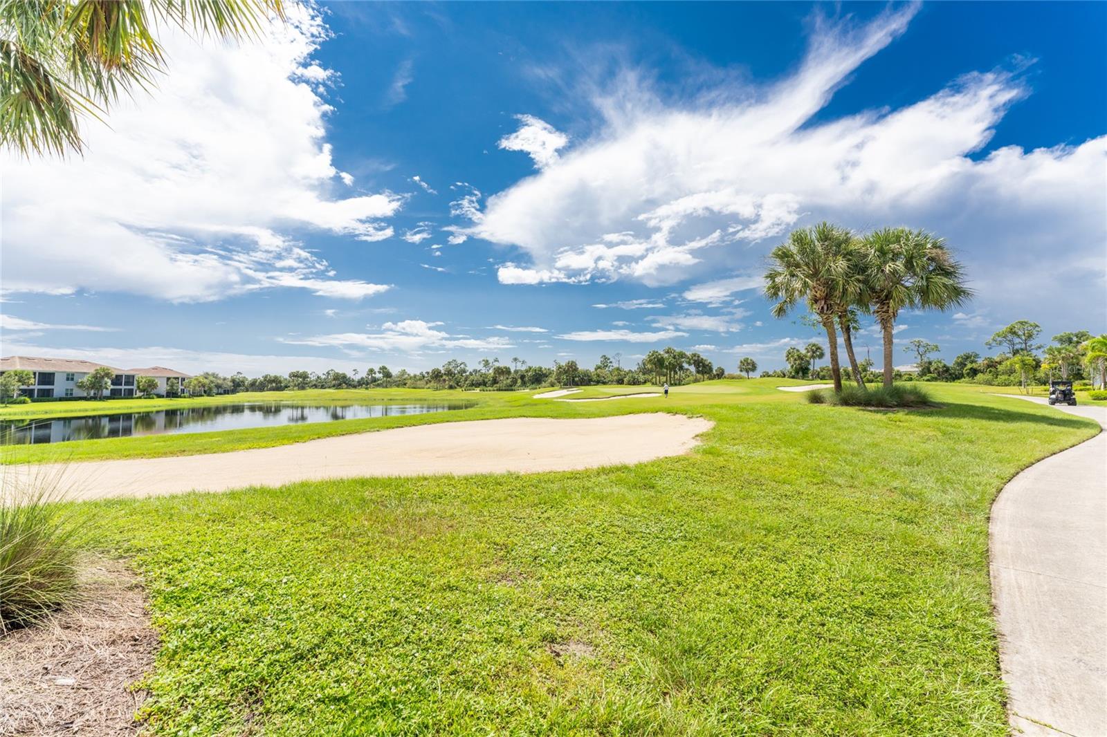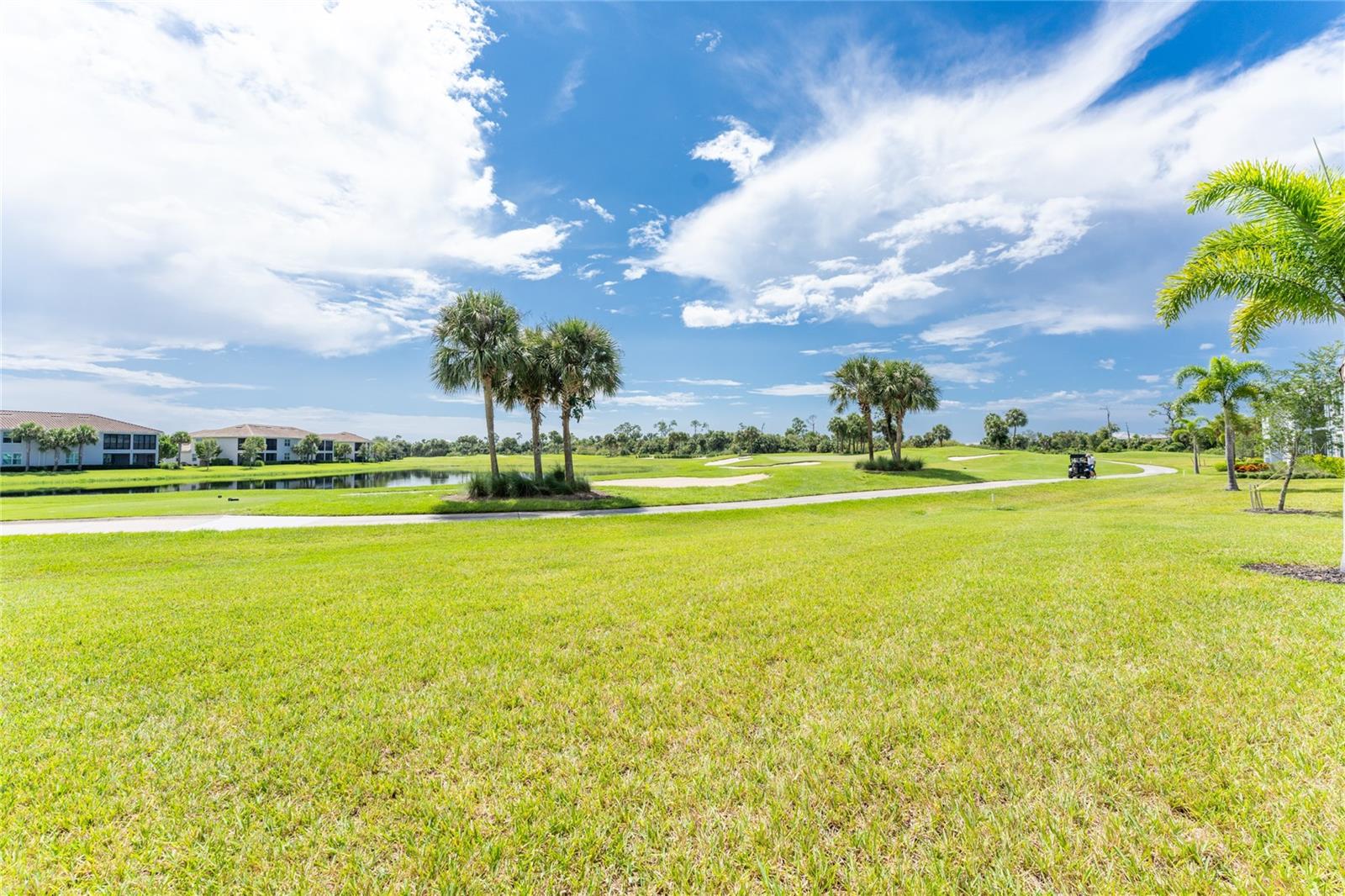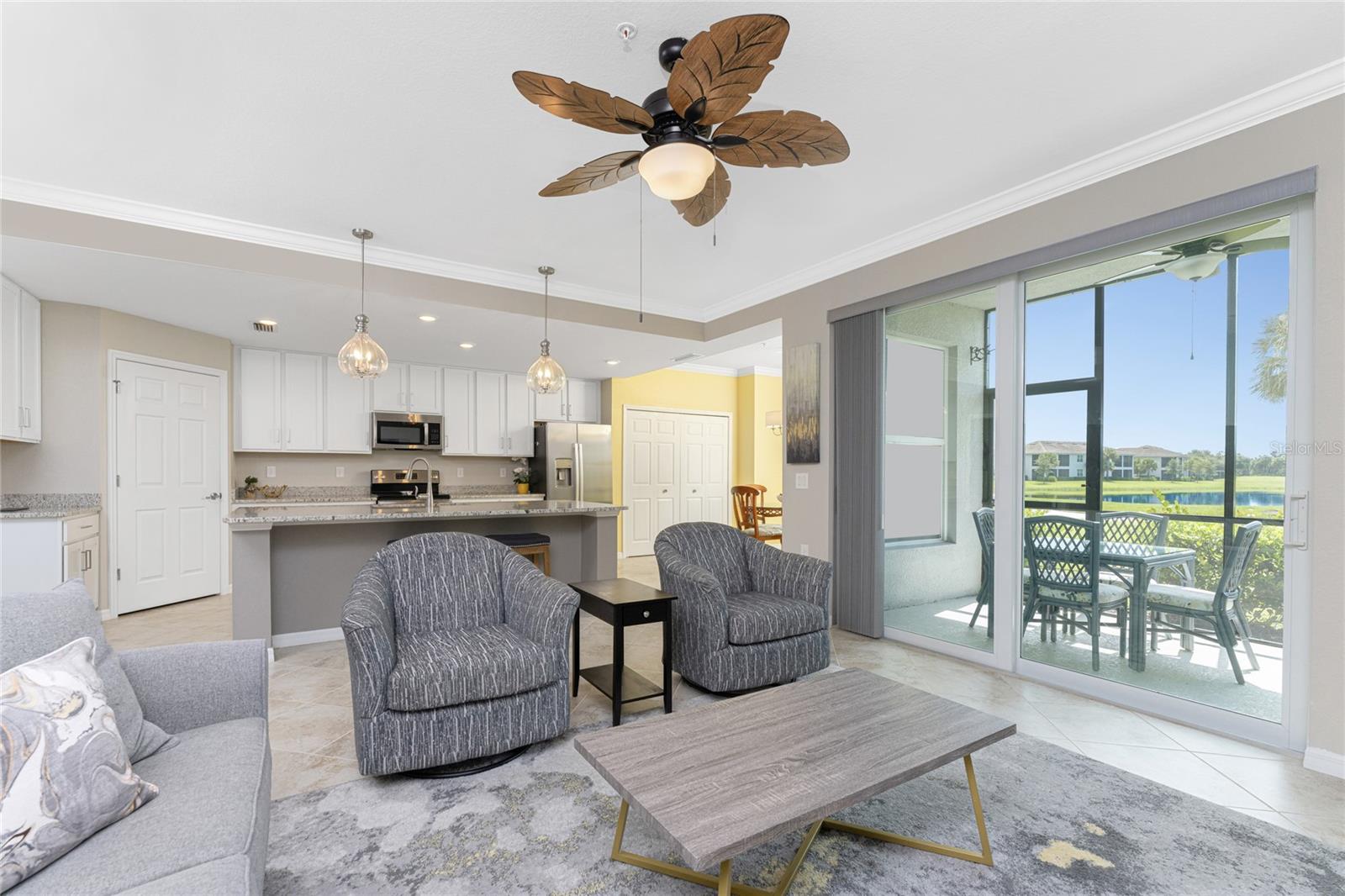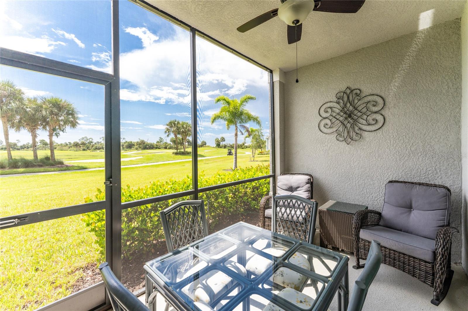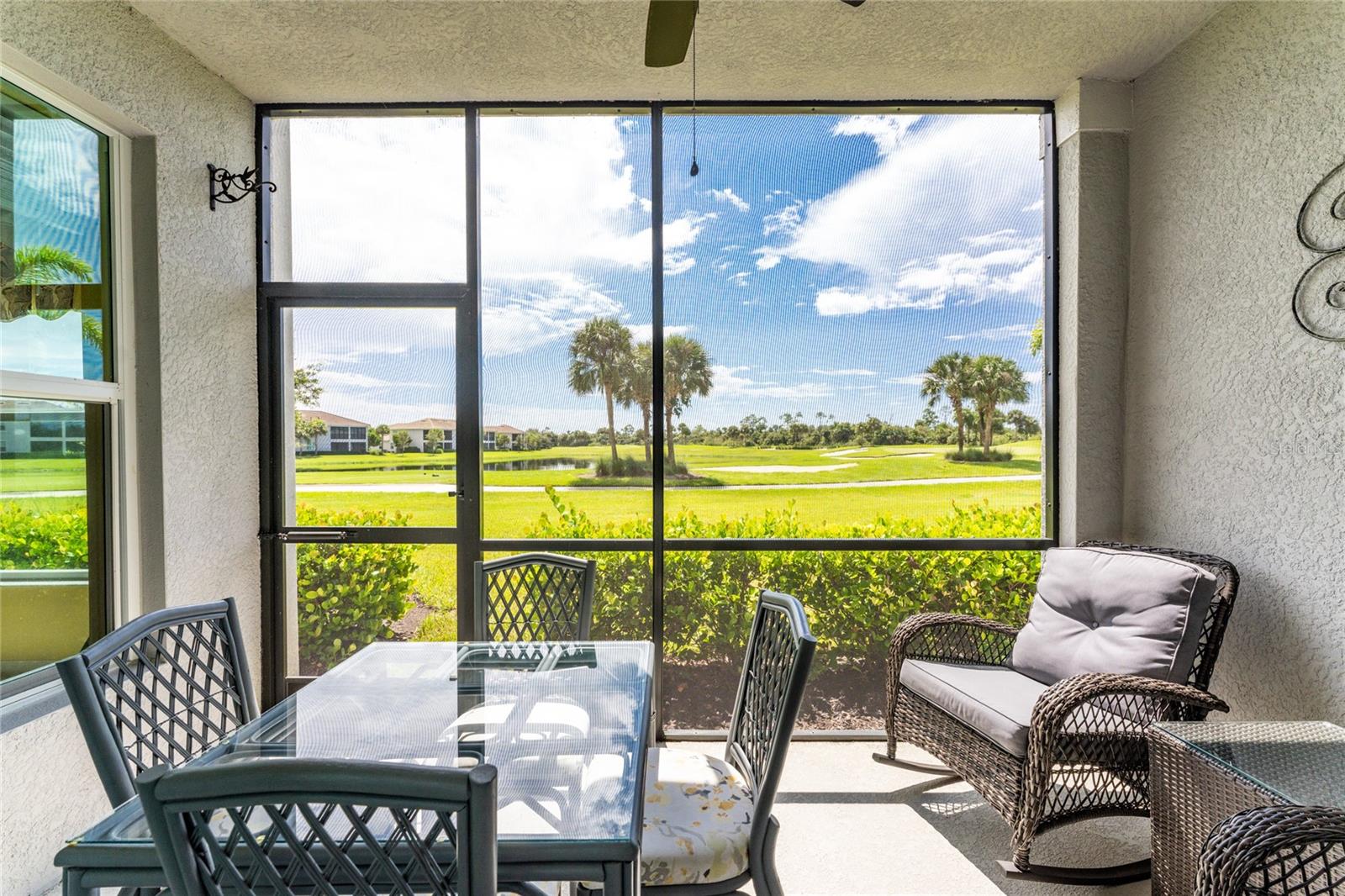 This exquisite ground-floor Veranda condo comes with a DEEDED GOLF MEMBERSHIP, providing you with exclusive access to the community's premier Gordon Lewis golf course—an unparalleled perk for golf enthusiasts. Offered TURNKEY FURNISHED, this condo boasts a desirable furniture package, ready for you to move right in. You will be welcomed home by a spacious screened in front lanai where you will enjoy relaxing with friends or curling up with your favorite book. Step inside into a bright, open space that showcases a picturesque backdrop featuring panoramic golf and water views. Diamond-set tile flooring throughout the main living area, seamlessly connects the striking open kitchen, dining, and living spaces. The well-appointed kitchen is a chef's delight, featuring an expansive island with bar seating, striking pendant lighting, granite countertops, and stainless steel appliances. Two spacious pantry closets provide ample storage, making this kitchen as functional as it is beautiful. Enjoy picturesque views of the golf course from the dining area, creating a pleasing backdrop for every meal. The living area flows effortlessly to the back screened lanais, perfect for enjoying a morning coffee, evening sunsets, or hosting guests with views of the golf course and lake beyond. The primary suite is a private sanctuary, complete with crown molding, dual walk-in closets, and an en-suite bathroom featuring a walk-in shower with frameless rain glass, dual sinks, and a large granite-topped vanity. The guest area offers a comfortable bedroom, along with a convenient bathroom featuring a granite-topped vanity, ensuring comfort and privacy for your visitors. For those working from home or seeking a quiet space to unwind, the den off the kitchen is an ideal spot for an office or media room. Offering the convenience of a single family home, this maintenance free Diangelo residence offers a garage just steps from the front door. Heritage Landing delivers true resort living, with a stunning Gordon Lewis designed golf course, beach entry swimming pool and poolside restaurant, tennis, pickleball, bocce and a state of the art fitness center with a sauna and locker rooms. Residents will soon enjoy the much anticipated Clubhouse, which is expected to be completed by the end of the year. Come for the lifestyle…stay for life.