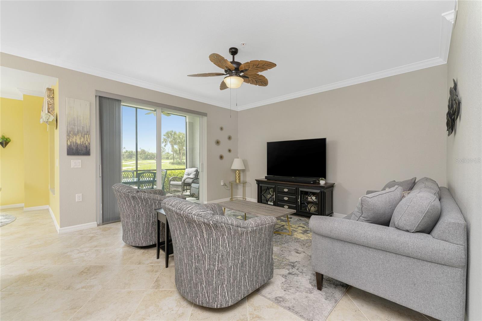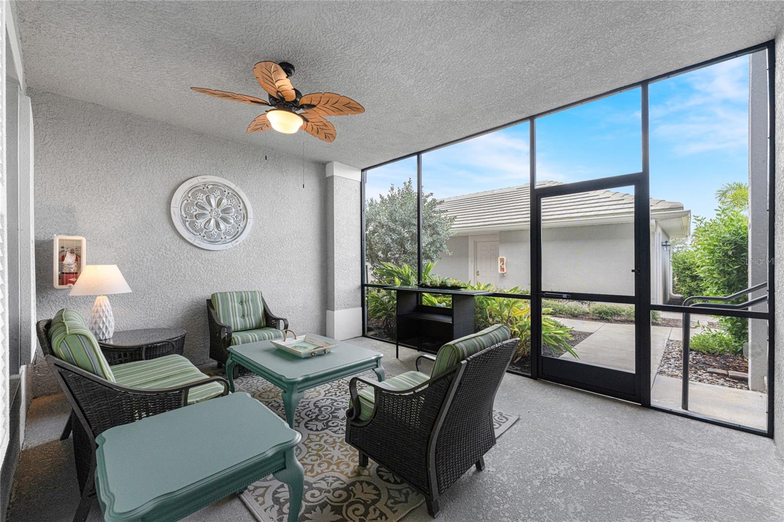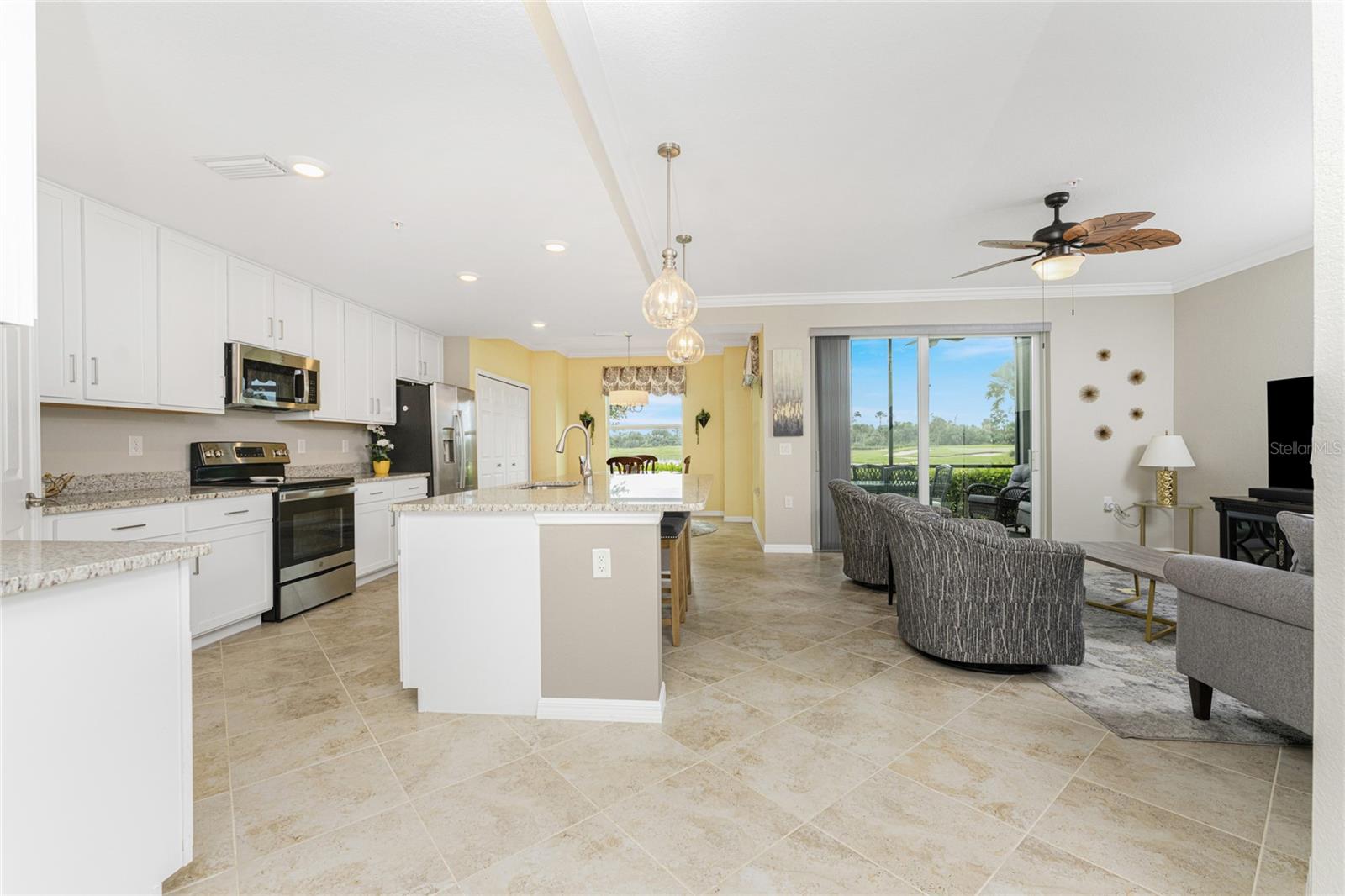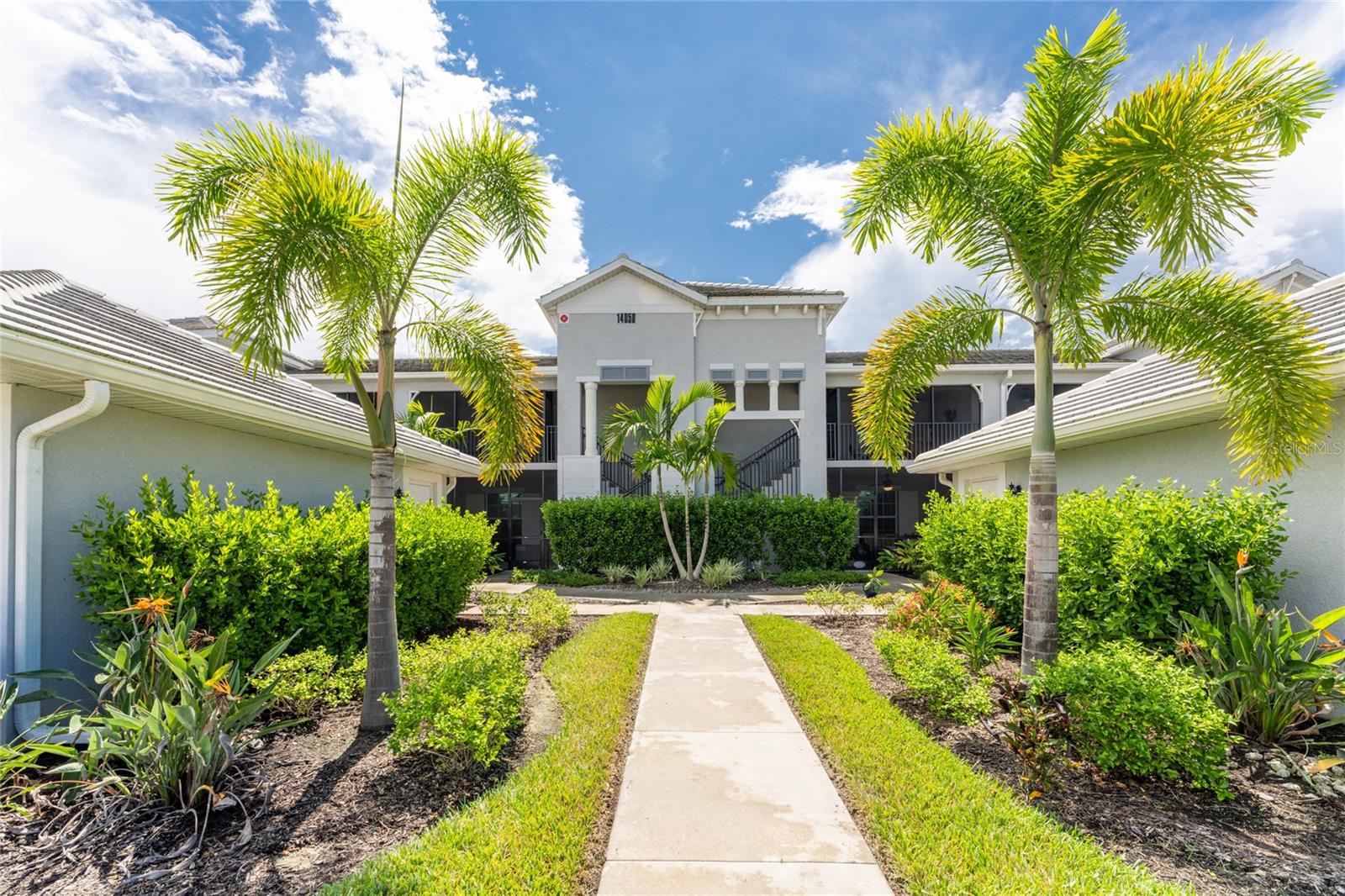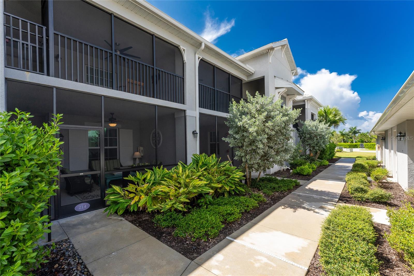 This exquisite ground-floor Veranda condo comes with a DEEDED GOLF MEMBERSHIP, providing you with exclusive access to the community's premier Gordon Lewis golf course—an unparalleled perk for golf enthusiasts. Offered TURNKEY FURNISHED, this condo boasts a desirable furniture package, ready for you to move right in. You will be welcomed home by a spacious screened in front lanai where you will enjoy relaxing with friends or curling up with your favorite book. Step inside into a bright, open space that showcases a picturesque backdrop featuring panoramic golf and water views. Diamond-set tile flooring throughout the main living area, seamlessly connects the striking open kitchen, dining, and living spaces. The well-appointed kitchen is a chef's delight, featuring an expansive island with bar seating, striking pendant lighting, granite countertops, and stainless steel appliances. Two spacious pantry closets provide ample storage, making this kitchen as functional as it is beautiful. Enjoy picturesque views of the golf course from the dining area, creating a pleasing backdrop for every meal. The living area flows effortlessly to the back screened lanais, perfect for enjoying a morning coffee, evening sunsets, or hosting guests with views of the golf course and lake beyond. The primary suite is a private sanctuary, complete with crown molding, dual walk-in closets, and an en-suite bathroom featuring a walk-in shower with frameless rain glass, dual sinks, and a large granite-topped vanity. The guest area offers a comfortable bedroom, along with a convenient bathroom featuring a granite-topped vanity, ensuring comfort and privacy for your visitors. For those working from home or seeking a quiet space to unwind, the den off the kitchen is an ideal spot for an office or media room. Offering the convenience of a single family home, this maintenance free Diangelo residence offers a garage just steps from the front door. Heritage Landing delivers true resort living, with a stunning Gordon Lewis designed golf course, beach entry swimming pool and poolside restaurant, tennis, pickleball, bocce and a state of the art fitness center with a sauna and locker rooms. Residents will soon enjoy the much anticipated Clubhouse, which is expected to be completed by the end of the year. Come for the lifestyle…stay for life.