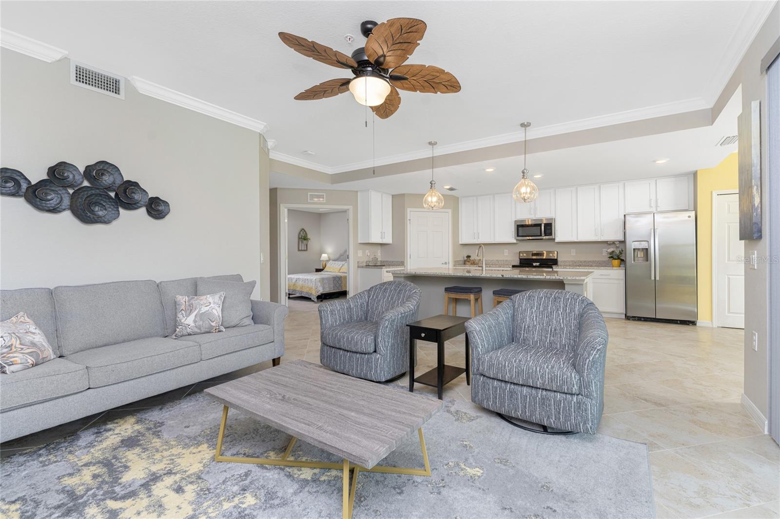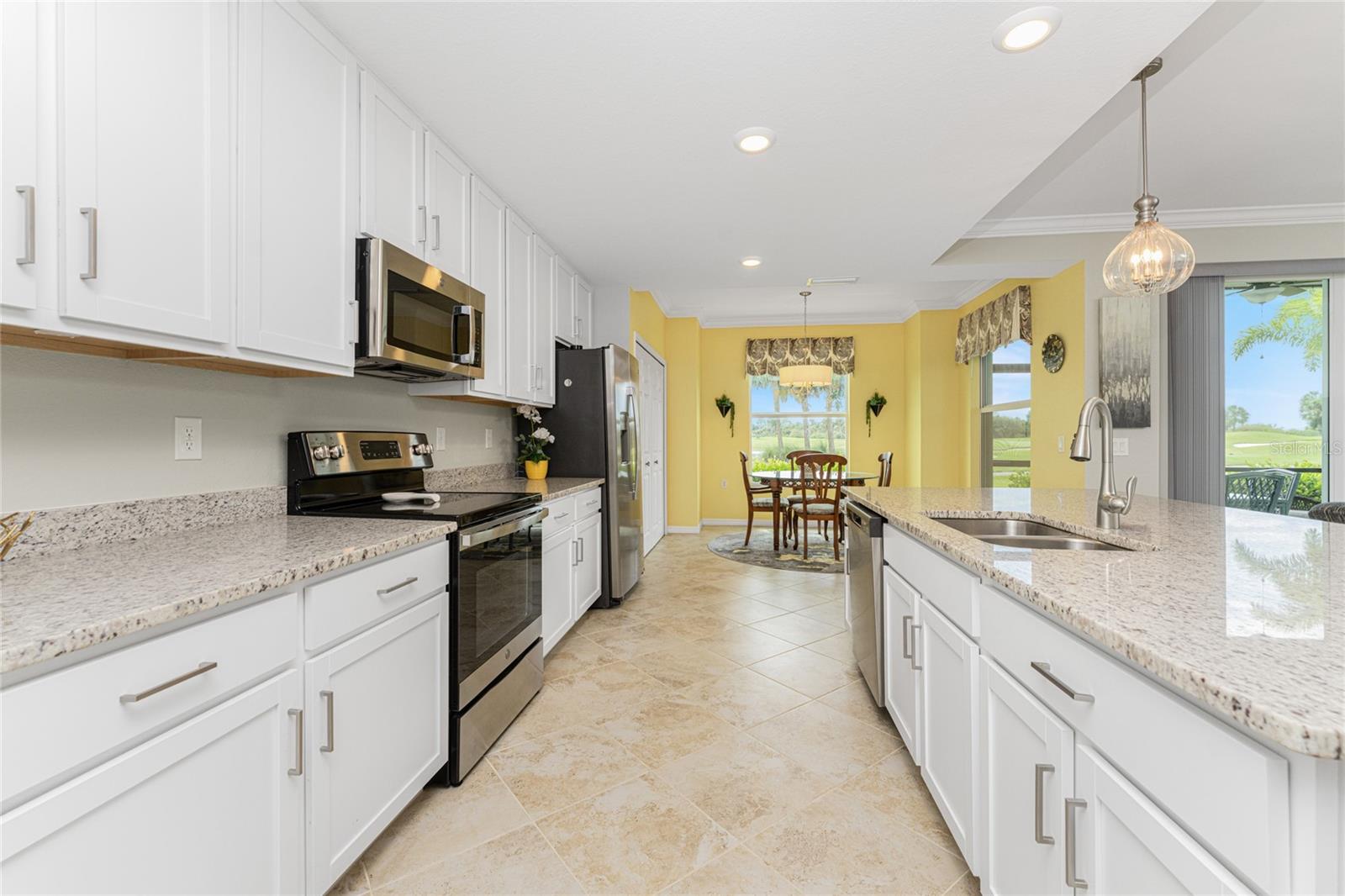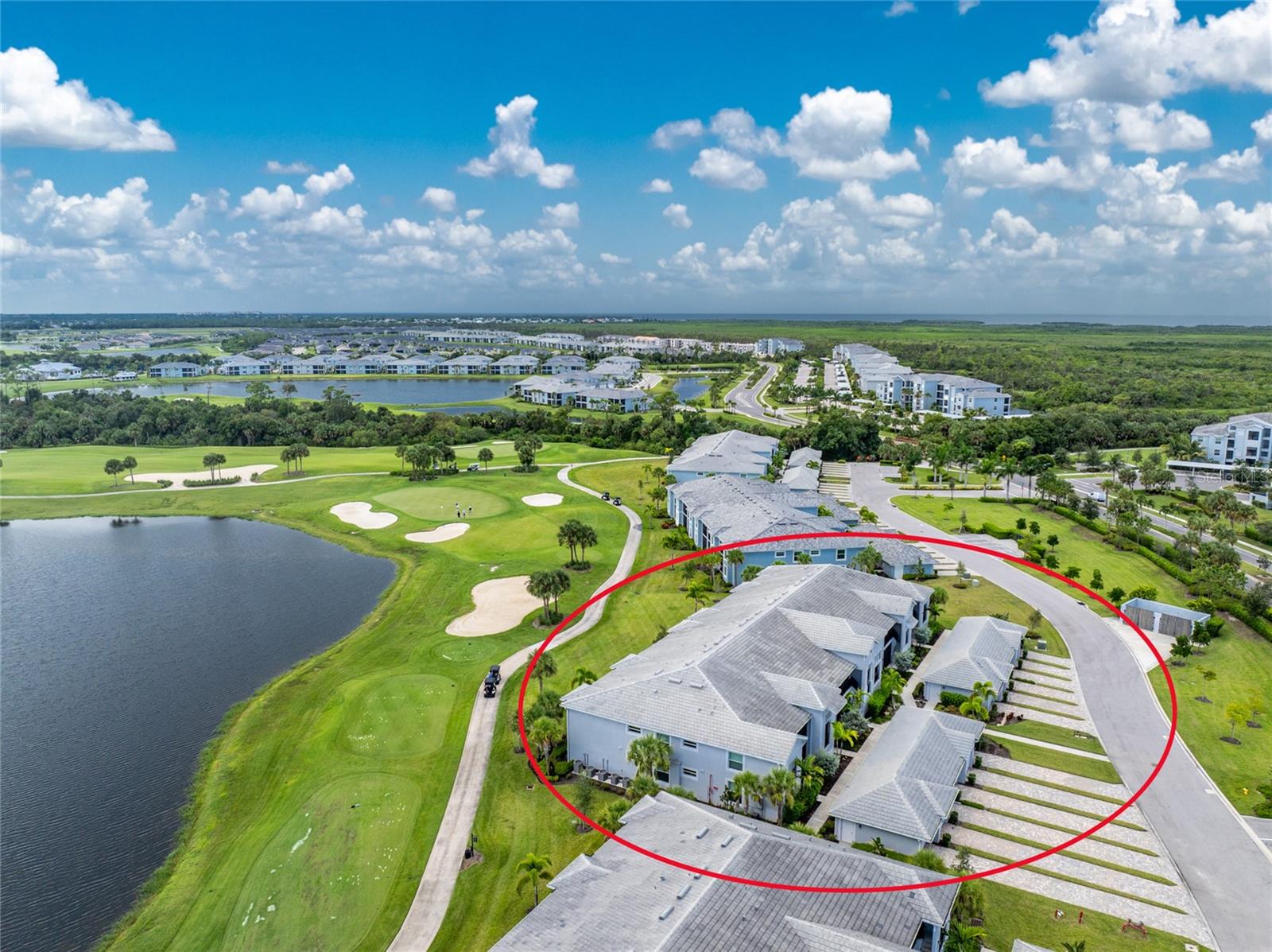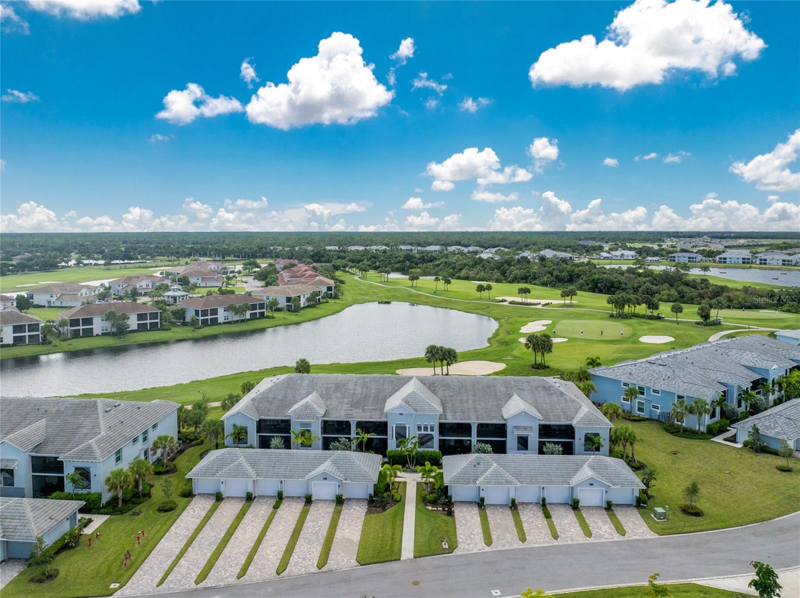 This exquisite ground-floor Veranda condo comes with a DEEDED GOLF MEMBERSHIP, providing you with exclusive access to the community's premier Gordon Lewis golf course—an unparalleled perk for golf enthusiasts. Offered TURNKEY FURNISHED, this condo boasts a desirable furniture package, ready for you to move right in. You will be welcomed home by a spacious screened in front lanai where you will enjoy relaxing with friends or curling up with your favorite book. Step inside into a bright, open space that showcases a picturesque backdrop featuring panoramic golf and water views. Diamond-set tile flooring throughout the main living area, seamlessly connects the striking open kitchen, dining, and living spaces. The well-appointed kitchen is a chef's delight, featuring an expansive island with bar seating, striking pendant lighting, granite countertops, and stainless steel appliances. Two spacious pantry closets provide ample storage, making this kitchen as functional as it is beautiful. Enjoy picturesque views of the golf course from the dining area, creating a pleasing backdrop for every meal. The living area flows effortlessly to the back screened lanais, perfect for enjoying a morning coffee, evening sunsets, or hosting guests with views of the golf course and lake beyond. The primary suite is a private sanctuary, complete with crown molding, dual walk-in closets, and an en-suite bathroom featuring a walk-in shower with frameless rain glass, dual sinks, and a large granite-topped vanity. The guest area offers a comfortable bedroom, along with a convenient bathroom featuring a granite-topped vanity, ensuring comfort and privacy for your visitors. For those working from home or seeking a quiet space to unwind, the den off the kitchen is an ideal spot for an office or media room. Offering the convenience of a single family home, this maintenance free Diangelo residence offers a garage just steps from the front door. Heritage Landing delivers true resort living, with a stunning Gordon Lewis designed golf course, beach entry swimming pool and poolside restaurant, tennis, pickleball, bocce and a state of the art fitness center with a sauna and locker rooms. Residents will soon enjoy the much anticipated Clubhouse, which is expected to be completed by the end of the year. Come for the lifestyle…stay for life.