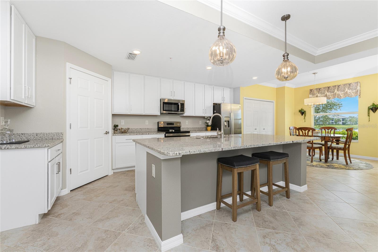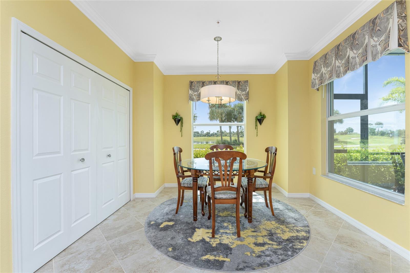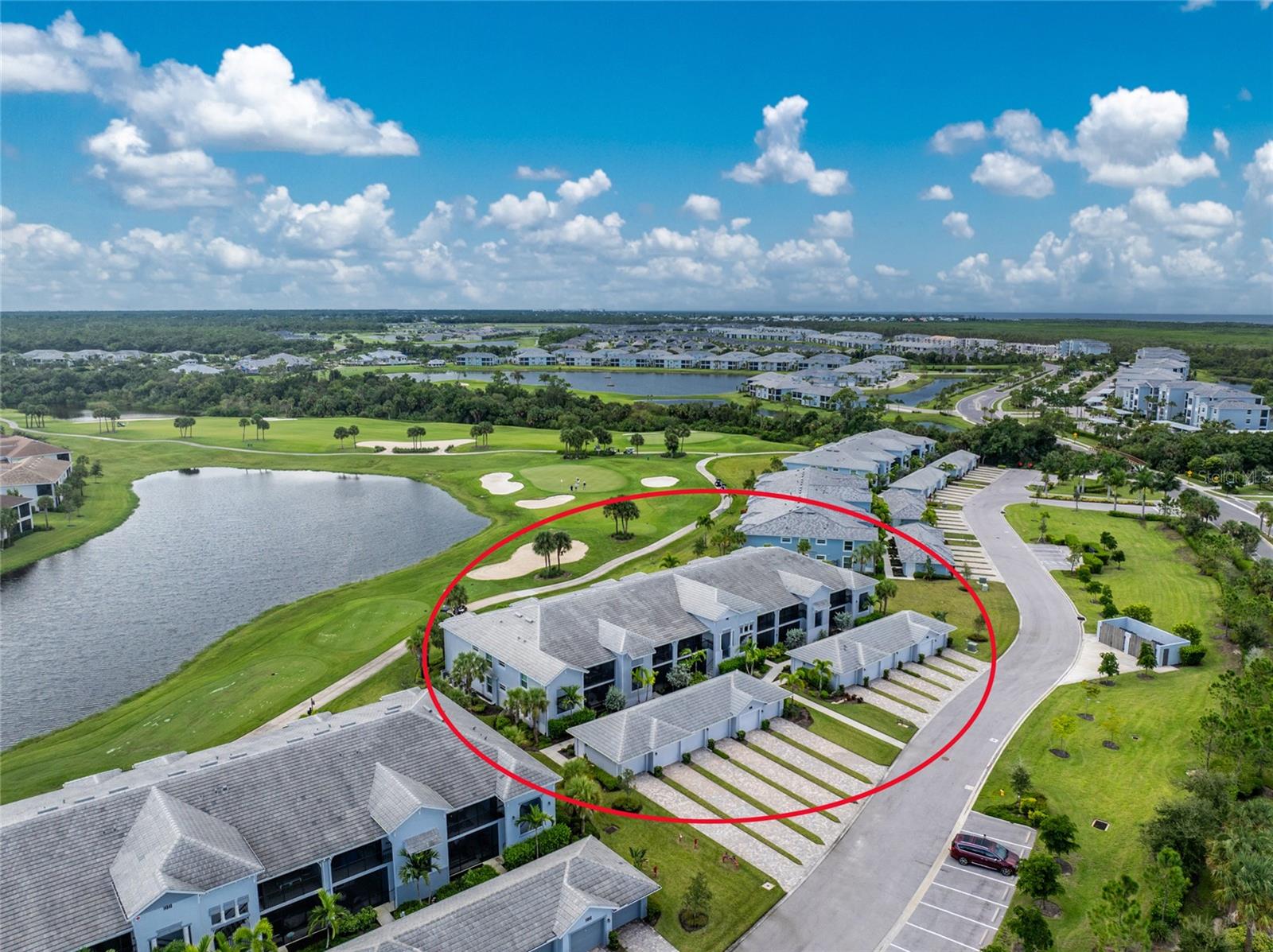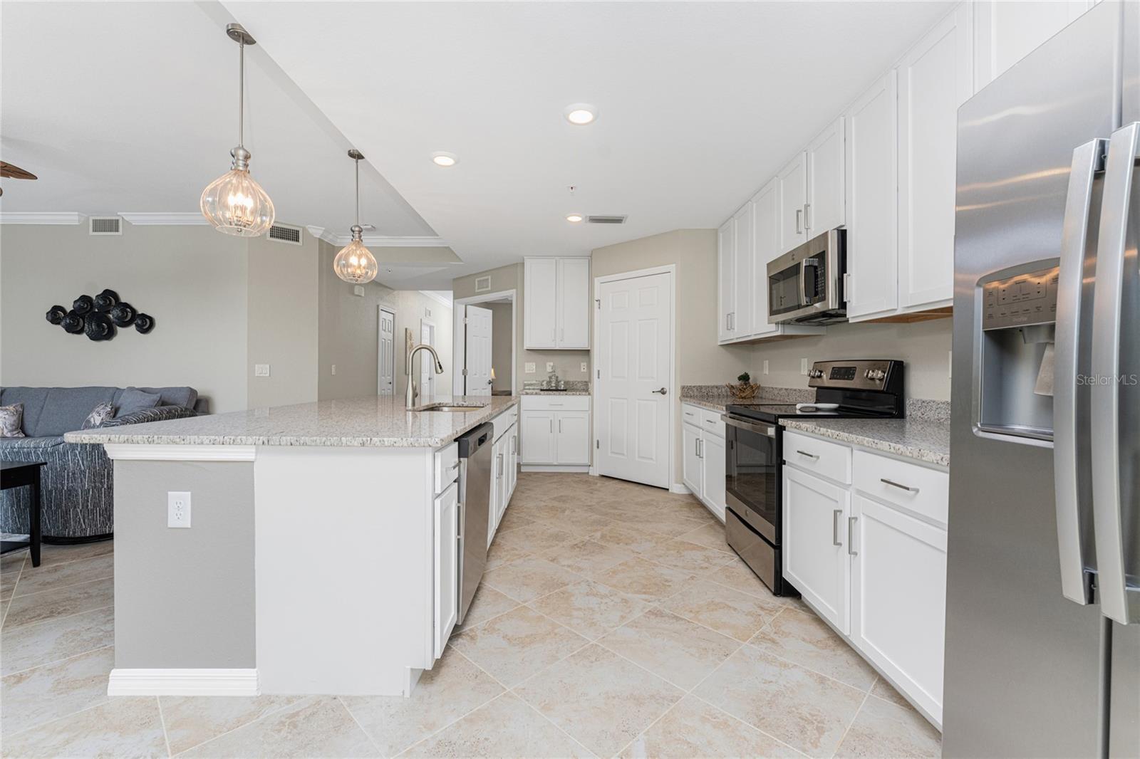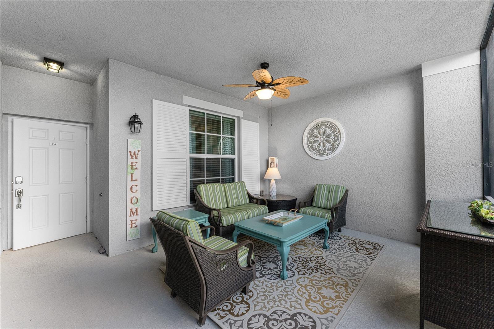 This exquisite ground-floor Veranda condo comes with a DEEDED GOLF MEMBERSHIP, providing you with exclusive access to the community's premier Gordon Lewis golf course—an unparalleled perk for golf enthusiasts. Offered TURNKEY FURNISHED, this condo boasts a desirable furniture package, ready for you to move right in. You will be welcomed home by a spacious screened in front lanai where you will enjoy relaxing with friends or curling up with your favorite book. Step inside into a bright, open space that showcases a picturesque backdrop featuring panoramic golf and water views. Diamond-set tile flooring throughout the main living area, seamlessly connects the striking open kitchen, dining, and living spaces. The well-appointed kitchen is a chef's delight, featuring an expansive island with bar seating, striking pendant lighting, granite countertops, and stainless steel appliances. Two spacious pantry closets provide ample storage, making this kitchen as functional as it is beautiful. Enjoy picturesque views of the golf course from the dining area, creating a pleasing backdrop for every meal. The living area flows effortlessly to the back screened lanais, perfect for enjoying a morning coffee, evening sunsets, or hosting guests with views of the golf course and lake beyond. The primary suite is a private sanctuary, complete with crown molding, dual walk-in closets, and an en-suite bathroom featuring a walk-in shower with frameless rain glass, dual sinks, and a large granite-topped vanity. The guest area offers a comfortable bedroom, along with a convenient bathroom featuring a granite-topped vanity, ensuring comfort and privacy for your visitors. For those working from home or seeking a quiet space to unwind, the den off the kitchen is an ideal spot for an office or media room. Offering the convenience of a single family home, this maintenance free Diangelo residence offers a garage just steps from the front door. Heritage Landing delivers true resort living, with a stunning Gordon Lewis designed golf course, beach entry swimming pool and poolside restaurant, tennis, pickleball, bocce and a state of the art fitness center with a sauna and locker rooms. Residents will soon enjoy the much anticipated Clubhouse, which is expected to be completed by the end of the year. Come for the lifestyle…stay for life.