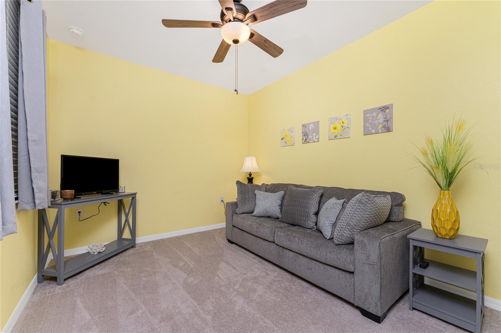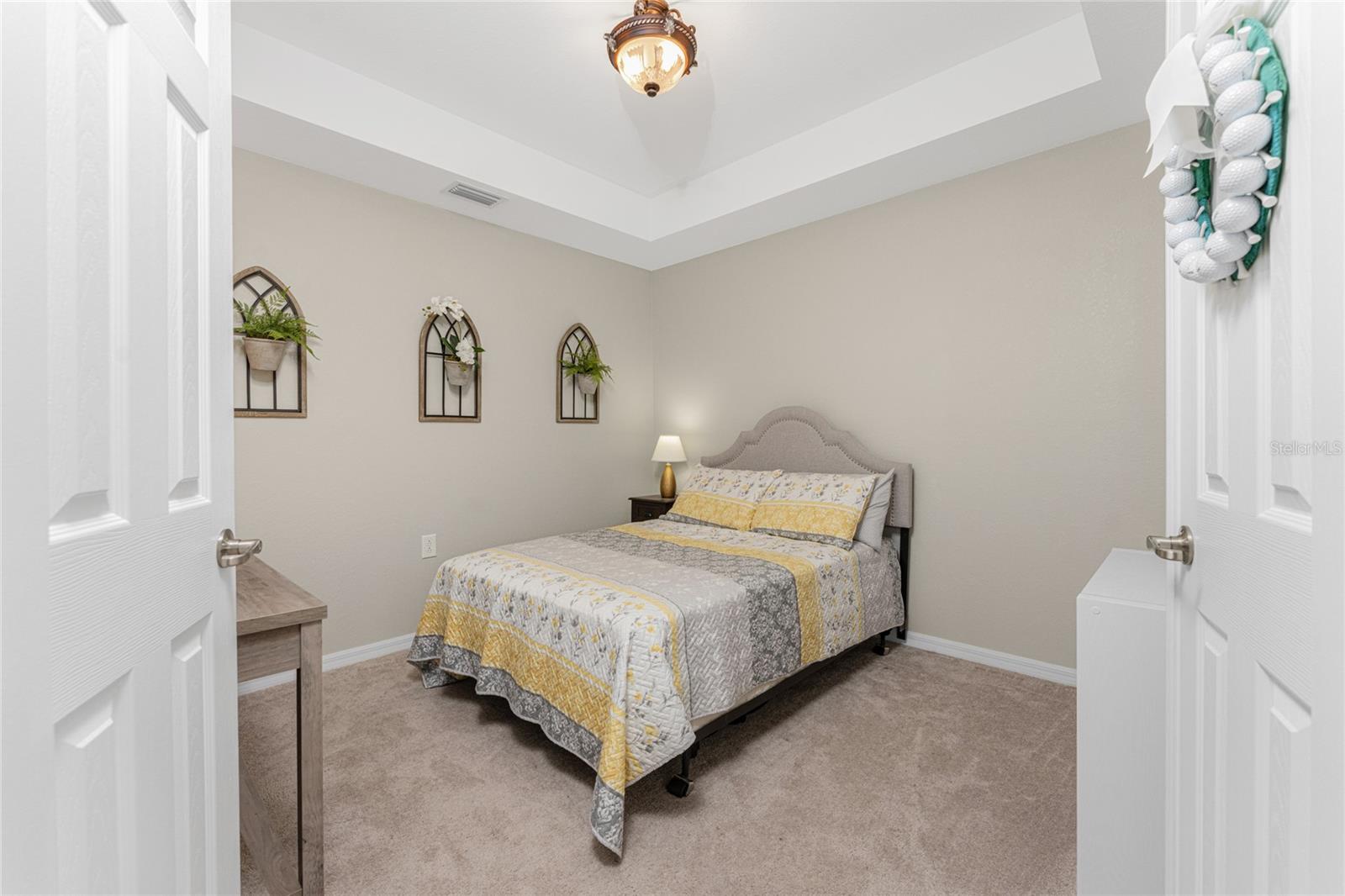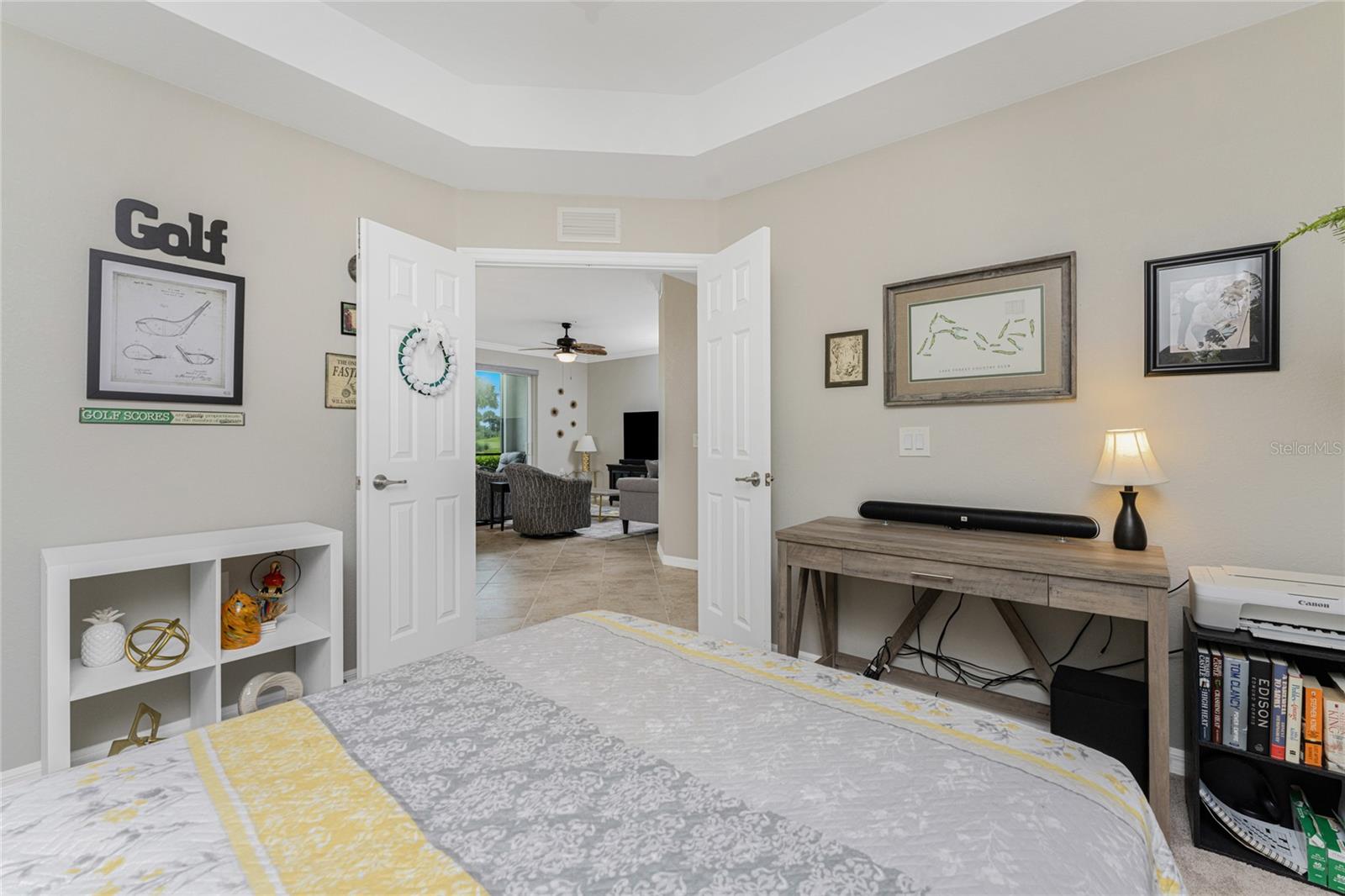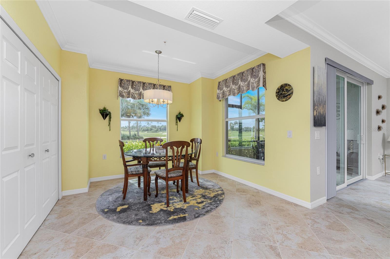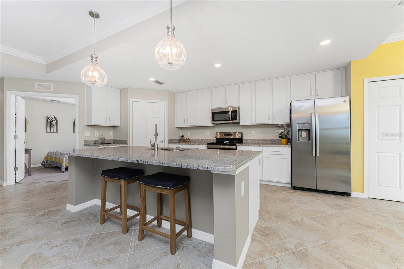 This exquisite ground-floor Veranda condo comes with a DEEDED GOLF MEMBERSHIP, providing you with exclusive access to the community's premier Gordon Lewis golf course—an unparalleled perk for golf enthusiasts. Offered TURNKEY FURNISHED, this condo boasts a desirable furniture package, ready for you to move right in. You will be welcomed home by a spacious screened in front lanai where you will enjoy relaxing with friends or curling up with your favorite book. Step inside into a bright, open space that showcases a picturesque backdrop featuring panoramic golf and water views. Diamond-set tile flooring throughout the main living area, seamlessly connects the striking open kitchen, dining, and living spaces. The well-appointed kitchen is a chef's delight, featuring an expansive island with bar seating, striking pendant lighting, granite countertops, and stainless steel appliances. Two spacious pantry closets provide ample storage, making this kitchen as functional as it is beautiful. Enjoy picturesque views of the golf course from the dining area, creating a pleasing backdrop for every meal. The living area flows effortlessly to the back screened lanais, perfect for enjoying a morning coffee, evening sunsets, or hosting guests with views of the golf course and lake beyond. The primary suite is a private sanctuary, complete with crown molding, dual walk-in closets, and an en-suite bathroom featuring a walk-in shower with frameless rain glass, dual sinks, and a large granite-topped vanity. The guest area offers a comfortable bedroom, along with a convenient bathroom featuring a granite-topped vanity, ensuring comfort and privacy for your visitors. For those working from home or seeking a quiet space to unwind, the den off the kitchen is an ideal spot for an office or media room. Offering the convenience of a single family home, this maintenance free Diangelo residence offers a garage just steps from the front door. Heritage Landing delivers true resort living, with a stunning Gordon Lewis designed golf course, beach entry swimming pool and poolside restaurant, tennis, pickleball, bocce and a state of the art fitness center with a sauna and locker rooms. Residents will soon enjoy the much anticipated Clubhouse, which is expected to be completed by the end of the year. Come for the lifestyle…stay for life.