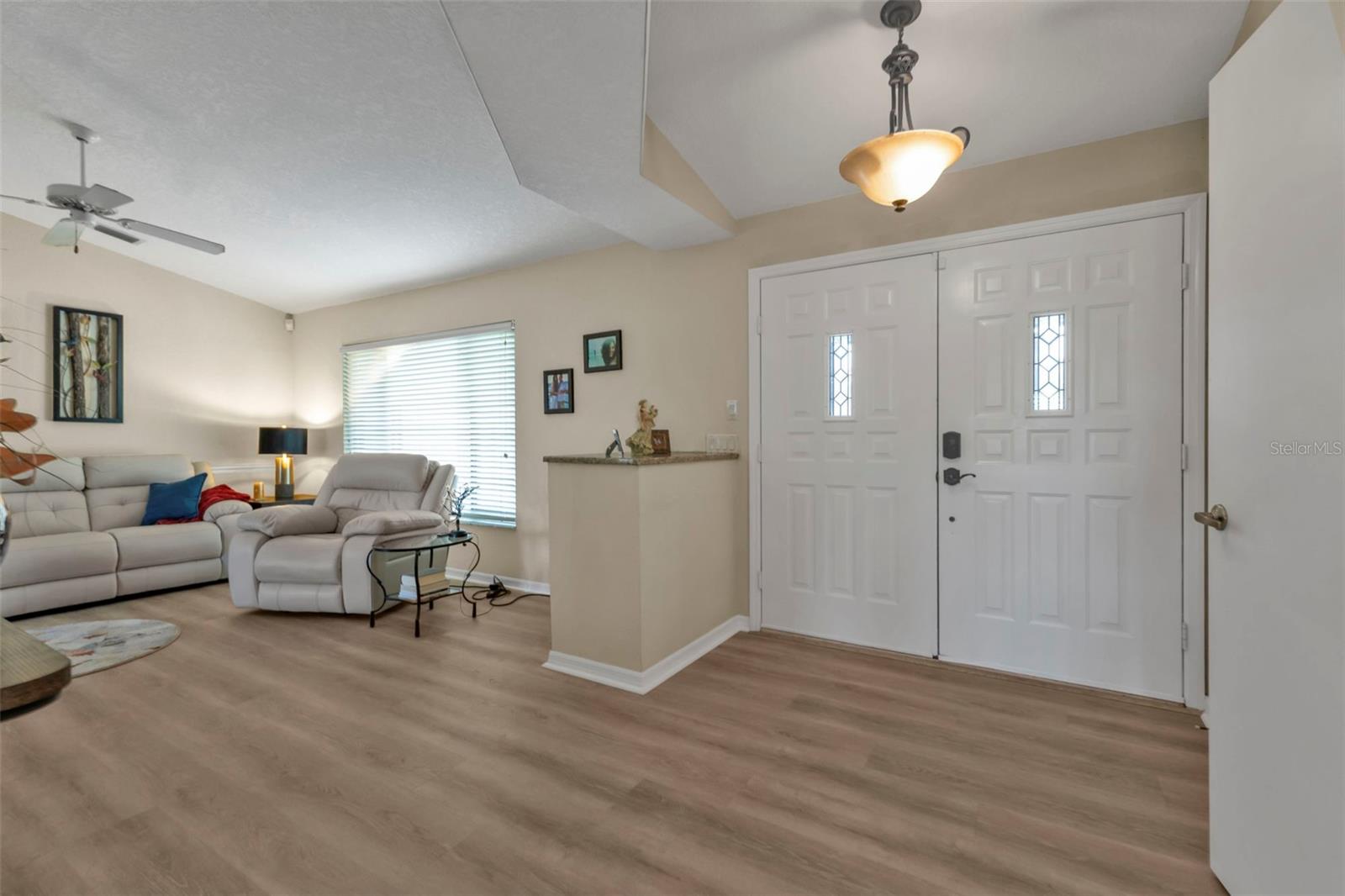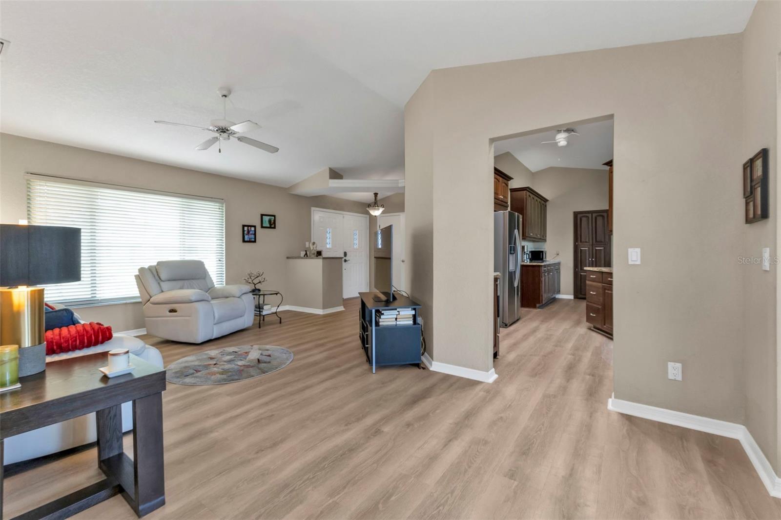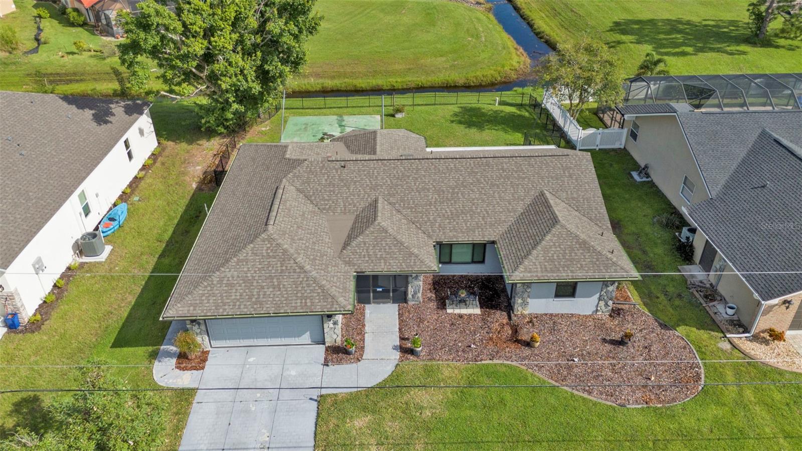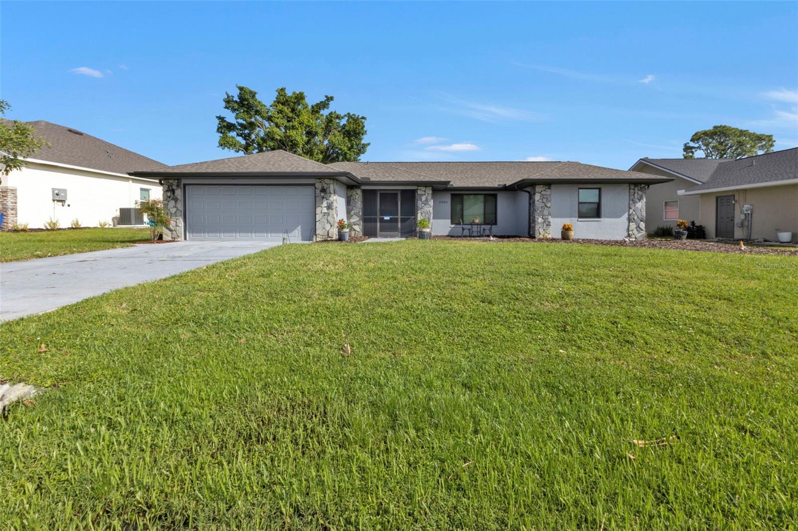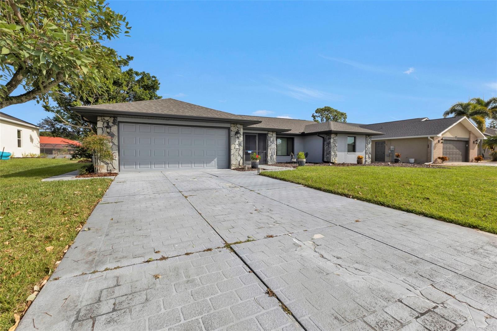 Welcome to your dream Florida oasis—a meticulously upgraded 3-bedroom, 2-bathroom home where modern design meets ultimate comfort and unwavering peace of mind. Situated in a highly desirable non-flood zone, this property has remained untouched by past storms, offering a rare combination of beauty and security. Step into a chef’s paradise, where sleek stainless-steel appliances, a state-of-the-art conduction oven, and stunning granite countertops set the stage for culinary excellence. A thoughtfully placed skylight floods the kitchen with natural light, while a spacious pantry ensures everything has its place. This space is as practical as it is stylish, ready to accommodate everything from intimate meals to lively gatherings. Luxury vinyl plank flooring flows seamlessly throughout the home, combining sophisticated aesthetics with unparalleled durability. Every window has been upgraded to high-impact glass, ensuring year-round energy efficiency and security, while the hurricane-rated garage door adds another layer of storm-season protection. Both bathrooms are impeccably designed, featuring elegant tile floors and convenient linen closets for storage. The primary suite is a true retreat, boasting two oversized walk-in closets and an en-suite bathroom designed to impress. Relax in the soaking tub or refresh in the separate walk-in shower—perfect for unwinding at the end of the day. French doors open to an expansive, covered lanai—a perfect setting for entertaining or quiet relaxation. The convenient pass-through window from the kitchen makes outdoor dining effortless. The backyard is a private sanctuary, fully enclosed with charming iron fencing, offering both security and picturesque views. This home goes beyond aesthetics—it’s crafted for comfort and longevity. A new roof was installed in 2023, while a modern AC system, upgraded in 2021, ensures reliable comfort year-round. Located in a storm-safe area, this property provides a rare sense of security alongside its many luxurious features. From its meticulously designed interiors to its serene outdoor spaces, this home offers the ultimate blend of style, functionality, and peace of mind. Whether you’re entertaining, relaxing, or simply enjoying the Florida lifestyle, every detail has been thoughtfully considered to enhance your experience. Don’t miss the opportunity to make this exceptional home yours—where timeless elegance meets unmatched quality in every corner.