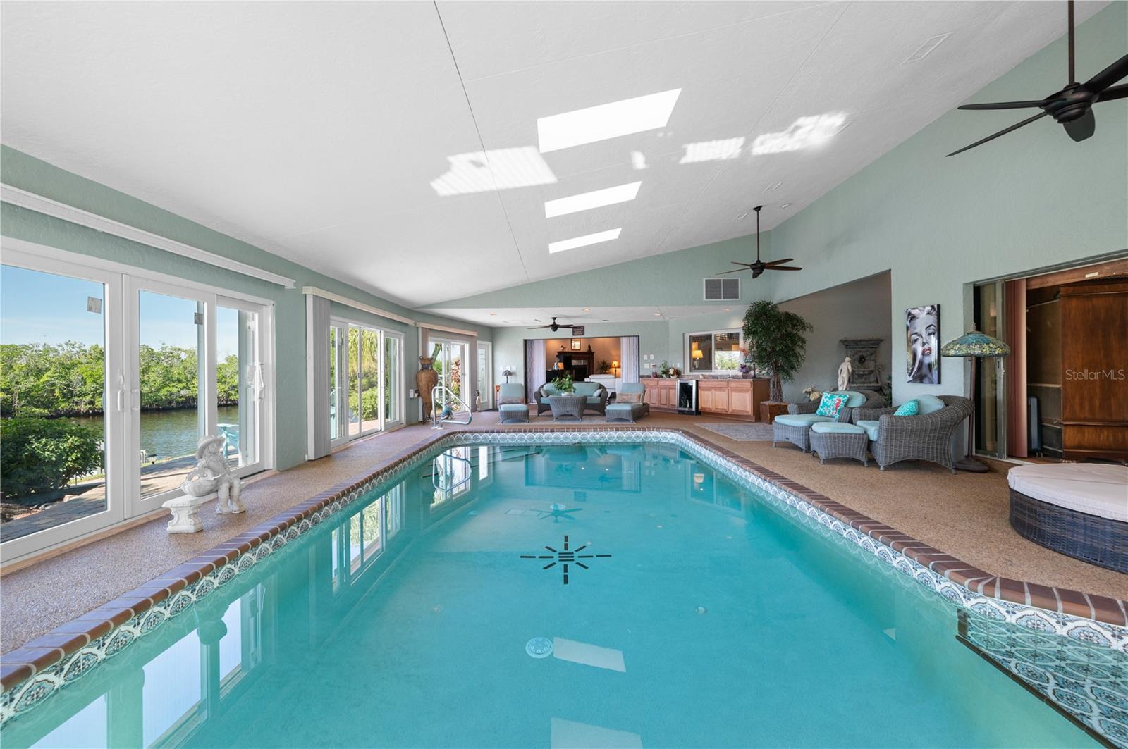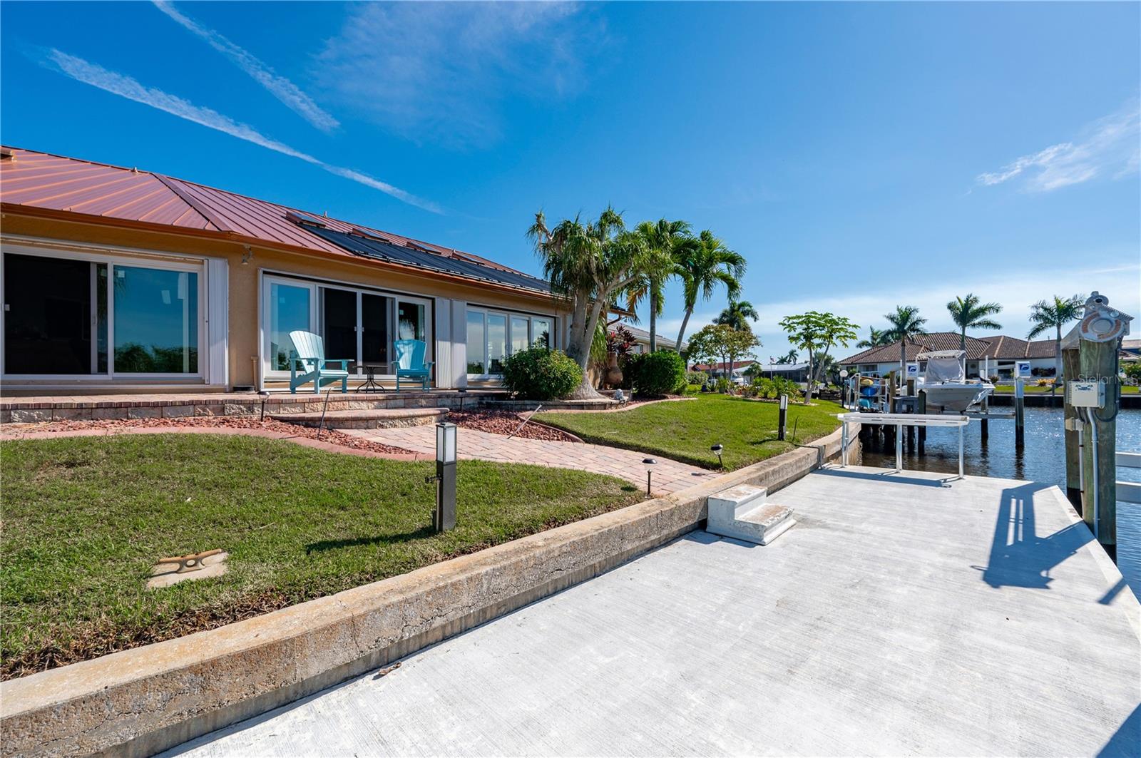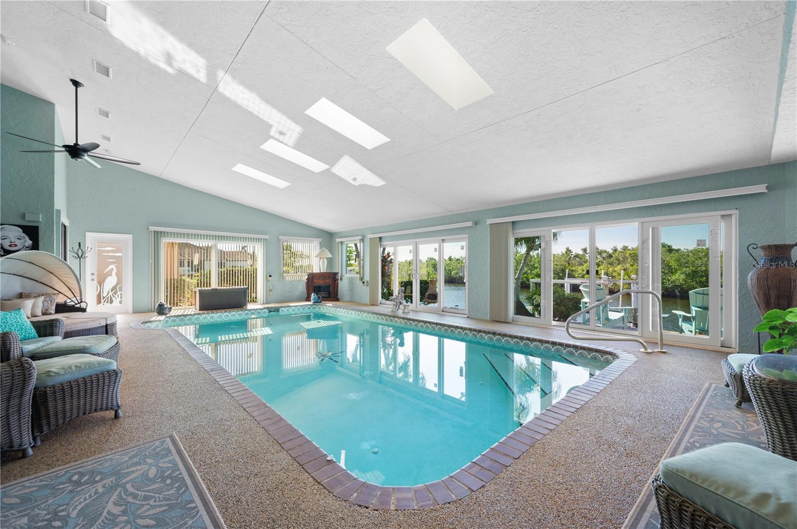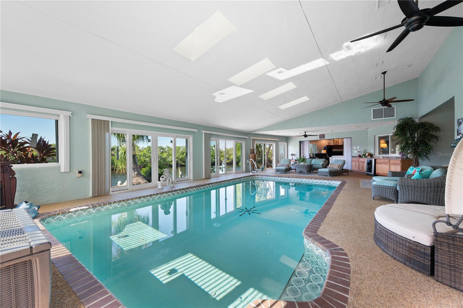 CUSTOM, 4,300 SQ FT, COURTYARD POOL HOME WITH NEW ROOF (2023) AND RESURFACED POOL (2024) IN PUNTA GORDA ISLES ON PERIMETER CANAL W/QUICK SAIL ACCESS & 120 FT OF SEAWALL - JUST MINUTES TO PONCE OUTLET. Western rear exposure guarantees colorful sunsets over the canal view. This spectacular home has been beautifully updated w/all new flooring throughout plus a modern kitchen & gorgeous baths. Four sets of sliding glass doors separate the interior living space of the home from the indoor pool area. With the interior sliders open, the 1,200 sq ft, climate-controlled atrium & pool room become part of the total living space. Enjoy your pool year-round, pest & humidity-free - RAIN OR SHINE. River rock decking surrounds the in-ground, solar-heated, saltwater pool. Four skylights plus four sets of sliding glass doors allow tons of natural light to flood the space creating a private, indoor oasis. A built-in bar w/granite counter & pass-through window to the kitchen and a full bath complete the pool area. Gleaming, wood-look, luxury vinyl flooring is found throughout the home w/the exception of tile flooring in the bathrooms. A formal foyer & formal dining room greet you as you enter the home. Foyer continues through the atrium into the pool area. The kitchen is a chef's delight w/all new stainless-steel appliances, granite counters, large center island w/induction range, built-in wine refrigerator & breakfast bar. Kitchen also boasts built-in pantry, under cabinet lighting & mosaic tile back splash. Large family room w/fireplace and picture windows is adjacent to the kitchen. The home was designed for entertaining. The family room includes a built-in coffee bar & breakfast area. Other architectural details include soaring cathedral ceilings, plantation shutters plus modern fans & light fixtures. The split bedroom floor plan offers a spacious, master retreat w/two sets of sliding glass doors leading to atrium & pool room plus an en-suite master bath. Entrance to the master bath has a seated vanity w/granite counter across from the oversized walk-in closet. Spa-like master bath features granite counters, two vessel sinks, a gorgeous soaking tub & tiled shower w/luxury, stainless-steel panel system w/waterfall shower head & multiple jets. Split bedroom design boasts large guest bedrooms that share a beautifully updated full bath. The pool area opens to a brick paver patio w/insect misting system that takes full advantage of the PERIMETER CANAL & ANGROVE/NATURE PRESERVE view. It's the perfect spot to take in the gorgeous sunset views. Brick paver path culminates at the 10' wide, extended concrete dock. Dock features a 10,000 lb boat lift & fish cleaning table.Water & electric hook-ups are available dockside. Other amenities include Kinetico water softener, hurricane protection, brick paver drive & attached 2-car garage. Everything has been updated so you don't have to do it: NEW Anderson windows & exterior pool sliders (2023), NEW skylights (2023), NEW standing-seam metal roof (2023), replumbed w/overhead piping & manifold system (2023), NEW solar-power hot water heater & panels (2023), NEW security cameras at garage w/motion-activated flood lights & doorbell camera (2023), TWO NEW A/C systems - 3- ton for dining room/master bedroom (2022), 2-ton system for pool area (2021), NEW solar panels for pool heat (2023), NEW pool pump (2023), NEW saltwater chlorinator (2019), NEW Pool Re-surface (2024) & NEW impact-resistant pool doors w/etched glass (2021).