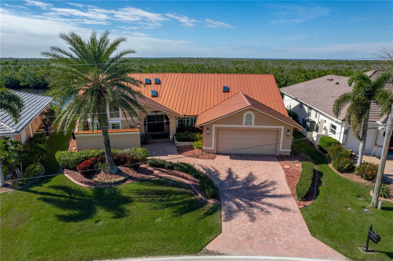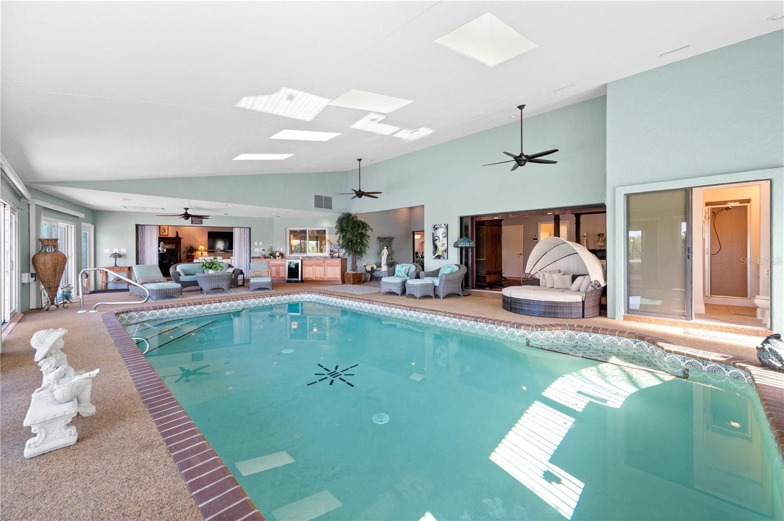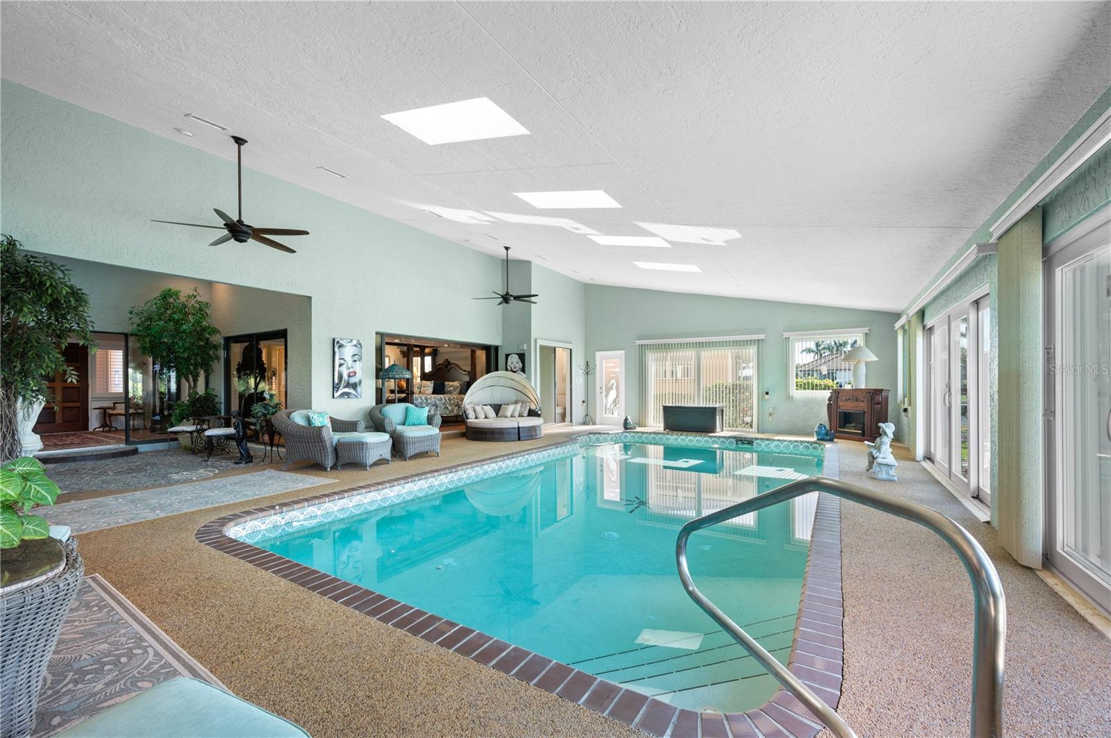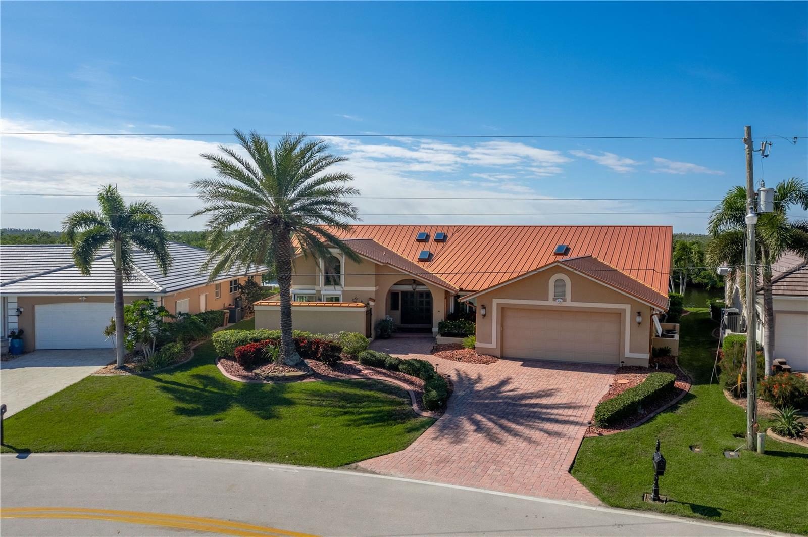 CUSTOM, 4,300 SQ FT, COURTYARD POOL HOME WITH NEW ROOF (2023) AND RESURFACED POOL (2024) IN PUNTA GORDA ISLES ON PERIMETER CANAL W/QUICK SAIL ACCESS & 120 FT OF SEAWALL - JUST MINUTES TO PONCE OUTLET. Western rear exposure guarantees colorful sunsets over the canal view. This spectacular home has been beautifully updated w/all new flooring throughout plus a modern kitchen & gorgeous baths. Four sets of sliding glass doors separate the interior living space of the home from the indoor pool area. With the interior sliders open, the 1,200 sq ft, climate-controlled atrium & pool room become part of the total living space. Enjoy your pool year-round, pest & humidity-free - RAIN OR SHINE. River rock decking surrounds the in-ground, solar-heated, saltwater pool. Four skylights plus four sets of sliding glass doors allow tons of natural light to flood the space creating a private, indoor oasis. A built-in bar w/granite counter & pass-through window to the kitchen and a full bath complete the pool area. Gleaming, wood-look, luxury vinyl flooring is found throughout the home w/the exception of tile flooring in the bathrooms. A formal foyer & formal dining room greet you as you enter the home. Foyer continues through the atrium into the pool area. The kitchen is a chef's delight w/all new stainless-steel appliances, granite counters, large center island w/induction range, built-in wine refrigerator & breakfast bar. Kitchen also boasts built-in pantry, under cabinet lighting & mosaic tile back splash. Large family room w/fireplace and picture windows is adjacent to the kitchen. The home was designed for entertaining. The family room includes a built-in coffee bar & breakfast area. Other architectural details include soaring cathedral ceilings, plantation shutters plus modern fans & light fixtures. The split bedroom floor plan offers a spacious, master retreat w/two sets of sliding glass doors leading to atrium & pool room plus an en-suite master bath. Entrance to the master bath has a seated vanity w/granite counter across from the oversized walk-in closet. Spa-like master bath features granite counters, two vessel sinks, a gorgeous soaking tub & tiled shower w/luxury, stainless-steel panel system w/waterfall shower head & multiple jets. Split bedroom design boasts large guest bedrooms that share a beautifully updated full bath. The pool area opens to a brick paver patio w/insect misting system that takes full advantage of the PERIMETER CANAL & ANGROVE/NATURE PRESERVE view. It's the perfect spot to take in the gorgeous sunset views. Brick paver path culminates at the 10' wide, extended concrete dock. Dock features a 10,000 lb boat lift & fish cleaning table.Water & electric hook-ups are available dockside. Other amenities include Kinetico water softener, hurricane protection, brick paver drive & attached 2-car garage. Everything has been updated so you don't have to do it: NEW Anderson windows & exterior pool sliders (2023), NEW skylights (2023), NEW standing-seam metal roof (2023), replumbed w/overhead piping & manifold system (2023), NEW solar-power hot water heater & panels (2023), NEW security cameras at garage w/motion-activated flood lights & doorbell camera (2023), TWO NEW A/C systems - 3- ton for dining room/master bedroom (2022), 2-ton system for pool area (2021), NEW solar panels for pool heat (2023), NEW pool pump (2023), NEW saltwater chlorinator (2019), NEW Pool Re-surface (2024) & NEW impact-resistant pool doors w/etched glass (2021).